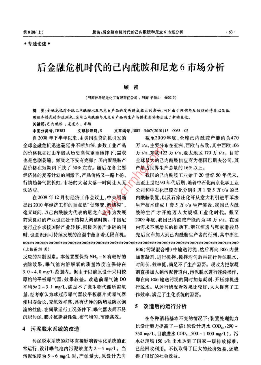 河南化工HENAN CHEMICAL INDUSTRY2010年第27卷工業(yè)污水A0工藝的改造及運(yùn)行分析張呂會(河南神馬尼龍化工有限責(zé)任公司,河南平頂山467013)要:針對工業(yè)廢水成分復(fù)雜,系統(tǒng)內(nèi)實際NH3-N校高的問題,對工藝參數(shù)進(jìn)行合理調(diào)整,將調(diào)節(jié)系統(tǒng)和進(jìn)水方式進(jìn)行改造。取得了較好效果,產(chǎn)生了巨大的經(jīng)濟(jì)及社會效益。鍵詞:污水治理;NH3-N;AO工藝改造中圖分類號:X703.3文獻(xiàn)標(biāo)識碼:B文章編號:1003-3467(2010)15-0058-012.2提高污泥濃度1概述活性污泥法抗沖擊能力較差,AO工藝也同樣河南神馬尼龍化工公司污水處理場投產(chǎn)于存在這個問題。我們在實踐中發(fā)現(xiàn)高污泥濃度可以199年,是采用傳統(tǒng)AO工藝的工業(yè)廢水處理工提高抗沖擊能力在沉淀池保持一定沉淀效果的情程。隨著公司技改擴(kuò)產(chǎn),尼龍66鹽的生產(chǎn)能力由況下,污泥濃度越高單位體積內(nèi)所含的微生物數(shù)量6.5萬t到20萬t,廢水水量及水質(zhì)均發(fā)生了較大變也越多,污泥濃度提高后,處理能力明顯提高。經(jīng)過化,現(xiàn)有處理能力已不能很好的滿足公司擴(kuò)建需要。長期摸索我們把污泥濃度由2-4g提高到5-6同時根據(jù)國家對淮河流域的治理力度的加大,必須g/L,沉淀池未出現(xiàn)出水帶泥現(xiàn)象。開展技術(shù)創(chuàng)新,提高污水處理場的處理能力。3系統(tǒng)改造2A/O工藝參數(shù)的調(diào)整3.1污水調(diào)節(jié)系統(tǒng)進(jìn)行改造2.I調(diào)整污泥回流率和硝化液回流率原設(shè)計V02(調(diào)節(jié)池)內(nèi)無空氣攪拌裝置,上游回流比是MO系統(tǒng)運(yùn)行中的一個重要控制參來水在v02內(nèi)易產(chǎn)生短流,不能起到很好的調(diào)節(jié)作數(shù),包括混合液回流比和污泥回流比?;旌弦夯亓饔?為此我們在V2內(nèi)增加空氣攪拌裝置,上游來的作用是向缺氧池提供硝態(tài)氮,作為反硝化的電子水進(jìn)入VO2、V03后在空氣攪拌下能很好地中和減受體;污泥回流的作用主要是保持系統(tǒng)的污泥平衡。少了因上游來水水質(zhì)發(fā)生變化導(dǎo)致進(jìn)入系統(tǒng)的水質(zhì)回流比太小則出水NO3-N偏高,大部分硝態(tài)氮隨發(fā)生較大波動對牛化系統(tǒng)造成沖擊。沉淀池出水流出;無足夠的硝態(tài)氮供反硝化,勢必影32進(jìn)水方式由原來上進(jìn)水改為下進(jìn)水響脫氮效率,且廢水中有機(jī)碳源不能充分利用原設(shè)計缺氧池進(jìn)水及硝化液回流進(jìn)入缺氧池均般認(rèn)為回流比越大,脫氮效率越高,其實不然,當(dāng)回為上進(jìn)水,上進(jìn)水會出現(xiàn)短流現(xiàn)象混合不均勻影流比過高則不僅多耗費(fèi)動力還會因回流量增加,響生化系統(tǒng)處理效果,為此我們把進(jìn)水及硝化液回脫氮速率反趨變慢。我們分別在回流比在2,3、4三流改為下進(jìn)水很好地避免了短流及混合不均勻現(xiàn)種情況下進(jìn)行比較,當(dāng)回流比控制在2時(污水處象有效地增大了池容效率提高了提高處理效果。理場在目前情況下),去除率可達(dá)到90%以上,脫氮33平板曝氣器更換為球冠形曝氣器效果好。通過試驗我們將污泥回流率由原來的生物硝化脫氮處理,氨氮硝化需氧量很大,曝氣150%調(diào)整到10%,硝化液回流率由原來的300%池內(nèi)必須供給足夠的溶解氧硝化反應(yīng)才能正常進(jìn)調(diào)整到200%,系統(tǒng)運(yùn)行穩(wěn)定,出水合格(COD≤行。如果在2mg/L以下,溶解氧濃度就成了硝化100mg/L,NH3-N≤15mg/L,pH值為6~9)。(下轉(zhuǎn)第63頁)收稿日期:2010-06-25作者簡介張昌會(1973-),男,工程師從事化工生產(chǎn)管理工作電話(0375)3816231。第8期(上)顧茜后金融危機(jī)時代的己內(nèi)酰胺和尼龍6市場分析·專題論述·后金融危機(jī)時代的己內(nèi)酰胺和尼龍6市場分析(河南神馬尼龍化工有限責(zé)任公司,河南平頂山467013)摘要:金融危機(jī)對全球己內(nèi)酰胺以及尼龍6產(chǎn)品的發(fā)展造成極大的影響,同時由于傾銷與反傾銷的博弈以及低碳經(jīng)濟(jì)模式的加速到來,國內(nèi)己內(nèi)酰胺與尼龍6產(chǎn)品的生產(chǎn)與供求形勢都出現(xiàn)了新的變化。關(guān)鍵詞:己內(nèi)酰胺;尼龍6;市場中圖分類號:TB383文獻(xiàn)標(biāo)識碼:B文章編號:1003-3467(2010)15-0063-02自2008年下半年以來,由美國次貸危機(jī)引發(fā)的截至2009年底,全球己內(nèi)酰胺產(chǎn)能約為470全球金融危機(jī)迅速蔓延并不斷加深,多數(shù)工業(yè)產(chǎn)品萬Ua,主要分布在亞洲、西歐與東歐,其中西歐106的價格猶如過山車般從歷史高位重重地摔下,需求萬Ua東歐122萬Ua、亞太地區(qū)170萬ta。目前也是急劇萎縮。傾巢之下安有完卵?國內(nèi)聚酰胺產(chǎn)全球最大的己內(nèi)酰胺供應(yīng)商為德國巴斯夫公司,其品價格在短期內(nèi)下跌了50%左右。隨后在各主要產(chǎn)量占世界生產(chǎn)總量的16%以上。經(jīng)濟(jì)體的復(fù)蘇計劃的刺激下,產(chǎn)品價格又一路上揚(yáng),我網(wǎng)的己內(nèi)酰胺工業(yè)始于20世紀(jì)50年代末,行情趨勢氣貫長虹,市場的大起大落一時間讓人無直至上世紀(jì)90年代后期,隨著中石化南京化學(xué)工業(yè)法適應(yīng)。公司和中石化巴陵石化分別引進(jìn)1套5萬ta的己在2009年12月初經(jīng)濟(jì)工作會議上,中央明確內(nèi)酰胺裝置以及石家莊化纖
