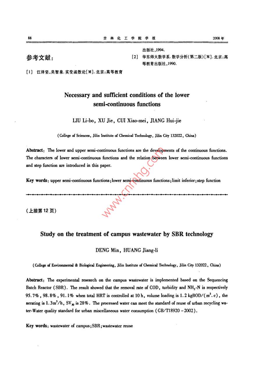 第25卷第1期Vol 25 No. 12008年2月JOURNAL OF JILIN INSTTTUTE OF CHEMICAL TECHNOLOGYFeb.2008文章編號(hào):1007-2853(2008)01001102SBR工藝處理校園污水的研究鄧民,黃江麗(吉林化工學(xué)院環(huán)境與生物工程學(xué)院吉林吉林13202摘要:采用SBR工藝對(duì)校園污水進(jìn)行試驗(yàn)研究結(jié)果表明在運(yùn)行周期為10h容積負(fù)荷為1.2 kg BOD(m.d)、曝氣量1.3m/h、SVx28%條件下達(dá)到no%5.7%;nr9.8%;nm9.1%水質(zhì)符合《城市污水再生利用城市雜用水水質(zhì)標(biāo)準(zhǔn))(GB/T18920-200)關(guān)鍵詞:校園污水;SBR法;中水回用中圖分類號(hào):X703文獻(xiàn)標(biāo)識(shí)碼:A我國(guó)是淡水資源匱乏國(guó)調(diào)查表明缺水城市水的要求,需投資(60-70)萬,每年可節(jié)水十幾有183個(gè),全國(guó)總?cè)彼棵刻?×107萬m3,影響萬噸全國(guó)上千萬的在校生,每年可節(jié)約新鮮水以工業(yè)產(chǎn)值200億元水已經(jīng)成為制約國(guó)民經(jīng)濟(jì)發(fā)億噸計(jì),1噸水約可創(chuàng)工業(yè)凈產(chǎn)值5元,其經(jīng)濟(jì)效展和人民生活水平提高的重要因素節(jié)約用水要益和社會(huì)效益相當(dāng)可觀從點(diǎn)滴做起,因此,利用有效的方法將校園污水進(jìn)行回用,是建設(shè)綠色校園的重要標(biāo)志是解決高校1SBR處理工藝流程及構(gòu)筑物經(jīng)費(fèi)不足的新渠道,同時(shí)也是污水資源化的一個(gè)重要途徑1.1工藝流程所5000人規(guī)模的院校,建設(shè)處理能力為工藝流程見圖1(300-400)m3/d的中水處理站就可以滿足雜用遇一[格】一[泡一國(guó)應(yīng)]一[區(qū)木筆景觀用水、沖洗所沖洗汽車、噴灌草坪氣泵圖1SBR處理工藝流程圖校園污水(除化工實(shí)驗(yàn)樓排水外)經(jīng)格柵過最高水量也就是SBR反應(yīng)池的有效容積SBR運(yùn)濾后,進(jìn)入調(diào)節(jié)池,監(jiān)測(cè)水溫、pH值,由泵打入行周期由充水時(shí)間(1h)、反應(yīng)時(shí)間(4h)沉淀時(shí)SBR反應(yīng)池,按流入、反應(yīng)沉淀、排放、待機(jī)五個(gè)間(2h)排水時(shí)間(lh)和閑置時(shí)間(2h)來確工序,依次在同一SBR反應(yīng)池中周期性運(yùn)行定當(dāng)SⅥ值為100時(shí),可以注入反應(yīng)器有效容積1.2主要處理構(gòu)筑物100%的水量,SⅥ值升高注人反應(yīng)器的水量下1.2.1調(diào)節(jié)池降,當(dāng)SⅥ值為200時(shí),反應(yīng)器不能運(yùn)行校園污水的水量和水質(zhì)隨時(shí)間變化較大,為保證后續(xù)構(gòu)筑物的穩(wěn)定運(yùn)行需對(duì)水量、水質(zhì)適當(dāng)2實(shí)驗(yàn)機(jī)理調(diào)節(jié),設(shè)計(jì)調(diào)節(jié)時(shí)間為2h1.2.2SBR反應(yīng)池2.1SBR活性污泥校園污水可生化性良好,取SBR反應(yīng)池的容活性污泥是SBR處理系統(tǒng)的工作主體,其活積負(fù)荷為12 kg bOD.(m3·d).SBR反應(yīng)池的性污泥中的微生物主要由細(xì)菌組成數(shù)量可占污收稿日期:2007-11-22作者簡(jiǎn)介:鄧民(1961-),男,吉林通榆人,吉林化工學(xué)院副教授,主要從事環(huán)境工程方面的研究吉林化工學(xué)院學(xué)泥中微生物總量的95%以上此外,還有原生動(dòng)物和后生動(dòng)物等微型動(dòng)物22SBR工藝運(yùn)行接種污泥取自吉化污水處理廠,注入原水后進(jìn)行連續(xù)曝氣其間用100mL量筒取水樣觀測(cè)sV當(dāng)SBR反應(yīng)池內(nèi)混合液中出現(xiàn)少量活性污泥絮體時(shí),停止曝氣靜置沉淀后上清液排至污水管道然后將污水引入曝氣池進(jìn)行充分曝氣,經(jīng)12天曝氣后曝氣池內(nèi)就會(huì)出現(xiàn)大量的絮凝體重新進(jìn)水、曝氣約1個(gè)月左右觀測(cè)到混合液的Sv圖2時(shí)間與氨氮去除率的關(guān)系達(dá)到15%-20%此后按設(shè)計(jì)運(yùn)行時(shí)間4h曝氣沉淀2h,潷水器出水,排水比1/2.監(jiān)測(cè)出水水4結(jié)論質(zhì)在容積負(fù)荷為12 kgBOD.(m3·d),曝氣量1.3m3/h;運(yùn)行周期為10h;SVx28%條件下,降(1)SBR工藝是一種簡(jiǎn)易、快速且低耗的廢低水中的濁度氨氮、COD.結(jié)果表明na9.7%;水生物處理工藝它工藝簡(jiǎn)單、造價(jià)低;時(shí)間上具Ta988%;nm91.1%,待各項(xiàng)出水水質(zhì)指標(biāo)有理想的推流式反應(yīng)器的特性;運(yùn)行方式靈活可均達(dá)到設(shè)計(jì)要求可用于景觀用水沖洗廁所沖脫氮除磷具有較強(qiáng)的耐沖擊負(fù)荷的能力良好的洗汽車、噴灌草坪等.污泥沉降性能,不易產(chǎn)生污泥膨脹現(xiàn)象3實(shí)驗(yàn)結(jié)果討論(2)實(shí)驗(yàn)達(dá)到COD處理率為:957%,濁度處理率為:988%,氨氮處理率為91.1%3.1曝氣量與cOD。去除率的關(guān)系當(dāng)其它條件不變時(shí)改變曝氣量,COD去除參考文獻(xiàn):率有很大變化,見表1[1]張統(tǒng)CAS工藝處理小區(qū)污水及中水回用[]表1曝氣量與cOD。去除率的關(guān)系給水排水,2001,27(7):64-66曝氣量COD去曝氣量COD去(m3/h)除率/%(m3/h)除率/%[2]嚴(yán)煦世水和廢水技術(shù)研究[M]北京:中國(guó)建筑工74.8業(yè)出版社,1992.198-2021.38731.494.6[3]張丹住宅小區(qū)的污水回用(上)[冂].城市公用事業(yè),2001,15(1):25-26.32反應(yīng)時(shí)間與COD、氨氮去除率的關(guān)系[4]張丹住宅小區(qū)的污水回用(下)[]城市公用事選擇曝氣量為13m3/L進(jìn)水量為6776L業(yè),2001,15(3):23-25.的實(shí)驗(yàn)條件,進(jìn)行研究,實(shí)驗(yàn)結(jié)果如下[5] Roques H. Chemical Water Treatment: Principles andPractice[J]. Power Engineering, 1997, (5): 49-52