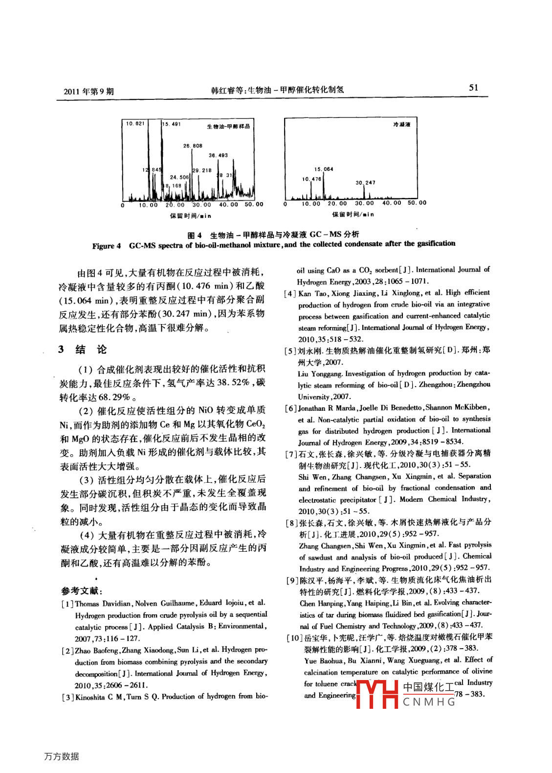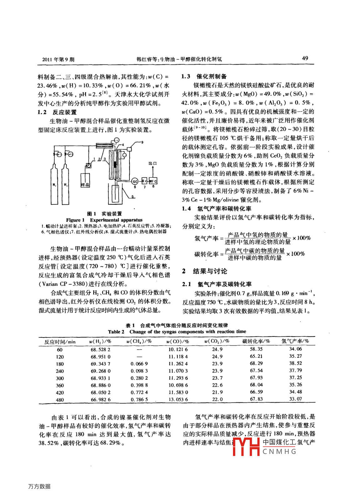 201l年9月工業(yè)催化Sept. 2011第19卷第9期INDUSTRIAL CATALYSISVol 19 No 9能源化工與催化生物油一甲醇催化轉(zhuǎn)化制氫韓紅睿,張瑞芹·,徐興敏,張長(zhǎng)森,劉永剛(鄭州大學(xué)環(huán)境科學(xué)研究院,河南鄭州450001)摘要:以生物油-甲醇為原料,在微型固定反應(yīng)裝置上考察實(shí)驗(yàn)室合成鎳基催化劑重整制氫的催化效率。對(duì)反應(yīng)前后的催化劑進(jìn)行XRD、BET和SEM表征分析,并對(duì)冷凝液做GC-MS分析。研究發(fā)現(xiàn),實(shí)驗(yàn)室自制的 NiCeMg/ olivine催化劑具有較妤的催化活性和-定的抗積炭性能。在選擇的最佳反應(yīng)條件下,氫氣產(chǎn)率和碳轉(zhuǎn)化率分別為38.52%和68.29%。關(guān)鍵詞:催化化學(xué);氬氣;生物質(zhì);甲醇;催化重整;鎳基催化劑doi:10.3969/j.iss.l008-1143.2011.09.010中圖分類(lèi)號(hào):TK6;0643.36文獻(xiàn)標(biāo)識(shí)碼:A文章編號(hào):1008-1143(2011)09004804Study on hydrogen production by catalytic reforming ofbio-oil-methanol mixtureHAN Hongrui, ZHANG Ruiqin, XU Xingmin, ZHANG Changsen, LIU YonggangResearch Institute of Environmental ScienceZhengzhou University, Zhengzhou 450001, Henan, ChinaAbstract: Using bio-oil-methanol as the raw material, the nickel-based reforming catalyst for hydrogproduction prepared in the laboratory was investigated in the fixed micro-reactor. The catalysts beforeafter reaction were characterized by XRD, BET and SEM. The condensates collected after gasification wereanalyzed by GC-MS. The results showed that NiCeMg/olivine catalyst exhibited good catalytic activity andgood properties of resistance to carbon deposition. The hydrogen yield of 38. 52% and carbon conversionof 68. 29% were attained under thethe optimum reaction conditionKey words: catalytic chemistry hydrogen; bi6; catalytic reforming; Ni-badoi:10.3969/j.issn.1008-1143.2011.09.010CLC number: TK6; 0643. 36 Document code: A Article ID: 1008-1143(2011)09-0048-04氫氣作為清潔能源引起關(guān)注,尤其是氫氣用作直接應(yīng)用生物油制氫,存在較嚴(yán)重的結(jié)焦積炭汽車(chē)燃料電池的動(dòng)力源成為研究熱點(diǎn)。生物質(zhì)問(wèn)題。研究發(fā)現(xiàn),生物油中添加適量甲醇可以降由于具有可再生、可轉(zhuǎn)換、資源豐富和環(huán)境友好等特低生物油黏度,從而緩解重整過(guò)程中的結(jié)焦現(xiàn)象0。性,被認(rèn)為是具有前景的新型氫源21。本文以生物油與甲醇質(zhì)量比1:1作為實(shí)驗(yàn)樣品,生物質(zhì)通過(guò)熱化學(xué)制氫的方式有多種,若不考進(jìn)一步進(jìn)行制氫實(shí)驗(yàn)研究考察催化劑的催化活性。慮氫氣儲(chǔ)存和運(yùn)輸過(guò)程中的技術(shù)障礙,生物質(zhì)熱裂解液體產(chǎn)物催化重整制氫的路徑較符合未來(lái)規(guī)?;?實(shí)驗(yàn)部分發(fā)展方向3。生物質(zhì)通過(guò)快速熱解得到的液體產(chǎn)1.1原料物俗稱(chēng)生物油,為黑色粘稠狀并帶有刺激性氣味實(shí)驗(yàn)在實(shí)驗(yàn)室自制的進(jìn)料為2kg·h的熱解的液態(tài)混合物。生物油成分復(fù)雜,有機(jī)相簡(jiǎn)寫(xiě)為油生產(chǎn)設(shè)備上進(jìn)行。通過(guò)常壓流化床反應(yīng)、四級(jí)冷CH0、4凝和電捕獲系統(tǒng)收集生物油l。選用樟子松為原收稿日期:2011-06-13;修回日期:011-07-11基金項(xiàng)目:河南省省院技術(shù)合作項(xiàng)目(SYHZ2009101)作者簡(jiǎn)介:韓紅睿,1986年生,男,山東省茌平縣人,在讀碩士研究生,主要從事生物質(zhì)可冉生能源利用研究。通訊聯(lián)系人:張瑞芹,教授,碩士生導(dǎo)師,從事生物質(zhì)可再生能源、環(huán)境化學(xué)與低碳技術(shù)等方面中國(guó)煤化工dcmCNMHG2011年第9期韓紅睿等:生物油-甲醇催化轉(zhuǎn)化制氫料制備二、三、四級(jí)混合熱解油,其性能為:M(C)=1.3催化劑制備23.46%,(H)=10.33%,(O)=66.21%,砌(水鎂橄欖石是天然的鎂鐵硅酸鹽礦石,是優(yōu)良的耐分)=55.54%,pH=2.581。天津永大化學(xué)試劑開(kāi)火材料,其主要成分:u(MgO)=49.0%,(SiO2)=發(fā)中心生產(chǎn)的分析純甲醇作為實(shí)驗(yàn)用甲醇試劑。42.0%,v(Fe2O3)=8.0%,(Al2O3)=0.5%,1.2反應(yīng)裝置(CaO)=0.5%。因具有優(yōu)良的機(jī)械強(qiáng)度和一定的生物油-甲醇混合樣品催化重整制氫反應(yīng)在微催化活性,并且廉價(jià)易得,近年來(lái)被廣泛用作催化劑型固定床反應(yīng)裝置上進(jìn)行,圖1為實(shí)驗(yàn)裝置。載體9。將鎂橄欖石粉碎過(guò)篩,取(20~30)目粒徑的鎂橄欖石105℃烘干備用;稱(chēng)取一定量烘干后的載體測(cè)定孔容。依據(jù)前一階段實(shí)驗(yàn)成果,設(shè)計(jì)催化劑鎳負(fù)載質(zhì)量分?jǐn)?shù)為6%,助劑ceO2負(fù)載質(zhì)量分?jǐn)?shù)為3%,MgO負(fù)載質(zhì)量分?jǐn)?shù)為1%,根據(jù)計(jì)算分別配制一定濃度的硝酸鎳、硝酸鈰和硝酸鎂水溶液。平畫(huà)d稱(chēng)取一定量干燥后的鎂橄欖石作載體,根據(jù)所測(cè)定的孔容數(shù)據(jù),采用分步等容浸漬法,制備了6%Ni3%Ce-1%Mg/ olivine催化劑。14氫氣產(chǎn)率和碳轉(zhuǎn)化率圖1實(shí)驗(yàn)裝置Figure 1 Experimental apparatus實(shí)驗(yàn)結(jié)果評(píng)價(jià)以氫氣產(chǎn)率和碳轉(zhuǎn)化率為指標(biāo),1蠕動(dòng)計(jì)量進(jìn)樣泵預(yù)熱器3電加熱爐4.石英反應(yīng)管5冷凝器;分別定義為:6氣相色譜儀;7紅外線(xiàn)分析儀;8.濕式流量計(jì);9.熱電偶控制器氫氣產(chǎn)率=產(chǎn)品氣中氫的物質(zhì)的量×10%進(jìn)樣中氫的理論物質(zhì)的量
