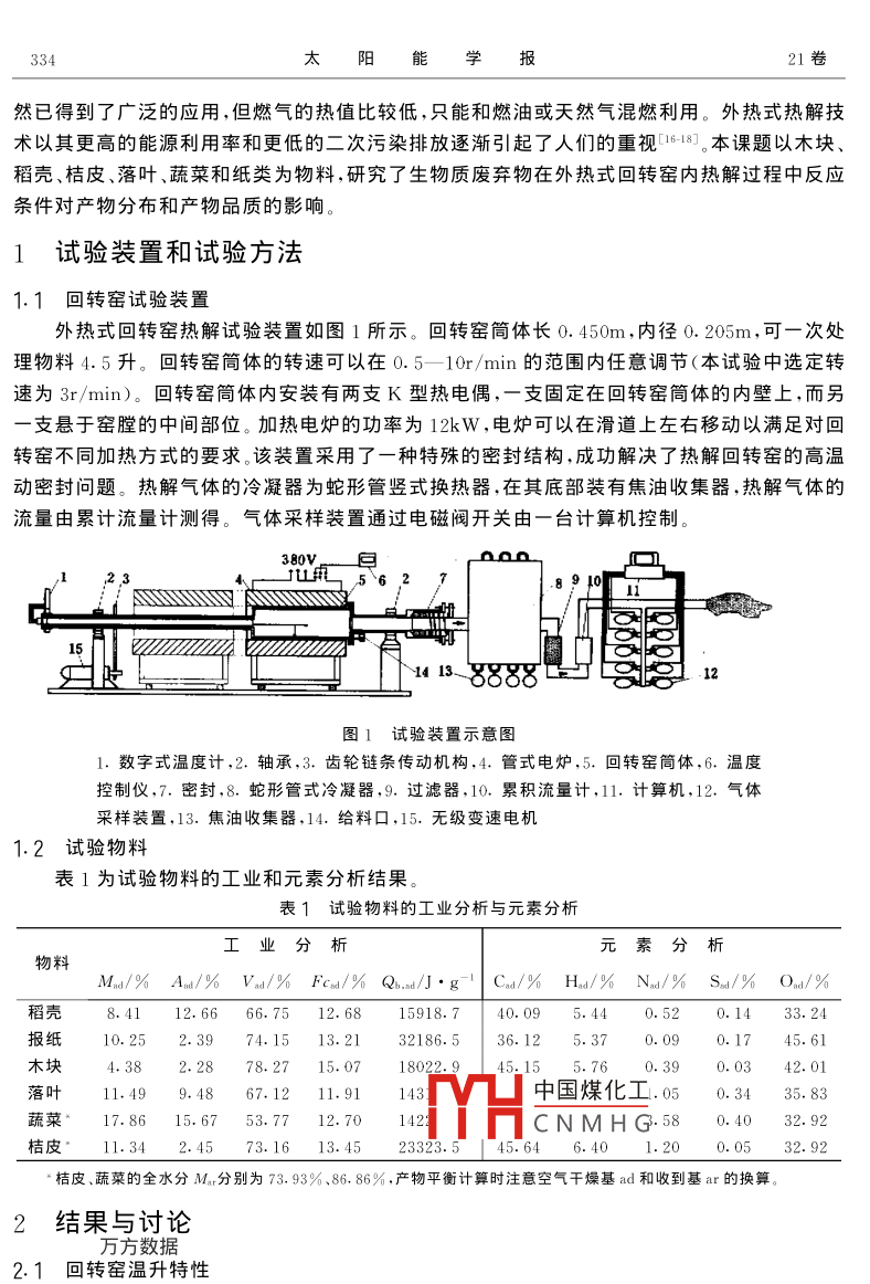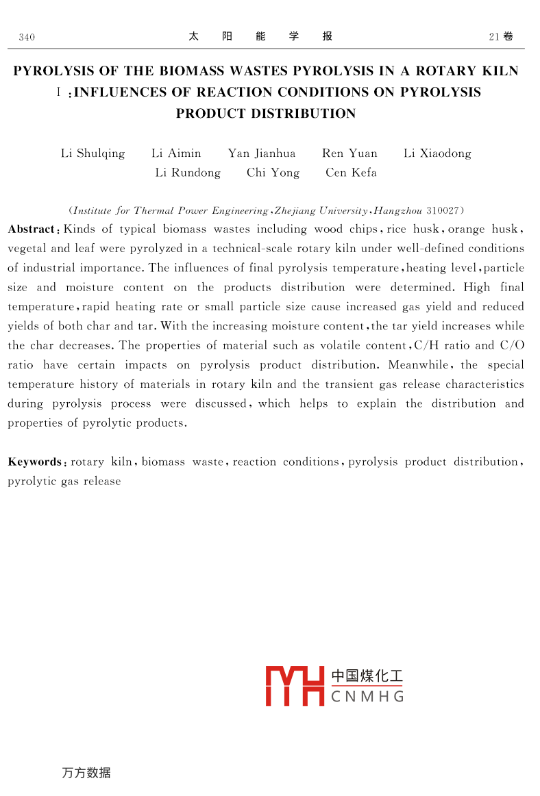 生物質(zhì)廢棄物在回轉(zhuǎn)窯內(nèi)熱解研究--Ⅰ.熱解條件對(duì)熱解產(chǎn)物分布的影響