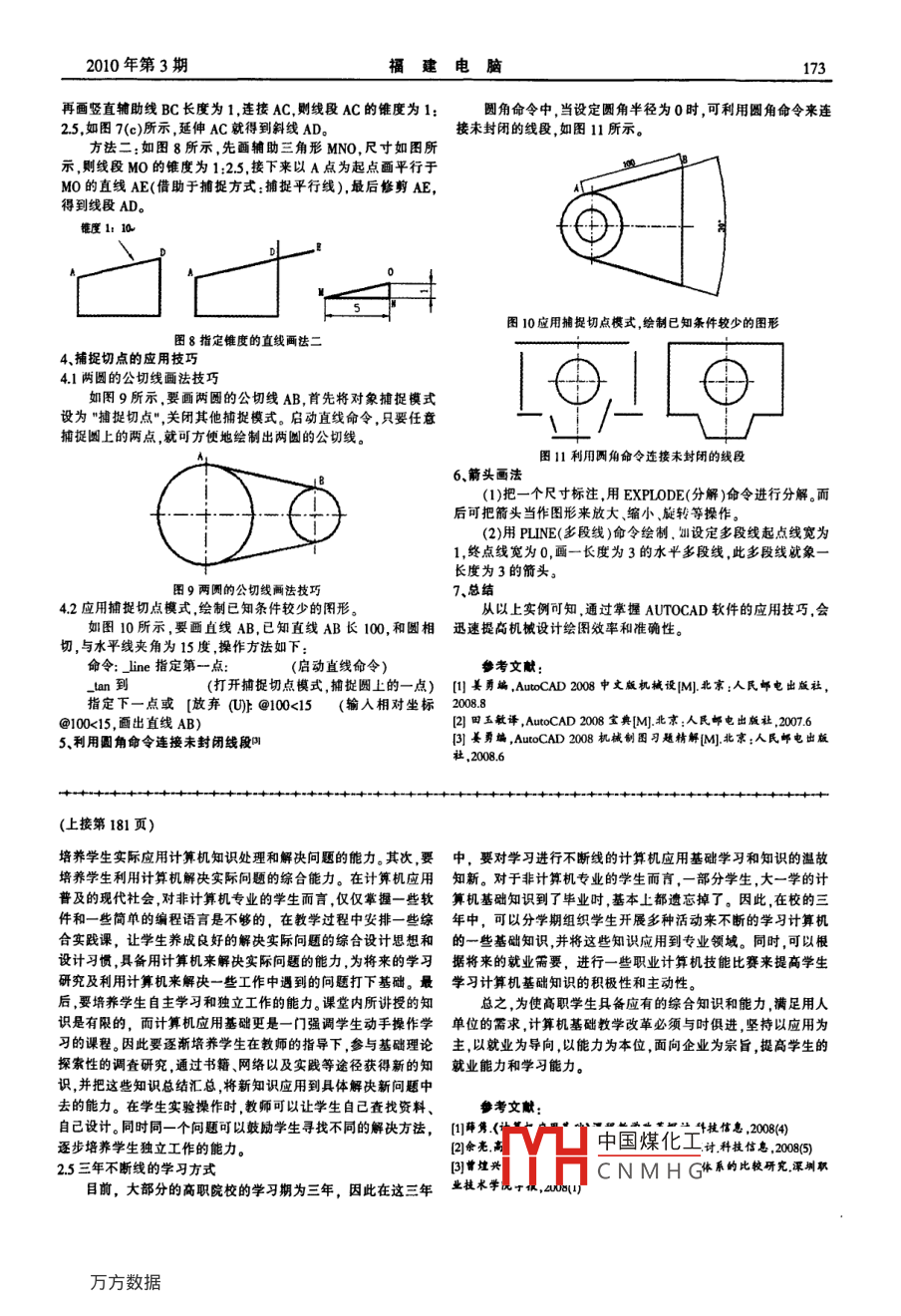 福建電腦2010年第3期AUTOCAD應(yīng)用技巧陳家欣(廈門海洋職業(yè)技術(shù)學(xué)院機(jī)電工程系福建廈門361012)【摘妟】:介紹幾種AUT0CAD軟件工程設(shè)計(jì)應(yīng)用技巧,如軸類零件的畫法、三角形內(nèi)切圓畫法、指定錐度的直線畫瀆、捕捉切點(diǎn)的應(yīng)用技巧、利用圓角命令連接未封閉線段、箭頭畫法等,有助于提高繪圖效率和準(zhǔn)確性。關(guān)鍵詞】:軸;圖塊;镎度;切點(diǎn)0、引言13應(yīng)用矩形命令,分段畫出軸的輪廓線AUTOCAD軟件作為通用的工業(yè)設(shè)計(jì)軟件,在繪制二維如圖4所示,從左到右,依次繪制矩形 ABCD, DEFG GHI,程圖方面具有無可比擬的優(yōu)勢(shì),其快捷、方便,易學(xué)易用等優(yōu)點(diǎn),各矩形尺寸如圖所示,構(gòu)成軸的輪廓線廣泛應(yīng)用于機(jī)械設(shè)計(jì)、建筑設(shè)計(jì)、室內(nèi)設(shè)計(jì)、家俱設(shè)計(jì)、園林設(shè)1.3應(yīng)用偏移命令畫出所有的軸線段,而后用修剪命令修剪多計(jì)、服裝設(shè)計(jì)、地圖繪制、空調(diào)管路系統(tǒng)設(shè)計(jì)城市規(guī)劃、工作流余的線段。程圖等行業(yè)本文筆者通過長期的工程設(shè)計(jì)和教學(xué)實(shí)踐,積累了如圖5所示,先畫出直線AB,而后沿向上方向偏移3次偏些應(yīng)用技巧,希望有助于 AUTOCAD用戶提高繪圖效率和準(zhǔn)移距離如圖5所示,生成3條水平線。再畫直線CD,而后沿向右確性,加快 AUTOCAD軟件在各行業(yè)的推廣和應(yīng)用。方向偏移3次,偏移距離如圖5所示生成3條垂直線。最后用1、軸類零件的畫法技巧修剪命令,修剪多氽的線段軸類零件是常見的工程設(shè)計(jì)典型零部件,下面介紹四種方法繪制如圖1所示的軸。圖1軸類零件圖形圖5應(yīng)用偏移修剪命令生成軸的輪廓線11應(yīng)用定義尺寸為1×1的軸段圖塊2、三角形內(nèi)切圓繪制技巧把邊長為1的正方形定義為軸段圖塊如圖2所示,圖塊基要畫如圖6左圖所示的三角形內(nèi)切團(tuán)圖形,已知等邊三角點(diǎn)選擇正方形左邊中點(diǎn)。將來畫軸類零件圖形吋,只需調(diào)用軸段形邊長為10,三角形內(nèi)的圓兩兩相切,并和三角形的邊相切,圖塊,輸入XY方向比例X方向比例就是軸的長度,Y方向比小圓的直徑未知。如圖6右圖所示,先假設(shè)圓的直徑為10,畫出例就是軸的直徑。叫類似的圖形,得出三角形一邊長為573最后用縮放命令,縮放比例因子為100573=1.745,就得到左邊的圖形6圖2尺寸為1X1的軸段圖塊12應(yīng)用直線命令畫出軸的輪廓線如圖3所示,從左到右用直線命令繪制如下圖形,而后以中心線為鏡像線鏡像生成整根軸的圖形。圖6三角形內(nèi)切圓繪制技巧度1:25圖3用直線命令繪制軸的輪廓線中國煤化工CNMHG、指定如圖7(a)所示,要求畫出錐度是1:25的斜線AD,可采用的方法有以下兩種:圖4應(yīng)用矩形命令分段畫出軸的輪廓線方法一:如圖7(b)所示,可先畫水平輔助線AB長度為52010年第3期福建電腦173再畫豎直輔助線BC長度為1,連接AC則線段AC的錐度為1:圓角命令中當(dāng)設(shè)定圓角半徑為0時(shí),可利用圓角命令來連25如圖7(c)所示,延伸AC就得到斜線AD接未封閉的線段如圖11所示。方法二:如圖8所示,先畫輔助三角形MNO,尺寸如圖所示,則線段Mo的錐度為1:25,接下來以A點(diǎn)為起點(diǎn)畫平行于Mo的直線AE(借助于捕捉方式:捕捉平行線),最后修剪AE得到線段AD眶度1:10圖10應(yīng)用捕捉切點(diǎn)模式繪制已知條件較少的圖形圖8指定錐度的直線畫法二4、捕捉切點(diǎn)的應(yīng)用技巧4l兩圓的公切線畫法技巧如圖9所示,要畫兩圓的公切線AB,首先將對(duì)象捕捉模式設(shè)為"捕捉切點(diǎn)",關(guān)閉其他捕捉模式。啟動(dòng)直線命令,只要任意捕捉圓上的兩點(diǎn)就可方使地繪制出兩圓的公切線圖11利用圓角命令連接未封閉的線段6、箭頭畫法(1)把一個(gè)尺寸標(biāo)注,用 EXPLODE(分解)命令進(jìn)行分解。而后可把箭頭當(dāng)作圖形來放大、縮小、旋轉(zhuǎn)等操作(2)用PNE(多段線)命令繪制,如設(shè)定多段線起點(diǎn)線寬為1,終點(diǎn)線寬為0,畫一長度為3的水平多段線,此多段線就象長度為3的箭頭。圖9兩圓的公切線兩法技巧7總結(jié)42應(yīng)用捕捉切點(diǎn)模式繪制已知條件較少的圖從以上實(shí)例可知,通過掌握 AUTOCAD軟件的應(yīng)用技巧,會(huì)如圖10所示,要畫直線AB,已知直線AB長100,和圓相迅速提高機(jī)械設(shè)計(jì)繪圖效率和準(zhǔn)確性切,與水平線夾角為15度操作方法如下命令:line指定第一點(diǎn):(啟動(dòng)直線命令)參考文獻(xiàn)到(打開捕捉切點(diǎn)模式抽捉圓上的一點(diǎn))(姜勇蝙, AutoCAD200中丈版機(jī)械設(shè)M北家:人民崢電出版社,指定下一點(diǎn)或[放棄(U@100<15(輸入相對(duì)坐標(biāo)2008@100<15,畫出直線AB)2]田玉敏譯, AutoCAD2008寶典M]北京:人民郵電出版社,200765利用圓角命令連接未封閉線段國3]姜勇端, AutoCAD2008機(jī)械制圖習(xí)題精解M]北京:人民郵電出版20086上接第181頁)培養(yǎng)學(xué)生實(shí)際應(yīng)用計(jì)算機(jī)知識(shí)處理和解決問題的能力。其次要中,要對(duì)學(xué)習(xí)進(jìn)行不斷線的計(jì)算機(jī)應(yīng)用基礎(chǔ)學(xué)習(xí)和知識(shí)的溫故培養(yǎng)學(xué)生利用計(jì)算機(jī)解決實(shí)際問題的綜合能力。在計(jì)算機(jī)應(yīng)用知新。對(duì)于非計(jì)算機(jī)專業(yè)的學(xué)生