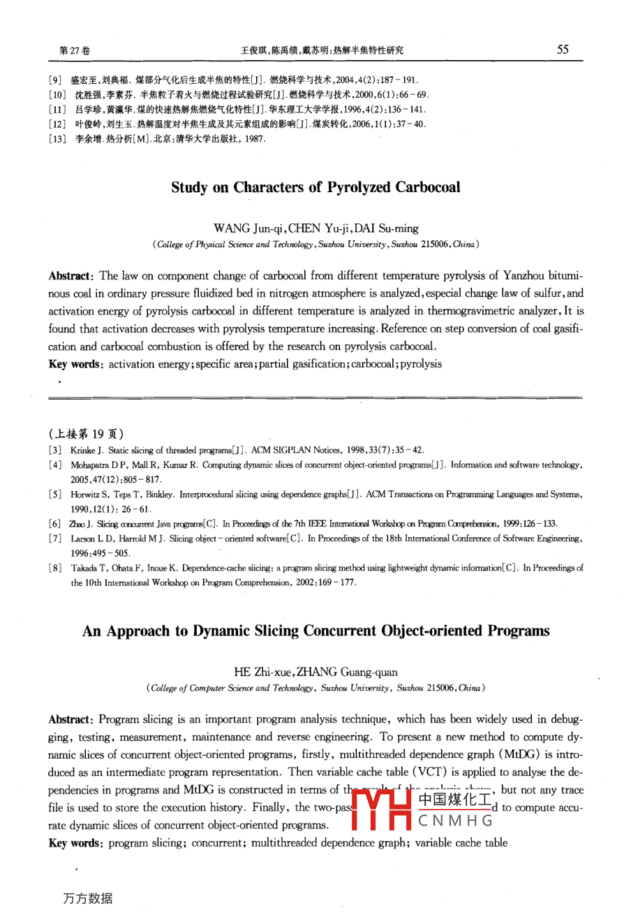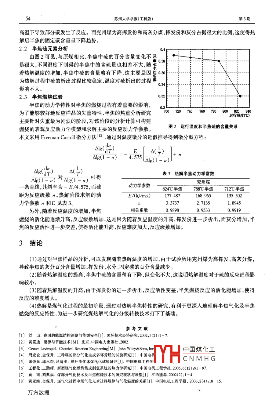 第27卷第3期蘇州大學(xué)學(xué)報(工科版Vol 27 No. 3200年6月JOURNAL OF SUZHOU UNIVERSITY ENGINEERING SCIENCE EDITIoN文章編號:1673-047X2007)03-0052-04熱解半焦特性研究王俊琪,陳禹績,戴蘇明(蘇州大學(xué)物理科學(xué)與技術(shù)學(xué)院,江蘇蘇州215006摘要:利用兗州煙煤在不同溫度下常壓流化床氮?dú)鈿夥盏臒峤獍虢棺鳛闃悠?分析了半焦成分變化的規(guī)律,特別是硫的變化規(guī)律,并利用熱重分析儀分析了不同溫度下熱解半焦的活化能,研究表明隨著熱解溫度的升高,活化能逐漸降低。熱解半焦的研究為煤氣化及半焦燃燒的分級轉(zhuǎn)化技術(shù)提供了參考。關(guān)鍵詞:活化能;比表面積;部分氣化;半焦;熱解中圖分類號:TK16文獻(xiàn)標(biāo)識碼:A0引言我國的能源結(jié)構(gòu)以煤為主煤所占的比例大致為70%1-2),而煤作為一種含有多種雜質(zhì)的有機(jī)混合礦物,其不同的組分在化學(xué)反應(yīng)性上差別很大煤中的低活性組分的反應(yīng)特性決定了氣化過程必須采用高溫、高壓和長停留時間。將煤氣化過程近似用化學(xué)反應(yīng)控制的縮核模型計算的全部氣化所需的停留時間將是氣化碳轉(zhuǎn)化率達(dá)到90%所需時間的兩倍3。若根據(jù)煤的不同組分和不同反應(yīng)階段反應(yīng)性不同的特點(diǎn)實(shí)施煤熱解、氣化燃燒分級轉(zhuǎn)化,則可使煤氣化技術(shù)48簡化,成本降低并可以解決煤中污染物的脫除問題。半焦作為煤部分熱解氣化后的產(chǎn)物,與原煤在組分上以及動力學(xué)特性上有很大的區(qū)別盛宏至等9研究了煤部分氣化后生成半焦的特性,并在管式沉降爐中進(jìn)行了半焦燃燒試驗(yàn),計算了不同半焦的動力學(xué)參數(shù);沈勝強(qiáng)等10對半焦的著火與燃燒過程進(jìn)行了深入的研究;呂學(xué)珍等利用快速熱解裝置研究了在氮?dú)鈿夥蘸统簵l件下神府煤的熱解行為及熱解焦的燃燒氣化行為;葉俊嶺等12研究了熱解溫度對半焦生成及其元素組成的影響得出了半焦中HCOC與溫度的關(guān)系。本文以在不同溫度下流化床N2氣氛下獲得的半焦為樣品,分析了半焦組分隨溫度變化的規(guī)律,并利用熱重分析儀進(jìn)行半焦燃燒試驗(yàn),求解半焦的活化能,為煤部分熱解氣化及半焦燃燒的分級轉(zhuǎn)換技術(shù)的應(yīng)用提供了必要的參考。1試驗(yàn)樣品與試驗(yàn)裝置1.1試驗(yàn)樣品試驗(yàn)用煤為兗州煙煤,兗州煙煤的元素分析和工業(yè)分析見表1,原煤的粒徑為0.9~1.6mm和1.632mm。試驗(yàn)所用半焦采用小型流化床的氮?dú)鈿夥障碌臒峤獍虢篃峤鉁囟确謩e為824℃、788℃、712℃,半焦燃燒試驗(yàn)在熱重分析儀上進(jìn)行。中國煤化工CNMHG將局:份1922男)講,主要研究方向?yàn)槊饺紵裏峤鈿饣嗦?lián)產(chǎn)技術(shù)第27卷俊琪,陳禹績戴蘇明:熱解半焦特性研究表1原煤的元素分析與工業(yè)分析工業(yè)分析元素分析煤樣Mad/% Aad/% Vad/% FCad/g Qb, ad(J/g)Cad/% Had%Nad/% St, ad/%Oad/%兗州煙煤1.7625092858441572437561063941.160446.551.2試驗(yàn)裝置熱重試驗(yàn)在TGA③SDTA851型熱天平上進(jìn)行,自動取樣按照系統(tǒng)設(shè)定的升溫程序自動進(jìn)行試驗(yàn)。半焦用量約5mg,反應(yīng)氣體為空氣,流量為40ml/min,升溫速率為50℃/mino2結(jié)果與分析21半焦工業(yè)分析在不同溫度下制得的半焦,其工業(yè)分析見數(shù)據(jù)表2。表2在不同溫度下制得的半焦工業(yè)分析數(shù)據(jù)項(xiàng)目VadFCad原煤粒徑單位%824℃半焦63.171.6~3.2mm788℃半焦2.79712℃半焦2.58284.6780℃半焦2.815469.160.6~1.6mm716℃半焦2.7324.716795}1--1---4--運(yùn)行贏度(℃)瀑度(℃(a)不同半焦的水分(b)不同半焦的灰分運(yùn)行福度(℃(c)不同半焦的揮發(fā)份(d)不同半焦的固定碳圖1半焦各組分隨溫度中國煤化工從圖1可見,兗州煤制備的熱解半焦隨著熱解溫度的HCNMHG,灰的百分含量迅速增加,揮發(fā)份的含量迅速下降,固定碳含量迅速降低。隨著熱解溫度的提高,由于水分和揮發(fā)份的進(jìn)一步析出,半焦的灰分的百分含量增加揮發(fā)份含量急劇下降。同時由于試驗(yàn)中采用的是普通氮?dú)?純度為98%蘇州大學(xué)學(xué)報(工科版)第3期高溫下導(dǎo)致部分碳發(fā)生了反應(yīng)。而兗州煤為高揮發(fā)份和高灰分煤,揮發(fā)份和灰分占據(jù)很大的比例,這使得熱解后半焦的固定碳含量呈下降趨勢。2.2半焦硫元素分析由圖2可見,與原煤相比,半焦中硫的百分含量變化不雯是很大不同溫度下制得的半焦中的含硫量也相差不大博著熱解溫度的增加半焦中硫的含量略有下降,這主要是因如03F…÷.;+-1-為熱解過程中硫的析出過程比較穩(wěn)定,溫度對硫析出的過程d·影響不大。2.3半焦燃燒試驗(yàn)半焦的動力學(xué)特性對半焦的燃燒過程有著重要的影響為了能夠較好地反應(yīng)樣品的失重特性,半焦的熱重分析研究60780800820運(yùn)行溫度主要針對失重最為劇烈的階段,對該階段的分析計算可構(gòu)建燃燒的表觀反應(yīng)動力學(xué)模型和求解主要的反應(yīng)動力學(xué)參數(shù)。圖2運(yùn)行溫度和半焦硫的含量關(guān)系本文采用 Freeman-Carroll t微分方法13),通過對溫度微分的近似推導(dǎo)得到微分型方程:E△(△lg(1-a)4.575L△g(1△()可得表3熱解半焦動力學(xué)常數(shù)兗州煤一條直線,其斜率為-E/4.575,而截動力學(xué)參數(shù)824℃半焦788℃半焦712℃半焦距為反應(yīng)級數(shù)n。
