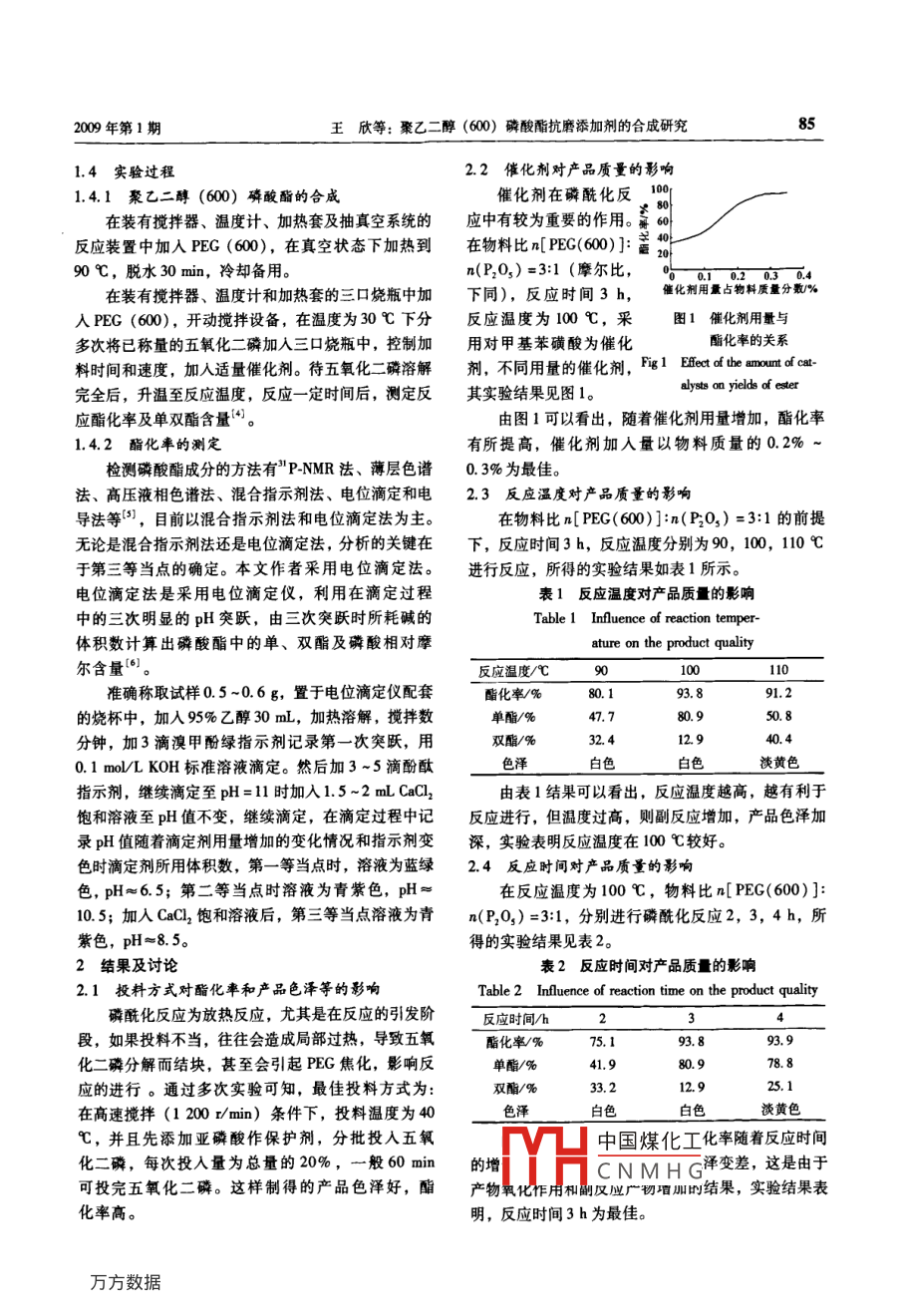 2009年1月潤滑與密封Jan. 2009第34卷第1期LUBRICATION ENGINEERINGVol. 34 No. 1聚乙二醇(600) 磷酸酯抗磨添加劑的合成研究王建華2賈夢秋'(1.北京化工大學(xué)北京 10029; 2.海軍后勤技術(shù)裝備研究所北京1002)摘要:合成了聚乙二醇(600) 磷酸酯,討論了催化劑用量及投料方式、物料比、反應(yīng)溫度及反應(yīng)時間對反應(yīng)結(jié)果2的影響,確定了最佳反應(yīng)條件。催化劑用量為0.2% -0. 3%,催化劑在高速攪拌下采用分批加料方式,在溫度100 C,反應(yīng)時間3 h,物料比為3:1的條件下,酯化率達(dá)到了93.8%。關(guān)鍵詞:聚乙二醇(600)磷酸酯;潤滑劑;五氧化二磷中圖分類號: TE626.3 文獻(xiàn)標(biāo)識碼: A文章編號: 0254 -0150 (2009) 1-084-3Study on the Synthesis of Polyethylene Glycol ( 600) PhosphateWang Xin'.2 Wang Jianhua' Jia Mengqiu'(1. Bejig Univensity of Chemisty Technology , Beijing 1002, China;2. Nary Logistie Technology and Equipment Insitute of PLA, Beijing 10072, China)Abstract: Polyethylene glycol (600) phosphate was synthesized from phosphorus pentoxide and PEC( 600) , the infu-ences of the dosage of catalyzer, the mode of adding material and the proportion of raw material , the reaction temperatureand reaction time on the product were studied , and the optimum condition of reaction was determined. When the dosage ofcatalyzer is 0.2% ~0. 3% , and the catalyzer is added in batch by batch, the proportion of PEG(600 ) and phosphoruspentoxide is 3:1 , and the mixture is kept 100 C for 3 hours ,production rate achieves 93. 8%Keyords:polyethylene glycol (600) phosphate ;anti abrasion aitive;phosphorus pentoxide磷酸酯是由含羥基的有機(jī)化合物(脂肪醇、聚聚乙二醇PEG (600) (天津市科密歐化學(xué)試劑開乙二醇、烷基酚聚氧乙烯醚、脂肪醇聚氧乙烯醚、烷發(fā)中心生產(chǎn),化學(xué)純),亞磷酸、五氧化二磷、對甲.基多苷等)與磷酰化試劑( POCI]、PCI,、 焦磷酸和.基苯磺酸(北京化學(xué)試劑公司生產(chǎn),均為分析純),P203)進(jìn)行酯化反應(yīng)制得。聚乙二醇(600) 磷酸酯95%乙醇,溴甲酚綠指示劑,0. 1 mol/L KOH標(biāo)準(zhǔn)溶是磷酸酯類陰離子表面活性劑的- -種,是由聚乙二醇液,酚酞指示劑,CaCl2 飽和溶液。(600)即PEG (600) 與磷酸化試劑進(jìn)行磷酸化反應(yīng)制取的,它與其它磷酸酯- -樣具有良好的抗靜電、乳HJ-5多功能攪拌器,PHS 23C 型酸度計,化、防銹、分散、抗磨等性能",大量應(yīng)用于紡織油ESJ205-4型電子天平,DZTW 型連續(xù)可調(diào)自動恒溫電劑、清洗劑、金屬潤滑劑中。而PEG (600) 磷酸酯熱套, 250 mL玻璃三口燒瓶。在抗靜電、抗磨減摩性能方面則表現(xiàn)極好,應(yīng)用的領(lǐng)1.3 合成原理域更為廣泛2-31。目前未見有文獻(xiàn)報道聚乙二醇目前一般所用的磷酸化試劑有五氧化二磷、三氯(PEG)系列產(chǎn)品的合成研究情況。本文作者在實(shí)驗化磷、焦磷酸等,其中以五氧化二磷應(yīng)用最為廣泛,室合成了聚乙二醇(600) 磷酸酯抗磨添加劑,討論工業(yè)上普遍使用的是五氧化二磷。P2O, 反應(yīng)時是逐了各種因素對反應(yīng)結(jié)果的影響。將實(shí)驗合成的產(chǎn)品添步醇解的,其產(chǎn)物是磷酸單酯、磷酸雙酯、磷酸二聚加到潤滑油基礎(chǔ)油及水基潤滑劑中,發(fā)現(xiàn)能夠明顯增酯、少量磷酸三酯、聚磷酸酯和未反應(yīng)的聚乙二醇的強(qiáng)其抗磨減摩性能,潤滑性能優(yōu)異,可以替代某些對混合物,但主要是單酯和雙酯。單酯的水溶性、乳化環(huán)境及對人體不友善的添加劑,值得進(jìn)一步深人研性和抗靜電性好;雙酯的平滑性好,在水中呈分散狀究。態(tài)。本實(shí)驗采用五氧化二磷作磷?;噭摲磻?yīng)復(fù)1實(shí)驗部分雜,產(chǎn)物是由單酯、雙酯、聚磷酸酯和未反應(yīng)的PEG1.1 原料與試劑(600)組成的混合物。中國煤化工收稿日期: 2008 -03-10o(jYHC N M H GCH,0).CH,O!°作者簡介:王欣(1978-),男,工程師,碩士研究生. E mail;HO(CH,CH2O).CH2O OHsingking78@ sina. com。2009年第1期王欣等:聚乙二醇(60)磷酸酯抗磨黍加劑的合成研究851.4 實(shí)驗過程.2.2催化劑對產(chǎn) 品質(zhì)量的影響1.4.1 聚乙二醇(600) 磷酸酯的合成催化劑在磷酰化反在裝有攪拌器、溫度計、加熱套及抽真空系統(tǒng)的應(yīng)中有較為重要的作用。每604反應(yīng)裝置中加入PEG (600),在真空狀態(tài)下加熱到.在物料比n[ PEG(600)]:蓋400f90C,脫水30 min,冷卻備用。.n(P203) =3:1 (摩爾比,的0.1_ 0.2 0.3 0.4在裝有攪拌器、溫度計和加熱套的三口燒瓶中加下同),反應(yīng)時間3 h,值化劑用量占物料質(zhì)量分敷/%人PEG (600), 開動攪拌設(shè)備,在溫度為30C下分反應(yīng)溫度為100 C,采圖1催化劑用量與多次將已稱量的五氧化二磷加入三口燒瓶中,控制加用對甲基苯磺酸為催化酯化率的關(guān)系料時間和速度,加入適量催化劑。待五氧化二磷溶解劑,不同用量的催化劑,Fig1 Efet of the amount of cat-alysts on yields of ester完全后,升溫至反應(yīng)溫度,反應(yīng)-定時間后,測定反.其實(shí)驗結(jié)果見圖1。應(yīng)酯化率及單雙酯含量4”。由圖1可以看出,隨著催化劑用量增加,酯化率1.4.2酯化率的測定有所提高,催化劑加人量以物料質(zhì)量的0.2% ~檢測磷酸酯成分的方法有"P-NMR法、薄層色譜0. 3%為最佳。法、高壓液相色譜法、混合指示劑法、電位滴定和電2.3反 應(yīng)溫度對產(chǎn)品質(zhì)量的影響導(dǎo)法等[5),目前以混合指示劑法和電位滴定法為主。在物料比n[ PEG(600)]:n(P20,) =3:1的前提無論