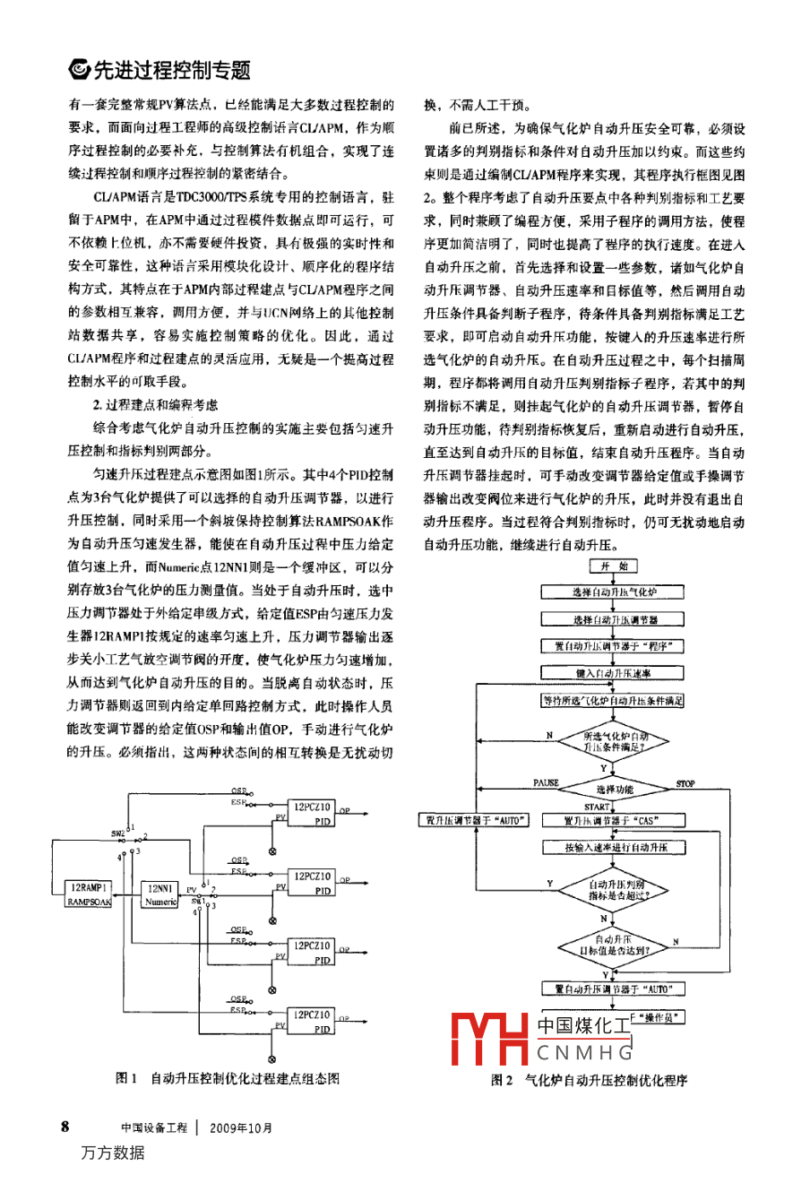 ,先進(jìn)過(guò)程控制專(zhuān)題文章編號(hào):1671-0711(200)100007-03氣化爐自動(dòng)升壓控制優(yōu)化陳捷(中國(guó)石化股份有限公司鎮(zhèn)海煉化分公司,浙江寧波315207摘要:針對(duì)大化肥裝置氣化爐開(kāi)工升壓特點(diǎn),依靠TDC30TPS集散型控制系統(tǒng)過(guò)程管理站APM的強(qiáng)大控制軟件,靈活應(yīng)用過(guò)程建點(diǎn)和 CLAPM語(yǔ)言編程,結(jié)合圖像編輯軟件,對(duì)氣化爐升壓工藝過(guò)程進(jìn)行控制優(yōu)化,實(shí)現(xiàn)氣化爐的自動(dòng)升壓功能。關(guān)鍵詞:自動(dòng)升壓;控制優(yōu)化;TDC3s;APM中圖分類(lèi)號(hào):TP273文獻(xiàn)標(biāo)識(shí)碼:B大化肥裝置氣化爐開(kāi)工投料后的升壓,是氣化爐開(kāi)工值|SPPV|≤0.5MPa;氣化爐氧氣流量變化率絕對(duì)值過(guò)程中的重要環(huán)節(jié),升壓操作的優(yōu)劣,直接影響著氣化爐|sP-PV)SP]×10%≤10%;氣化爐蒸汽流量變化率絕對(duì)內(nèi)渣油部分氧化反應(yīng)的質(zhì)量及安全生產(chǎn)。在氣化爐升壓過(guò)值P-PV)A門(mén)×100%|≤10%。中,習(xí)慣采用手動(dòng)逐漸關(guān)閉氣化爐壓力控制閥開(kāi)度,減這樣,在氣化爐自動(dòng)升壓過(guò)程中,當(dāng)上述判別指標(biāo)不少工藝氣的放空量來(lái)達(dá)到氣化爐按一定速率升壓的目的。滿(mǎn)足時(shí),自動(dòng)升壓將處于暫停狀態(tài),待判別指標(biāo)恢復(fù)正常,整個(gè)升壓過(guò)程具有相當(dāng)?shù)牟僮麟y度。應(yīng)用DCS實(shí)施氣化爐控可繼續(xù)進(jìn)行氣化爐自動(dòng)升壓。制,為合理利用DCS軟件進(jìn)行過(guò)程優(yōu)化控制提供了應(yīng)用平3.自動(dòng)升壓工藝要求臺(tái),從而提出了采用DC實(shí)現(xiàn)氣化爐自動(dòng)升壓控制優(yōu)化的課由于氣化爐自動(dòng)升壓時(shí),操作人員很少干預(yù),從要求自動(dòng)升壓操作界面方便直觀、保證自動(dòng)升壓過(guò)程中的設(shè)備一、自動(dòng)升壓要點(diǎn)及生產(chǎn)安全的角度出發(fā),提出了下述工藝要求:升壓速率氣化爐自動(dòng)升壓較復(fù)雜,不僅要求氣化爐的壓力按一能自由給定,最大值限為0 MPa/min;升壓目標(biāo)值能自由給定的速率勻速上升,同時(shí)氣化爐的相關(guān)工藝參數(shù)必須符合定,最大值限為80MPa;升壓的控制閥有12Pcv-10(11,規(guī)定的工藝指標(biāo),自動(dòng)升壓的條件具備指標(biāo)、判別指標(biāo)及310)和14PC-3,要自由選擇;自動(dòng)升壓過(guò)程中若自動(dòng)升壓工藝要求,構(gòu)成了氣化爐自動(dòng)升壓的三要素判別指標(biāo)中任一項(xiàng)超標(biāo),即暫停自動(dòng)升壓進(jìn)程,并聲光報(bào)1.自動(dòng)升壓條件具備指標(biāo)警;閂動(dòng)升壓的壓力到達(dá)冂標(biāo)值后,升壓自動(dòng)停止,并且自動(dòng)升壓條件具備的指標(biāo)主要有:氣化爐爐內(nèi)溫度、聲光提示;自動(dòng)升壓設(shè)立開(kāi)始、暫停和停止功能選擇界面,氣化爐壓力、氣化爐急冷室液位、氣化爐差壓、氣化爐渣必要時(shí)可人工干預(yù)。油流量、氣化爐蒸汽流量、氣化爐氧氣流量二、自動(dòng)升壓控制憂(yōu)化的實(shí)現(xiàn)2自動(dòng)升壓判別指標(biāo)1.控制軟件簡(jiǎn)介且氣化爐自動(dòng)升壓條件具備,啟動(dòng)自動(dòng)升壓功能后,氣化爐的過(guò)程控制和管理由TDC30TP控制系統(tǒng)實(shí)施氣化爐進(jìn)入自動(dòng)升壓過(guò)程,仍然要求氣化爐中的相關(guān)工藝完成,自動(dòng)升壓控制軟件則是通過(guò)先進(jìn)過(guò)程管理站APM來(lái)參數(shù)必須符合規(guī)定的工藝指標(biāo),此時(shí)的判別指標(biāo)相對(duì)于條實(shí)現(xiàn)體幾士中的數(shù)據(jù)采集和控制設(shè)件具備指標(biāo)有了更高的要求,共設(shè)定了5個(gè)判別指標(biāo):氣化備,中國(guó)煤化工能和豐富的控制功爐急冷室液位≥40%;氣化爐壓力控制閥控制放空量時(shí),其能軟CNMHO和順序控制,適用于閥位≥10%;氣化爐壓力控制器的給定值和測(cè)量值偏差絕對(duì)連續(xù)批量、順序控制等過(guò)程,就其連續(xù)控制來(lái)說(shuō),APM含2009年10月中國(guó)設(shè)備工程@先進(jìn)過(guò)程控制專(zhuān)題有一套完整常規(guī)Pv算法點(diǎn),已經(jīng)能滿(mǎn)足大多數(shù)過(guò)程控制的換,不需人工干預(yù)。要求,而面向過(guò)程工程師的高級(jí)控制語(yǔ)言 CLAPM,作為順前已所述,為確保氣化爐自動(dòng)升壓安全可靠,必須設(shè)序過(guò)程控制的必要補(bǔ)充,與控制算法有機(jī)組合,實(shí)現(xiàn)了連置諸多的判別指標(biāo)和條件對(duì)自動(dòng)升壓加以約束。而這些約續(xù)過(guò)程控制和順序過(guò)程控制的緊密結(jié)合束則是通過(guò)編制 CLAPM程序來(lái)實(shí)現(xiàn),其程序執(zhí)行框圖見(jiàn)圖CLAPM語(yǔ)言是TDC3001系統(tǒng)專(zhuān)用的控制語(yǔ)言,駐2。整個(gè)程序考慮了自動(dòng)升壓要點(diǎn)中各種判別指標(biāo)和工藝要留于APM中,在APM中通過(guò)過(guò)程模件數(shù)據(jù)點(diǎn)即可運(yùn)行,可求,同時(shí)兼顧了編程方便,采用子程序的調(diào)用方法,使程不依賴(lài)上位機(jī),亦不需要硬件投資,具有極強(qiáng)的實(shí)時(shí)性和序更加簡(jiǎn)潔明了,同時(shí)也提高了程序的執(zhí)行速度。在進(jìn)入安全可靠性,這種語(yǔ)吉采用模塊化設(shè)計(jì)、順序化的程序結(