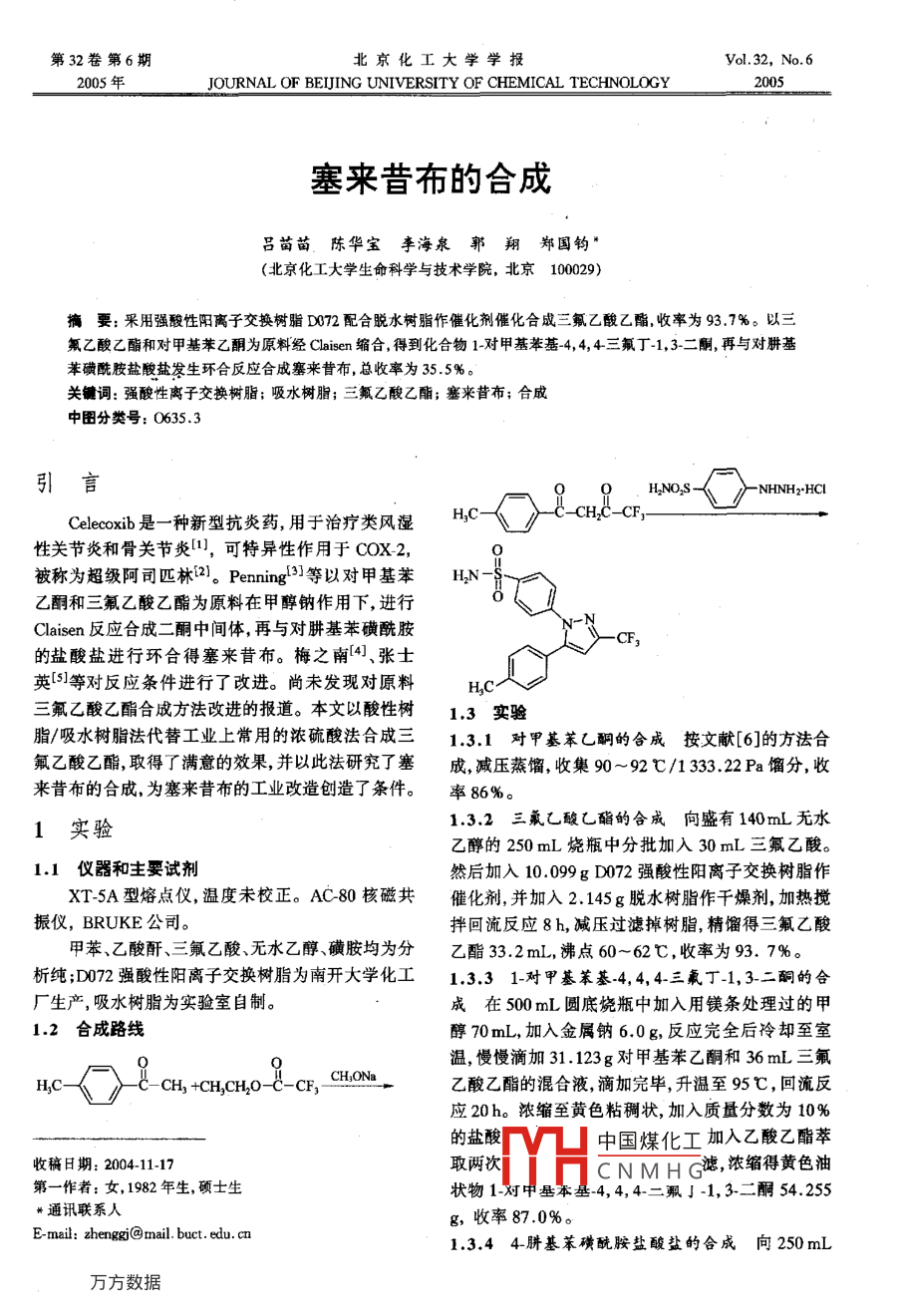第32卷第6期北京化工大學學報Vol. 32, No. 62005年JOURNAL OF BEIJING UNIVERSITY OF CHEMICAL TECHNOLOGY2005塞來昔布的合成呂苗苗,陳華寶李海泉郭翔鄭國鈞"(北京化I大學生命科學與技術學院,北京100029)摘要: 采用強酸性陽離子交換樹脂D072配合脫水樹脂作催化劑催化合成三氟乙酸乙酯,收率為93.7%。以三氟乙酸乙酯和對甲基苯乙酮為原料經Claisen縮合,得到化合物1-對甲基苯基4, 4, 4三氟丁-1,3二酮,再與對肼基苯磺酰胺鹽酸鹽發(fā)生環(huán)合反應合成塞來昔布,總收率為35.5%。關鍵詞:強酸性離子交換樹脂;吸水樹脂;三氟乙酸乙酯;塞來昔布;合成中圖分類號: 0635.3引言HNO,S--NHNH2:HClCelecoxib是一種新型抗炎藥,用于治療類風濕H,c- iC-CcHC_CcF,性關節(jié)炎和骨關節(jié)炎1,可特異性作用于COX-2, .0被稱為超級阿司匹林[2]。Penning[3]等以對甲基苯HN乙酮和三氟乙酸乙酯為原料在甲醇鈉作用下,進行Claisen反應合成二酮中間體,再與對肼基苯磺酰胺-CF;的鹽酸鹽進行環(huán)合得塞來昔布。梅之南[4]、張士英[51等對反應條件進行了改進。尚未發(fā)現(xiàn)對原料H,C三氟乙酸乙酯合成方法改進的報道。本文以酸性樹1.3實驗脂/吸水樹脂法代替工業(yè)上常用的濃硫酸法合成三1.3.1 對甲基苯乙酮的合成 按文獻[6]的方法合氟乙酸乙酯,取得了滿意的效果,并以此法研究了塞成,減壓蒸餾,收集90~92C/1333.22Pa餾分,收來昔布的合成,為塞來昔布的工業(yè)改造創(chuàng)造了條件。率86%。1.3.2 三氟乙酸乙酯的合成 向盛有140mL無水1實驗乙醇的250mL燒瓶中分批加入30mL三氟乙酸。1.1儀器和主要試劑然后加入10.099gD072強酸性陽離子交換樹脂作XT-5A型熔點儀,溫度未校正。AC-80 核磁共催化劑,并加入2.145g脫水樹脂作千燥劑,加熱攪振儀,BRUKE公司。拌回流反應8h,減壓過濾掉樹脂,精餾得三氟乙酸甲苯、乙酸酐、三氟乙酸、無水乙醇、磺胺均為分乙酯33.2mL,沸點60~62 C,收率為93.7%。析純;D072強酸性陽離子交換樹脂為南開大學化工1.3.3 1-對甲基苯基_4,4,4三氟丁-1,3-二酮的合廠生產,吸水樹脂為實驗室自制。成在500mL圓底燒瓶中加入用鎂條處理過的甲1.2合成路線醇70mL,加入金屬鈉6.0g,反應完全后冷卻至室溫,慢慢滴加31.123g對甲基苯乙酮和36mL三氟CHONaH,C-》-C-CH3+CH,CH,0-C-CF,乙酸乙酯的混合液,滴加完畢,升溫至95C,回流反應20h。濃縮至黃色粘稠狀,加入質量分數(shù)為10%的鹽酸中國煤化工加入乙酸乙酯萃收稿日期: 2004-11-17取兩次0HCN MH G濾,濃縮得黃色油第一作者:女, 1982年生,碩士生狀物1-對中基本基-4,4,4-二氟」-1,3-二酮54.255#通訊聯(lián)系人g,收率87.0%。E-mail: zhenggj@mail. buct. edu. cn1.3.4 4-肼基苯磺酰胺鹽酸鹽的合成 向 250 mL98北京化工大學學報2005年的三口瓶中加入40mL水和40mL濃鹽酸,攪拌下強酸進行反應,受此啟發(fā),本論文選用廉價易得的酸加入15.0g磺胺,冰鹽浴冷卻到0C以下,在劇烈攪性樹,脂代替濃硫酸用于該反應,但反應的收率僅為拌下慢慢滴加6.2g亞硝酸鈉溶于30 mL水的溶50.26%,延長反應時間對收率的提高沒有明顯的影液,約10滴/min,反應溫度控制在5C以下。反應響??紤]到酯化反應生成的水對反應的抑制作用,完畢(以KI 淀粉試紙變藍為終點),繼續(xù)攪拌30而脫水樹脂具有吸水作用,因此在本反應中將酸性min。將反應液加到亞硫酸鈉(32.5g,26mmol)的樹脂和脫水樹脂配合使用,三氟乙酸乙酯的收率可飽和水溶液(玲卻到0C以下)中,在5~10C保溫達93.7%,和硫酸法大致相同,該法后處理方便,催30 min,然后緩慢升溫至80~ 90 T,再加濃鹽酸50化劑可反復使用,可操作性強。mL,加熱1h,用鋅粉脫色,趁熱過濾,濾液濃縮至全量的三分之一。冷卻,析出結晶,過濾得白色晶體狀參考文獻物質17.835g,熔點158~ 160C,收率91.6%。[1] 傳得興,武秀忠.特異性環(huán)氧酶_2抑制劑塞來昔布1.3.5塞來昔布的合成 在250mL圓底燒瓶中加[J].中國新藥雜志2000, 9(6):23 - 26入無水乙醇和水各30 mL,加入18.514 g(79.61.2] Mengle G L, Hubbard, R C, Karim A, et al. A studyof the platelet effects of SC58653, a novel cax-2 selectivemmol) 1-對甲基苯基_4, 4, 4-三氟丁-1, 3-二酮和inhibitor[J]. Arthritis Rheum, 1997, 40(9): 9319.504 g(87.57 mmol)對氨基磺?;诫蔓}酸鹽,攪[3] Penning T D, Talley J J, Isakson P C, et al. Synthesis拌回流20h,反應結束后蒸去溶劑得黃色固體分別and biological evaluation of the 1, 5-diarylpyazole class of加入適量水和乙酸乙酯,分液漏斗除去水層,乙酸乙cyclooxygenase2 inhibitors: Identification of 4-[ 5-(4-酯層用無水碗酸鎂干燥,過濾,蒸千得淺黃色固體,methylphenyl )-3-< trifluoromethyl )-1H pyrazol-1-yI ]乙酸乙酯/石油醚為溶劑重結晶,得塞來昔布11.8benznesulfonamide( SC-58635, celecoxib)[J]. J Medg,熔點157~159C ,重結晶收率40.8%。H-NMRChem, 1997, 40(9):1347 - 1365(δ,CDCl3): 7.90~6.96(m, 9H, ArH), 6.70(s, 1H,[4]梅之南, 施震,江細和,等. COX-2抑制劑Celecoxib的pyazole-H), 3.30(s, 2H, NH2), 2.32(s, 3H, CH)。合成[J].中國醫(yī)藥工業(yè)雜志, 2000, 31(10) :334[5] 張士英,何春桃,吳達俊.2型環(huán)氧酶抑制劑賽來昔布2結果與討論的合成[J].合成化學, 2002, 10(3) :260文獻[7]報道在濃硫酸的催化下,三氟乙酸乙酯[6] 章思規(guī),辛忠.精細有機化工制備手冊[M].北京:科學技術文獻出版社, 1994,435可由三氟乙酸與無水乙醇反應得到。但該方法存在[7] 樊能廷.有機合成事典[M].北京:北京理工大學出版嚴重腐蝕生產設備,易產生副反應,對環(huán)境污染大社, 1992, 522等缺點。文獻[8]報道在氨基酸酯的合成中為減少8] 田部浩三.固體酸堿及催化性