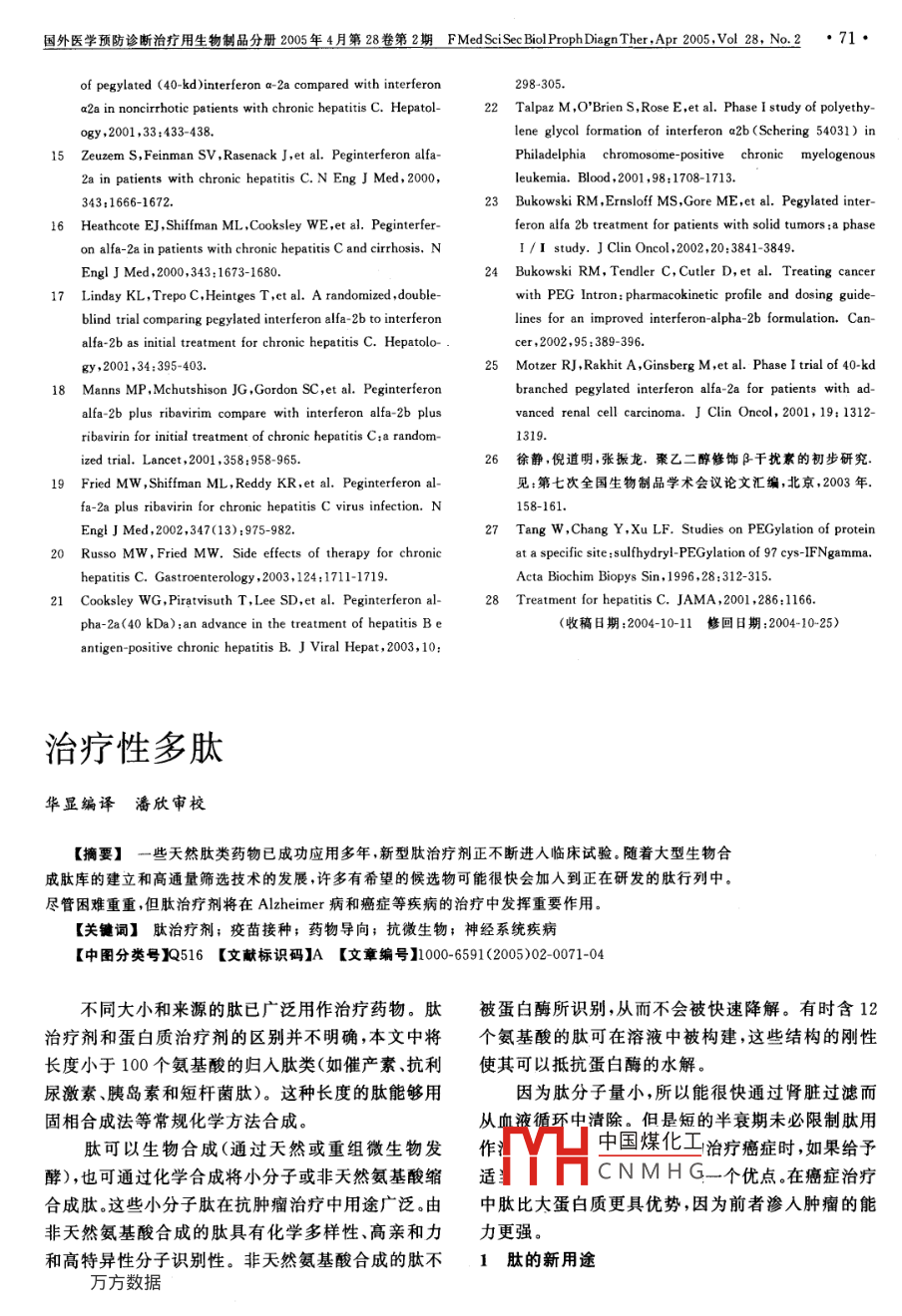 國外醫(yī)學(xué)預(yù)防診斷治療用生物制品分冊2005年4月第28卷第2期 FMed Sci Sec Biol Proph Diagn Ther.,Apr200vol28,No.2·67聚乙二醇干擾素童葵塘綜述【摘要】聚乙二醇(PEG)具有溶解性良好、毒性很小和無抗原性的特性。PEG修飾蛋白質(zhì)使分子量增加,在體內(nèi)半衰期延長,可以減少用藥次數(shù),提高治療效果。本文對PEG的結(jié)構(gòu)、性狀、對干擾素修飾的方法、修飾后的藥代動力學(xué)和臨床效果進行綜述。PEG修飾重組人干擾素a2a和PEG修飾重組人干擾素a2b在體內(nèi)藥代動力學(xué)均有明顯改善,半衰期明顯延長。兩種PEG干擾素均已進行臨床試驗。每周注射1次治療丙型肝炎,效果明顯較普通干擾素為好。其安全性與普通干擾素基本相似?!娟P(guān)鍵詞】干擾素;聚乙二醇;丙型肝炎【中圖分類號衛(wèi)R978.7【文獻標(biāo)識碼】A【文章編號】000-6591(2005)02-0067-05聚乙二醇(PEG)修飾是指一個或幾個PEG分雜質(zhì)引起的雙功能活化PEG未去除;低選擇性和不子吸附于蛋白質(zhì)、多肽等生物分子,改進它們的藥代良反應(yīng)的存在。針對以上問題發(fā)展了第二代PEG修動力學(xué)和藥效學(xué)性狀,使之達到較好的臨床效果。飾劑34,常用的是mPEG丙醛,它對N-末端的選PEG具有獨特的性狀,它在水溶液和大多數(shù)溶劑中擇性很高,因此修飾物的均一性明顯改善,mPEG-溶解良好,毒性很小,對蛋白分子沒有不良作用。丙醛修飾蛋白是通過Sch堿的形式來實現(xiàn),連接PEG本身無免疫原性,能使蛋白質(zhì)不易被蛋白酶降鍵相對穩(wěn)定。所用mPEG的分子量為2000,由于水解而穩(wěn)定性增加,修飾蛋白質(zhì)使分子量增加,不易被合程度高,使修飾物的表觀分子量和表觀體積提高。腎臟代謝而延長藥物在體內(nèi)的半衰期,因此可以減另一個優(yōu)點是除去了由二醇雜質(zhì)產(chǎn)生的雙功能團衍少用藥次數(shù)。由于以上特性,PEG修飾的蛋白和多生物。另一個值得注意的是mPEG-丙醛轉(zhuǎn)化為琥珀肽類藥物的研究有很大發(fā)展。本文對PEG修飾于酰亞胺酯活化酯SPA)。 mPEG-SPA有較理想的反擾素的情況進行綜述應(yīng)性,分子量為2000,二醇含量<1%。分枝形1聚乙二醇mPEG或PEG2是二個線形mPEG通過一個三功PEG是一種長鏈的以重復(fù)的乙二醇氧化乙烯能接頭使之連在一起,另一端和蛋白結(jié)合。它具有傘為基礎(chǔ)結(jié)構(gòu)的大分子聚合物,其分子結(jié)構(gòu)可以是線形,從而更有效保護蛋白,避免蛋白酶對其酶解作用形或分枝形,根據(jù)(OCH2CH2)數(shù)目的不同而有不同和接觸抗體,還可以減少異構(gòu)體的產(chǎn)生(5,分枝的分子量2]。PEG修飾可增加分子量而不增加吸附位點。PEG2-PEG每個分子中有一個羥基由于它反應(yīng)活性NHS40000已用于修飾重組人干擾素a2a。低,為了能在溫和條件下,以較高速率與蛋白偶聯(lián),蛋白質(zhì)分子與PEG偶聯(lián)基團主要有氨基巰基應(yīng)事先對修飾劑進行活化使羥基末端成為能與蛋與羧基-。,其中蛋白質(zhì)分子表面的賴氨酸殘基的白表面功能基團作用。常用的方法是使之帶有適合氨基包括a氨基或e氨基是常被修飾的基團,但游與賴氨酸和氨基末基團作用的反應(yīng)基團,所用的離氨基在蛋白質(zhì)分子中含量較高,具體被修飾部位PEG是單甲氧基PEG(mPEG)1。多種PEG衍生較難定位巰基蛋白分子中含量不高較易做到定點物已應(yīng)用于蛋白質(zhì)的修飾,所用的線性PEG分子量定量修飾羧基修飾首先把PEG分子中羥基轉(zhuǎn)化為在12000以下,常用的二種為單甲氧基聚乙二醇琥氨基珀酸琥珀酰亞胺酯 SS-mPEG)和單甲氧基甲酸琥2翼中國煤化工白質(zhì)的羧基結(jié)合珀酰亞胺酯(SC-mPEG)。存在的問題是修飾劑的分即即是用要根據(jù)被修飾蛋子量偏低;PEG和蛋白的交聯(lián)較弱,穩(wěn)定性差;二醇白的類型、結(jié)構(gòu)和修飾位點,PEG分子量大小是要考慮的重要性狀,此外如修飾劑的質(zhì)量、水解穩(wěn)定作者單位:2002上海生物制品研究所性、反應(yīng)性和選擇性,修飾劑與蛋白質(zhì)之間連接鍵的68·國外醫(yī)學(xué)預(yù)防診斷治療用生物制品分冊2005年4月第28卷第2期 FMed Sci Sec Biol Proph Diagn Ther,Apr2005,vo28,No2穩(wěn)定性,修飾劑的合成是否簡便等在修飾反應(yīng)中找序列和氨基酸組成成分二者相同,僅有的區(qū)別是修出蛋白的最適濃度,二者的最適摩爾比,溶劑和緩沖飾的蛋白在IFNa2a的氨基與PEG分子接觸點形介質(zhì)性質(zhì),溶液的pH,作用時間、溫度,這些都要根成酰胺鍵。據(jù)欲修飾蛋白的特點逐步進行研究,予以優(yōu)化,供制用MDBK/VSV系統(tǒng)測定體外抗病毒活性,備用。PEG-IFN a2a明顯降低,以蛋白含量計算僅為IFN3聚乙二醇修飾重組人干擾素∝a2a的7%。但在動物體內(nèi)的抗腫瘤活性則增強,如3.1 PEG-IFN a2a在小鼠中抑制人腎A498腫瘤細胞的作用,同樣蛋Hoffmann- La roche公司于90年代初曾用白含量的PEG-IFNa2a明顯比IFNa2a為強。mPEG5000修飾IFNa2a,但在194年報告失敗,中和抗體產(chǎn)生情況:PEG-IFNa2a與TFNa2a其原因是5000分子量PEG修飾的IFNa2a半衰期以同樣劑量和方法注射小白鼠,結(jié)果PEG-IFNa2a并未顯著改善2。以后改用分子量40000分枝琥中和抗體產(chǎn)生率明顯降低。珀酸衍生的PEG(PEG2-NHS)。3.1.3PEG-IFNa2a的藥代動力學(xué)動物實驗結(jié)3.1.1IFNa2a的PEG修飾)純化IFNa2a與果表明皮下注射IFNa2a或 PEG-IFN a2a,測定分子量40000的PEG2NHS以1:3摩爾比