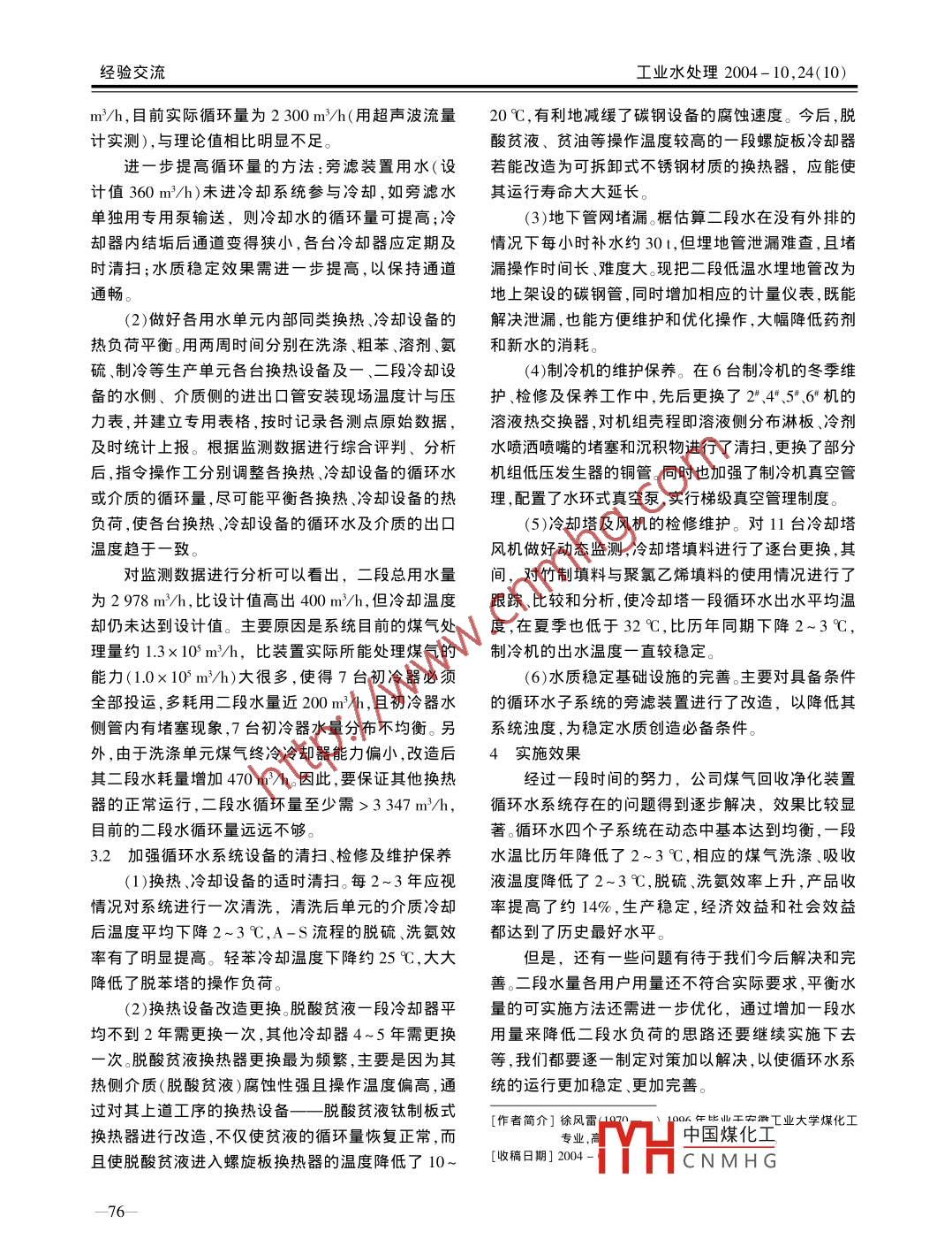 第24卷第10期工業(yè)水處理Vol.24 No.102004年10月Industrial W ater TreatmentOct. ,2004煤氣回收凈化裝置循環(huán)水系統(tǒng)的操作實踐徐風(fēng)雷,周亞平,汪強,董玉財,王興祥,曹永中(馬鋼股份公司煤焦化公司,安徽馬鞍山 243061)[摘要]通過煤氣回收凈化裝置循環(huán)水四個子系統(tǒng)的熱量衡算,指出了循環(huán)水系統(tǒng)存在的問題,并提出了循環(huán)水系統(tǒng)的改進措施,進行了操作實踐,實施后取得了較好的效果。[關(guān)鍵詞]煤氣凈化回收;循環(huán)水;操作實踐[中圖分類號] TQ085*.412 [文獻標識碼]B [文章編號 ] 1005 - 829X(2004)10- 0075 -02馬鋼煤焦化公司擁有五座現(xiàn)代化焦爐,年產(chǎn)焦略超設(shè)計值,因此,整套裝置變成超負荷運轉(zhuǎn)。炭200多萬噸,與其配套的焦爐煤氣凈化回收裝置(2)各路循環(huán)水系統(tǒng)的流量、壓力及溫度等計量采用的是A-s脫硫、洗氨及洗油洗苯工藝,焦爐煤儀表,因多種原因無法正常使用,使得循環(huán)水進入各氣的處理能力為1.29x10* m2/h。該套凈化裝置自投個單元小區(qū)及各冷卻設(shè)備的水量等參數(shù)無法有效了產(chǎn)以來,循環(huán)水系統(tǒng)的運行質(zhì)量逐年下降,初冷、終解掌握和控制。冷后的煤氣溫度偏高,A-S循環(huán)系統(tǒng)溫度偏高,呈(3)循環(huán)水水質(zhì)穩(wěn)定工作尚存在一定缺陷。連續(xù)逐年上升的趨勢,造成煤氣凈化指標不達標。2000穩(wěn)定運行困難,水系統(tǒng)之間存在竄漏,致使水質(zhì)穩(wěn)定年度塔后平均H2S質(zhì)量濃度為1.99 g/m3,NH3為藥劑耗量過大,現(xiàn)場冷卻器的結(jié)垢堵塞、腐蝕穿孔的0.13g/m',與相應(yīng)的設(shè)計要求相差甚遠。輕苯收率逐情況較為嚴重。年下降,2000年度僅達0.91%,為投產(chǎn)以來最低水(4)涼水架冷卻塔本體、冷卻風(fēng)機的施工質(zhì)量較平。因此全面系統(tǒng)地解決循環(huán)水系統(tǒng)的問題是擺在差,使得風(fēng)機開動率不高,冷卻塔冷卻效率低下,各我們面前的首要迫切的問題。路-段水水溫居高不下。1循環(huán)水系 統(tǒng)(5)循環(huán)水系統(tǒng)的問題有-定的隱蔽性、滯后公司煤氣凈化回收裝置循環(huán)水系統(tǒng)的循環(huán)總量性,問題的暴露需經(jīng)歷-段時間,所以循環(huán)水系統(tǒng)的約為15 700 m2/h,循環(huán)水利用率98%。系統(tǒng)擁有鋼問題-直未能從根本上解決。筋混凝土冷卻塔3座11格,冷卻塔風(fēng)機11臺,蒸汽3改進措施型溴化鋰雙效吸收式制冷機6臺(制冷量共7.5x 1073.1優(yōu)化循 環(huán)水系統(tǒng)的生產(chǎn)操作kJ/h),循環(huán)水泵12臺,各種換熱設(shè)備59臺。整個循針對車間一段水、二段水能力不足,分布又不均環(huán)水系統(tǒng)分為4個子系統(tǒng):(1)煤氣初冷一段循環(huán)冷衡的問題,我們在安裝了大量的現(xiàn)場溫度計、壓力表卻水系統(tǒng),將荒煤氣冷卻至45 C,循環(huán)量設(shè)計值后,積累了較為全面的數(shù)據(jù),在仔細分析數(shù)據(jù)的基礎(chǔ)5430m3/h,稱初冷--段水;(2)車間一段循環(huán)冷卻水上,努力將各用水單元冷卻用水量進行平衡。系統(tǒng),將各介質(zhì)冷卻至45 C,循環(huán)量設(shè)計值1 939.50(1)使-段循環(huán)冷卻水盡可能多地帶走工藝過m2/h,稱車間一段水;(3)二段低溫循環(huán)冷卻水系統(tǒng),程熱量,以緩解二段循環(huán)冷卻水能力不足的壓力。這將其冷卻至20~25 C,循環(huán)量設(shè)計值2 598 m'/h,也有利于循環(huán)水系統(tǒng)的經(jīng)濟運行,另一方面也為二段稱二段水;(4)制冷循環(huán)冷卻水系統(tǒng),循環(huán)量設(shè)計值冷卻達標創(chuàng)造條件。5760m2/h,稱制冷循環(huán)水。采取盡可能加大初冷一段水循環(huán)量等措施,將2原因分析初冷-段煤氣出口溫度降低了2~3 C。采取了對冷(1)設(shè)計院設(shè)計時由于缺乏經(jīng)驗,整套裝置的實卻設(shè)備進行清掃等措施,努力保證各點溫度盡可能際處理煤氣的能力不能達到設(shè)計值( 1.29x 10* m'/h),向設(shè)計值靠攏。中國煤化工熱器的水側(cè)僅為1.0x10* m/h左右,而目前煤氣處理量已達或通道設(shè)計流速HCNMHG應(yīng)達3000-75經(jīng)驗交流工業(yè)水處理2004- 10,24(10)m2/h,目前實際循環(huán)量為2300m'/h(用超聲波流量20 C,有利地減緩了碳鋼設(shè)備的腐蝕速度。今后,脫計實測) ,與理論值相比明顯不足。酸貧液、貧油等操作溫度較高的一段螺旋板冷卻器進一步提高循環(huán)量的方法:旁濾裝置用水(設(shè)若能改造為可拆卸式不銹鋼材質(zhì)的換熱器,應(yīng)能使計值360m'/h)未進冷卻系統(tǒng)參與冷卻,如旁濾水其運行壽命大大延長。單獨用專用泵輸送,則冷卻水的循環(huán)量可提高;冷(3)地下管網(wǎng)堵漏。椐估算二段水在沒有外排的卻器內(nèi)結(jié)垢后通道變得狹小,各臺冷卻器應(yīng)定期及情況下每小時補水約30t,但埋地管泄漏難查,且堵時清掃;水質(zhì)穩(wěn)定效果需進一步提高,以保持通道漏操作時間長、難度大?,F(xiàn)把二段低溫水埋地管改為通暢。地上架設(shè)的碳鋼管,同時增加相應(yīng)的計量儀表,既能(2)做好各用水單元內(nèi)部同類換熱、冷卻設(shè)備的解決泄漏,也能方便維護和優(yōu)化操作,大幅降低藥劑熱負荷平衡。用兩周時間分別在洗滌、粗苯、溶劑、氨和新水的消耗。硫制冷等生產(chǎn)單元各臺換熱設(shè)備及一、二段冷卻設(shè)(4)制冷機的維護保養(yǎng)。在6