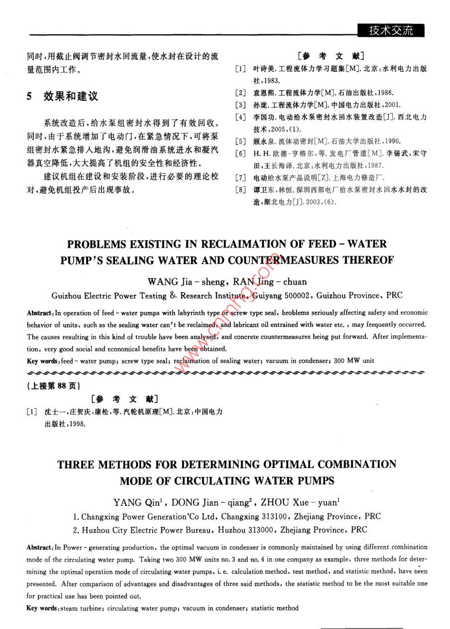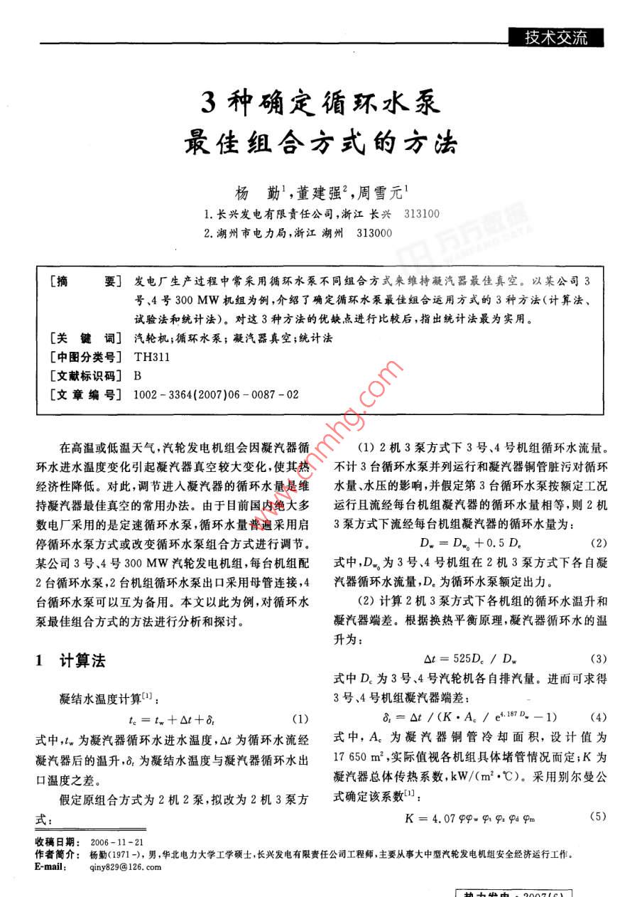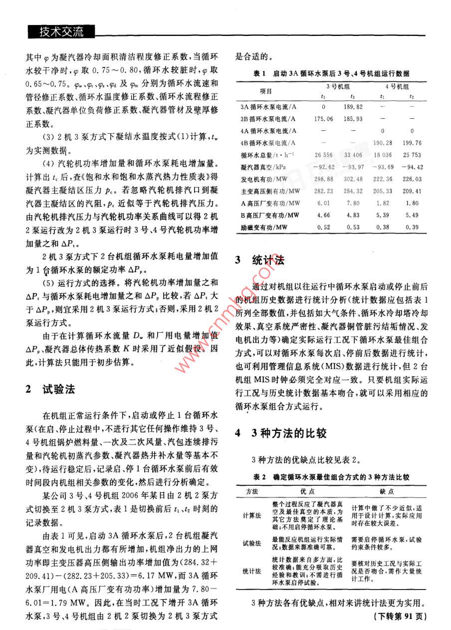 技術(shù)交流3種確定循環(huán)水泵最佳組合方式的方法楊勤1,董建強(qiáng)2,周雪元11.長(zhǎng)興發(fā)電有限責(zé)任公司,浙江長(zhǎng)興3131002.湖州市電力局,浙江湖州313000[摘要]發(fā)電廠生產(chǎn)過(guò)程中常采用循環(huán)水泵不同組合方式來(lái)維持凝汽器最佳真空。以某公司3號(hào)、4號(hào)300MW機(jī)組為例,介紹了確定循環(huán)水泵最佳組合運(yùn)用方式的3種方法(計(jì)算法、試驗(yàn)法和統(tǒng)計(jì)法)。對(duì)這3種方法的優(yōu)缺點(diǎn)進(jìn)行比較后,指出統(tǒng)計(jì)法最為實(shí)用。[關(guān)鍵詞]汽輪機(jī);循環(huán)水泵;凝汽器真空;統(tǒng)計(jì)法[中圖分類號(hào)]TH311[文獻(xiàn)標(biāo)識(shí)碼][文章編號(hào)]3364(2007)06-0087-02在高溫或低溫天氣,汽輪發(fā)電機(jī)組會(huì)因凝汽器循(1)2機(jī)3泵方式下3號(hào)、4號(hào)機(jī)組循環(huán)水流量環(huán)水進(jìn)水溫度變化引起凝汽器真空較大變化,使其熱不計(jì)3臺(tái)循環(huán)水泵并列運(yùn)行和凝汽器銅管臟污對(duì)循環(huán)經(jīng)濟(jì)性降低。對(duì)此,調(diào)節(jié)進(jìn)入凝汽器的循環(huán)水量是維水量水壓的影響,并假定第3臺(tái)循環(huán)水泵按額定工況持凝汽器最佳真空的常用辦法。由于目前國(guó)內(nèi)絕大多運(yùn)行且流經(jīng)每臺(tái)機(jī)組凝汽器的循環(huán)水量相等,則2機(jī)數(shù)電廠采用的是定速循環(huán)水泵,循環(huán)水量普遍采用啟3泵方式下流經(jīng)每臺(tái)機(jī)組凝汽器的循環(huán)水量為停循環(huán)水泵方式或改變循環(huán)水泵組合方式進(jìn)行調(diào)節(jié)。D.=D-+0.5D某公司3號(hào)、4號(hào)300MW汽輪發(fā)電機(jī)組,每臺(tái)機(jī)組配式中,D為3號(hào)4號(hào)機(jī)組在2機(jī)3泵方式下各自凝2臺(tái)循環(huán)水泵,2臺(tái)機(jī)組循環(huán)水泵出口采用母管連接,4汽器循環(huán)水流量,D。為循環(huán)水泵額定出力臺(tái)循環(huán)水泵可以互為備用。本文以此為例,對(duì)循環(huán)水2)計(jì)算2機(jī)3泵方式下各機(jī)組的循環(huán)水溫升和泵最佳組合方式的方法進(jìn)行分析和探討。凝汽器端差。根據(jù)換熱平衡原理,凝汽器循環(huán)水的溫升為:1計(jì)算法△t=525D。/D式中D為3號(hào)、4號(hào)汽輪機(jī)各自排汽量。進(jìn)而可求得凝結(jié)水溫度計(jì)算口:3號(hào)、4號(hào)機(jī)組凝汽器端差te=tm+△t+b(1)8:=Δt/(K·A。/e41-1)式中,t為凝汽器循環(huán)水進(jìn)水溫度,Δ為循環(huán)水流經(jīng)式中,A為凝汽器銅管冷卻面積,設(shè)計(jì)值為凝汽器后的溫升,81為凝結(jié)水溫度與凝汽器循環(huán)水出17650m2,實(shí)際值視各機(jī)組具體堵管情況而定;K為口溫度之差。凝汽器總體傳熱系數(shù),kW/(m2·℃)。采用別爾曼公假定原組合方式為2機(jī)2泵擬改為2機(jī)3泵方式確定該系數(shù)式K=4.0799wg1:d收稿日期:2006-11-21作者簡(jiǎn)介:楊勤(1971-),男,華北電力大學(xué)工學(xué)碩士,長(zhǎng)興發(fā)電有限責(zé)任公司工程師,主要從事大中型汽輪發(fā)電機(jī)組安全經(jīng)濟(jì)運(yùn)行工作E-mail: qiny829@技術(shù)交流其中φ為凝汽器冷卻面積清潔程度修正系數(shù),當(dāng)循環(huán)是合適的。水較干凈時(shí),g取0.75~0.80,循環(huán)水較臟時(shí),q取表1啟動(dòng)3A循環(huán)水泵后3號(hào)、4號(hào)機(jī)組運(yùn)行數(shù)據(jù)0.65~0.75。g、9、9、q及gn分別為循環(huán)水流速和項(xiàng)目3號(hào)機(jī)組4號(hào)機(jī)組管徑修正系數(shù)、循環(huán)水溫度修正系數(shù)、循環(huán)水流程修正系數(shù)、凝汽器單位負(fù)荷修正系數(shù)、凝汽器管材及壁厚修3A循環(huán)水泵電流/A正系數(shù)。3B循環(huán)水泵電流/A175.06185.934A循環(huán)水泵電流/A(3)2機(jī)3泵方式下凝結(jié)水溫度按式(1)計(jì)算,t4B循環(huán)水泵電流/A190.28199,76為實(shí)測(cè)數(shù)據(jù)。循環(huán)水總量/t:h-126556334061803625753(4)汽輪機(jī)功率增加量和循環(huán)水泵耗電增加量。凝汽器真空/kPa92.62-93.9793.69-94.42計(jì)算出t后,查《飽和水和飽和水蒸汽熱力性質(zhì)表》得發(fā)電機(jī)有功AMW298.88302.48222.36226.03凝汽器主凝結(jié)區(qū)壓力p。若忽略汽輪機(jī)排汽口到凝主變高壓側(cè)有功/MW282.23284.32205.33209.41汽器主凝結(jié)區(qū)的汽阻,p近似等于汽輪機(jī)排汽壓力。A高壓廠變有功Mw6.017.801.821.80由汽輪機(jī)排汽壓力與汽輪機(jī)功率關(guān)系曲線可以得2機(jī)B高壓廠變有功/MW4.664.835.395.492泵運(yùn)行改為2機(jī)3泵運(yùn)行時(shí)3號(hào)、4號(hào)汽輪機(jī)功率增勵(lì)磁變有功/Mw0.380.39加量之和△P。機(jī)3泵方式下2臺(tái)機(jī)組循環(huán)水泵耗電量增加值3統(tǒng)計(jì)法為1令循環(huán)水泵的額定功率△P5)運(yùn)行方式的選擇。將汽輪機(jī)功率增加量之和通過(guò)對(duì)機(jī)組以往運(yùn)行中循環(huán)水泵啟動(dòng)或停止前后△P與循環(huán)水泵耗電增加量之和△P比較,若△P1大的機(jī)組歷史數(shù)據(jù)進(jìn)行統(tǒng)計(jì)分析(統(tǒng)計(jì)數(shù)據(jù)應(yīng)包括表1于△P,則宜采用2機(jī)3泵運(yùn)行方式;否則采用2機(jī)2所列全部數(shù)值并包括如大氣條件、循環(huán)水冷卻塔冷卻泵運(yùn)行方式。效果、真空系統(tǒng)嚴(yán)密性、凝汽器銅管臟污結(jié)垢情況、發(fā)由于在計(jì