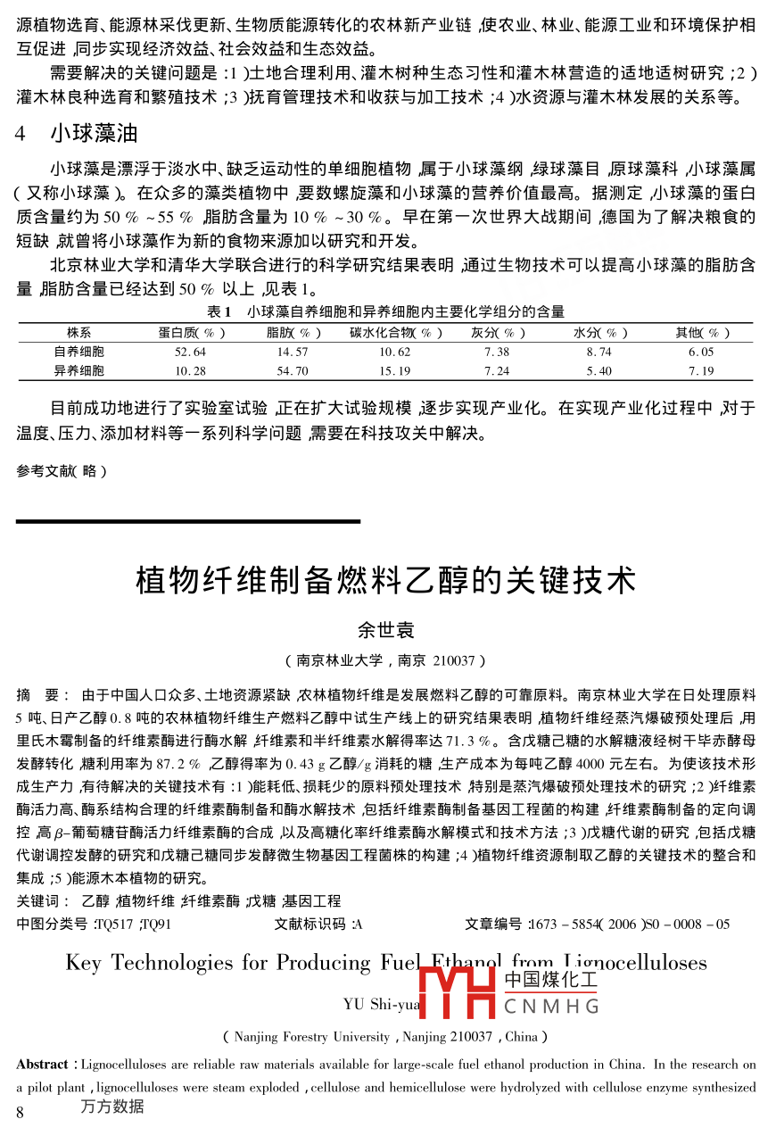 生物質能源與能源林業(yè)若干問題研究尹偉倫,翟明普北京林業(yè)大學,北京100083)摘要:概述了生物質能對未來能源發(fā)展的重要作用對我國能源林業(yè)和灌木能源林的情況作了簡要介紹并重點提出了小球藻油的利用對生物質能開發(fā)的影響。關鍵詞:生物質能源灌木林小球藻中圖分類號TQ91文獻標識碼:A文章編號1673-58542006)0-0007-02Study on Some Problems of Biomass Energy and Energy ForestryYIN Wei-lun ZHAI Ming-puBeijing Forestry University, Beijing 100083, ChinaAbstract: A brief introduction on energy forestry and shrub energy forest in China and the important role of biomass energy to theenergy development in future were presented in this paper. Besides, the influence of Chlorella vulgaris oil utilization on thecoenergy development was specially discussedKey words: bi生物質能源是可再生能源的重要組成部分生物質是指可再生和可循環(huán)的有機物質。生物質能源是太陽能以化學能形式貯存在生物質體內的種能量形式,它以生物質為載體直接或間接地來源于植物的光合作用。它可再生性能穩(wěn)定與風能、太陽能相比很少受自然因素的制約又能加工轉換成常規(guī)旳固態(tài)、液態(tài)和氣態(tài)燃料能儲存運輸。生物質能是唯一可再生的碳源。生物質生長過程中吸收大量的CO2氣體燃燒過程排放的CO2氣體與吸收的相當幾乎沒有CO2氣體排放。利用生物質能可改善和保護生態(tài)環(huán)境所以生物質能是人類可持續(xù)發(fā)展道路上的理想能源積極開發(fā)現代生物質能是解決能源問題的捷徑。我國非常重視生物質能源的科學研究與生產建設。最近中國工程院啟動了由副院長杜祥琬院士為組長的可再生能源戰(zhàn)略研究項目把生物質能源的研究作為3個專題之-2能源林業(yè)森林能源在可再生能源中的地位不可取代。能源林業(yè)原料包括3個方面專用森林、采伐剩余物與加工剩余物、木本糧油。發(fā)展能源林業(yè)可以與生態(tài)環(huán)境建設相結合我國南北方存在大面積多樹種的各類森林其中能源樹種極其豐富。北方地區(qū)適合栽培能源樹種的土地面積大。由于樹種極其豐富計對能源林的培育非常滯后有些領域還處于空白狀態(tài)。積極研究和開發(fā)能源樹種開展能源樹種清査和篩選建立能源樹種良種選育體系。運用現代森林培育學原理吸收、運用現代生物技術和信息技術等多學科的新手段和新方法建立高效良種繁育體系和結構合理、功能完善、效益突岀的可持續(xù)經營森林系統(tǒng)。3灌木能源林我國灌木能源林資源豐富有些灌木樹種的熱值可灌木樹種是我國生物質能源的重要材料。我國西部H中國煤化工種相媲美。CNMH和半干旱地區(qū)具有日照充足和溫差大等有利條件利用我國豐富的耐旱灌木等生物質資源建立生物質能源林一方面提高太陽能的轉化效率解決能源短缺問題冋時改善生態(tài)環(huán)境攻克西部開發(fā)生態(tài)先行戰(zhàn)略中植被難以恢復的難題也是有利于加快農村產業(yè)結構調整促進新時期農業(yè)和農村經濟發(fā)展增加農民收入形成能7源植物選育、能源林采伐更新、玍物質能源轉化旳農林新產業(yè)鏈使農業(yè)、林業(yè)、能源工業(yè)和環(huán)境保護相互促進同步實現經濟效益、社會效益和生態(tài)效益需要解決的關鍵問題是:Ⅰ)地合理利用、灌木樹種生態(tài)習性和灌木枺營造的適地適樹研究;2)灌木林良種選育和繁殖技術;3)撫育管理技術和收獲與加工技術;4)水資源與灌木林發(fā)展的關系等。4小球藻油小球藻是漂浮于淡水中、缺乏運動性旳單細胞植物屬于小球藻綱綠球藻目原球藻科小球藻屬〔又稱小球藻)在眾多的藻類植物中要數螺旋藻和小球藻的營養(yǎng)價值最高。據測定小球藻的蛋白質含量約為50%~55%脂肪含量為10%~30%。早在第一次世界大戰(zhàn)期間德國為了解決糧食的短缺就曾將小球藻作為新的食物來源加以研究和開發(fā)北京林業(yè)大學和清華大學聯合進行的科學研究結果表明通過生物技術可以提高小球藻的脂肪含量脂肪含量已經達到50%以上見表1表1小球藻自養(yǎng)細胞和異養(yǎng)細胞內主要化學組分的含量株系脂(%)碳水化合物(%)灰分自養(yǎng)細胞K)水分)作(聽異養(yǎng)細胞15.197.247.19目前成功地進行了實驗室試驗正在擴大試驗規(guī)模逐步實現產業(yè)化。在實現產業(yè)化過程中對于溫度、壓力、添加材料等一系列科學問題需要在科技攻關中解決。參考文南(略)植物纖維制備燃料乙醇的關鍵技術余世袁南京林業(yè)大學,南京210037)摘要:由于中國人口眾多、土地資源緊缺農林植物纖維是發(fā)展燃料乙醇的可靠原料。南京林業(yè)大學在日處理原料5噸、日產乙醇0.8噸的農林植物纖維生產燃料乙醇中試生產線上的研究結果表明植物纖維經蒸汽爆破預處理后用里氏木霉制備的纖維素酶進行酶水解纖維素和半纖維素水解得率達π.3%。含戊糖己糖的水解糖液經樹干畢赤酵母發(fā)酵轉化糖利用率為87.2%乙醇得率為0.43g乙醇/g消耗的糖生產成本為毎噸乙醇4000元左右。為使該技術形成生產力有待解決的關鍵技術有:1)能耗低、損耗少的原料預處理技術特別是蒸汽爆破預處理技術的研究;)纖維素酶活力高、酶系結構合理的纖維素酶制備和酶水解技術包括纖維素酶制備基因工程菌的構建纖維素酶制備的定向調控高β-葡萄糖苷酶活力纖維素酶的合成