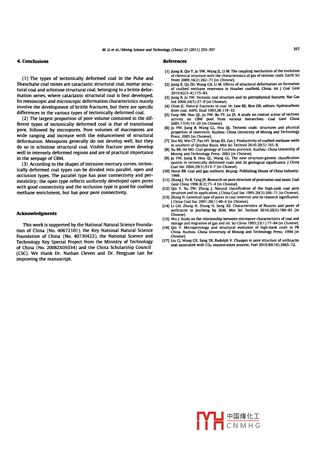 Mining Science and Technology( China)21(2011)353-357燃到腰Contents lists available at Science Directaad IchthyMining Science and Technology( China)ELSEVIERjournalhomepagewww.elsevier.com/locate/mstcTectonically deformed coal types and pore structures in Puhe and shanchahecoal mines in western guizhouLi Minga, b.c., Jiang Bo.b, Lin Shoufa a. Wang Jilin. b, Ji mingjun Qu Zhenghui abSchool of Resource and Earth Science, China Universiry of mining g Technology, Xuzhou 221008, ChinaKey laboratory of Coalbed Methane Resources and Reservoir-Forming of ministry of Education, Xuzhou 221008, ChinadEpartment of Earth and Environmental Sciences, University of waterloo, waterloo, Canada N2L 3GId Jiangsu Hogan Group Co, Ltd, Xuzhou 221137,ChinaARTICLE INFOABSTRACTArticle history:To evaluate the effect of tectonic deformation on coal reservoir properties, we provide an analysis of theeceived 28 September 2010cejved in revised form 12 November 2010types of tectonically deformed coal, macro- and microscopic deformation and discuss pore structuralAccepted 2 December 2010characteristics and connectivity based on samples from the Puhe and Shanchahe coal mines. Our researchAvailable online 11 June 2011hows that the tectonically deformed coal mostly includes cataclastic structural coal, mortar structuralcoal and schistose structural coal of a brittle deformation series. The major pore structures of differenttypes of tectonically deformed coal are transitional pores and micropores. the pore volumes of macrop-KeywordPuhe and shanchahe coal minesores and visible fracture pores produced by structural deformations vary over a large range and increaseTectonically deformed coawith the intensity of tectonic deformation. Mesopores as connecting passages develop well in schistosetructural coal. According to the shapes of intrusive mercury curves, tectonically deformed coal can beoalbed methanedivided into parallel, open and occluded types, the parallel type has poor connectivity and is relativelyclosed; the open type reflects uniformly developed open pores with good connectivity while the occludedtype is good for coalbed methane enrichment, but has poor connectivity between pores.o 2011 Published by Elsevier B V on behalf of China University of Mining Technology1 IntroductionZunyi fault arch[8 Structural traces in this zone trend mainly in anortheasterly direction. The folds are mainly gentle folds. TheCoal is a special kind of rock that is uniquely sensitive to stress faults are well developed and move mainly in a normal sense.and strain. Tectonically deformed coal with various structural The geological structure in the puhe and Shanchahe coal mines ischaracteristics and types form under different stress-strain condi- relatively simple and exhibits several normal faults with a neartions and tectonic stresses[ 1, 2]. The distribution of tectonically de- north-south trend. The Longtan formation of the upper Permianformed coal in a coal seam is relatively limited, but it is widely is a major coal-bearing section in the study area, between 300developed in Chinas coal fields and is the main factor affecting and 490 m thick, containing 10-22 coal seams. Coal seams Nos.he distribution and enrichment of coalbed methane(CBM)[3]. 22, 23 and 34 are the main mineable coal seams in this coal fieldThe development of tectonically deformed coal enhances the het with anthracite rank. The semi-bright and semi-dull coals are oferogeneity and porosity of coal seams and also reduces their per- the dominant lithotypes, with secondary amounts of dull andmeability and mechanical strength. The feasibility of cBm bright coaexploitation and the possibility of coal and gas outbursts are signif-icantly affected by late structural transformations and pore-fracture structural characteristics of coal seams 14-7). This provides 2. Materials and methodsbasis for further discussion of deformation characteristics andpore structures of tectonically deformed coal, necessary for furtherIn the puhe and shanchahe coal mines the coal seams are bur.CBM exploitation, safe mining and productionied to a shallow depth, their geological structure is simple and theThe Puhe and Shanchahe coal mines are located in the west of type of tectonically deformed coal is not complex [ 9]. Based onGuizhou province, near Puding and Anshun cities( Fig. 1). They be. geological surveys of the coal mine within a limited undergroundlong to the Zhina coal field, which is located in the southwest of the mining space. different types of typical tectonic coal samples werecollected, as shown in Table 1Systematic observations and descriptions of the mesoscopicCorresponding author Tel +86 13151981375deformation fe.mailaddress:cummingii@hotmail.com(M.Li)ding, joint, fra中國(guó)煤化工 nt were made on th1674-5264/5- see front matter o 2011 Published by Elsevier B V. on behalf of China University of MiningCNMHGdoi:101016msc201105.02M. Li et al/ Mining Science and Technology( china )21(2011)353-357+S2Poore to total volume. V1>100,000 nm: v25 kmAnshunm100-10 nm: Vs 10 nm; Vr as total poreservoir. Transitional pores and micropores mainly consist of pri-mary and metamorphic pores. Stage pore volumes and their contri-bution to the total volumes of coal samples are shown in Fig. 2 andFig 1. Structural outline of Puhe and Shanchahe coal mines.Table 23. Results and discussionTable 1Statistics of tectonically deformed coal samples collected in Puhe and Shanchahe coal3. 1. Types and characteristics of tectonically deformed coalDigging Samples Tectonic coal type Sampling location Coal3.1.1. Primary-cataclastic structural coal (S1 and S6)Structural deformation is mainly characterized by brittle frac-Shanchahe scoalstructural coaldipentry of threetures, with the primary structures of coal. as a rule, well preservedmining areaFractures are sparsely distributed with small fracture apertureCataclastic-mortar Haulage roadway 34Tension joints have rough joint planes and extend unsteadily alongdipentry