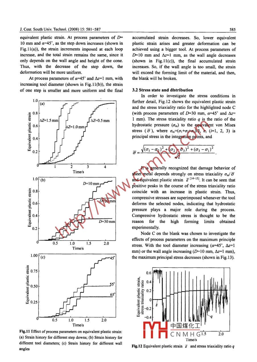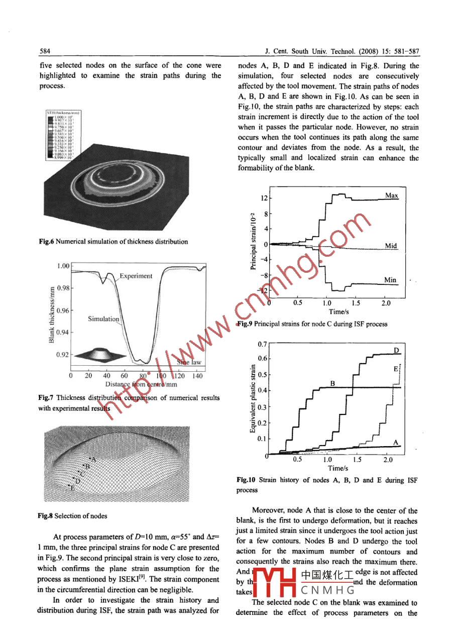 J. Cent. South Univ. Technol. (2008) 15: 581- -587DOI: 10.1007/511771- 008 -0109- 5包SpringerNumerical simulation and experimental investigation ofincremental sheet forming processHAN Fei(韓飛), MO Jian-hua(莫健華)(State Key Laboratory of Material Processing and Dic & Mould Technology,Huazhong University of Science and Technology, Wuhan 430074, China)Abstract: In order to investigate the process of incremental sheet forming (IlSF) through both experimental and numericalapproaches, a three-dimensional elasto-plastic finite element model (FEM) was developed to simulate the process and the simulatedresults were compared with those of experiment. The results of numerical simulations, such as the strain history and distribution, thestress state and distribution, sheet thickness distribution, etc, were discussed in details, and the influcnces of process parameters onthese results were also analyzed. The simulated results of the radial strain and the thickness distribution are in good agreement withexperimental results. The simulations reveal that the deformation is localized around the tool and constantly remains close to a planestrain state. With decreasing depth step, increasing tool diameter and wall inclination angle, the axial stress reduces, leading to lessthinning and more homogeneous plastic strain and thickness distribution. During ISF, the plastic strain increases stepwise under theaction of the tool. Each increase in plastic strain is accompanied by hydrostatic pressure, which explains why obtainable deformationusing ISF exceeds the forming limits of conventional sheet forming.Key words: incremental sheet forming (ISF); sheet metal forming; numerical simulation; finite element methodelement analysis(FEA). The most prominent analytical1 Introductionmodel is based on the sine lawl7. Unfortunately,analytical models are limited to the approximateIncremental sheet forming (ISF) is an innovative,prediction of strains. For further studies, the mostflexible sheet forming process that uses principles ofcommonly used tool was the finite element method.layeredmanufacturing for thproduction ofSHIM and PARK(8] performed a numerical simulation ofcomplex- shaped sheet metal parts. This process resolvesthe single layer in the forming of truncated pyramid tothe complicated geometry information into a series offind the deformation characters along the tool path.two-dimensional layers, and then the plastic deformationISEKI[9 modeled the incremental forming of a shell ofis carried out layer-by-layer through the computerizedthe frustum of a quadrangular pyramid based on the shellnumerical controlled movements of a simple sphericalelements without considering material anisotropy andforming tool to get the desired part!-1. Generall, twoBaushinger effects of shell material, and the formedmain variants of the incremental sheet forming processheight of the part was just 5 mm. AMBROGIO et al-"are known, i.e. the “negative forming process" and theshowed that the single point incremental sheet forming“positive forming” processlo. In negative incrementalprocess mainly depended on geometrical and processforming, a spherical tool moves on a sheet metal,conditions. Particularly, the accuracy of the finaaccording to a programmed tool path. The sheet isgeometry was mainly influenced by the tool depth step.clamped at the periphery by bolts on a support frame. lIn this paper, a three-dimensional elasto-plasticpositive forming (Fig.1), the blank is put on the generalfinite element model was adopted to simulate themandrel and fastened at its edges by a clamping plate,incremental sheet forming process. The truncated cone,which can move along the guide posts. The tool deformsas the benchmark part, was simulated for differentthe blank into the mandrel and moves along the contourprocessparameters.Thecomparisonbetweenlines until the required shape is formed. In the currentexperimental and FEM results was carried out.study, the latter technique was investigated.Additionally, the influence of the process parameters onISF has been investigated mainly by simplifedthe strain history and distribution, the stress state andanalytical deformation models and by full scale finitedistribution. sheet thickness distribution during forming中國煤化工Foundation item: Prizt(s0175030) sppred by the National Natural Science FounduReceived date: 2007-12-14; Accepted date: 2008 01-21MHCNMHG.Corresponding author: HAN Fei, Doctoral candidate; Tel: +86 -13691060870; E-mail: hanre.nusudyanoo.com.cn582J. Cent. South Univ. Technol. (2008) 15: 581-587properties for input into the simulation. The mainBlankClamping|IToolmaterial parameters are shown in Table 1. Fig.2 showsplate>咖才the true stress- -strain curve for the blank material.BackingDieTable 1 Properties of blank for ISF simulationsplate_ItemValueMaterial08AlGuideFixedpostYield strengh/MPa175Utimate tensile strength/MPa303Ultimate elongation/%44Before formingDuring formingElastic modulus/MPa2.1X10°Fig,1 Positive incremental sheet forming processDensity(gcm2)7.83Poisson ratio0.30were carefully analyzed. Moreover, the reason why ISFgives higher forming limits than conventional sheetStrain-hardening exponent0.227forming processes was explained.Anisotropy coefficients, rro= 1.71,r4s-= 1.14,r90= 1.832 Experiment and simulation model5002.1 Experimental setupFor the experiments described in this paper, a00-special 3-axis numerical controlled machine was used asincremental sheet forming set-up. The blank wa300-fastened by a properly designed fixture. According to thefixture design, the blank with 330 mmX 330 mmX 1 mmE 200dimensions was 08AI in the annealed state. The circulardie used for the expecriments had a diameter of 80 mm100and a edge radius of 3 mm. A spherical nosed tool (toolsteel, Cr13) was used for all applied strategies. The code0.0.2 0.30.4 0.5for tool path was calculated using the computerautomated manufacturing module of Unigraphics NX.True strainThe tool speed was set t