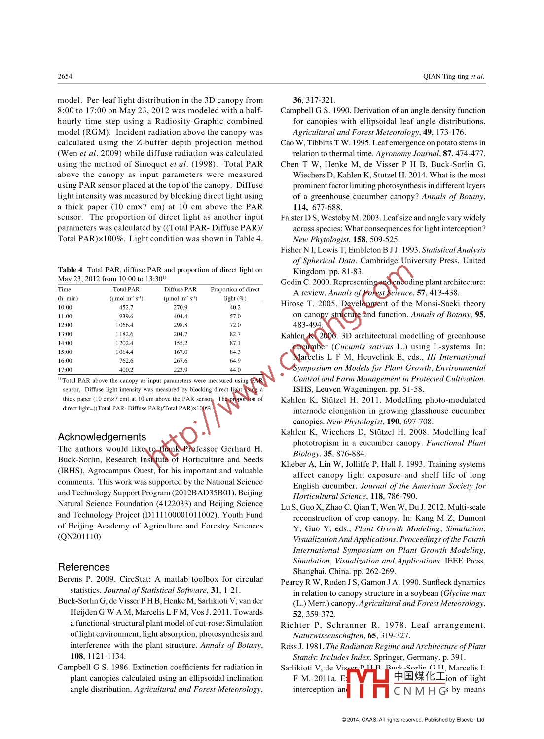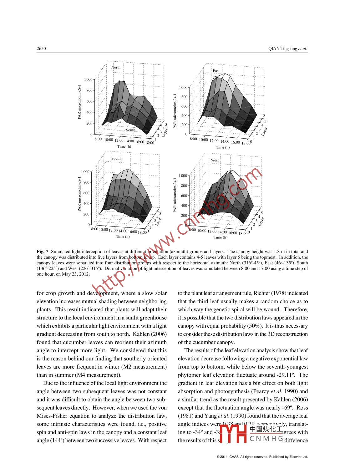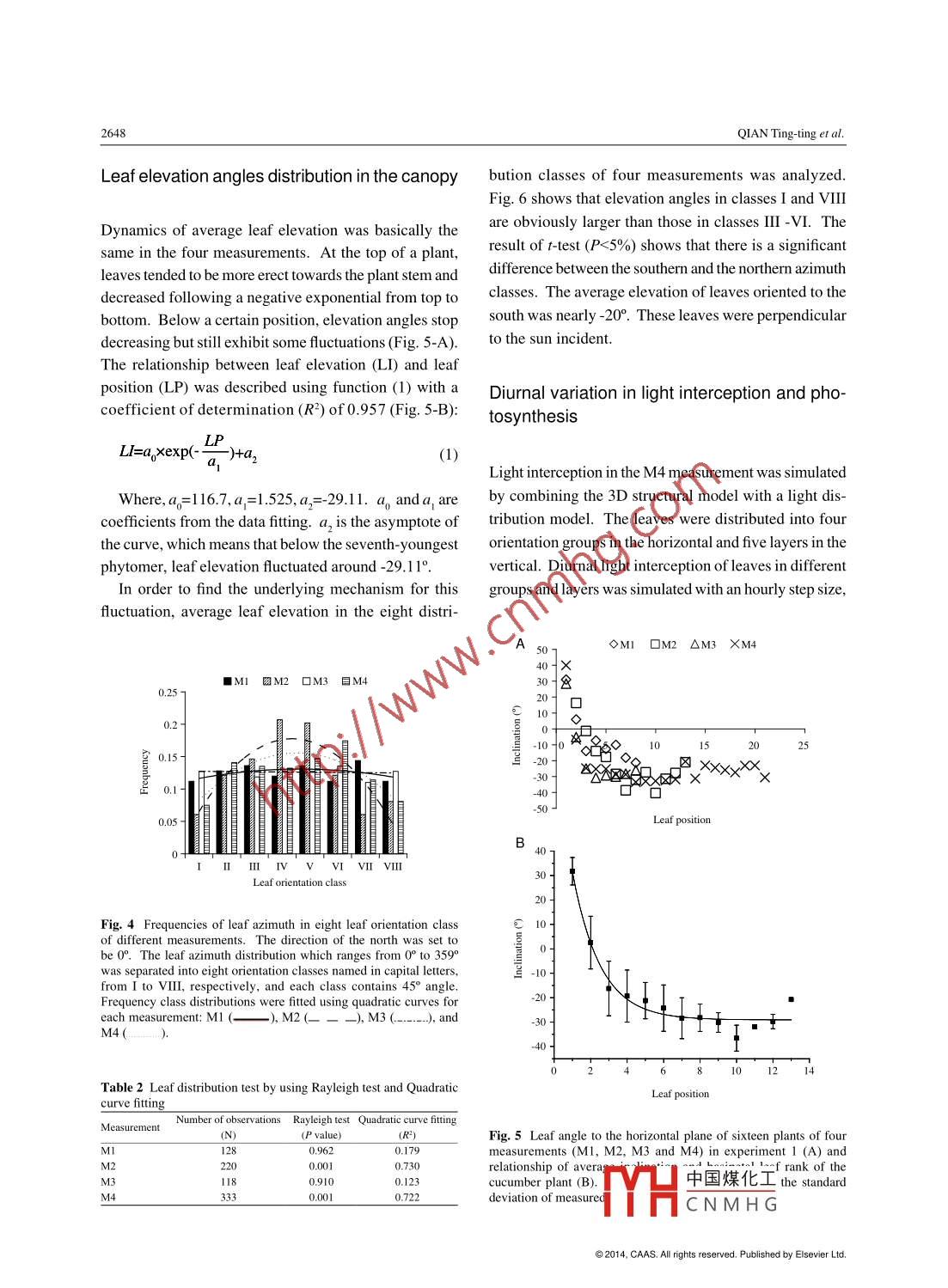 Available online at www. sciencedirect.comJournal of Integrative Agriculture。ScienceDirect2014, 13(12): 2645-2655December 2014RESEARCH ARTICLEHeterogeneity Analysis of Cucumber Canopy in the Solar GreenhouseQIAN Ting-ting', LU Sheng lian', ZHAO Chun-jiang'"2, GUO Xin-yu', WEN Wei-liang2 and DU jan-jun2' Shanghai Jiao Tong University, Shanghai 200240, P.R.China'Beiing Research Center for Information Technology in Agriculture, Bejing 100097, P.R. ChinaAbstractDetailed analysis of canopy structural heterogeneity is an essential step in conducting parameters for a canopy structuralmodel. This paper aims to analyze the structural heterogeneity of a cucumber (Cucumis sativus L.) canopy by means of analyzingleaf distribution in a greenhouse environment with natural sunlight and also to assess the effect of structural canopy heterogeneityon light interception and photosynthesis. Two experiments and four measurements were carried out in autumn 201 1 and spring2012. A static virtual three-dimensional (3D) canopy structure was reconstructed using a 3D digitizing method. The diurnalvariation of photosynthesis rate ved using CIRAS-2 photosynthesis system. The results showed that, leaf azimuthas tested with the Rayleigh-test was homogeneous at vine tip over stage but turned heterogeneous at fruit harvest stage. Aftereliminating the influence of the environment on the azimuth using the von Mises-Fisher method, the angle between two sccessiveleaves was 1449; at the same time, a rule for the azimuth ditribution in the canopy was established, stating that the azimuthdistribution in cucumber followed a law which was positive spin and anti-spin. Leaf elevation angle of south- oriented leaves wason average 13.8° higher than that of north- oriented leaves. The horizontal distribution of light interception and photosynthesisdiffered significantly between differently oriented leaves. East- and west-oriented leaves exhibited the highest photosyntheticrate. In conclusion, detailed analysis of canopy structural heterogeneity in this study indicated that leaf azimuth and elevationangle were heterogeneous in cucumber canopy and they should be explicitly described as they have a great impact both on lightdistribution and photosynthesis.Key words: heterogeneity, inclination, leaf azimuth, light intereption, photosynthesiscanopy architectural traits.INTRODUCTION .Architectural traits (such as the number, shape, in-clination and azimuth of organs) are genotype specific,The structure of the canopy exhibits a large heteroge-while at the same time highly dependent on the climaticneity, not least since it is composed of hundreds andconditions. These traits can be used to analyze canopythousands of plant parts which themselves diverge indynamics and heterogeneity (Sarlikioti et al.201 1a).shape, size, topology and orientation. Therefore, it isTo date, several studies were conducted to modeldificult to establish an accurate canopy structural modelorgan emergency (Cao and Tibbitts 1995; Wiechersby using parametric method without detailed analysisof et al. 201 1), leaf area accumulation (Yang et al.1990),Received 19 November, 2013 Accepted 27 February, 2014QIAN Ting-ting, E-mail:qiantinging19831205@ 126. com; Correspondence ZHAO Chun-jang, Tel: +86-10-515中國煤化Imacjnercita.g.cnYHCNMH G◎2014, CAAS. All rights reserved. Published by Elsevier Ltd.doi: 10.1016/S2095-3119(14)60776-02646QIAN Tingting et al.internode elongation (Kahlen and Stitzel 201 1) and re--to explore the relationship between leaf shape andlationship between leaf area and position (Kahlen et al.photosynthetic performance;2008). But studies of inclination and azimuth model--to better understand the mechanisms of canopying are rare: Four types of leaf inclination distributionheterogeneity;(Wit 1965) as well as an ellipsoidal model presented-to improve the methodology for the extraction ofby Campbell (1986) were used to describe canopymodel parameters for 3D structure.structure and also to calculate light interception in aone-dimensional model (Campbell 1990), however,RESULTSthere are obvious flaws when these models are usedfor 3D virtual plant construction; a constant phyllo-taxis angle of 2/5x360°=144° is used in the structuralvon Mises-Fisher distribution analysis of leafmodel (Kahlen 2006), however, measured data showedazimuthslight deviations from this constant value. Since leafinclination and azimuth has been shown to also afeet The azimuth of the first leaf from the bottom of acanopy light interception and yield (Toler et al. 1999;plant was set to be 0° and azimuth angles of all otherFalster and Westby 2003), they should be explicitly leaves at the same plant were normalized with respectdescribed (Sarlikioti et al. 2011b). To the best of ourto the first leaf. Two types of azimuth distribution lawsknowledge, these characteristics in cucumber canopyare shown in Fig. 1-A and B: positive spin and anti-spin.structure have not been previously investigated.All plants in the M1-M4 measurement were separatedPlant structure influences a large number of physiolog-into two groups according to the two spin distributions.ical responses, e.g, photosynthesis and its feedback withApproximately equal numbers of positive spin andgrowth, or carbon partitioning to vegetative parts andanti-spin distribution were found in the four canopies.fruits (Godin 2000). A key feature of functional-struc-Mean direction u。and concentration parameter k of eachtural plant models (FSPMs) is that the heterogeneitiescanopy were calculated.of canopy light interception and photosynthesis can beTo show the distribution more directly, the period-simulated at the organ level where the plants and theic sequence was transformed into a linear sequencecanopy are constructed spatially explicitly with geom-in a clockwise direction (Fig. 2). There was an ob-etry and topology (Chen et al. 2014). Many studiesvious linear relationship between μo and leaf rank.have been done by using FSPMs: Wang e