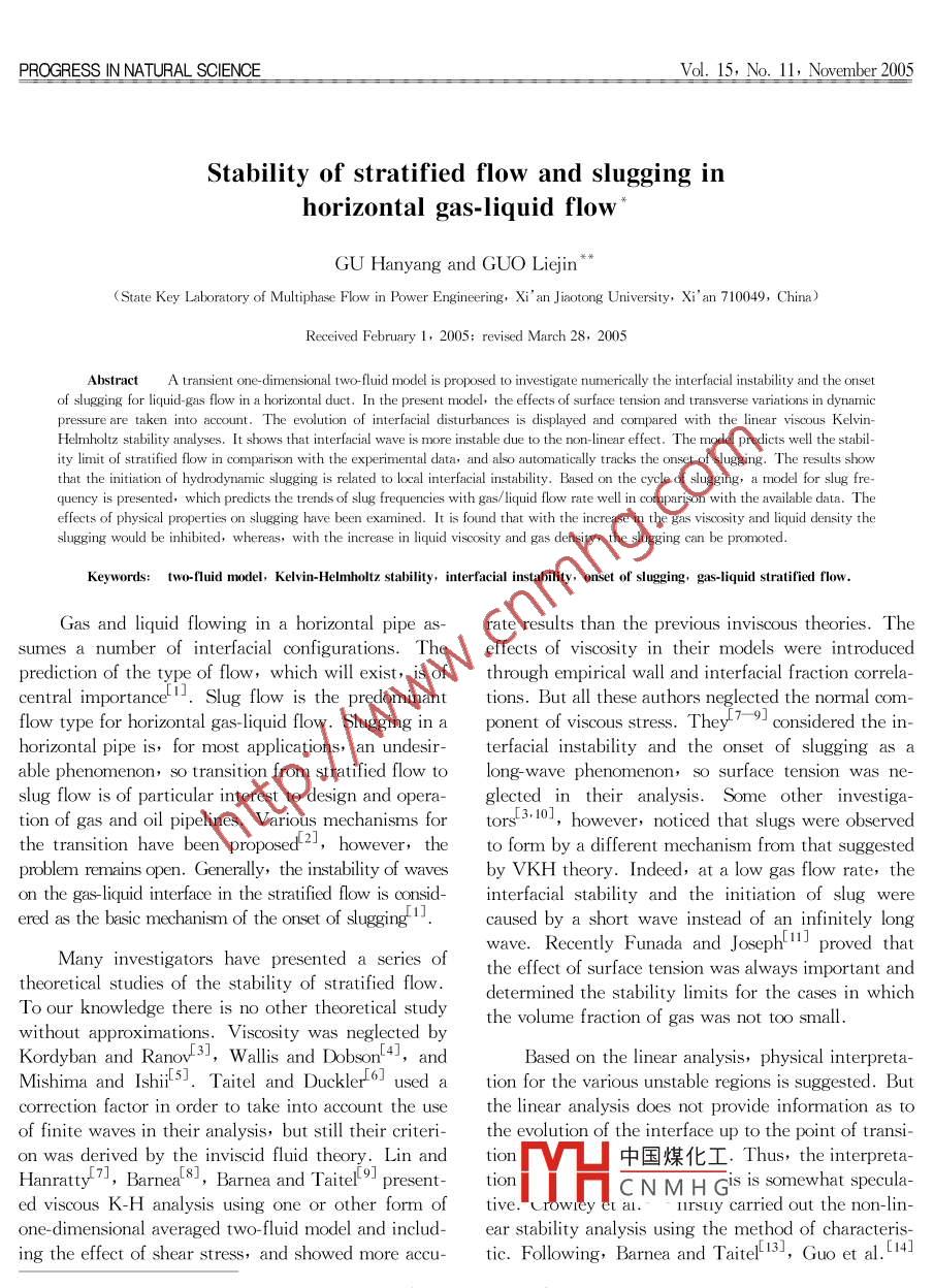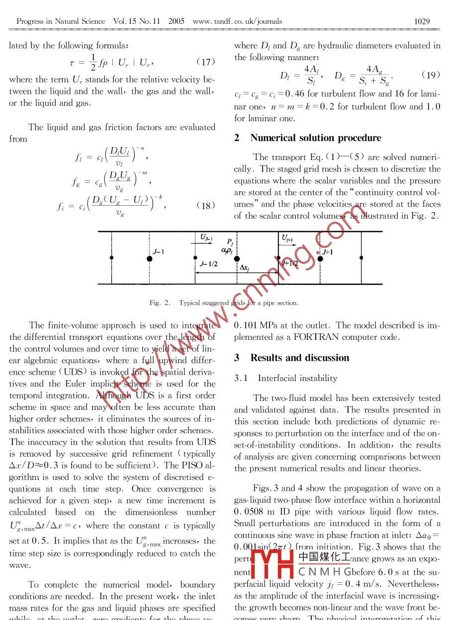 PROGRESS IN NATURAL SCIENCEVol. 15, No. 11, November 2005Stability of stratified flow and slugging inhorizontal gas-liquid flowGU Hanyang and GUo LiejinState Key Laboratory of Multiphase Flow in Power Engineering, Xi an Jiaotong University, Xi'an 710049, China)Received February 1, 2005; revised March 28, 2005Abstract A transient one-dimensional two-fluid model is proposed to investigate numerically the interfacial instability and the onsetlugging for liquid-gas flow in a horizontal duct. In the present model, the effects of surface tension and transverse variations in dynamipressure are taken into account. The evolution of interfacial disturbances is displayed and compared with the linear viscous KelyHelmholtz stability analyses. It shows that interfacial wave is more instable due to the non-linear effect. The model predicts well the stability limit of stratified flow in comparison with the experimental data, and also automatically tracks the onset of slugging. The results showthat the initiation of hydrodynamic slugging is related to local interfacial instability. Based on the cycle of slugging, a model for slug fre-quency is presented, which predicts the trends of slug frequencies with gas/liquid flow rate well in comparison with the available data. Thepropertslugging have been examined. It is found that with the increase in the gas viscosity and liquid density theslugging would be inhibited, whereas, with the increase in liquid viscosity and gas density the slugging can be promotedKeywords: two-fluid model, Kelvin-Helmholtz stability, interfacial instability, onset of slugging, gas-liquid stratified flowGas and liquid flowing in a horizontal pipe as- rate results than the previous inviscous theories. Thesumes a number of interfacial configurations. The effects of viscosity in their models were introducedprediction of the type of flow, which will exist, is of through empirical wall and interfacial fraction correcentral importance]lug flow is the predominant tions. But all these authors neglected the normal comflow type for horizontal gas-liquid flow. Slugging in a ponent of viscous stress. They] considered the inhorizontal pipe is, for most applications, an undesir- terfacial instability and the onset of slugging as able phenomenon, so transition from stratified flow to long-wave phenomenon, so surface tension was neslug flow is of particular interest to design and opera- glected in their analysis. Some other investigation of gas and oil pipelines. Various mechanisms for tors[3, 10, however, noticed that slugs were observedthe transition have been proposed 2, however, the to form by a different mechanism from that suggestedproblem remains open. Generally, the instability of waves by VKH theory. Indeed, at a low gas flow rate, theon the gas-liquid interface in the stratified flow is consid- interfacial stability and the initiation of slug wereered as the basic mechanism of the onset of slugging 1Jcaused by a short wave instead of an infinitely longwave. Recently Funada and Joseph l proved thatMany investigators have presented a series of the effect of surface tension was always important andtheoretical studies of the stability of stratified flowdetermined the stability limits for the cases in whichTo our knowledge there is no other theoretical study the volume fraction of gas was not too smallwithout approximations. Viscosity was neglected bKordyban and Rano 3, Wallis and Dobson.43,andBased on the linear analysis, physical interpretaMishima and Ishi 53. Taitel and Duckler6) used a tion for the various unstable regions is suggested. Butcorrection factor in order to take into account the use the linear analysis does not provide information as toof finite waves in their analysis, but still their criteri- the evolution of the interface up to the point of transion was derived by the inviscid fluid theory. Lin and tion中國煤化工HarratBarnea and taiteltionCNMHGS IS Somewhat speculaed viscous K-H analysis using one or other form of tiy et al. llrsuy carried out the non-linone-dimeinclud- ear stability analysis using the method of characteris-ing the effect of shear stress, and showed more accutic. Following, Barnea and Taitel 13], Guo et al. [141四2燃據(jù)Natural Science Foon of China( grant No. 50323001)dence should be addressed. E-mail: Ii-guoa mail. xjtu. edu.cnProgressinNaturalScienceVol.15No.112005www.tandf.co.uk/journals1027used a similar technique to examine the system reIn the present work, a full transient one-dimensponse to the finite disturbances of the interface. The sional two-fluid model is used to investigate the internon-linear stability analysis gave an insight into the facial instability and the onset of slugging in horizongrowth and propagation of the interfacial disturbances tal gas-liquid two-phase flow, which takes into acon the interface. The authors employed a simplified count the transverse variations in dynamic pressuretransient form of two-fluid model to make the system surface tension on the interface and phase viscositystrictly hyperbolic as the method of characteristic re- The evolution of finite disturbance on interface is dis-quired. An alternative approach is to numerically played. The result of the non-linear stability analysissolve the complete one-dimensional two-fluid model, is compared with linear theory as well as the experiwhich does not bear any theoretical limitation since it mental data. The onset of slugging is automaticallyis normally based on a direct numerical integration, in tracked by the code and a model of slug frequencyboth space and time, of the full governing equations. presented The effects of physical properties on slug-Ansari 15, 1b. firstly numerically investigated the inter- ging are quantitatively examinedfacial instability and slugging using finite differencemethod. Remarkably in his study, the small random 1 Model descriptionperturbations of short wavelengths arising naturally 1.1 Field equationsmay grow into larger and lon