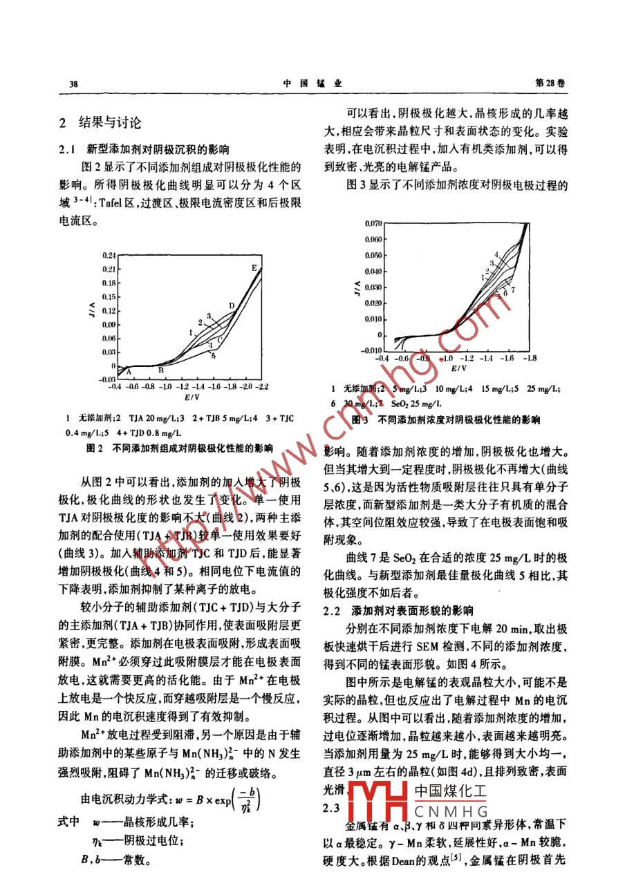 第28卷第1期中國(guó)錳業(yè)Vo1.28 Nl2010年2月CHINA'S MANGANESE INDUSTRYFeb 2010新型無(wú)硒電解金屬錳添加劑的性能研究溫曉霞,田熙科,楊超,皮振邦(中國(guó)地質(zhì)大學(xué)材料科學(xué)與化學(xué)工程學(xué)院,湖北武漢430074)摘要:采用電化學(xué)測(cè)試手段,研究新型添加劑對(duì)電極過(guò)程的影響,同時(shí)通過(guò)SEM、XRD等測(cè)試手段,考察了添加劑對(duì)陰極錳表面、對(duì)錳晶體結(jié)構(gòu)的影響。發(fā)現(xiàn)添加劑具有顯著增強(qiáng)陰極極化,促進(jìn)電解錳由y- Mn(體心四方晶系)向a- Mn(體心立方晶系)的相變轉(zhuǎn)換作用。綜合各類(lèi)試驗(yàn)結(jié)果,判定新型添加劑作用機(jī)理符合“選擇吸附理論" ,即添加劑在電解過(guò)程中分解成極性小分子,在錳表面選擇性吸附,阻滯了螺旋位錯(cuò)生長(zhǎng)的發(fā)生,使得陰極沉積物平整致密。關(guān)鍵詞:電解金屬錳;添加劑;無(wú)硒;選擇吸附中圍分類(lèi)號(hào):TF111.52文獻(xiàn)標(biāo)識(shí)碼:A文章編號(hào) :1002 -4336(2010)01 - 0037 - 04金屬錳是生產(chǎn)碳鋼和特殊鋼的脫氧脫硫劑,同2)用氧化鋁粉研磨成鏡面;時(shí)作為合金元素,又能增加鋼的強(qiáng)度,因而在鋼鐵冶3)用重鉻酸混合液清洗; .煉,特別是高級(jí)特殊鋼的冶煉中起著非常重要的作4)用1:1 HNO3溶液浸洗,用水沖洗干凈;用",還可用于有色合金、化工、醫(yī)藥、食品、分析、5)在測(cè)量體系中CV預(yù)掃兩遍??蒲械确矫?1,因此許多國(guó)家把它作為戰(zhàn)略物資來(lái)實(shí)驗(yàn)中用線性掃描法研究新型無(wú)硒添加劑對(duì)陰儲(chǔ)備。當(dāng)前,我國(guó)普遍采用菱錳礦(主要成分是極極化性能的影響,研究所用三電極測(cè)量體系如圖MnCO3)進(jìn)行電解生產(chǎn)金屬錳,其主要優(yōu)點(diǎn)是可以1所示。.直接酸浸電解。也有部分企業(yè)采用軟錳礦(主要成分是MnO2)經(jīng)還原焙燒后浸出電解,這樣可以充分利用低品位的錳礦,合理利用資源。本文就新型無(wú)氣孔一十輔助電極硒電解金屬錳(以下簡(jiǎn)稱(chēng)為:電解錳)添加劑的性能參比電極點(diǎn)和作用機(jī)理進(jìn)行了初步研究。1試驗(yàn)原料及方法r工作電極新型無(wú)硒添加劑的主要成分為有機(jī)體,(TJA+TJB)為主添加劑,(TJC + TJD)為輔助添加劑。電解杯-.電解液實(shí)驗(yàn)中研究電極為自制不銹鋼電極:取不銹鋼條,密封于玻璃管中,漏出頂端面積(0.8 cmx0.5cm =0.4 cm2),以AB膠密封,背面絕緣。以大面積圍1測(cè)定極化 曲線所用三電極體系的Pb-Sb-Sn-Ag合金(工廠實(shí)際使用的電解陽(yáng)極)作輔助電極(面積為:1.2cmx1.0cm= 1.2電解用自制有機(jī)玻璃電解槽(模擬工業(yè)用電解cm2)。參比電極為硫酸亞汞電極( Hg2SO4.25C下,槽),陰、陽(yáng)極板,水浴鍋。溶液飽和K2SO4 時(shí)為0.658 V)。電極使用前處理:主要分析儀器有電子掃描顯微鏡(SEM).X射1)小號(hào)砂紙將表面磨平滑;線粉晶行射儀(XRD)。中國(guó)煤化工收稿日期: 2009- 10-09作者簡(jiǎn)介:溫曉霞(1982-),女,山西呂梁文水人,碩士研究生,CHCNM H G,劑的研究,手機(jī):15827526132,電話:027 - 67884574,E - mail: wenxiacxia52@ 163.com,通訊地址:中國(guó)地質(zhì)大學(xué)(武漢)研究生院1200718班信箱;聯(lián)系人:田熙科,副教授,電話027 - 67884574,E- mail: xkian@ cug. edu.cn.38中國(guó)錳業(yè)第28卷可以看出.陰極極化越大,晶核形成的幾率越2結(jié)果 與討論大.相應(yīng)會(huì)帶來(lái)晶粒尺寸和表面狀態(tài)的變化。實(shí)驗(yàn)2.1新型添加 劑對(duì)陰極沉積的影響表明,在電沉積過(guò)程中,加入有機(jī)類(lèi)添加劑,可以得圖2顯示了不同添加劑組成對(duì)陰極極化性能的到致密、光亮的電解錳產(chǎn)品。影響。所得陰極極化曲線明顯可以分為4個(gè)區(qū)圖3顯示了不同添加劑濃度對(duì)陰極電極過(guò)程的域3-4!:Tafel區(qū),過(guò)渡區(qū)、極限電流密度區(qū)和后極限電流區(qū)。0.0700000.240.0500.21 I0.0400.18ξ 0c00.150.0200.12|2、i,0.010.06-03)--0.010-0.4 -0.6 -0.8 -1.0 -1.2 -14-1.6 -18E/V14 -0.6 -0.8 -10-12-14-16-18-20-221 無(wú)添加劑;2 5mg/L;3 l0m/L;4 I5 mg/L;5 25 mg/L;630mg/L;7 SeOz 25 mg/L!無(wú)添加劑;2 TJA 20m/L;3 2+ TJB5 mg/L;4 3+ TJC圖3不同添加劑濃度對(duì)陰極極化性能 的影響0.4m/L,;5 4+ TJD0.8 mg/L圍2不同添加劑組成對(duì)陰極極化性能 的影響影響。隨著添加劑濃度的增加,陰極極化也增大。但當(dāng)其增大到一定程度時(shí),陰極極化不再增大(曲線從圖2中可以看出,添加劑的加入增大了陰極5.6),這是因?yàn)榛钚晕镔|(zhì)吸附層往往只具有單分子極化,極化曲線的形狀也發(fā)生了變化。單一使用層濃度,而新型添加劑是一類(lèi)大分子有機(jī)質(zhì)的混合TJA對(duì)陰極極化度的影響不大(曲線2),兩種主添體,其空間位阻效應(yīng)較強(qiáng),導(dǎo)致了在電極表面飽和吸加劑的配合使用(TJA+ TJB)較單-使用效果要好附現(xiàn)象。(曲線3)。加入輔助添加劑TJC和TJD后,能顯著曲線7是SeO2在合適的濃度25mg/L時(shí)的極增加陰極極化(曲線4和5)。相同電位下電流值的化曲線。與新型添加劑最佳量極化曲線5相比,其下降表明,添加劑抑制了某種離子的放電。極化強(qiáng)度不如后者。較小分子的輔助添加劑(TJC+ TJD)與大分子2.2添加劑對(duì)表面形貌的影響的主添加劑(TJA + TJB)協(xié)同作用,使表面吸附層更分別在不同添加劑濃度下電解20 min,取出極緊密,更完整。