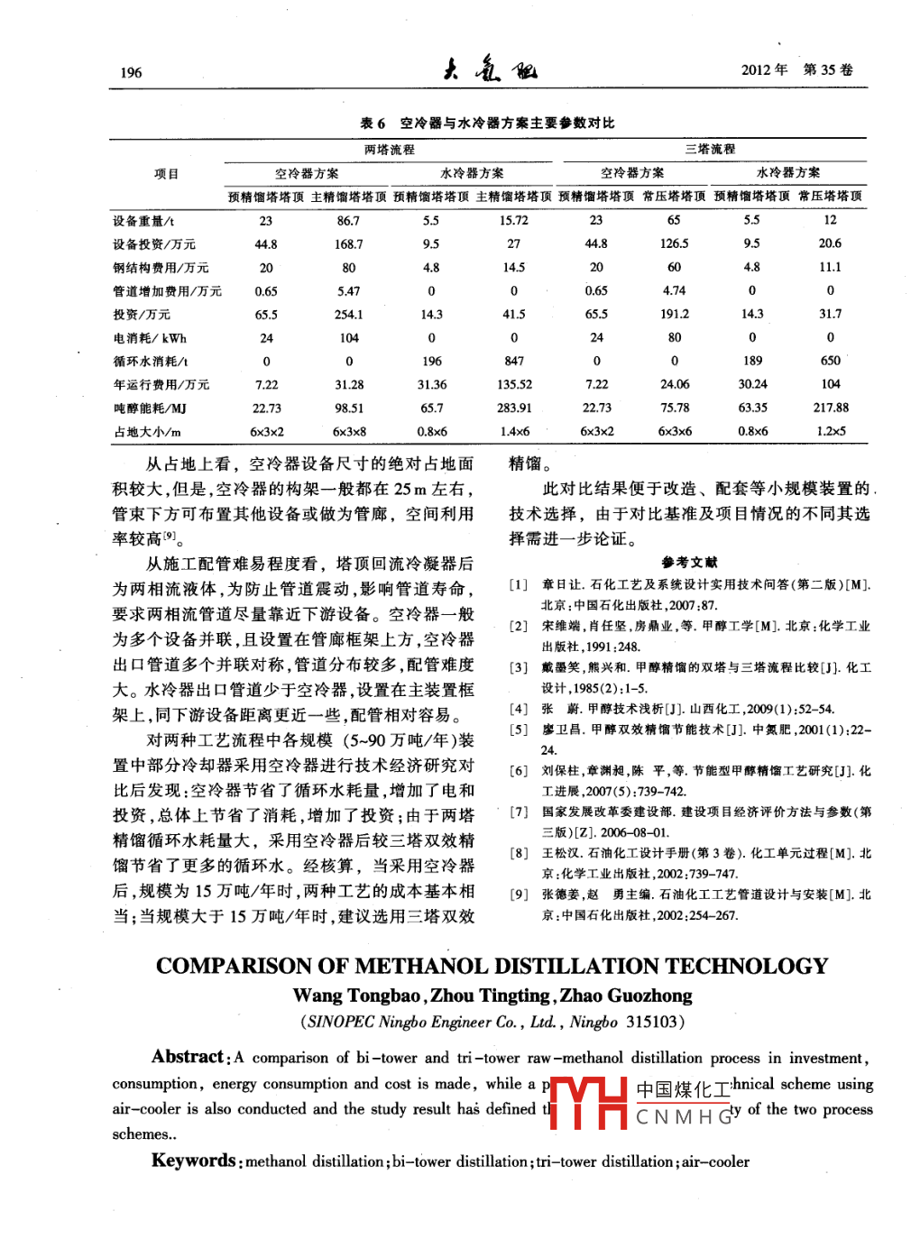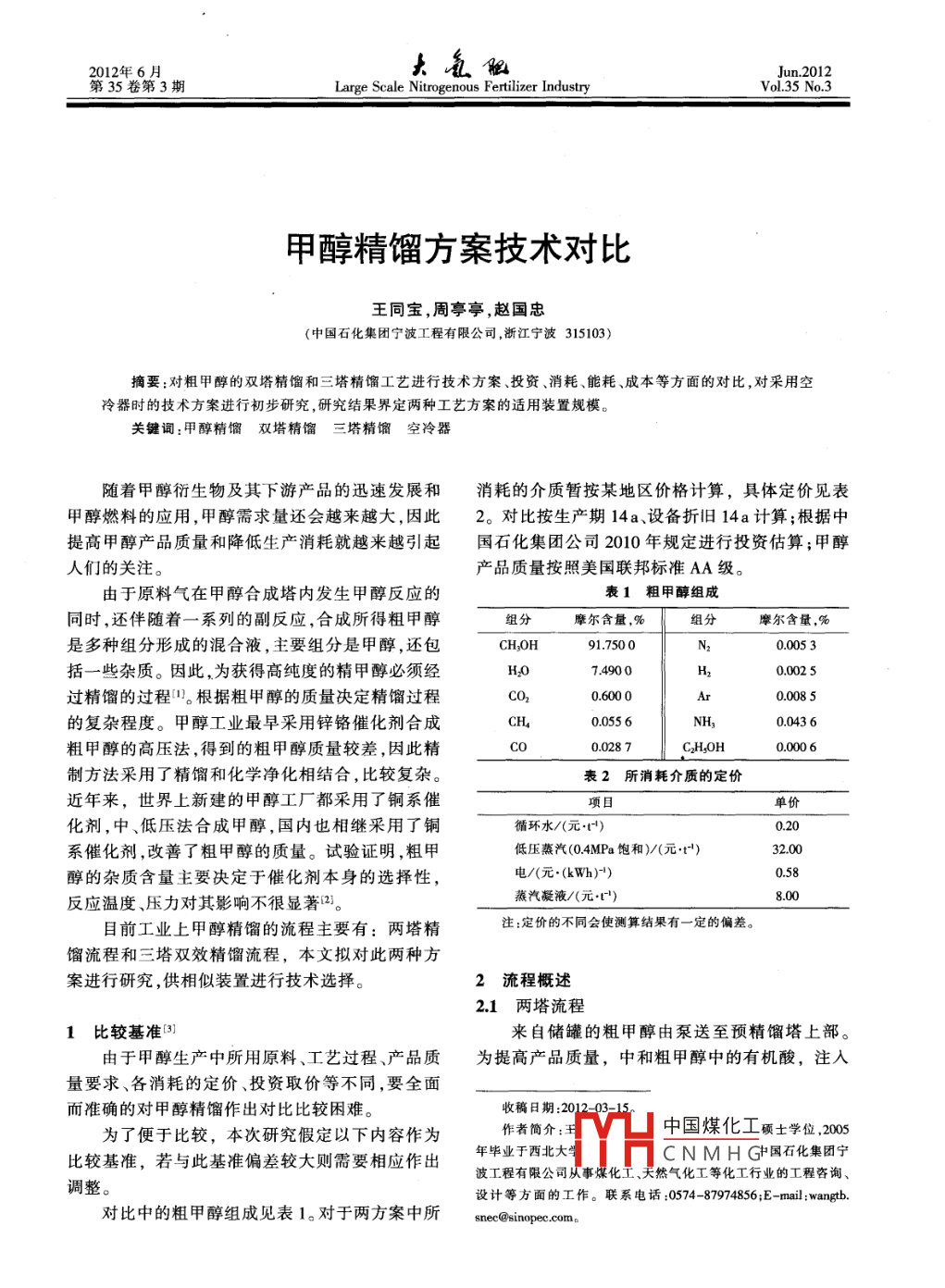 2012年6月第35卷第3期Large Scale Nitrogenous Fertilizer IndustryVol 35 No.3甲醇精餾方案技術(shù)對(duì)比王同寶,周亭亭,趙國(guó)忠(中國(guó)石化集團(tuán)寧波工程有限公司,浙江寧波315103)摘要:對(duì)粗甲醇的雙塔精餾和三塔精餾工藝進(jìn)行技術(shù)方案、投資、消耗、能耗、成本等方面的對(duì)比,對(duì)采用空冷器時(shí)的技術(shù)方案進(jìn)行初步研究,研究結(jié)果界定兩種工藝方案的適用裝置規(guī)模。關(guān)鍵詞:甲醇精餾雙塔精餾三塔精餾空冷器隨著甲醇衍生物及其下游產(chǎn)品的迅速發(fā)展和消耗的介質(zhì)暫按某地區(qū)價(jià)格計(jì)算,具體定價(jià)見表甲醇燃料的應(yīng)用,甲醇需求量還會(huì)越來(lái)越大,因此2。對(duì)比按生產(chǎn)期14a、設(shè)備折舊14a計(jì)算;根據(jù)中提高甲醇產(chǎn)品質(zhì)量和降低生產(chǎn)消耗就越來(lái)越引起國(guó)石化集團(tuán)公司2010年規(guī)定進(jìn)行投資估算;甲醇人們的關(guān)注。產(chǎn)品質(zhì)量按照美國(guó)聯(lián)邦標(biāo)準(zhǔn)AA級(jí)。由于原料氣在甲醇合成塔內(nèi)發(fā)生甲醇反應(yīng)的表1粗甲醇組成同時(shí),還伴隨著一系列的副反應(yīng),合成所得粗甲醇組分摩爾含量,%組分摩爾含量,%是多種組分形成的混合液,主要組分是甲醇,還包括一些雜質(zhì)。因此,為獲得高純度的精甲醇必須經(jīng)74900NH缸0005300025過(guò)精餾的過(guò)程。根據(jù)粗甲醇的質(zhì)量決定精餾過(guò)程0600000085的復(fù)雜程度。甲醇工業(yè)最早采用鋅鉻催化劑合成00436粗甲醇的高壓法,得到的粗甲醇質(zhì)量較差,因此精00287CHoH0.0006制方法采用了精餾和化學(xué)凈化相結(jié)合,比較復(fù)雜。表2所消耗介質(zhì)的定價(jià)近年來(lái),世界上新建的甲醇工廠都采用了銅系催化劑,中、低壓法合成甲醇,國(guó)內(nèi)也相繼采用了銅循環(huán)水/(元)系催化劑,改善了粗甲醇的質(zhì)量。試驗(yàn)證明,粗甲低壓蒸汽(04MPa飽和)/(元t)醇的雜質(zhì)含量主要決定于催化劑本身的選擇性,電/(元·(kWh)-)0.58反應(yīng)溫度、壓力對(duì)其影響不很顯著2。燕汽凝液/(元t)8.00目前工業(yè)上甲醇精餾的流程主要有:兩塔精注:定價(jià)的不同會(huì)使測(cè)算結(jié)果有一定的偏差餾流程和三塔雙效精餾流程,本文擬對(duì)此兩種方案進(jìn)行研究,供相似裝置進(jìn)行技術(shù)選擇。2流程概述21兩塔流程1比較基準(zhǔn)③來(lái)自儲(chǔ)罐的粗甲醇由泵送至預(yù)精餾塔上部。由于甲醇生產(chǎn)中所用原料、工藝過(guò)程、產(chǎn)品質(zhì)為提高產(chǎn)品質(zhì)量,中和粗甲醇中的有機(jī)酸,注入量要求、各消耗的定價(jià)、投資取價(jià)等不同,要全面而準(zhǔn)確的對(duì)甲醇精餾作出對(duì)比比較困難。收稿日期:2012-03-15為了便于比較,本次研究假定以下內(nèi)容作為作者簡(jiǎn)介:王中國(guó)煤化工碩士學(xué)位,2005比較基準(zhǔn),若與此基準(zhǔn)偏差較大則需要相應(yīng)作出年畢業(yè)于西北大CNMHG國(guó)石化集團(tuán)寧波工程有限公司從事煤化工、天然氣化工等化工行業(yè)的工程咨詢、調(diào)整。設(shè)計(jì)等方面的工作。聯(lián)系電話:0574-87974856;E-mail:wan對(duì)比中的粗甲醇組成見表1。對(duì)于兩方案中所194去做2012年第35卷2%的堿液,粗甲醇在粗甲醇預(yù)熱器中被來(lái)自主精器冷凝,冷凝甲醇在重力作用下流入常壓塔回流餾塔的塔底水預(yù)熱至54℃后送入預(yù)精餾塔。罐,再由泵送至常壓塔頂部作為回流,同時(shí)送出一從預(yù)精餾塔頂部出來(lái)的氣體包括不凝性氣股產(chǎn)品甲醇體、輕組分、水蒸氣及甲醇。經(jīng)過(guò)預(yù)精餾塔塔頂二些重組分有機(jī)物,主要為乙醇和丁醇,容易級(jí)冷凝后,大部分水和甲醇通過(guò)預(yù)精餾塔回流槽在常壓塔內(nèi)甲醇/水的分界面上發(fā)生積聚,在此處及預(yù)精餾塔回流泵回流入塔,回流比約為0.8-09?!げ沙鲆恍」蓚?cè)線產(chǎn)品以排出這部分重組分。這股不凝氣和大部分二甲醚等低沸點(diǎn)雜質(zhì)及少量甲醇側(cè)線產(chǎn)品即所謂的雜醇油。雜醇油在雜醇油管中蒸氣經(jīng)水洗后達(dá)標(biāo)排放。氣體在冷凝過(guò)程中,一小收集,同時(shí)雜醇油管也接收來(lái)自預(yù)精餾塔次級(jí)冷部分輕組分冷凝并進(jìn)入甲醇中,為防止其在系統(tǒng)凝器排放的一股次級(jí)甲醇。中累積,連續(xù)排放少量冷凝液到雜醇油槽來(lái)自加壓塔和常壓塔的產(chǎn)品甲醇冷卻至45℃從預(yù)精餾塔塔底出來(lái)的粗甲醇由主精餾塔給后送出界外4。料泵送至主精餾塔。主精餾塔釜溫度維持在116℃,塔頂溫度維持在71℃左右,由再沸器加熱塔釜3方案對(duì)比液體。主再沸器的熱源為表壓04MPa的飽和蒸31技術(shù)方案對(duì)比汽。產(chǎn)品甲醇從主精餾塔側(cè)線采出,冷卻至40℃三塔精餾與兩塔精餾的區(qū)別主要在于主精餾后,送往產(chǎn)品甲醇儲(chǔ)罐。塔的設(shè)置和能量綜合利用方面。粗甲醇經(jīng)過(guò)預(yù)熱22三塔雙效流程后進(jìn)入預(yù)精餾塔,預(yù)精餾塔為常壓操作,粗甲醇中從界外來(lái)的粗甲醇在送入預(yù)精餾塔前通過(guò)燒含有的輕組分在預(yù)精餾塔中分離出來(lái),由塔頂逸堿給料包添加氫氧化鈉溶液。預(yù)精餾塔操作壓力出。脫除大部分輕組分后離開預(yù)精餾塔底部