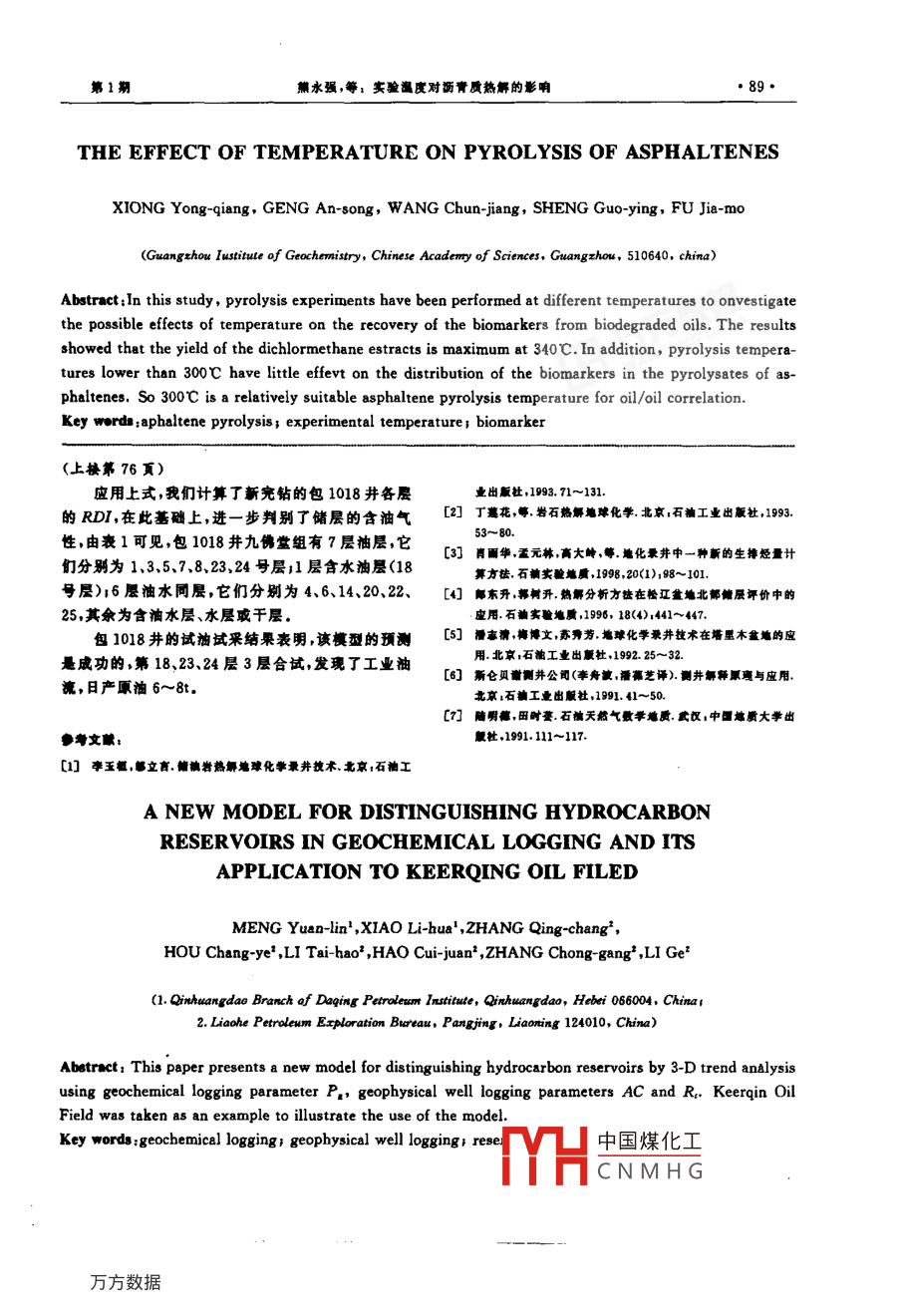 第22卷第1期2000年3月mN油L齡魏EoloGy文章號(hào):1001-6112(2000)01-0085-05實(shí)驗(yàn)溫度對(duì)瀝青質(zhì)熱解的影響熊永強(qiáng),耿安松,王春江,盛國英,傅家謨(中國科學(xué)院廣州地球化學(xué)研究所,廣州510640)摘要:*項(xiàng)研究主要是通過不同溫度條件下的瀝青質(zhì)熱解實(shí)驗(yàn),研究熱解溫度對(duì)生物降解原油中生物標(biāo)右物的恢復(fù)可能產(chǎn)生的影響,研究罐果裹明340℃時(shí),瀝青質(zhì)組分具有最大的產(chǎn)油率,另外,300℃之前熱新溫度對(duì)斷青質(zhì)熱解產(chǎn)物中生物標(biāo)志物的組成分布影響較小因此,對(duì)于采用生物標(biāo)志物恢復(fù)的方法來進(jìn)行油/油對(duì)比時(shí),300℃是衡青質(zhì)熱解實(shí)驗(yàn)較合造的溫度關(guān)擒詞:瀝背質(zhì)熱解;實(shí)驗(yàn)溫度;生物標(biāo)志物中圖分龔號(hào):TE135文標(biāo)識(shí)碼:A由于原油中瀝青質(zhì)的化學(xué)組成基本上不受生物為瀝青質(zhì)熱解實(shí)驗(yàn)條件的確定提供可靠的依據(jù)。降解等作用的影響,因此,瀝青質(zhì)熱解可用于對(duì)那些遑受了生物降解作用的原油進(jìn)行生物標(biāo)志物的恢1樣品和方法復(fù),從而用于這類原油的油/油、油/源對(duì)比-對(duì)于玻璃管無水瀝青質(zhì)熱解實(shí)驗(yàn), Rubinstein1.1樣品等指出較低的熱解溫度和較短的實(shí)驗(yàn)時(shí)間盡管可以本研究所用樣品為取自遼河油田曙光-歡喜嶺產(chǎn)生與原油具有相似分布的生物標(biāo)志物,但它們的潛山帶的歡618,為輕度降解的原油,正構(gòu)烷烴部分總體產(chǎn)率相對(duì)較低;較高的熱解溫度和較長的實(shí)驗(yàn)遭受了一定程度的降解。原始實(shí)驗(yàn)樣品的基本情況時(shí)間則會(huì)使部分生物標(biāo)志物發(fā)生裂解,對(duì)其分布產(chǎn)見表1和圖1。生顯著的影響 Cassani采用300℃、330℃、350℃1.2實(shí)驗(yàn)方法和370℃4個(gè)不同溫度對(duì) Cerro Negro原油進(jìn)行瀝直接取數(shù)10g原油,加人相當(dāng)于其質(zhì)量75%的青質(zhì)熱解實(shí)驗(yàn),結(jié)果表明330℃之前熱解溫度對(duì)生二氯甲烷使其充分溶解后,再加人50m/g(原油)的物標(biāo)志物的分布具有較小的影響,因此300℃條件石油醚進(jìn)行沉淀,靜置過夜。然后過濾,并用石油醚下的瀝青質(zhì)熱解產(chǎn)物可用于生物降解原油的油/油、沖洗數(shù)次,將濾紙折疊并取出置于索氏抽提器中,用油/源巖對(duì)比0,然而, Cassani實(shí)驗(yàn)中所選的Cero石油醚抽提48h以上,直到回流的石油無色為止Negro油樣是一生物降解程度較高的原油,其中C2殘余物用二氯甲烷回流溶解瀝青質(zhì)旋轉(zhuǎn)蒸發(fā)除去脫甲基烷的存在和規(guī)則甾烷的幾乎缺失都是由于溶劑,恒重,即制得高純度的瀝青質(zhì)。生物降解作用所產(chǎn)生的,這樣原油與熱解產(chǎn)物的生將制備的純?yōu)r青質(zhì)一式5份用二氯甲烷轉(zhuǎn)移到物標(biāo)志物分布中存在的一些明顯差異可以歸屬于生玻璃安瓿瓶中,再用氮?dú)獯登軇?抽至真空狀態(tài)密物降解作用的影響,由于生物降解作用的影響,使得封,置于馬福爐中分別在280℃、300℃、320℃原油與熱解產(chǎn)物之間的生物標(biāo)志物分布缺少直接的340℃和360℃條件下加熱72h。開封后用二氯甲烷對(duì)比。將熱解產(chǎn)物沖洗出來,兼干后按分離原油組分的方本研究的目的則是通過一降解較輕微的原油來法把它們分離成飽和烴、芳烴和非烴組分,將飽和烴探討熱解溫度對(duì)生物標(biāo)志物恢復(fù)可能產(chǎn)生的影響,組分作GCMS分析收日期:199812-19修訂日期:199-11-16金項(xiàng)目:中國科學(xué)底童大項(xiàng)目(KZ951-B1-412)和廣東省自然科學(xué)基金(960501)資助作者篇介:集永強(qiáng)(1967-),男,江西南昌人,助理研究員、博士生,主要從事油氣H中國煤化工CNMHG第22卷2結(jié)果和討論2.1熱解產(chǎn)物的組成變化圖2和表2揭示了瀝膏質(zhì)熱解產(chǎn)物的族組成以及它們的產(chǎn)率變化特征。隨著熱解溫度的升高,熱解產(chǎn)物中飽和烴的相對(duì)含量逐漸增加;非烴十瀝青質(zhì)含量則逐漸減少;芳烴變化較小,只是稍有減少。各族組分的產(chǎn)率是由它們的實(shí)際生成量除以熱解所用60008000瀝青質(zhì)總量計(jì)算得出的。從產(chǎn)率上看,飽和烴表現(xiàn)為先增加,到340℃達(dá)到最大,然后下降,表明340C之圖1歡618原油的總離子流圖前飽和烴以熱解生成為主,340℃之后則以裂解生成Fig. 1 Total ion traces of H618 crude oil低碳數(shù)氣態(tài)烴為主芳烴變化不明顯,只是340℃之后略減少;非烴+瀝青質(zhì)則一直呈現(xiàn)下降的趨勢(shì)2.2熱解產(chǎn)物中生物標(biāo)志物的演化特征隨著溫度的升高,熱解產(chǎn)物飽和烴中甾萜類生物標(biāo)志物的相對(duì)含量逐漸減少??赡苡袃煞矫娴脑?一是由于溫度的升高,更多的正構(gòu)烷烴化合物得炬十面背質(zhì)以產(chǎn)生;另一原因則是由于甾萜類生物標(biāo)志物不穩(wěn)定,隨著溫度的升高而裂解成低分子量的化合物2.2.1萜類化合物熱解溫度/℃m/z123、m/z191質(zhì)量色譜圖中可大致看出二環(huán)倍半萜烷、三環(huán)二萜烷和五環(huán)三萜烷之間相對(duì)含圖2熱解產(chǎn)物的產(chǎn)率變化曲線圖量的變化關(guān)系(圖3、圖4)。歡68原油中以五環(huán)三Fig. 2 Variation of the various yields萜烷為主,主要