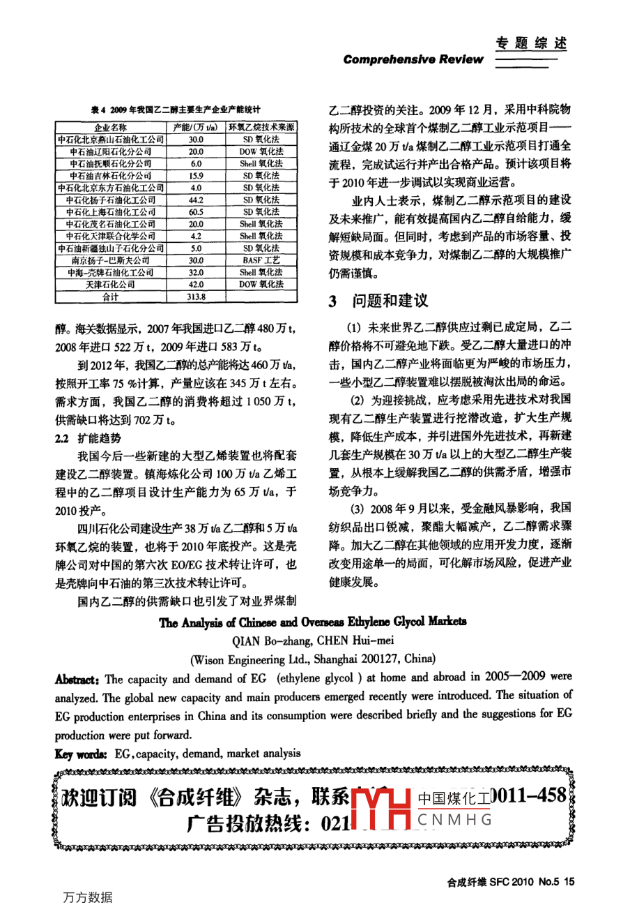 專題綜述Comprehens/ve Review國內(nèi)外乙二醇市場分析錢伯章,陳惠梅(惠生工程有限公司,上海200127)摘要:分析了2005-200年國內(nèi)外乙二醇產(chǎn)能和市場需求,介紹了近年來全球乙二醇新增產(chǎn)能和主要生產(chǎn)商的情況,對我國乙二醇生產(chǎn)企業(yè)和近幾年我國消費(fèi)狀況作了簡單描迷,就我國乙二醇生產(chǎn)現(xiàn)狀提出幾點(diǎn)建議。關(guān)鍵詞:乙二醇;產(chǎn)能;需求;市場分析中圖分類號:TQ340文獻(xiàn)標(biāo)識碼:A文章編號:1001-7054(2010)05-0013-03醇(EG)作為重要的有機(jī)化工原料,主過剩態(tài)勢,但亞洲地區(qū)的產(chǎn)量卻不能滿足實(shí)際的需要用于制造合成纖維、合成樹脂、增塑劑、化妝品求,每年都得大量進(jìn)口,中國市場乙二醇更是供不應(yīng)以及炸藥等,也用于配制低凝固點(diǎn)冷卻液求。作為世界最大的消費(fèi)國,中國2008年和2009年消費(fèi)量分別占世界消費(fèi)量的379%和41.2%,外1國際市場分析銷市場的一半將集中到中國。2008-2010年,中面對亞洲特別是中國迅速擴(kuò)大的消費(fèi)市場消費(fèi)市場,國將新增產(chǎn)能221萬ta。全球乙二醇市場正掀起一股擴(kuò)能高潮,世界各大公未來幾年,中國必將成為乙二醇廠商競相搶司均加緊新建和擴(kuò)建乙二醇產(chǎn)能。200年世界乙占的市場。隨著亞洲地區(qū)大型乙二醇項(xiàng)目的投產(chǎn)醇生產(chǎn)能力達(dá)2327萬a,預(yù)計200年總產(chǎn)能這一地區(qū)乙二醇產(chǎn)品長期供不應(yīng)求的矛盾將會得到將達(dá)到2709萬Ⅶ。同時,以中東為主的產(chǎn)能新增定程度的緩解,但供需仍有較大的缺口。面對亞地和以中國為主的亞洲消費(fèi)地的崛起,將大大沖擊洲及中國這一迅速擴(kuò)大的市場,世界各大公司均加世界乙二醇市場格局,使供銷結(jié)構(gòu)發(fā)生重大變化。緊新建和擴(kuò)建乙二醇生產(chǎn)能力。除加拿大、美國、陶氏化學(xué)是目前世界上最大的乙二醇生產(chǎn)企韓國和日本這些傳統(tǒng)向中國出口乙二醇的國家外,業(yè),產(chǎn)能320萬ta,占200年全球總產(chǎn)能的沙特等中東國家以其廉價的乙烷原料為基礎(chǔ)生產(chǎn)的13.8%,生產(chǎn)廠主要分布在美國、加拿大、荷蘭和乙二醇,在中國市場銷售的份額正在迅速增加。英國;第二大生產(chǎn)商是沙特東方石化公司L1近期擴(kuò)能項(xiàng)目( Sharq),產(chǎn)能280萬a,約占全球的12%。到近年來,世界乙二醇生產(chǎn)基地正加速向中東2010年,沙特東方石化公司的乙二醇生產(chǎn)能力將集中。20062010年世界乙二醇新增產(chǎn)能超過超過30萬怕a,有望取代陶氏化學(xué)成為全球最大800萬a,其中超過500萬v的產(chǎn)能集中在沙的乙二醇生產(chǎn)商。特、伊朗、科威特等中東國家。如科威特伊奎特雖然從總體上看,全球乙二醇產(chǎn)能已經(jīng)出現(xiàn)2號60萬a項(xiàng)目、沙特東方石化4號70萬va項(xiàng)目rV凵中國煤化工項(xiàng)目于20%年投稿日期:20100308作者簡介:錢伯章(1939-),男,教授高工,1958年畢業(yè)予華東CNMHG恤a項(xiàng)目和伊朗國家石縣可男va日刀奶200年下半年和理工大學(xué)燃料化工系,獲各種各級蒙譽(yù)70余項(xiàng),出版著作10部發(fā)表論文1240余篇2009年第四季度投產(chǎn);沙特拉比格煉化公司合成纖維SFc2010N513專題綜述ComprehensIve Revlew( Petro Rabigh))一套70萬ta的新建乙二醇裝置于進(jìn)囗量分別為420萬t和30萬t其中亞洲(主要200年6月初投產(chǎn);沙特阿美石油公司80萬va是中國)一直是世界最大的進(jìn)口地區(qū),而西歐地區(qū)項(xiàng)目和沙特朱拜勒3號675萬堆項(xiàng)目分別于2009年的貿(mào)易相對平衡,近年來一直保持少量的凈進(jìn)口。第二季度和2010年第四季度投產(chǎn)。中東新增的乙2010年,亞洲乙二醇消費(fèi)量將占世界消費(fèi)總二醇產(chǎn)能基本上供出口需要,而且主要銷往以中國量的一半以上,中國消費(fèi)量占亞洲國家首位。為主的亞洲國家。2010年全球乙二醇需求有望增長約6%,主據(jù)析邁(CMA)公司中東和印度地區(qū)管理總要由中國和印度兩國引領(lǐng)。當(dāng)前全球乙二醇需求估監(jiān) Tony Potter2090年12月的預(yù)測分析,中東乙計為1920萬ta,而中國的需求約為780萬a,印二醇能力將從2000年620萬a增加到2014年度需求約為180萬a880萬a。在這5年內(nèi),中東地區(qū)乙二醇占全球的據(jù)預(yù)測,在今后5年內(nèi)亞洲仍將主導(dǎo)世界需求總份額將從28%提升至32%。產(chǎn)品的大多數(shù)將用量的增長,其占全球乙二醇需求的份額將提高到于出口。分析指出,中東地區(qū)乙二醇產(chǎn)能已超過包70%,全球乙二醇需求的年增長率將超過5%括墨西哥在內(nèi)的北美。北美的EG能力所占份額將表2列出世界乙二醇供需狀況及預(yù)測,表3列從2009年的19%下降至2014年的14%出世界乙二醇消費(fèi)結(jié)構(gòu)及預(yù)測12世界主要生產(chǎn)商表2世界乙二醇供需狀況及預(yù)測2005年世界乙二醇居前10位的企業(yè)生產(chǎn)能力「年份生產(chǎn)能力/(萬a)生產(chǎn)量/O萬t)消費(fèi)量/G萬a)16871590合計為9898萬血a,占世界乙二醇總能力的16941670583%。2010年,世界前10位的乙二醇生產(chǎn)企業(yè)8521858產(chǎn)能將達(dá)到1603萬ta,占世界總產(chǎn)能的比例將提2327高到67%(見表1)。2010年沙特阿拉伯沙伯公司25902140的乙二醇產(chǎn)能(包括朱拜勒聯(lián)合石化、東方石化和表3世界
