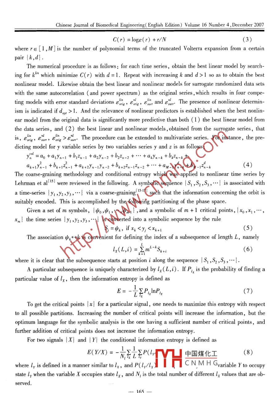 Chinese Journal of Biomedical Engineering( English Edition) Volume 16 Number 4 , December 2007Nonlinear Analysis of Physiological Time SeriesMENG Qing-fang',PENG Yu-hua' ,XUE Yu-i? ,HAN Min'1 School of Information Science and Engineering , Shandong Unirersity, Jinan 250100 ,China2 Shandong Youth Administrative Cadres College ,Jinan 250103 ,ChinaAbstract. The heart rate variability could be explained by a low. dimensional gover-ning mechanism. There has been increasing interest in verifying and understanding thecoupling between the respiration and the heart rate. In this paper we use the nonlinear de-tection method to detect the nonlinear deterministic component in the physiological timeseries by a single variable series and two variables series respectively, and use the condi-tional information entropy to analyze the correlation between the heart rate, the resprationand the blood oxygen concentration. The conclusions are that there is the nonlinear deter-ministic component in the heart rate data and respiration data, and the heart rate and therespiration are two variables originating from the same underlying dynamics.Key words : Nonlinear time series analysis ; nonlinear detection ; conditional informa-tion entropy ; heart rate variabilityINTRODUCTIONNonlinear time series analysis that are suit to analyze complex phenomena have been extensivelystudied in the past two decades'; " .6]1 . Various methods have been proposed to extract nonlinear informa-tion from real time series. Important problems in this field are that if time series are indicative of under-lying nonlinear dynamics , and arise from a low dimensional attractor, etc. Detecting the nonlinear dy-namics in real time series and determining the nature of time series are very important for natural da-tal7141A different strategy, widely accepted at present , is to test the original data conformance with cer-tain regularity patterns ,often through a statistical comparison with randomly generated surrogate da-t[-10]or to infer the presence of nonlinear determinism in time series on the basis of its nonlinear short-term predictabilityHowever, most of them require rather long time series and are not robust to中國(guó)煤化工Heart rate variability has attracted much attention froMYHCNMHG1980s. It hasCLC number:R 318. 04 Document code:A Article ID; 1004-0552( 2007 )04-0163-07Crant sponsor:Scientifc Research Foundation for the Retumed Overseas Chinese Scholars of China ;Grant number :2004. 176. 4;Grant sponsor: Natural Sei-ence Foundation of Shandong Province;Grant rumber:72004C0LReceivea 27 Tuly 20:eie 2 Novembter 209@ou.co--163-CHINESE J. BIOMED. ENG. VOL.16 NO.4, DEC.2007been understood that a metronomic heart rate is pathological, and that the healthy heart is influenced bymultiple neural and hormonal inputs that result in variations in interbeat ( RR ) intervals , at time scalesranging from less than a second to 24 h. Even after 20 years of study , new analytic techniques continueto reveal properties of the time series of RR intervals. Many researches in this area aim to discover or ex-plain how changes in variability can be related to specific pathologies.There is growing evidence that observed variations in the heart rate ,it might be related to a low-di-mensional governing mechanism, so to understand this mechanism is obviously important. The heart rateand the respiration are potentially interacting variables. A correlation between breathing and the heartrate, called respiratory sinus arrhythmia, is almost always observed. There has been increasing interestin verifying and understanding the coupling between the respiration and the heart rate.In this paper we use the nonlinear detection method to detect the nonlinear deterministic componentin the physiological time series by a single variable series and two variables series respectively, and usethe conditional information entropy, which is minimized at zero relative shift of the two signals if the sig-nals have their origin in same underlying dynamics, so as to analyze the correlation between the heartrate, the respiration and the blood oxygen concentration.ANALYSIS PHYSIOLOGICAL TIME SERIES USING NONLINEAR METHODIn the following we briefly review the method of detecting nonlinear dynamics in time series4 ,which is suit to short noisy time series. For time series, a closed-loop version of the dynamics in whichthe output feeds back as a delayed input was proposed. Within this framework, we analyze time series byusing a discrete Volterra autoregressive series of degree, and memory as a model to calculate the predic-ted time series yin :yn =0o +a.yn-1 +a2Yn-2 +... +arYn-k +ag+1Yn-1+M-14+2+-1-+...+.-1y%-h=. Samm(n)(1)Where the functional basis {zm (n)} is composed of all the distinct combinations of the embeddingspace coordinates (yn-1ny--,ynm-3,",yxn_k)up to degree d, with a total dimension M= Ck+d=(h+d)! /(k! d!). Thus, each model is parameterized by k and d which correspond to the embedding di-mension and the degree of the nonlinearity of the model (i.e. d=1 for linear model andd > 1 for nonlin-ear model). The coefficients am are recursively estimated through a Gram- Schmidt procedure from linearand nonlinear autocorrelations of time series itself.The goodness of fit of a model ( linear vs. nonlinear) is measured by the normalized residual sum ofsquare errors :s [y%a'-y,]2ε(h,d)2==(2)中國(guó)煤化工1CNMHGwhereF=N-N.,yn and e( m,d)2 is, in fact ,on a normallzed vanance o1 tne error residuals. The op-timal model {roor ,dor } is the model that minimizes the Akaike information criterion:-164-Chinese Journal of Bionedical Engineering( English Edition) Volume 16 Number 4 , December 2007C(r) =loge(r) +r/N(3)where r∈[1 ,M]is the number of polynomial terms of the truncated Volterra expansion from a certainpair {k,d}.The numerical procedure is as follows : for each time series,obtain the best linear model by search-ing for h'n which minimize C(r) with d=1. Repeat with increasing