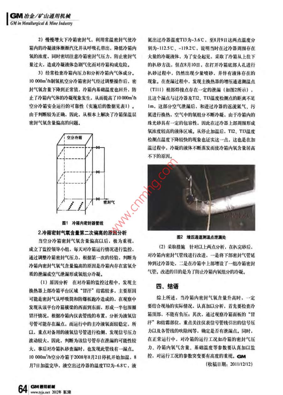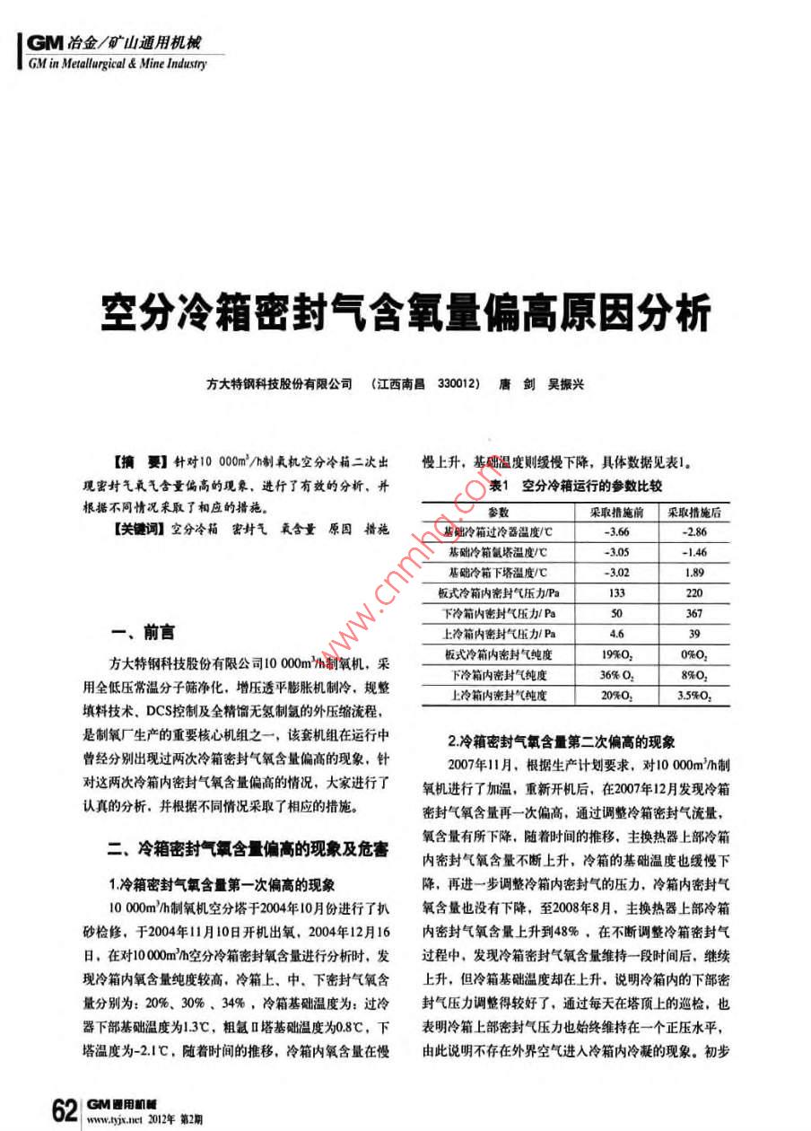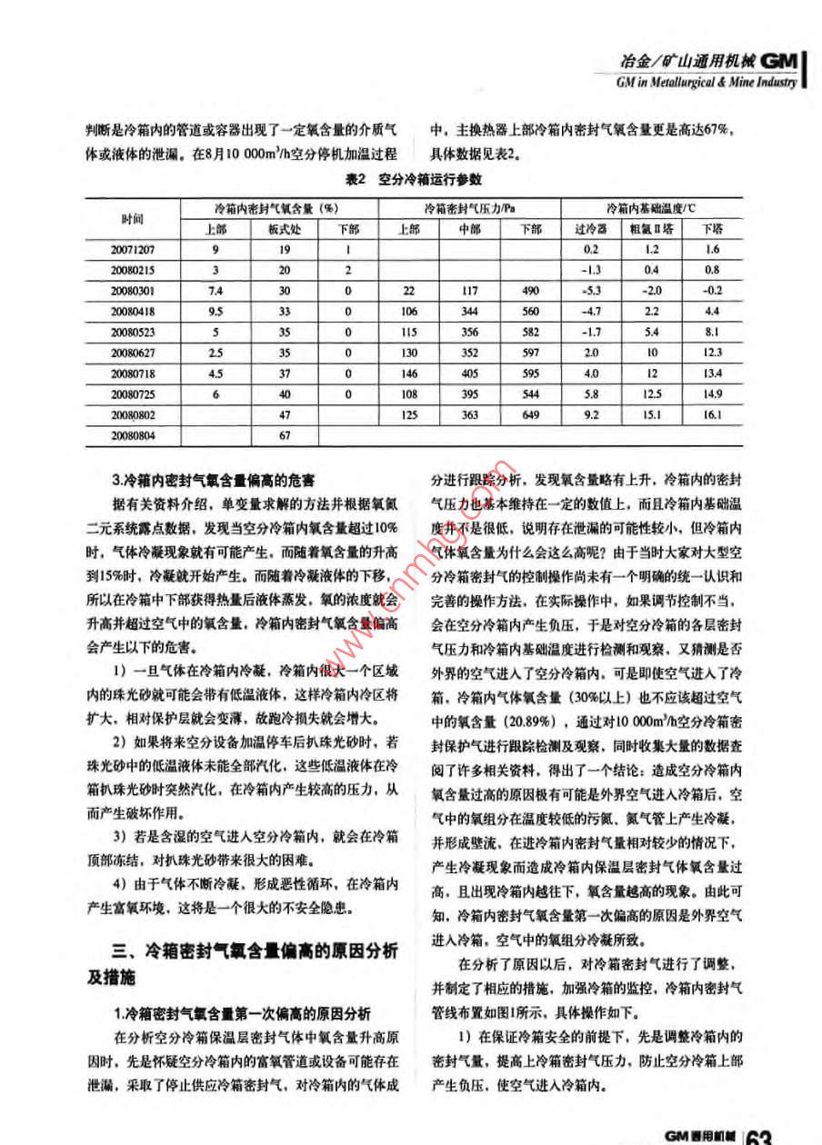 cM治金礦山通用機(jī)械GM in Metallurgical& Mine Industry空分冷箱密封氣含氧量偏高原因分析方大特鋼科技股份有限公司(江西南昌330012)唐劍吳振興【擴(kuò)要】針對1000m∧h制氧機(jī)空分冷葙二次出慢上升,基礎(chǔ)溫度則緩慢下降,具體數(shù)據(jù)見表1?,F(xiàn)密封氣戰(zhàn)氣含量偏高的現(xiàn)象,進(jìn)行了有效的分析,并表1空分冷箱運(yùn)行的參數(shù)比較根據(jù)不同情況釆取了和應(yīng)的措施參數(shù)采取措施前采取措施后【關(guān)詞】空分冷箱密封氣氧含量原因措施基礎(chǔ)冷箱過冷器溫度/C286基礎(chǔ)冷箱氬塔溫度/C基礎(chǔ)冷箱下塔溫度/C1.89板式冷箱內(nèi)密封氣壓力/Pa下冷箱內(nèi)密封氣壓力Pa50、前言上冷箱內(nèi)密封氣壓加P方大特鋼科技股份有限公司1000mh制氧機(jī),采板式冷箱內(nèi)密封氣純度19%O0%O2下冷箱內(nèi)密封氣純度6%0用全低壓常溫分子篩凈化,增壓透平膨脹機(jī)制冷,規(guī)整上冷箱內(nèi)密封氣純度0%o5%O填料技術(shù),DCS控制及全精餾無氫制氬的外壓縮流程是制氧廠生產(chǎn)的重要核心機(jī)組之一,該套機(jī)組在運(yùn)行中2冷箱密封氣氧含量第二次偏高的現(xiàn)象曾經(jīng)分別出現(xiàn)過兩次冷箱密封氣氧含量偏高的現(xiàn)象,針2007年1月,根據(jù)生產(chǎn)計(jì)劃要求,對1000m7h制對這兩次冷箱內(nèi)密封氣氧含量偏高的情況,大家進(jìn)行了氧機(jī)進(jìn)行了加溫,重新開機(jī)后,在200年2月發(fā)現(xiàn)冷箱認(rèn)真的分析,并根據(jù)不同情況采取了相應(yīng)的措施。密封氣氧含量再一次偏高,通過調(diào)整冷箱密封氣流量,氧含量有所下降,隨著時間的推移,主換熱器上部冷箱二冷箱密封氣氧含量偏高的現(xiàn)象及危審內(nèi)密封氣氧含量不斷上升,冷箱的基礎(chǔ)溫度也緩慢下1冷箱密封氣氧含量第一次偏高的現(xiàn)象降,再進(jìn)一步調(diào)整冷箱內(nèi)密封氣的壓力,冷箱內(nèi)密封氣1000m/h制氧機(jī)空分塔于2004年10月份進(jìn)行了扒氧含量也沒有下降,至2008年8月,主換熱器上部冷箱砂檢修,于2004年11月10日開機(jī)出氧,2004年12月16內(nèi)密封氣氧含量上升到48%,在不斷調(diào)整冷箱密封氣日,在對1000mh空分冷箱密封氧含量進(jìn)行分析時,發(fā)過程中,發(fā)現(xiàn)冷箱密封氣氧含量維持一段時間后,繼續(xù)現(xiàn)冷箱內(nèi)氧含量純度較高,冷箱上、中,下密封氣氧含上升,但冷箱基礎(chǔ)溫度卻在上升,說明冷箱內(nèi)的下部密量分別為:20%、30%、34%,冷箱基礎(chǔ)溫度為:過冷封氣壓力調(diào)整得較好了,通過每天在塔頂上的巡檢,也器下部基礎(chǔ)溫度為13℃,粗氬Ⅱ塔基礎(chǔ)溫度為08℃,下表明冷箱上部密封氣壓力也始終維持在一個正壓水平,塔溫度為-2℃,隨著時間的推移,冷箱內(nèi)氧含量在慢由此說明不存在外界空氣進(jìn)入冷箱內(nèi)冷凝的現(xiàn)象。初步62cM用www.ly]s.nct3012年第2期盒山通規(guī)c判斷是冷箱內(nèi)的管道或容器出現(xiàn)了一定氧含量的介質(zhì)氣中,主換熱器上部冷箱內(nèi)密封氣氧含量更是高達(dá)67%,體或液體的泄漏,在8月1000mh空分停機(jī)加溫過程具體數(shù)據(jù)見表2表2空分冷箱運(yùn)行參數(shù)冷箱內(nèi)密封氣氧含量(%)冷箱密封氣壓力P冷箱內(nèi)基礎(chǔ)溫度℃時間板式處上部中部下部過冷器粗頷Ⅱ塔下塔0.21.62008021590088環(huán)2222095200805200806272512.3200807181340544200808021259215.I16.10080804冷箱內(nèi)密封氣氧含量偏高的危害分進(jìn)行跟蹤分析,發(fā)現(xiàn)氧含量略有上升,冷箱內(nèi)的密封據(jù)有關(guān)資料介紹,單變量求解的方法井根據(jù)氧氮?dú)鈮毫σ不揪S持在一定的數(shù)值上,而且冷箱內(nèi)基礎(chǔ)溫二元系統(tǒng)露點(diǎn)數(shù)據(jù),發(fā)現(xiàn)當(dāng)空分冷箱內(nèi)氧含量超過10%度井不是很低,說明存在泄漏的可能性較小,但冷箱內(nèi)時,氣體冷凝現(xiàn)象就有可能產(chǎn)生,而隨著氧含量的升高氣體氧含量為什么會這么高呢?由于當(dāng)時大家對大型空到15%時,冷凝就開始產(chǎn)生。而隨著冷凝液體的下移,分冷箱密封氣的控制操作尚未有一個明確的統(tǒng)一認(rèn)識和所以在冷箱中下部獲得熱量后液體蒸發(fā),氧的濃度就會完善的操作方法,在實(shí)際操作中,如果調(diào)節(jié)控制不當(dāng),升高并超過空氣中的氧含量,冷箱內(nèi)密封氣氧含量偏高會在空分冷箱內(nèi)產(chǎn)生負(fù)壓,于是對空分冷箱的各層密封會產(chǎn)生以下的危害。氣壓力和冷箱內(nèi)基礎(chǔ)溫度進(jìn)行檢測和觀察,又猜測是否1)一旦氣體在冷箱內(nèi)冷凝,冷箱內(nèi)很大一個區(qū)域外界的空氣進(jìn)入了空分冷箱內(nèi),可是即使空氣進(jìn)入了冷內(nèi)的珠光砂就可能會帶有低溫液體,這樣冷箱內(nèi)冷區(qū)將箱,冷箱內(nèi)氣體氧含量(30%以上)也不應(yīng)該超過空氣擴(kuò)大,相對保護(hù)層就會變薄,故跑冷損失就會增大中的氧含量(2089%),通過對1000mh空分冷箱密2)如果將來空分設(shè)備加溫停車后扒珠光砂時,若封保護(hù)氣進(jìn)行跟除檢測及觀察,同時收集大量的數(shù)據(jù)查珠光砂中的低溫液體未能全部汽化,這些低溫液體在冷閱了許多相關(guān)資料,得出了一個結(jié)論:造成空分冷箱內(nèi)箱扒珠光砂時突然汽化,在冷箱內(nèi)產(chǎn)生較高的壓力,從氧含量過高的原因極有可能是外界空氣進(jìn)入冷箱后,