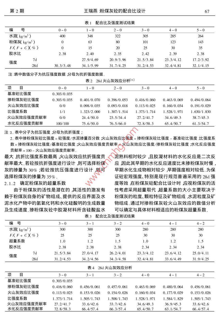 第23卷第2期重慶交通學(xué)院學(xué)報(bào)2004年4月Vo1.23No.2JOURNAL OF CHONGQING JIAOTONG UNIVERSITYApr.2004粉煤灰砼的配合比設(shè)計(jì)王瑞燕重慶交通學(xué)院土木建筑學(xué)院重慶400014)摘要提岀了應(yīng)用火山灰效應(yīng)數(shù)值分析的方法確定粉煤灰在砼中的合理摻量及超量系數(shù)的方法,定量解決粉煤灰與水泥適配性的問題對(duì)摻粉煤灰砼的配合比設(shè)計(jì)具有實(shí)用的指導(dǎo)意義關(guān)鍵詞火山灰效應(yīng)激值分析合理摻量超量系數(shù)中圖分類號(hào)U528.2文獻(xiàn)標(biāo)識(shí)碼B文章編號(hào):001-7162004)2.00603粉煤灰作為具有潛在活性的火山灰質(zhì)固體廢量及超量系數(shù)涕二步建立膠水比與砼強(qiáng)度的關(guān)系,料在水利工程、路橋工程、房建工程用砼中得到了根據(jù)等效的原則進(jìn)行配合比設(shè)計(jì)廣泛的應(yīng)用12]粉煤灰對(duì)砼性能的影響體現(xiàn)在其1原材料″粉煤灰效應(yīng)”上表現(xiàn)為形態(tài)效應(yīng)、活性效應(yīng)、微集料效應(yīng)3個(gè)方面粉煤灰的活性效應(yīng)是通過其與水1水泥采用四川省宜賓市巡場雙三牌PO425R水泥,泥水化產(chǎn)物的二次水化反應(yīng)體現(xiàn)出來的要使粉煤按CB175-9檢測28d抗壓強(qiáng)度50.9Ma抗折強(qiáng)灰的火山灰效應(yīng)得到充分的發(fā)揮就要求粉煤灰與度7.23MPa水泥之間具有一定的適配性以提供反應(yīng)物及反應(yīng)界2粉煤灰面由于各地火電廠的生產(chǎn)工藝流程不同原煤不采用宜賓黃桷莊電廠電除塵灰按GB1596-91同除塵設(shè)備及除塵工藝不同,各地的粉煤灰在成《用于水泥和混凝土中的粉煤灰》檢測A5um方孔篩分顆粒特征上都有很大的差異加之各地生產(chǎn)的水篩余187%燒失量1.16%需水量比8%含水率泥礦物成分也不盡相同因此粉煤灰的應(yīng)用具有其0.52%符合二級(jí)灰質(zhì)量標(biāo)準(zhǔn)自身的特殊性不能照搬照用1.3機(jī)制砂關(guān)于粉煤灰砼配合比的設(shè)計(jì)現(xiàn)階段在我國主表觀密度2.703g/cm3裝填密度1.332gcm3,<要采用的方法有調(diào)整系數(shù)法、超量系數(shù)法、固定粉0.08m顆粒含量3.8%空隙率50.7%煤灰用量法、固定摻量比法等方法3H]現(xiàn)行國家標(biāo)準(zhǔn)《粉煤灰混凝土應(yīng)用技術(shù)規(guī)程XGBJ46-9廂建1.4碎石表觀密度2.649g/cm3裝填密度1.2907g/cm3針設(shè)部標(biāo)準(zhǔn)《粉煤灰在混凝士和砂漿中應(yīng)用技術(shù)規(guī)程》片狀118%壓碎值8.6%空隙率51.0%最大粒JGJ28-86)推薦粉煤灰砼配合比設(shè)計(jì)采用等量取徑40m代法、超量取代法、外摻法56現(xiàn)在又有同行提出摻粉煤灰砼配合比的正交試驗(yàn)設(shè)計(jì)及二元線性分2砼配合比設(shè)計(jì)析通過正交試驗(yàn)建立砼強(qiáng)度與水膠比及粉煤灰摻2.1確定粉煤灰的最佳摻量及超量系數(shù)量之間的二元線性關(guān)系7]這些方法對(duì)實(shí)際工程都2.1.1確定粉煤灰的最佳摻量表1~表2)具有較強(qiáng)的實(shí)用性和指導(dǎo)性但是對(duì)粉煤灰的取代從表2分析就所選用材料而言在實(shí)驗(yàn)摻量范量、超量系數(shù)、粉煤灰膠凝效率系數(shù)等反映粉煤灰與圍內(nèi)當(dāng)粉煤灰摻量為35%時(shí)砼抗壓比強(qiáng)度最大水泥適配性的參數(shù)都未提岀具體的確定方法火山灰效應(yīng)抗壓比強(qiáng)度最大抗壓比強(qiáng)度系數(shù)最高筆者認(rèn)為粉煤灰砼的配合比設(shè)計(jì)可以分兩步火山灰效應(yīng)抗壓強(qiáng)度貢獻(xiàn)率最大當(dāng)粉煤灰摻量為第一步根據(jù)原材料的具體特性確定粉煤灰的合理摻30%時(shí)砼抗折比強(qiáng)度最大火山灰效應(yīng)抗折比強(qiáng)度第2期王瑞燕粉煤灰砼的配合比設(shè)計(jì)67表1配合比及強(qiáng)度測試結(jié)果編號(hào)0水泯kg/m3)粉煤灰kgm3)FF+CC%)膠水比27.9/4.69強(qiáng)度20.9/3.9621.5/3.8423.3/4.1228430.3/34834.1/5.9931.7/42531.2/4.53324/481321/415注表中數(shù)值分子為抗壓強(qiáng)度數(shù)據(jù)分母為抗折強(qiáng)度數(shù)據(jù)表228d火山灰效應(yīng)分8項(xiàng)目1-02-03-04-0基準(zhǔn)砼比強(qiáng)度0.303/0.035摻粉煤灰砼比強(qiáng)度0.3030.0350.401/0.0700.3960.0530.416/0.0600.463/0.0690.494/0.064火山灰效應(yīng)比強(qiáng)度0/00.098/0,0350,093/0.0180,113/0.0250.160/0.0340.191/0.029比強(qiáng)度系數(shù)1.323/2.0001.307/1.5141.373/1.7141.528/1.9711.630/1.830火山灰效應(yīng)強(qiáng)度貢獻(xiàn)率0/023.5/34.434.6/49.3水化反應(yīng)強(qiáng)度貢獻(xiàn)率100/10075,6/50.076.5/66072.858.365.4/50.761.3/54.7注】.表中分子為抗壓強(qiáng)度分母為抗折強(qiáng)度2.表中摻粉煤灰砼比強(qiáng)度〓砼強(qiáng)度/水泥摻量百分?jǐn)?shù)火山灰效應(yīng)比強(qiáng)度=摻粉煤灰砼比強(qiáng)度-基準(zhǔn)砼比強(qiáng)度北強(qiáng)度系數(shù)=摻粉煤灰砼比強(qiáng)度/基準(zhǔn)砼比強(qiáng)度火山灰效應(yīng)強(qiáng)度貢獻(xiàn)率=火山灰效應(yīng)比強(qiáng)度/摻粉煤灰砼比強(qiáng)度冰化反應(yīng)強(qiáng)度貢獻(xiàn)率=100-火山灰效應(yīng)強(qiáng)度貢獻(xiàn)率最大抗折比強(qiáng)度系數(shù)最高火山灰效應(yīng)抗折強(qiáng)度貢泥熟料相對(duì)較少,且膠凝材料的水化反應(yīng)是二次反獻(xiàn)率最大.若砼按抗折強(qiáng)度進(jìn)行設(shè)計(jì)則可選擇粉煤應(yīng)因此其早期的水化反應(yīng)速度比未摻粉煤灰時(shí)慢,灰的摻量為30