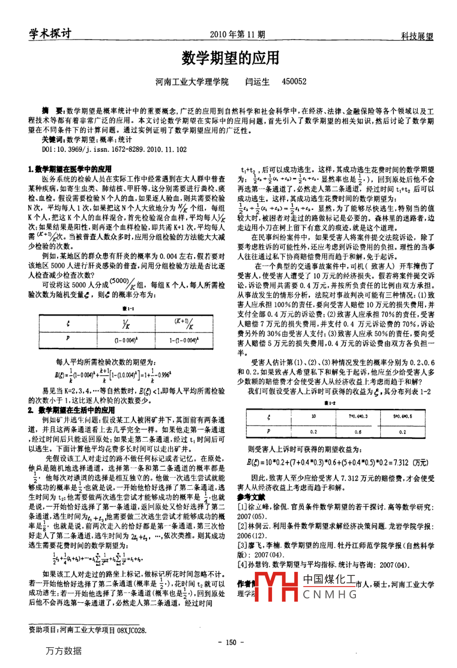 學術(shù)探討200年第11期科技展望數(shù)學期望的應(yīng)用河南工業(yè)大學理學院閆運生450052摘要:數(shù)學期望是概率統(tǒng)計中的重要概念,廣泛的應(yīng)用到自然科學和社會科學中,在經(jīng)濟法律、金融保險等各個領(lǐng)域以及工程技術(shù)等都有著非常廣泛的應(yīng)用。本文討論數(shù)學期望在實際中的應(yīng)用問題,首先引入了數(shù)學期望的相關(guān)知識然后討論了數(shù)學期望在不同條件下的計算問題。通過實例證明了數(shù)學期望應(yīng)用的廣泛性關(guān)鍵詞:數(shù)學期望;概率;統(tǒng)計D0l:10.3969/j.issn.l672-8289.2010.11.1021學期在醫(yī)學中的應(yīng)用t1+t2,后可以成功逃生。這樣,其成功逃生花費時間的數(shù)學期望醫(yī)務(wù)系統(tǒng)的檢驗人員在實際工作中經(jīng)常遇到在大人群中普查為:++)-+·顯然率也是3,),回到原處后他不會某種疾病,如寄生蟲類、肺結(jié)核、甲肝等,這分別需要進行糞檢、痰再選第一條通道了,必然走人第二條通道,經(jīng)過時間t+2后可以檢血檢。假設(shè)需要檢驗N個人的血如果逐人驗血則共需要檢驗成功逃生。這樣,其成功逃生花費時間的數(shù)學期望為:N次,平均每人1次如果把這N個人大致地分為%個組,每組4+}4+4)=34+4·顯然為了能夠盡快逃生特別當?shù)闹礙個人,把這K個人的血樣混合首先檢驗混合血樣,平均每人較大時被困者對走過的路做標記是必要的。森林里的迷路者邊次;如果結(jié)果是陽性,則再逐個血樣檢驗,即共需K+1次,平均每人走邊用小刀在樹上留下有意義的痕跡就是這個道理。需《+%次當被普查人數(shù)眾多時,應(yīng)用分組檢驗的方法能大大減在民事糾紛案件中,如果受害人將案件提交法院訴訟,除了少檢驗的次數(shù)。要考慮勝訴的可能性外,還應(yīng)考慮到訴訟費用的負擔。理性的當事例如某地區(qū)的群眾患有肝炎的概率為0.004左右假若要對人往往通過私下協(xié)商賠償費用而趨于和解免于起訴。該地區(qū)5000人進行肝炎感染的普查,問用分組檢驗方法是否比逐在一個典型的交通事故案件中,司機(致害人)開車撞傷了人檢查減少檢查次數(shù)?受害人,使受害人遭受了10萬元的經(jīng)濟損失。假若將案件提交訴可設(shè)將這500分成0組,每組K個人,每人所需檢訟,訴訟費用共需要0.4萬元,并按所負責任的比例由雙方承擔。驗次數(shù)為隨機變量e,則的概率分布為從事故發(fā)生的情形分析,法院對事故判決可能有三種情況:(1)致害人應(yīng)承擔100%的責任,要向受害人賠償10萬元的損失費用,并支付全部0.4萬元的訴訟費:(2)致害人應(yīng)承擔70%的責任,受害人賠償7萬元的損失費用,并支付0.4萬元訴訟費的70%,訴訟1-0004費另外的30%由受害人支付:(3)致害人應(yīng)承50%的責任,要向受(-0004害人賠償5萬元的損失費用,0.4萬元的訴訟費由雙方各負擔一半每人平均所需檢驗次數(shù)的期望為:受害人估計第(1)、(2)、(3)種情況發(fā)生的概率分別為0.20.6和02如果致普人希望私下和解免于起訴,他應(yīng)至少給受害人多少數(shù)額的賠償費才會使受害人從經(jīng)濟收益上考慮而趨于和解?易見當K=2,3,4,…等自然數(shù)時,B()<1即每人平均所需檢驗我們可假設(shè)受害人上訴時可獲得的收益為2,其分布列表1-2的次數(shù)小于1,這比逐人檢驗的次數(shù)要少。套122學期在生活中的應(yīng)用例如礦井逃生問題:假設(shè)某工人被困礦井下,其面前有兩條通7帕0440350.40道,并且這兩條通道看上去幾乎完全一樣。如果他走第一條通道,經(jīng)過時間后只能返回原處;如果走第二條通道經(jīng)過t1時間后可以逃生。下面計算他平均花費多長時間可以走出礦井則受害人上訴時可獲得的期望收益為先假設(shè)該工人對走過的路不做任何標記或者記憶。在原處,他總是隨機地選擇通道,選擇第一條和第二條通道的概率都是B()=1002+(7+0403)06+(5+04*0.502=73120萬元)他每次對通道的選擇是相互獨立的。他做一次逃生嘗試就能因此,致害人至少應(yīng)給受害人7312萬元的賠償費,才會使受夠成功的概率是三也就是說,一開始他恰好選撣了第二條通道,逃害人從經(jīng)濟收益上考慮而趨于和解。生時間為t2;他需要做兩次逃生嘗試才能夠成功的概率是元也就參考文就是說,一開始恰好選擇了第一條通道,返問原處又恰好選擇了第二[1]徐立峰徐侃官員條件數(shù)學期望的若干探討高等數(shù)學研究條通道,逃生時間為+他需要做三次逃生嘗試才能夠成功的概2007(05率是。·也就是說前兩次走入的恰好都是第一條通道,第三次恰[2]林侗云利用條件數(shù)學期望求解經(jīng)濟決策問題龍巖學院學報:好走人了第二條通道逃生時間為2+,…依次類推。則其成功2006(12)逃生需要花費時間的數(shù)學期望為[3廖飛,李楠數(shù)學期望的應(yīng)用牡丹江師范學院學報(自然科學版);2007(04)洲22[4]孫慧鈞數(shù)學期望與平均指標統(tǒng)計與咨詢:2007(04)如果該工人對走過的路坐上標記做標記所花時間忽略不計。若一開始他恰好選擇了第二條通道(概率是云),花時間t2就可以作者中國煤化工市人,碩士河南工業(yè)大學成功述生;若一開始他選擇了第一條通道(概率也是),回到原處理學CNMHG后他不會再選第一條通道了,必然走人第二條通道,經(jīng)過時間資助項目:河南工業(yè)大學項目08XJc028