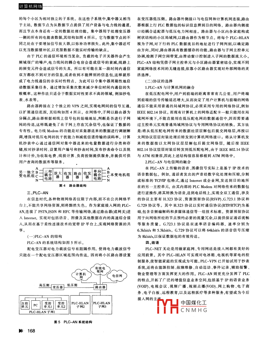 計(jì)算機(jī)網(wǎng)PLC組網(wǎng)方案及應(yīng)用◆王冰玉張秋霞楊富強(qiáng)(河南永城職業(yè)學(xué)院)【摘要】在分析電力線通信網(wǎng)絡(luò)(PLC-NET的特點(diǎn)和應(yīng)用優(yōu)勢(shì)的基電力線。受控單元對(duì)接收到的信號(hào)進(jìn)行選頻、地址判別和解調(diào)后礎(chǔ)上,提出PC- HLAN, PLC-VN和PLC-AN等3種組網(wǎng)方案;送入智能家電接口的控制寄存器以實(shí)現(xiàn)對(duì)各種動(dòng)作的監(jiān)控。在描述PLC-HAN的家電控制等服務(wù)的同時(shí),給出了總線式家庭為了保證該P(yáng)LC-HLAN總線結(jié)構(gòu)安全可靠,一方面硬件設(shè)計(jì)網(wǎng)絡(luò)的硬件組成,分析了網(wǎng)絡(luò)的MAC子層的CSMA/CD及應(yīng)用上,每件支持PLC-HLAN的家電需要包含一個(gè)可編程電路模塊,寫層的CAL協(xié)議的應(yīng)用;在多種PLC-VPN的應(yīng)用中,以自動(dòng)抄表入該電器的識(shí)別信息,電器連接電源線后主控單元檢測(cè)其識(shí)別信系統(tǒng)為例,給出了其組網(wǎng)的具體實(shí)現(xiàn),包括網(wǎng)絡(luò)的數(shù)據(jù)節(jié)點(diǎn)、集中息確認(rèn)電器種類及工作模式后,動(dòng)態(tài)地分配地址給該電器并將其和路由器的結(jié)構(gòu);在PLC-NET與電信網(wǎng)、計(jì)算機(jī)網(wǎng)的業(yè)務(wù)融合寫人該電器的可編程電路模塊。電器與電源線斷開(kāi)連接時(shí)主控單中,給出了PLC-AN的結(jié)構(gòu)以及三網(wǎng)融合的接入方式,其中包括傳元回收地址資源,實(shí)現(xiàn)電器在PLC-HLAN上的即插即用。另一方輸技術(shù)質(zhì)量保證體系和相應(yīng)的應(yīng)用協(xié)議等。面在整個(gè)PLC-HLAN與室外電力線的連接處設(shè)立一個(gè)防火墻,以【關(guān)鍵詞】PLC組網(wǎng)方案確保家庭內(nèi)部數(shù)據(jù)的私有性和控制信號(hào)的獨(dú)立性。(二)MAC層協(xié)議的選擇當(dāng)家庭網(wǎng)絡(luò)中多于1組主機(jī)與家電之間同時(shí)進(jìn)行通信或當(dāng)多在當(dāng)前網(wǎng)絡(luò)多元化發(fā)展的進(jìn)程中電力線通信(PIC電力線通種模式的通信同時(shí)進(jìn)行時(shí)如何分配共享的介質(zhì)資源對(duì)網(wǎng)絡(luò)的響信網(wǎng)絡(luò)( LC-NET)作為網(wǎng)絡(luò)的一支新秀以其覆蓋范圍廣、一線雙應(yīng)時(shí)間、吞吐量和效率將起十分重要的影響用、即插即用、少量投資等獨(dú)有的魅力躋身于群網(wǎng)之中。通觀PLC-由于家電控制服務(wù)負(fù)載較低而且具有可變性和突發(fā)性,綜合NET自身的性能特點(diǎn),具體體現(xiàn)在家庭內(nèi)部管理的局域網(wǎng)PLC-考慮實(shí)現(xiàn)費(fèi)用、性能、屬性并結(jié)合家庭網(wǎng)絡(luò)需要競(jìng)爭(zhēng)式動(dòng)態(tài)分配協(xié)HLAN、以家庭某種家電(例如電表)為網(wǎng)絡(luò)單元所組成的虛擬專網(wǎng)議更適合 PLC-NET。IEEE8023建議的載波檢測(cè)多址/沖突檢測(cè)PLC-VPN,以及滿足共享 Internet資源、提供多種生活服務(wù)的接入( CSMA/CD)網(wǎng)絡(luò)協(xié)議即采用競(jìng)爭(zhēng)式適用于總線型結(jié)構(gòu),其載波檢網(wǎng)PLC-AN。就其與各家各戶的生活息息相關(guān)而言勢(shì)必引起人們的密切關(guān)注。本文將對(duì)這3種網(wǎng)絡(luò)的組網(wǎng)結(jié)構(gòu)、功能特點(diǎn)、調(diào)用協(xié)測(cè)多址接入特性使每個(gè)站都能在發(fā)送數(shù)據(jù)前,監(jiān)聽(tīng)信道上的其他站是否在發(fā)送數(shù)據(jù),如此閑時(shí)網(wǎng)絡(luò)上無(wú)數(shù)據(jù)傳送,減少輻射干擾短時(shí)議、服務(wù)內(nèi)容等方面進(jìn)行描述。間內(nèi)可加大功率發(fā)送,延長(zhǎng)通信距離但總的指標(biāo)仍能滿足電磁兼PLC-HLAN容性要求。PLC-HLAN是指以個(gè)人電腦(主控單元)各類家電及室內(nèi)電力二、PLC-VPN線(作為通信媒質(zhì))組成的家庭內(nèi)部的局域網(wǎng)可方便地實(shí)現(xiàn)對(duì)內(nèi)部PLC-VPN通過(guò)公共電力網(wǎng)實(shí)現(xiàn)分散的家庭內(nèi)部共有社會(huì)業(yè)家電的控制。PLC-HLAN真正體現(xiàn)了“信息家電”的內(nèi)涵,是一個(gè)私有的、專用的、不需重新布線的智能家庭網(wǎng)絡(luò)。PC-HLAN上的家務(wù)的站點(diǎn)之間的互聯(lián),形成物業(yè)管理網(wǎng)絡(luò)及安全防范網(wǎng)絡(luò),這些站點(diǎn)的集合就是一個(gè)ⅤPN。圖2為用于自動(dòng)抄表系統(tǒng)的示意圖電控制服務(wù)主要是在電力線上發(fā)送一些簡(jiǎn)單的控制命令,因此,對(duì)個(gè)公共電力網(wǎng)能同時(shí)支撐多個(gè)這樣的VPN,這些ⅤPN之間傳輸速率要求不高,一般為7.5 kbit/s,即可滿足要求。PLC-HLAN對(duì)數(shù)據(jù)的可靠性要求很高,所以針對(duì)PLC信道的噪聲干擾強(qiáng)、信號(hào)高壓側(cè)220V低壓側(cè)220V低壓衰減大等問(wèn)題,建議使用相應(yīng)的調(diào)制技術(shù)加以克服。變壓器(一)PLC-HLAN的結(jié)構(gòu)PIC-HLAN的系統(tǒng)結(jié)構(gòu)如圖1所示。PC-HLAN包含主控單11電表電表元和受控單元。主控單元以微處理器為核心,發(fā)出的控制信號(hào)經(jīng)VPNModem模塊加以編碼、調(diào)制、濾波和放大處理后,由耦合電路送入220V低壓線1:煙霧警器合電圖}國(guó)合電那1VPN警器[耦合電路i LPLC Modem[選頻電路[選頻電路圖2 PLC-VPN示意圖地址ii DPEC Modem i: [PLC Modem]1執(zhí)行不能相互通信的,由此保