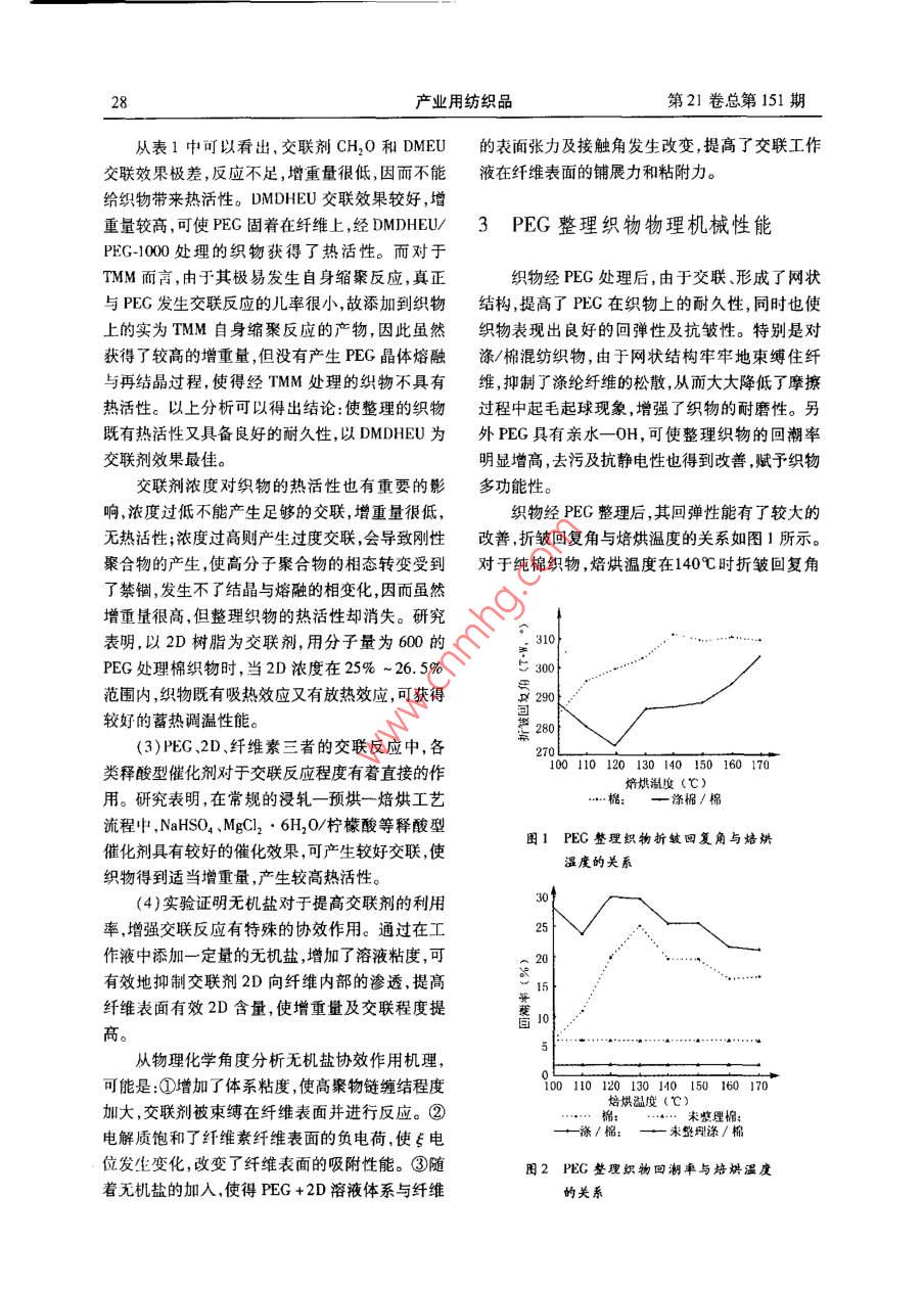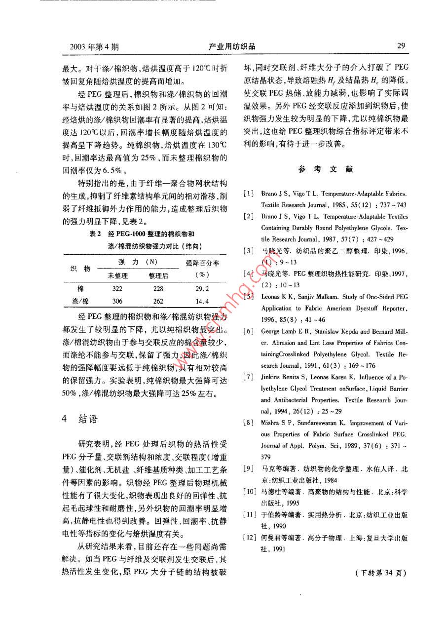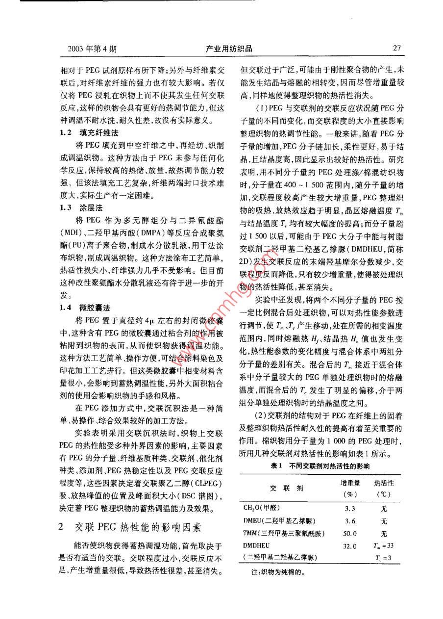 26產(chǎn)業(yè)用紡織品第21卷總第151期聚乙二醇在功能紡織品上的應(yīng)用馬曉光(天津工業(yè)大學(xué)材料化工學(xué)院,天津,300160摘要:本文將相變材料聚乙二醇(PEG)以交聯(lián)方式添加到織物上,并對整理織物的蓄熱調(diào)溫性能進(jìn)行了探討。闡述了影響整理織物熱活性的主要因素、整理織物的物理機(jī)械性能對整理織物的綜合性能給予了客觀評價(jià)關(guān)鍵詞:相變材料,聚乙二醇,蓄熱調(diào)溫,熱活性,交聯(lián)中圖分類號(hào)TS195.591.4文獻(xiàn)標(biāo)識(shí)碼:A文章編號(hào):1004-7093(2003)04-0026-04的紡織材料都不同程度地獲得了熱活性。另外若0引言采用交聯(lián)方式將PEG添加到紡織材料上,除了能賦予紡織材料特殊的蓄熱調(diào)溫功能外,也使紡織在對聚乙二醇(PEG)進(jìn)行冷熱循環(huán)處理時(shí),材料的其他性能有所改善,得到改善的性能包括:其超分子結(jié)構(gòu)會(huì)發(fā)生某種相的轉(zhuǎn)變,從而改變宏抗菌活性、回彈性、與含潮有關(guān)的性能;耐磨性、抗觀性質(zhì)而具有特殊的蓄熱調(diào)溫性能。這種蓄熱調(diào)起毛起球性抗靜電性及易去污性能等等。但在溫性能突出表現(xiàn)在高溫時(shí)吸收熱能、儲(chǔ)存能量,環(huán)上述性能改善的同時(shí),這種方式卻使織物的強(qiáng)力境溫度降低時(shí)釋放能量,將熱量放出。由于PEG呈不同程度的下降。發(fā)生相轉(zhuǎn)變的溫度在自然環(huán)境溫度變化范圍之本文研究采用交聯(lián)沉積法將PEG添加到紡內(nèi),國外學(xué)者最初將PEG應(yīng)用于太陽能吸收裝置織材料上使PEG與交聯(lián)劑、纖維素纖維發(fā)生交吸收、儲(chǔ)存太陽能,獲得了較好的效果。研究發(fā)聯(lián),形成纖維一聚合物線性或網(wǎng)狀粘接模式,沉現(xiàn),PEG除了具有較好的熱活性和低溫相變性積固著在棉或滌/棉混紡材料上并對其蓄熱調(diào)外,還可與紡織纖維發(fā)生物理或化學(xué)的結(jié)合,有被溫性能進(jìn)行討論。添加到紡織品上的可能,進(jìn)而又繼續(xù)拓寬研究領(lǐng)域,將其應(yīng)用在紡織材料上,賦予紡織品特殊的溫1PE添加到紡織材料上的方式度調(diào)節(jié)功能。以PEG作為相變材料添加到紡織材料上可目前將PE添加到紡織材料上的方式基本以使織物具有雙向調(diào)溫的特殊功能,這一發(fā)現(xiàn)引上有四種。起了國際紡織界和染整同行們的高度重視。研究1.1交聯(lián)沉積法證明:根據(jù)不同的機(jī)理PEG可以通過多種途徑添PEG在交聯(lián)劑的存在下,可與交聯(lián)劑、纖維加到棉、滌/棉及羊毛等多種紡織材料上,使不同素纖維發(fā)生交聯(lián)反應(yīng),形成纖維一聚合物線性或網(wǎng)狀粘接模式,沉積、固著在纖維上。這種方法具天津市21世紀(jì)金項(xiàng)日(963702411)有工藝簡單、流程短、操作方便、成本低等特點(diǎn),有收稿日期:2002-11-25較高的開發(fā)價(jià)值。但由于交聯(lián)PEG( CLPEG)結(jié)作者簡介:馬曉光男,1962年生,副教授。主要從事高分子晶度降低,屬單分子層附著,交聯(lián)后織物的重量增材料及功能紡織品的研究。加(增重量)小,使織物上交聯(lián)PEG的熱調(diào)節(jié)能力2003年第4期產(chǎn)業(yè)用紡織品27相對于PEG試劑原樣有所下降;另外與纖維素交但交聯(lián)過于廣泛,可能由于剛性聚合物的產(chǎn)生,未聯(lián)后,對纖維素纖維的強(qiáng)力也有較大影響。若僅能發(fā)生結(jié)晶與熔融的相轉(zhuǎn)變,因而盡管增重量較僅將PEG浸軋?jiān)诳椢锷隙皇蛊浒l(fā)生任何交聯(lián)高,同樣地使得整理織物的熱活性消失。反應(yīng),這樣的織物會(huì)具有更好的熱調(diào)節(jié)能力,但這(1)PEG與交聯(lián)劑的交聯(lián)反應(yīng)狀況隨PEG分種調(diào)溫不耐水洗,耐久性差,故沒有實(shí)際意義子量的不同而變化,而交聯(lián)程度的大小直接影響1.2填充纖維法整理織物的熱調(diào)節(jié)性能。一般來講,隨著PEG分將PEG填充到中空纖維之中,再經(jīng)紡、織制子量的增加,PEG分子鏈加長柔性更好,易于結(jié)成調(diào)溫織物。這種方法由于PEG未參與任何化晶,且結(jié)晶度高因此顯示出較好的熱活性。研究學(xué)反應(yīng),保持較高的熱儲(chǔ)、放量,故熱調(diào)節(jié)能力較表明,用不同分子量的PEG處理滌/棉混紡織物強(qiáng),但該法填充工藝復(fù)雜,纖維兩端封口技術(shù)難時(shí),分子量在400~1500范圍內(nèi),隨分子量的增度大,實(shí)際生產(chǎn)有一定困難。加,交聯(lián)程度較高產(chǎn)生較大增重量,PEG整理織1.3涂層法物的吸熱、放熱效應(yīng)趨于明顯,晶區(qū)熔融溫度T將PEG作為多元醇組分與二異氰酸酯與結(jié)晶溫度均有較大幅度的提高;而分子量超(MDI)、二羥甲基丙酸(DMPA)等反應(yīng)合成聚氨過1500以后,可能由于PEG大分子中能與樹脂酯(PU)離子聚合物,制成水分散乳液,用干法涂交聯(lián)劑二羥甲基二羥基乙撐脲(DMDHEU,簡稱布織物,制成調(diào)溫織物。這種方法涂布工藝簡單,2D)發(fā)生交聯(lián)反應(yīng)的末端羥基摩爾分?jǐn)?shù)減少,交熱活性損失小,纖維強(qiáng)力幾乎不受影響。但目前聯(lián)程度反而降低,只有較少增重量,使得被處理織這種改性聚氨酯水分散乳液還有待于進(jìn)一步的開物的熱活性降低,甚至消失。發(fā)。實(shí)驗(yàn)中還發(fā)現(xiàn),將兩個(gè)不同分子量的PEG按1.4微膠囊