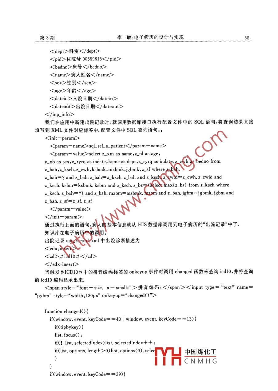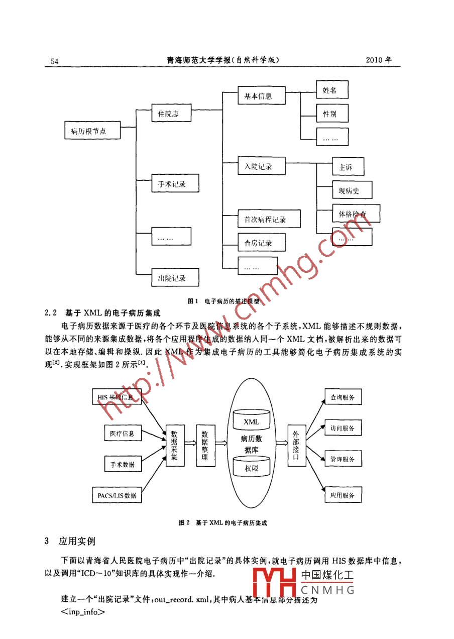 2010年青海師范大學(xué)學(xué)報(bào)(自然科學(xué)版)2010第3期Journal of Qinghai Normal University( Natural Science)No. 3電子病歷的設(shè)計(jì)與實(shí)現(xiàn)李敏(青海省人民醫(yī)院信息管理處,青海西寧810007)摘妻:本文從電子病歷的概念出發(fā).提出了基于XML的電子病歷的設(shè)計(jì)思想和電子病歷的技術(shù)實(shí)現(xiàn),以及相應(yīng)的數(shù)據(jù)模型結(jié)構(gòu).數(shù)據(jù)集成.并以青海省人民醫(yī)院電子病歷實(shí)例加以說(shuō)明.關(guān)鍵詞:電子病歷;XML:數(shù)據(jù)描述模型;數(shù)據(jù)集成中團(tuán)分類號(hào):TP270文獻(xiàn)標(biāo)識(shí)碼:A文章編號(hào):1001-754212010)03 - 0053 -04隨著醫(yī)院信息化建設(shè)的進(jìn)行,電子病歷(electronicmedicalrecord,EMR)作為臨床醫(yī)療信息基礎(chǔ)已成為實(shí)現(xiàn)數(shù)字化醫(yī)院建設(shè)的核心。1電子病歷的概念電子病歷(electronic medical record, EMR)是采用計(jì)算機(jī)手段采集、加工、存儲(chǔ).傳輸和服務(wù)的數(shù)字化醫(yī)療記錄,反映患者整個(gè)醫(yī)療過(guò)程,儲(chǔ)存了患者全部醫(yī)療信息.包括紙張病歷的醫(yī)囑病程記錄、各種檢查結(jié)果、影像資料、手術(shù)、護(hù)理信息等.電子病歷可以根據(jù)自身掌握的信息和知識(shí),主動(dòng)進(jìn)行統(tǒng)計(jì)、分析,為臨床醫(yī)療、科研、教學(xué)和管理決策提供重要依據(jù).它既是整個(gè)醫(yī)院數(shù)字化建設(shè)的基礎(chǔ)架構(gòu),又是提升醫(yī)院信息化管理水平的核心。2電子病歷的技 術(shù)實(shí)現(xiàn)2.1電子病歷 描述模型病歷的描述模型是電子病歷的基礎(chǔ)問(wèn)題.電子病歷數(shù)據(jù)是-種半結(jié)構(gòu)化數(shù)據(jù),其中病人基本信息、診斷.檢查檢驗(yàn)項(xiàng)目等是結(jié)構(gòu)化的,而醫(yī)生對(duì)病人的診斷意見(jiàn)、病程的記錄等又是非結(jié)構(gòu)化的.如何在電子病歷系統(tǒng)中對(duì)其進(jìn)行統(tǒng)-的處理,是十分困難的.XML(extensible markup language)的出現(xiàn)為病歷內(nèi)容的結(jié)構(gòu)化描述、存儲(chǔ)提供了有效的手段.其優(yōu)勢(shì)在于:它不僅是一種標(biāo)識(shí)語(yǔ)言,更是一-種可以定義描述對(duì)象結(jié)構(gòu)的元語(yǔ)言它采用層次化的面向?qū)ο蟮慕Y(jié)構(gòu)化描述方法. XML本身是一種獨(dú)特的半結(jié)構(gòu)化數(shù)據(jù)類型,具有自描述性和可擴(kuò)展性,非常適合描述病歷這種多元化的信息內(nèi)容.可將內(nèi)容和樣式關(guān)聯(lián)在-起,保留病歷的內(nèi)容和外觀. XML作為電子商務(wù)時(shí)代的標(biāo)準(zhǔn)語(yǔ)言,擁有大量的開(kāi)發(fā)和應(yīng)用工具來(lái)進(jìn)行數(shù)據(jù)的處理、轉(zhuǎn)換和傳輸.ORACLE8.0以上.DB2 7.0以上.SQLserver 2000等,都直接支持XML文檔到數(shù)據(jù)庫(kù)的雙向讀寫(xiě).此外,XML文檔無(wú)須任何更改可直接移植到其他平臺(tái)上.以基于XML的諸多特點(diǎn)和電子病歷的特殊性,我院在進(jìn)行電子病歷系統(tǒng)架構(gòu)時(shí),利用XML結(jié)構(gòu)化描述電子病歷內(nèi)容,設(shè)計(jì)各個(gè)控件之間的邏輯關(guān)系.把一一個(gè)病人作為一個(gè)根節(jié)點(diǎn),該病人的醫(yī)療信息以這個(gè)根節(jié)點(diǎn)為基準(zhǔn),依據(jù)邏輯關(guān)系展開(kāi),形成樹(shù)型結(jié)構(gòu),如圖1.中國(guó)煤化工MHCNMHG收稿日期:2010-05-12作者簡(jiǎn)介:李敏(1971-).女(漢族), 青海西寧人,青海省人民醫(yī)院工程師._54青海師范大學(xué)學(xué)報(bào)(自然科學(xué)版)2010年姓名基本信息住院志性別病歷根節(jié)點(diǎn)入院記錄主訴手術(shù)記錄現(xiàn)病史體格檢查首次病程記錄... ++..中. +.我房記錄出院記錄圖1電子病歷的描述模型2.2基于XML的電子病歷集成.電子病歷數(shù)據(jù)來(lái)源于醫(yī)療的各個(gè)環(huán)節(jié)及醫(yī)院信息系統(tǒng)的各個(gè)子系統(tǒng),XML能夠描述不規(guī)則數(shù)據(jù),能夠從不同的來(lái)源集成數(shù)據(jù),將各個(gè)應(yīng)用程序生成的數(shù)據(jù)納人同一個(gè)XML文檔,被解析出來(lái)的數(shù)據(jù)可以在本地存儲(chǔ)、編輯和操縱.因此XML作為集成電子病歷的工具能夠簡(jiǎn)化電子病歷集成系統(tǒng)的實(shí)現(xiàn)(*].實(shí)現(xiàn)框架如圖2所示印.HIS 精礎(chǔ)信息查詢服務(wù)XML訪問(wèn)服務(wù)醫(yī)療信息病歷數(shù)菜電據(jù)庫(kù)管理服務(wù)手術(shù)數(shù)據(jù)權(quán)限PACS/LIS數(shù)據(jù)應(yīng)用服務(wù)圖2基于XML的電子病歷集成3應(yīng)用實(shí)例下面以青海省人民醫(yī)院電子病歷中“出院記錄”的具體實(shí)例,就電子病歷調(diào)用HIS數(shù)據(jù)庫(kù)中信息,以及調(diào)用“ICD~10”知識(shí)庫(kù)的具體實(shí)現(xiàn)作--介紹.中國(guó)煤化工MHCNMH G建立一個(gè)“出院記錄”文件:out_ record. xml,其中病人基本信息部分描還為<