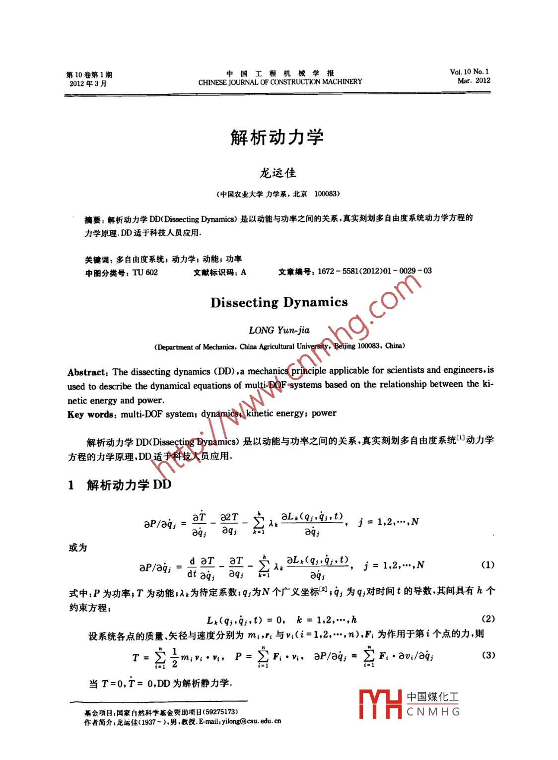 第10卷第1期Vol 10 No. 12012年3月CHINESE JOURNAL OF CONSTRUCTION MACHINERYMar.2012解析動力學(xué)龍運(yùn)佳(中國農(nóng)業(yè)大學(xué)力學(xué)系,北京100083)摘要:解析動力學(xué)DD( Dissecting Dynamics)是以動能與功率之間的關(guān)系,真實(shí)刻劃多自由度系統(tǒng)動力學(xué)方程的力學(xué)原理DD適于科技人員應(yīng)用關(guān)鍵詞;多自由度系統(tǒng);動力學(xué);動能;功率中圖分類號:TU602文獻(xiàn)標(biāo)識碼:A文章編號:1672-5581(2012)01-0029-03ting dynamicsLONG Yun jia(Department of Mechanics, China Agricultural University, Beijing 100083, China)Abstract: The dissecting dynamics(DD), a mechanics principle applicable for scientists and engineers, isused to describe the dynamical equations of multi DOF systems based on the relationship between the ki-netic energy and power.Key words: multi-DOF system; dynamics; kinetic energy; power解析動力學(xué) DD(Dissecting Dynamics)是以動能與功率之間的關(guān)系,真實(shí)刻劃多自由度系統(tǒng)動力學(xué)方程的力學(xué)原理,DD適于科技人員應(yīng)用1解析動力學(xué)DDat a2Talk caP/aqj=1,2,…,Naga或?yàn)閐 ataTaPj=1,2,…,N式中:P為功率;T為動能;Ak為待定系數(shù);q為N個(gè)廣義坐標(biāo)2;g為q對時(shí)間t的導(dǎo)數(shù)其間具有h個(gè)約束方程:Lk(qi, qi,t)設(shè)系統(tǒng)各點(diǎn)的質(zhì)量矢徑與速度分別為m;r:與v(i=1,2,…,n),F為作用于第讠個(gè)點(diǎn)的力,則PF;·av;/a當(dāng)T=0,T=0,DD為解析靜力學(xué)中國煤化工基金項(xiàng)目:國家自然科學(xué)基金資助項(xiàng)目(59275173CNMH作者簡介:龍運(yùn)佳(1937-),男,教授 E-mail, yilong@cau.cdu第10卷2證明P/aqam iviFTaqaT習(xí)m(點(diǎn))既-aaqT aTmv;·v(4)aq i aqj亦可証aviF;·d avaqdtm…”一m(點(diǎn)小可md atd at am;("·v)=a9TaTdt將式(2)乘以λk后對q;取偏導(dǎo)數(shù)得aL(q:q,B)=0,k=1,2,…,16=1,…,w累加式(6)得aLk(qi,qi,t)DD得證3應(yīng)用如圖1所示,地震Asin(ot)中(A為振幅),在坡度為a冰坡上熄火的工程車輛AB,其質(zhì)量與轉(zhuǎn)動慣量分別為m和J求車輛的運(yùn)動仿真微分方程.設(shè)q1,q2,q3為廣義坐標(biāo),因?yàn)閝2=tan(q3)q1,g2cos(q3)-圖1地震中冰坡上熄火的工程車輛qsin(q3)=0,所以Fig 1 Tlm ofif construction vehidlesliding on ice slop in earthquakeL= g2 CoS(q3)-g1sin (g3因?yàn)镻=-mg[Aos(ot)+q2sina],T m[(91)2+[92+ Awcs(at)sin aF+[Acos(at)os a]]+aJ(93)2將TP,L代人DD時(shí),aP/oq;可用代替但不對其中F取偏導(dǎo)數(shù)則得中國煤化工mq1+λsinq3=0CNMHG(9)mq2- a Cos 3 =-m[g Aw2sin(at)Jsin a(10)第1期龍運(yùn)佳解析動力學(xué)(11)車的運(yùn)動仿真微分方程組由式(8),(9),(10),(11)組成4結(jié)論解析動力學(xué) DD(Dissecting dynamics)是以動能與功率之間的關(guān)系,刻劃多自由度系統(tǒng)動力學(xué)方程的力學(xué)原理路越分析力學(xué)的虛擬抽象,回歸解析力學(xué)(包括動力學(xué)與靜力學(xué))的真實(shí)自然DD適于科技人員應(yīng)用參考文獻(xiàn)[1]龍運(yùn)佳混沌振動壓路機(jī)的能耗效益分析[中國工程機(jī)械學(xué)報(bào)2008,6(1):111-17LONG Yunjia. Energy-consumption and efficacy analysis on chaotic vibration roller[J]. Chinese Journal of Construction Machinery2008,6(1):111-117[2]龍運(yùn)佳梁以德近代工程動力學(xué)—隨機(jī)混池[M北京:科學(xué)出版社,198LONG Yunjia, LIANG Yide. Modern engineering dynamics: randomr-chaoslM] Beijing: Science Press, 1998·下期部分文章摘要預(yù)報(bào)基于運(yùn)動學(xué)分析的挖掘機(jī)器人軌跡規(guī)劃新方法任志貴,陳進(jìn),賀康生,張波基于DH位移矩陣法、工作裝置的變量空間模型和三角函數(shù)關(guān)系對液壓挖掘機(jī)工作裝置的運(yùn)動學(xué)模型進(jìn)行了深入的分析研究,推導(dǎo)出各變量空間相互轉(zhuǎn)換的通用表達(dá)式對傳統(tǒng)的挖掘機(jī)器人軌跡規(guī)劃方法進(jìn)行分析,研究液壓挖掘機(jī)實(shí)際作業(yè)的特點(diǎn)和需要,提出了模糊速度的概念進(jìn)一步提出一種基于控制信號實(shí)時(shí)生成的挖掘機(jī)器人軌跡規(guī)劃的模糊速度法該方法完全避免了傳統(tǒng)方法中未知的負(fù)載和預(yù)定的運(yùn)動速度之間的矛盾.從根本上保證工作裝置能夠以合適的速度精確地跟蹤預(yù)定軌跡中國煤化工CNMHG