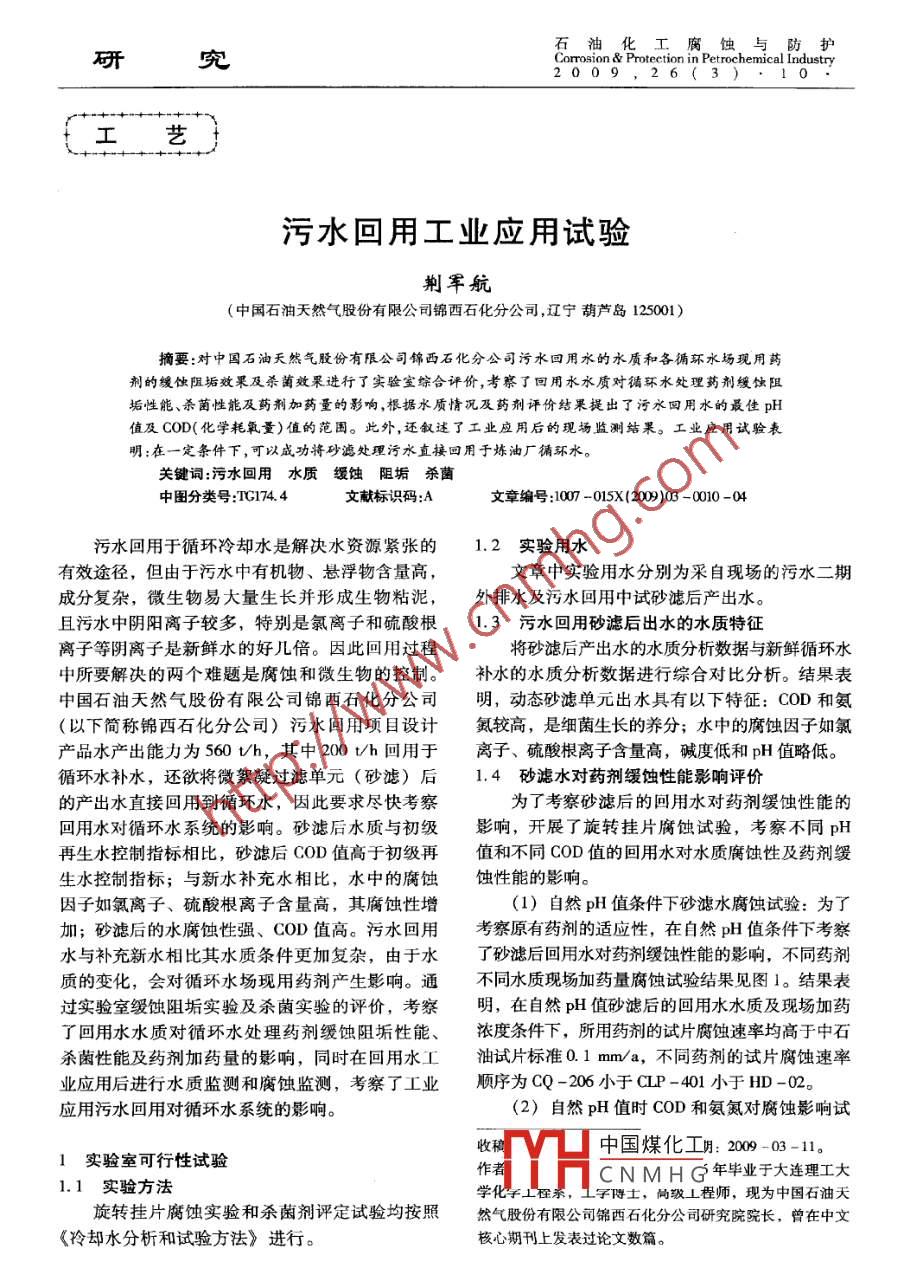 石油。化工腐蝕,與防、護(hù)研究Corrosion & Protection in Petrochemical Industry2009,26(3).10.污水回用工業(yè)應(yīng)用試驗(yàn)荊軍航(中國石油天然氣股份有限公司錦西石化分公司,遼寧葫蘆島125001 )摘要:對中國石油天然氣股份有限公司錦西石化分公司污水回用水的水質(zhì)和各循環(huán)水場現(xiàn)用藥劑的緩蝕阻垢效果及殺菌效果進(jìn)行了實(shí)驗(yàn)室綜合評價(jià),考察了回用水水質(zhì)對循環(huán)水處理藥劑緩蝕阻垢性能、殺菌性能及藥劑加藥量的影響,根據(jù)水質(zhì)情況及藥劑評價(jià)結(jié)果提出了污水回用水的最佳pH值及C0D(化學(xué)耗氧量)值的范圍。此外,還敘述了工業(yè)應(yīng)用后的現(xiàn)場監(jiān)測結(jié)果。工業(yè)應(yīng)用試驗(yàn)表明:在一定條件下,可以成功將砂濾處理污水直接回用于煉油廠循彌水。關(guān)鍵詞:污水回用水質(zhì)緩蝕阻垢殺菌中圖分類號:TC174.4文獻(xiàn)標(biāo)識碼:A文章編號:1007 -015(2009)03 -0010 -04污水回用于循環(huán)冷卻水是解決水資源緊張的1.2實(shí)驗(yàn)用水有效途徑,但由于污水中有機(jī)物、懸浮物含量高,文章中實(shí)驗(yàn)用水分別為采自現(xiàn)場的污水二期成分復(fù)雜,微生物易大量生長并形成生物粘泥,外排水,及污水回用中試砂濾后產(chǎn)出水。且污水中陰陽離子較多,特別是氯離子和硫酸根1.3 污水 回用砂濾后出水的水質(zhì)特征離子等陰離子是新鮮水的好幾倍。因此回用過程將砂濾后產(chǎn)出水的水質(zhì)分析數(shù)據(jù)與新鮮循環(huán)水中所要解決的兩個(gè)難題是腐蝕和微生物的控制。補(bǔ)水的水質(zhì)分析數(shù)據(jù)進(jìn)行綜合對比分析。結(jié)果表中國石油天然氣股份有限公司錦西石化分公司明,動態(tài)砂濾單元出水具有以下特征: COD和氨(以下簡稱錦西石化分公司)污水回用項(xiàng)目設(shè)計(jì)氮較高, 是細(xì)菌生長的養(yǎng)分;水中的腐蝕因子如氯產(chǎn)品水產(chǎn)出能力為560 Vh,其中200 t/h回用于離子、硫酸根離子含量高,堿度低和pH值略低。循環(huán)水補(bǔ)水,還欲將微絮凝過濾單元(砂濾)后1.4砂濾水對藥劑緩蝕性能影響評 價(jià)的產(chǎn)出水直接回用到循環(huán)水,因此要求盡快考察為了考察砂濾后的回用水對藥劑緩蝕性能的回用水對循環(huán)水系統(tǒng)的影響。砂濾后水質(zhì)與初級影響,開展了旋轉(zhuǎn)掛片腐蝕試驗(yàn),考察不同pH再生水控制指標(biāo)相比,砂濾后C0D值高于初級再值和不同COD值的回用水對水質(zhì)腐蝕性及藥劑緩生水控制指標(biāo);與新水補(bǔ)充水相比,水中的腐蝕蝕性能的影響。因子如氯離子、硫酸根離子含量高,其腐蝕性增(1)自然pH值條件下砂濾水腐蝕試驗(yàn):為了加;砂濾后的水腐蝕性強(qiáng)、COD值高。污水回用考察原有藥劑的適應(yīng)性,在自然pH值條件下考察水與補(bǔ)充新水相比其水質(zhì)條件更加復(fù)雜,由于水了砂濾后回用水對藥劑緩蝕性能的影響,不同藥劑質(zhì)的變化,會對循環(huán)水場現(xiàn)用藥劑產(chǎn)生影響。通不同水質(zhì)現(xiàn)場加藥量腐蝕試驗(yàn)結(jié)果見圖1。結(jié)果表過實(shí)驗(yàn)室緩蝕阻垢實(shí)驗(yàn)及殺菌實(shí)驗(yàn)的評價(jià),考察明,在自然pH值砂濾后的回用水水質(zhì)及現(xiàn)場加藥了回用水水質(zhì)對循環(huán)水處理藥劑緩蝕阻垢性能、濃度條件下,所用藥劑的試片腐蝕速率均高于中石殺菌性能及藥劑加藥量的影響,同時(shí)在回用水工油試片標(biāo)準(zhǔn)0. 1 mm/a, 不同藥劑的試片腐蝕速率業(yè)應(yīng)用后進(jìn)行水質(zhì)監(jiān)測和腐蝕監(jiān)測,考察了工業(yè)順序?yàn)镃Q -206小于CLP -401小于HD -02。應(yīng)用污水回用對循環(huán)水系統(tǒng)的影響。(2)自然pH值時(shí)COD和氨氮對腐蝕影響試收稿中國煤化工明: 2009 - 03 -11。1實(shí)驗(yàn) 室可行性試驗(yàn)作者M(jìn)HCNMH G年畢業(yè)于大連理工大.1 實(shí)驗(yàn)方法學(xué)化學(xué)上程系,⊥字傅士,尚級上程師,現(xiàn)為中國石油天旋轉(zhuǎn)掛片腐蝕實(shí)驗(yàn)和殺菌劑評定試驗(yàn)均按照然氣股份有限公司錦西石化分公司研究院院長,曾在中文《冷卻水分析和試驗(yàn)方法》進(jìn)行。核心期刊上發(fā)表過論文數(shù)篇。第3期荊軍航.污水回用工業(yè)應(yīng)用試驗(yàn)11●驗(yàn):為了考察在自然pH值條件下,現(xiàn)用藥劑對下,緩蝕阻垢劑CQ - 206在加藥量為100 μg/g時(shí),COD和氨氮值的適應(yīng)范圍,以污水二期人水為原回用水的pH值為7.3 ~9.0,試片腐蝕速率小于水配制成不同COD和氨氮值的實(shí)驗(yàn)用水,在緩蝕0.1 mm/a, 當(dāng)pH值為8. 0時(shí),藥劑緩蝕效果最好,阻垢劑CQ-206加藥量為100μg/g時(shí)進(jìn)行了旋轉(zhuǎn).當(dāng)pH值小于6.5時(shí),試片腐蝕很嚴(yán)重。掛片腐蝕試驗(yàn),試驗(yàn)結(jié)果見圖2。(4)加堿調(diào)pH值時(shí)砂濾水腐蝕性能考察:試驗(yàn)考察了加堿調(diào)pH值條件下砂濾后回用水對藥劑緩蝕性能的影響,結(jié)果見圖4,5。結(jié)果表明:在自1.0使用現(xiàn)場加藥量條件下,只有緩蝕阻垢劑CQ - 2060.8-沙越后回用水在加藥量為100μg/g時(shí),試片腐蝕率明顯小于0.110.4新水補(bǔ)充水mm/a;當(dāng)加藥量均增加為100 μg/g時(shí),在適當(dāng)?shù)膒H值范圍內(nèi),藥劑HD -02和CLP -401的試片腐CLP-401CQ-206BHD-02 .蝕速率也可以小于0.1 mm/a。