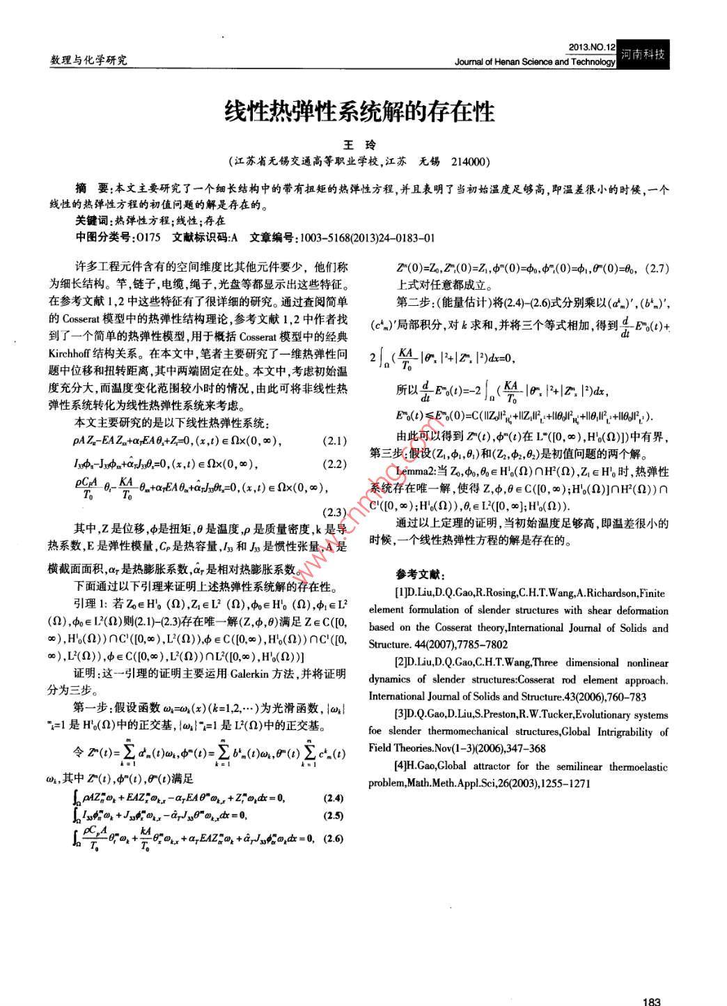 數(shù)理與化學(xué)研究Jourmal of Henan Science an河南科技線性熱彈性系統(tǒng)解的存在性王玲(江蘇省無錫交通高等職業(yè)學(xué)校,江蘇無錫214000摘要:本文主要研究了一個細(xì)長結(jié)構(gòu)中的帶有扭矩的熱彈性方程,并且表明了當(dāng)初始溫度足夠高,即溫差很小的時候,一個線性的熱彈性方程的初值問題的解是存在的。關(guān)鍵詞:熱彈性方程;線性;存在中圖分類號:0175文獻(xiàn)標(biāo)識碼A文章編號:1003-5168(201324-018301許多工程元件含有的空間維度比其他元件要少,他們稱z(0)=Z0,2(0)=21,d(0)=,4(0)=,(0)=6,(27)為細(xì)長結(jié)構(gòu)。竿鏈子,電纜,繩子,光盤等都顯示出這些特征。上式對任意都成立在參考文獻(xiàn)1,2中這些特征有了很詳細(xì)的研究。通過查閱簡單第二步:(能量估計)將(24)-(2.6)式分別乘以(an)’,(bn),的C模型中的熱彈性結(jié)構(gòu)理論,參考文獻(xiàn)12中作者找(c)y局部積分,對k求和并將三個等式相加,得到4Ea()+到了一個簡單的熱彈性模型,用于概括 Cosserat模型中的經(jīng)典Kirchhoff結(jié)構(gòu)關(guān)系。在本文中,筆者主要研究了一維熱彈性問2(44|.|+|2)d=0,題中位移和扭轉(zhuǎn)距離,其中兩端固定在處。本文中,考慮初始溫度充分大,而溫度變化范圍較小時的情況,由此可將非線性熱所以4E(=2(41+|2,彈性系統(tǒng)轉(zhuǎn)化為線性熱彈性系統(tǒng)來考慮。本文主要研究的是以下線性熱彈性系統(tǒng)ED)≤E0(0)=C(ZP元+ZB:+B+6B2+0R2)pAz-EAZ+aEA62+l=0,(x,1)∈Dx(0,∞),(21)由此可以得到z(t),φ"(t)在L“([0,∞),HQ)])中有界,xφ-Jn+αJ3=0,(x,)∈Ωx(0,∞),第三步:假設(shè)(乙1,中,)和(乙2,d,B2)是初值問題的兩個解。(22)mma2當(dāng)Z0,d,B∈H(9)∩H(Q),Z∈H時,熱彈性n-A0+8+0,(∈90.,系統(tǒng)存在唯一解,使得Z,中,0∈C(10,∞);Hb(9)∩HP(9))∩C(0,∞);HQ),2∈L:(0,∞];Hb)其中,Z是位移φ是扭矩,θ是溫度,p是質(zhì)量密度k是導(dǎo)通過以上定理的證明,當(dāng)初始溫度足夠高,即溫差很小的熱系數(shù)E是彈性模量C是熱容量l2和J是慣性張量,A是時候,一個線性熱彈性方程的解是存在的。橫截面面積,a7是熱膨脹系數(shù),ar是相對熱膨脹系數(shù)參考文獻(xiàn):下面通過以下引理來證明上述熱彈性系統(tǒng)解的存在性。[l]D. Liu, D Q Gao, R Rosing, C H T Wang, A. Richardson, Finite引理1:若z∈Hb(Ω),Z1∈L2(),d∈Ho(),中∈L2 lement formulation of slender structures with shear deformation(2),del2(9)則21)-(23)存在唯一解(Z,中,6)滿足ZeC(0, based on the Cosserat theory, International Jourmal of Solids and∞),H(9)nc(0,∞),L(9),∈C([0.∞),H(9))∩C([0, Structure.42007785-7802∞),L(9)),中∈C([0,∞),L(m)∩L(0∞),H(9)2 D Liu, D QGao, C. H.T. Wang, Three dimensional nonlinear證明:這一引理的證明主要運用 Galerkin方法,并將證明dynamics of slender structures: Cosserat rod element approach分為三步。International Joumal of Solids and Structure. 43(2006),760-783第一步:假設(shè)函數(shù)a=01(x)(k=12,…)為光滑函數(shù),aD QGao, D. Liu, S.Preston, R. W. Tucker, Evolutionary systems1是H(a)中的正交基,{a4}=1是L()中的正交基。foe slender thermomechanical structures, Global Intrigrability of令2()=∑d(l,d(x)=∑bn()l,r()∑c() ield Theories. nov(-30206347-3684 HGao, Globaltor for the semilinear thermoelastic0,其中2(1),φ(t),O(t)滿足26(2003),1255-1271Lazo, +EAZ, o-a,EA00x, +Z; o d=0,(2. 4) problem. Math. Meth. apps4a+小4"叫,-a"嗎,=0(25)ax4g-++E24+每-.a6