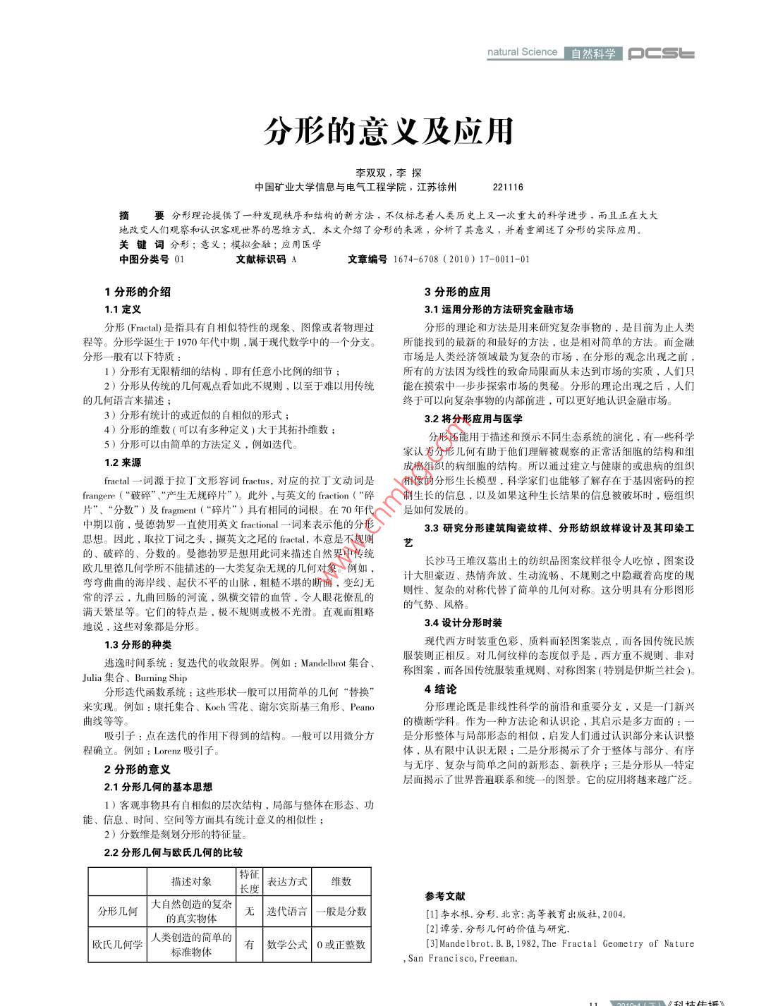 natural Science自然科學(xué)口cs分形的意義及應(yīng)用李雙雙,李探中國礦業(yè)大學(xué)信息與電氣工程學(xué)院,江蘇徐州221116摘要分形理論提供了一種發(fā)現(xiàn)秩序和結(jié)構(gòu)的新方法,不僅標(biāo)志著人類歷史上又一次重大的科學(xué)進(jìn)步,而且正在大大地改變?nèi)藗冇^察和認(rèn)識(shí)客觀世界的思維方式。本文介紹了分形的來源,分析了其意義,并著重闡述了分形的實(shí)際應(yīng)用關(guān)鍵詞分形;意義;模擬金融;應(yīng)用醫(yī)學(xué)中圖分類號(hào)01文獻(xiàn)標(biāo)識(shí)碼A文章編號(hào)1674-6708(2010)17-0011-011分形的介紹3分形的應(yīng)用1定3.1運(yùn)用分形的方法研究金融市場分形( Fractal)是指具有自相似特性的現(xiàn)象、圖像或者物理過分形的理論和方法是用來研究復(fù)雜事物的,是目前為止人類程等。分形學(xué)誕生于1970年代中期,屬于現(xiàn)代數(shù)學(xué)中的一個(gè)分支。所能找到的最新的和最好的方法,也是相對(duì)簡單的方法。而金融分形一般有以下特質(zhì)市場是人類經(jīng)濟(jì)領(lǐng)域最為復(fù)雜的市場,在分形的觀念出現(xiàn)之前,1)分形有無限精細(xì)的結(jié)構(gòu),即有任意小比例的細(xì)節(jié)所有的方法因?yàn)榫€性的致命局限而從未達(dá)到市場的實(shí)質(zhì),人們2)分形從傳統(tǒng)的幾何觀點(diǎn)看如此不規(guī)則,以至于難以用傳統(tǒng)能在摸索中一步步探索市場的奧秘。分形的理論出現(xiàn)之后,人們終于可以向復(fù)雜事物的內(nèi)部前進(jìn),可以更好地認(rèn)識(shí)金融市場)分形有統(tǒng)計(jì)的或近似的自相似的形式32將分形應(yīng)用與醫(yī)學(xué)4)分形的維數(shù)(可以有多種定義)大于其拓?fù)渚S數(shù);)分形可以由簡單的方法定義,例如迭代。分形還能用于描述和預(yù)示不同生態(tài)系統(tǒng)的演化,有一些科學(xué)家認(rèn)為分形幾何有助于他們理解被觀察的正?;罴?xì)胞的結(jié)構(gòu)和組12來源成癌組織的病細(xì)胞的結(jié)構(gòu)。所以通過建立與健康的或患病的組織fractal一詞源于拉丁文形容詞 fractus,對(duì)應(yīng)的拉丁文動(dòng)詞是相像的分形生長模型,科學(xué)家們也能夠了解存在于基因密碼的控rangers(“破碎”、“產(chǎn)生無規(guī)碎片”)。此外,與英文的 fraction(“碎制生長的信息,以及如果這種生長結(jié)果的信息被破壞時(shí),癌組織片”、“分?jǐn)?shù)”)及 fragment(“碎片”)具有相同的詞根。在70年代是如何發(fā)展的。中期以前,曼德勃羅一直使用英文 fractional一詞來表示他的分形3.3研究分形建筑陶瓷紋樣、分形紡織紋樣設(shè)計(jì)及其印染工思想。因此,取拉丁詞之頭,擷英文之尾的 fractal,本意是不規(guī)則藝的、破碎的、分?jǐn)?shù)的。曼德勃羅是想用此詞來描述自然界中傳統(tǒng)長沙馬王堆漢墓出土的紡織品圖案紋樣很令人吃驚,圖案設(shè)彎彎曲的海岸線、起伏不平的山脈,粗糙不堪的斷面,變幻無計(jì)大膽豪邁、熱情奔放、,生動(dòng)流暢,不規(guī)則之中隱藏著高度的規(guī)的浮云,九曲回腸的河流,縱橫交錯(cuò)的血管,令人眼花僚亂的則性、復(fù)雜的對(duì)稱代替了簡單的幾何對(duì)稱。這分明具有分形圖形滿天繁星等。它們的特點(diǎn)是,極不規(guī)則或極不光滑。直觀而粗略的氣勢、風(fēng)格地說,這些對(duì)象都是分形。34設(shè)計(jì)分形時(shí)裝1.3分形的種類現(xiàn)代西方時(shí)裝重色彩、質(zhì)料而輕圖案裝點(diǎn),而各國傳統(tǒng)民族服裝則正相反。對(duì)幾何紋樣的態(tài)度似乎是,西方重不規(guī)則、非對(duì)逃逸時(shí)間系統(tǒng):復(fù)迭代的收斂限界。例如: Mandelbrot集合、稱圖案,而各國傳統(tǒng)服裝重規(guī)則、對(duì)稱圖案(特別是伊斯蘭社會(huì))Julia集合、 Burning Ship分形迭代函數(shù)系統(tǒng):這些形狀一般可以用簡單的幾何“替換”4結(jié)論來實(shí)現(xiàn)。例如:康托集合、Koch雪花、謝爾賓斯基三角形、 Peano分形理論既是非線性科學(xué)的前沿和重要分支,又是一門新興曲線等等的橫斷學(xué)科。作為一種方法論和認(rèn)識(shí)論,其啟示是多方面的確數(shù)引子:點(diǎn)在迭代的作用下得到的結(jié)構(gòu)。一般可以用微分方是分形整體與局部形態(tài)的相似,啟發(fā)人們通過認(rèn)識(shí)部分來認(rèn)識(shí)整應(yīng)立。例如: Lorenz吸引子。體,從有限中認(rèn)識(shí)無限;二是分形揭示了介于整體與部分、有序2分形的意義與無序、復(fù)雜與簡單之間的新形態(tài)、新秩序;三是分形從一特定21分形幾何的基本思想層面揭示了世界普遍聯(lián)系和統(tǒng)一的圖景。它的應(yīng)用將越來越廣泛。1)客觀事物具有自相似的層次結(jié)構(gòu),局部與整體在形態(tài)、功能、信息、時(shí)間、空間等方面具有統(tǒng)計(jì)意義的相似性2)分?jǐn)?shù)維是刻劃分形的特征量。22分形幾何與歐氏幾何的比較描述對(duì)象特征表達(dá)方式維數(shù)分形幾何大自然創(chuàng)造的復(fù)雜參考文獻(xiàn)的真實(shí)物體無|迭代語言一般是分?jǐn)?shù)]李水根.分形.北京:高等教育出版社,2004人類創(chuàng)造的簡單的2]譚芳.分形幾何的價(jià)值與研究歐氏幾向子標(biāo)淮物體有數(shù)學(xué)公式0或正整數(shù)[3]Mandelbrot B B, 1982, The Fractal Geometry of NatureSan Fr