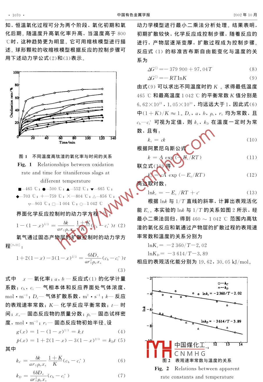 第12卷第5期中國有色金屬學(xué)報2002年10月oL. 12 No. 5The Chinese Journal of Nonferrous MetalsOct文章編號]1004-0609(2002)05-1069-05高鈦渣氧化過程的動力學(xué)張力,李光強(qiáng),隋智通(東北大學(xué)材料與冶金學(xué)院冶金與材料化學(xué)系,沈陽110006)[摘要]用熱重法研究了高鈦渣在空氣中的等溫和非等溫氧化動力學(xué)。實(shí)驗結(jié)果表明,高鈦渣氧化動力學(xué)可用縮核模型來描述。利用等溫動力茡模型公式確定等溫氧化初期為化茡反應(yīng)控制,后期為擴(kuò)散控制,計算得到相應(yīng)的表觀活化能分別為19.62,30.05kJ/mol;通過非等溫動力學(xué)模型公式確定高鈦渣的非等溫氧化階段Ⅰ為界面化學(xué)反應(yīng)控制,階段Ⅱ為界面化學(xué)反應(yīng)和擴(kuò)散綜合控制,階段Ⅲ為擴(kuò)散控制,并得到相應(yīng)的表觀活化能L關(guān)鍵詞]高鈦渣;氧化;動力學(xué);熱重分析[中圖分類號]X757[文獻(xiàn)標(biāo)識碼]A利用傳統(tǒng)的礦熱爐還原法制備的高鈦渣,含熱重曲線均由ZC1600高溫綜合測試儀測得%~75%的TiO2,品位低,不適合作硫酸法或氯感量為lmg。實(shí)驗在豎式MoSi2爐中進(jìn)行,控溫裝化法處理的原料。因此,提高鈦渣品位,勢在必置為SR-53可編程控溫儀,氧化氣氛為靜態(tài)空氣。行。高鈦渣凝渣中黑鈦石是主要含鈦物相,TiO2含在等溫實(shí)驗中,恒溫溫度分別為:465,500量高,是早期析晶產(chǎn)物,雖然渣中鈦組分可選擇性552,665,703,759,804,856,903,1004和1042℃,富集于黑鈦石相中,并析岀長大,但黑鈦石性脆,控溫精度為士1.6℃。在非等溫實(shí)驗中,溫度范圍硬度低,不適于物理分離,而金紅石相硬度高,比為350~1180C,升溫速度10℃/min。重大,有利于選礦分離]。基于“選擇性析出”的原對氧化后的淬冷試樣用Ⅹ射線粉末衍射分析理3ˉ,通過預(yù)氧化及添加劑等改性手段,使黑鈦確定物相組成,同時對原渣及氧化后試樣的全鐵、石中絕大部分TiO3在化學(xué)位梯度的驅(qū)動下,選擇二價鐵、金屬鐵和三價鈦的含量進(jìn)行化學(xué)分析性富集于金紅石相中,并析出與粗化,易于分離前期研究結(jié)果表明:預(yù)氧化使高鈦渣中的低價2結(jié)果與討論鈦氧化為高價鈦,黑鈦石轉(zhuǎn)化為金紅石,提高渣中TiO2活度,促進(jìn)析出反應(yīng)(TiO2)=TiO2(向右進(jìn)等溫氧化行,實(shí)現(xiàn)最大程度的富集。因此,研究渣中低價鈦氧化分?jǐn)?shù)用氧化率(氧化率=增量(g)/試樣完氧化的動力學(xué)規(guī)律以及加速其氧化的途徑,可為控全氧化時的理論最大增量(g)表示。高鈦渣是以黑制渣中鈦的分布及走向提供科學(xué)依據(jù)。有關(guān)高鈦渣鈦石(TiO3晶格)為基的固溶體,化學(xué)式如下:m氧化動力學(xué)的研究已有報道,但對鈦氧化物選[(Ti,Fe,Mg,Mn)O·2TiO]·n(Ti,AL,Cr2O擇性富集過程的動力學(xué)規(guī)律,尚未見到。作者采用TiO],其中高鈦渣中存在的少量鐵容易氧化成等溫和非等溫2種方法研究高鈦渣氧化過程的動力FO,FeO較難氧化成高價的,這是存在低價鈦的學(xué)規(guī)律,優(yōu)化渣中鈦選擇性富集的條件綠故。當(dāng)溫度高于700℃時,FeO才開始氧化,而渣中低價鈦含量較高(本研究所用渣樣Ti2O3占渣實(shí)驗質(zhì)量的19.28%),低價鈦的氧化反應(yīng)容易進(jìn)行8,因此在實(shí)驗溫度范圍內(nèi),氧化主要是是低價鈦的氧實(shí)驗用攀鋼高鈦渣的化學(xué)組成為(質(zhì)量分?jǐn)?shù),化反中國煤化工%):TiO251.0,MgO13.8,FeO13.1,CaO4.32,CNMHGSiO25.0,Al2O312.4金屬鐵0.3及其它0.08圖1所示為各等溫過程的熱重曲線。由圖1可①[基金項目留學(xué)歸國人員基金資助項目收稿日期]2001-11-12;[修訂日期]2002-04-08¥x上是卻](1969-),男,博士生研究中國有色金屬學(xué)報2002年10月知,恒溫氧化過程可分為兩個階段,氧化初期和氧動力學(xué)模型進(jìn)行最小二乘法分析處理。結(jié)果表明,化后期。隨溫度升高氧化率升高,當(dāng)溫度高于800初期擴(kuò)散較快,化學(xué)反應(yīng)成控制步驟.隨著反應(yīng)的℃時,這種趨勢更為明顯。它可用縮核模型進(jìn)行描進(jìn)行,產(chǎn)物層逐漸變厚,擴(kuò)散過程成為控制步驟述。球形顆粒的收縮核模型根據(jù)反應(yīng)的控制步驟反應(yīng)式(1)的標(biāo)準(zhǔn)吉布斯自由能變化與溫度的關(guān)用下述動力學(xué)公式(2)和(3)表示系為379900+97.04T△G=一 TINk由式(9)可以求出不同溫度時的K。求得最低溫度465℃和最高溫度1042℃的平衡常數(shù)K值分別是6.62×1021,1.05×1010,均遠(yuǎn)遠(yuǎn)大于1,因此式(6)中(1+K)/K≈1。D,a,b,,r均為常數(shù),且cb-c;‘可視為定值,則k,kυ在溫度一定時為常數(shù),且有46的1001140Time/min(10)根據(jù)阿累尼烏斯公式圖1不同溫度高鈦渣的氧化率與時間的關(guān)系k=Aexp(一E。/RT)(11)Fig. 1 Relationships between oxidation聯(lián)立式(10)得rate and time for titaniferous slags atkE/RT)(12)different temperature兩邊取對數(shù)465C;●500C;▲552C;v-665C(13)703C;+-759C;×-804C;△-856CE。/RT+c-903C;口-1004C;-1042C根據(jù)lnk與1/T直線的斜率,計算出表觀活化界面化學(xué)反應(yīng)控制時的動力學(xué)方程10能Ea。本實(shí)驗的Ink與1/T的關(guān)系如圖2所示,經(jīng)最小二乘法回歸,得到460~1042℃范圍內(nèi)高鈦砍1+Kare(cb-c)(2)渣的氧化反應(yīng)和氧通過產(chǎn)物層的擴(kuò)散過程的表觀速氧氣通過固態(tài)產(chǎn)物層的擴(kuò)散控制時的動力學(xué)方率常數(shù)和溫度的關(guān)系分別為程I