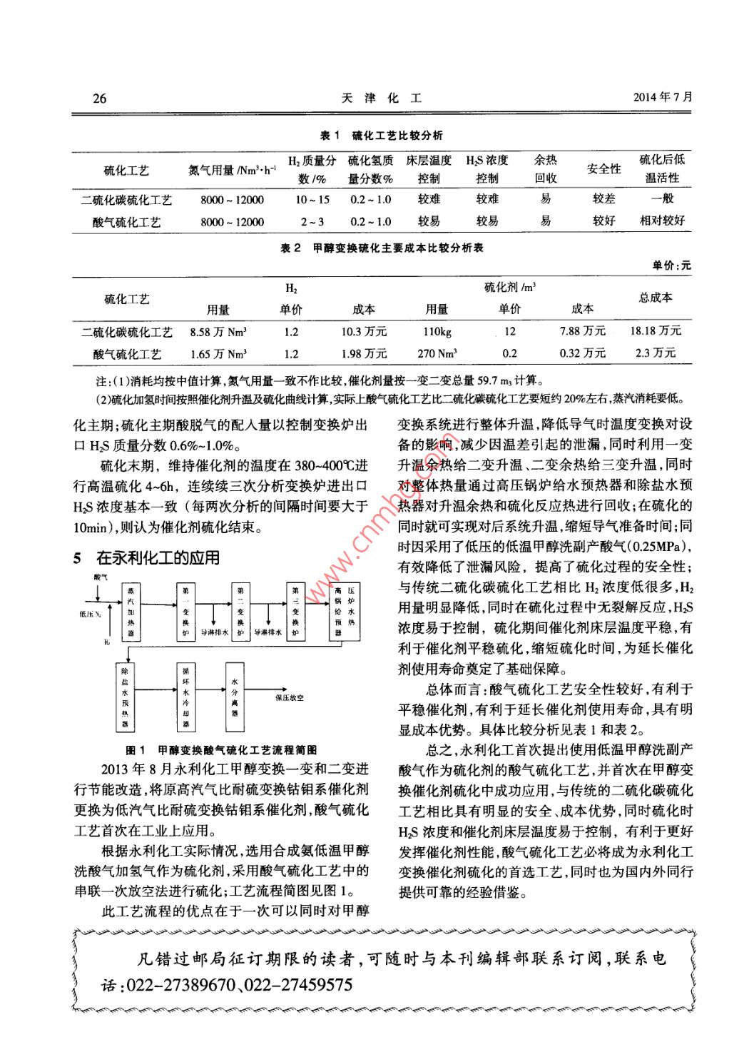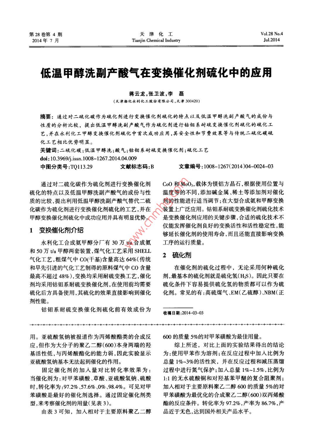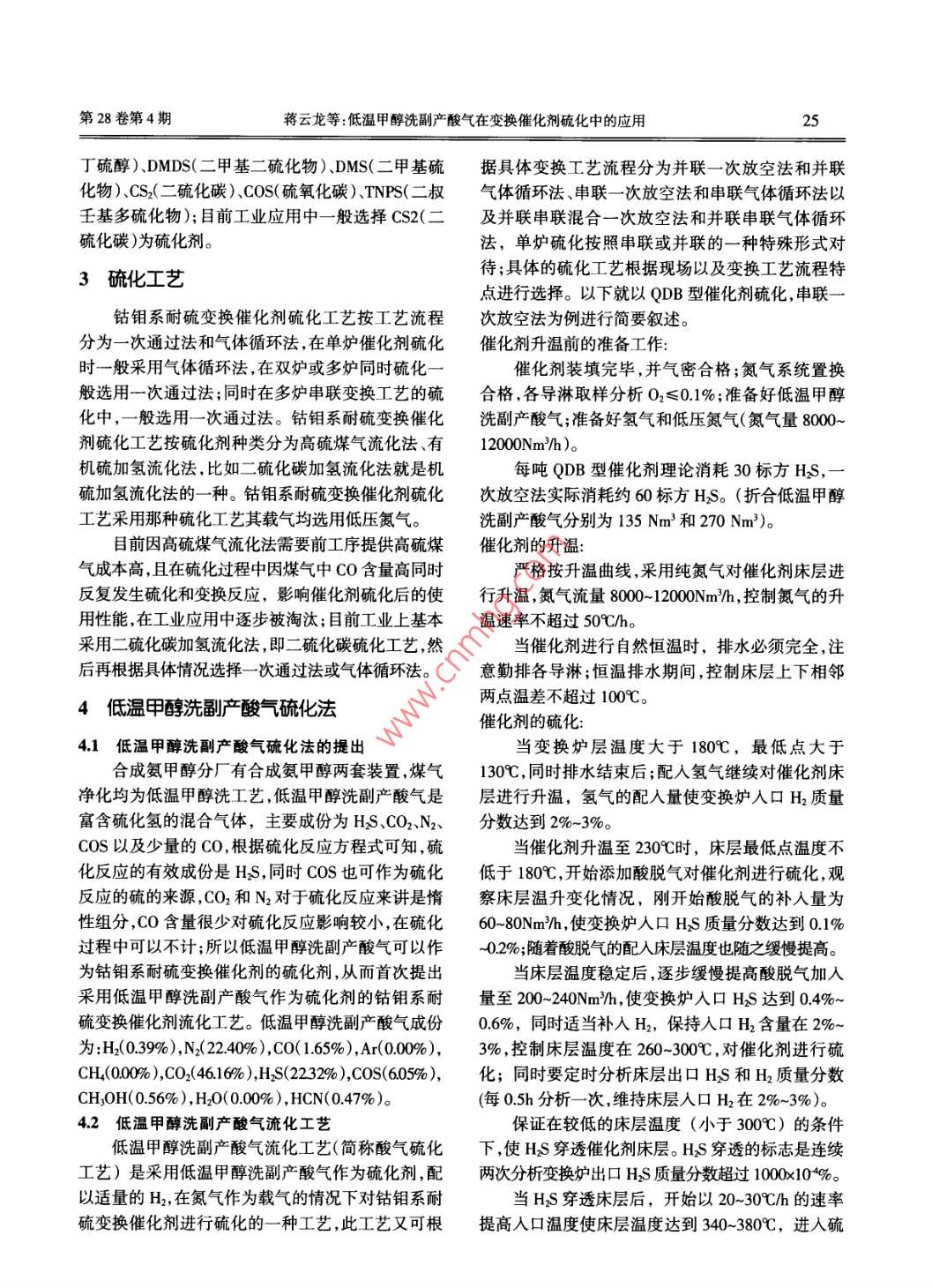 第28卷第4期天津化工Vol 28 No 42014年7月Tianjin Chemical IndustryJul. 2014低溫甲醇洗副產(chǎn)酸氣在變換催化劑硫化中的應(yīng)用蔣云龍,張衛(wèi)波,李磊(天津渤化永利化工股份有限公司,天津300420)摘要:通過對二硫化碳作為硫化劑進(jìn)行變換催化劑硫化的特點以及低溫甲醇洗副產(chǎn)酸氣的成份與性質(zhì)的分析比較,提出低溫甲醇洗副產(chǎn)酸氣作為硫化劑進(jìn)行鈷鉬系耐硫變換催化劑硫化的硫化工芑,并在永利化工甲醇變換催化劑硫化中首次成功應(yīng)用,其安全性和節(jié)費效果等與傳統(tǒng)二硫化碳硫化工藝相比優(yōu)勢明顯關(guān)鍵詞:二硫化碳;低溫甲醇洗;酸氣;鈷鉬系耐硫變換催化劑;硫化工藝doi:10.3969/isn.1008-1267.2014.04.009中圖分類號:TQ1.29文獻(xiàn)標(biāo)志碼:B文章編號:1008-1267(2014)04-0024-03通過對二硫化碳作為硫化劑進(jìn)行變換催化劑C0和MoO3,載體為鎂鋁方晶石,根據(jù)使用位置與硫化的特點以及低溫甲醇洗副產(chǎn)酸氣的成份與性溫度等的不同,添加堿金屬、稀土等添加劑對催化質(zhì)的比較,提出利用低溫甲醇洗副產(chǎn)酸氣替代二硫劑的性能進(jìn)行適當(dāng)調(diào)節(jié);在大型合成氨和甲醇變換化碳作為硫化劑進(jìn)行變換催化劑硫化的工藝,并在裝置上廣泛應(yīng)用。鈷鉬系耐硫變換催化劑硫化技術(shù)甲醇變換催化劑硫化中成功應(yīng)用并具有明顯優(yōu)勢。是變換催化劑應(yīng)用的關(guān)鍵步驟,合適的硫化技術(shù)不1變換催化劑介紹僅能發(fā)揮催化劑良好的變換活性和活性穩(wěn)定性,能夠延長催化劑的使用壽命,而且還能直接影響變換永利化工合成氨甲醇分廠有30萬ta合成氨工序的運行質(zhì)量。和50萬va甲醇兩套裝置,煤氣化工藝采用SHEL2硫化劑氣化工藝粗煤氣中CO(干基)含量高達(dá)64%(傳統(tǒng)2硫化劑和早先引進(jìn)的氣化工藝制得的原料煤氣中CO含量在催化劑的硫化過程中,無論采用何種硫化最高不超過48%),變換均采用耐硫變換工藝,催化劑,最基本的硫化劑就是硫化氫(HS)。因此只要在劑均采用鈷鉬系耐硫變換催化劑,在使用前均需要硫化條件下容易提供硫化氫的物質(zhì)都可以作為硫硫化后方具備使用,其硫化的效果直接影響到催化化劑。常見的有:高硫煤氣、EM(乙硫醇)NBM(正劑性能。鈷鉬系耐硫變換催化劑硫化前有效成份為收稿日期:2014-03-03中“““““““““““““““““““用。亞硫酸氫鈉被報道作為丙烯酸酯類的合成反600的質(zhì)量5%的對甲苯磺酸為最佳用量。應(yīng),但作為大分子的聚乙二醇(600本身兩端的羥綜上所述,對比上面的實驗結(jié)果得出的結(jié)論基活性低,與丙烯酸酯化的能力弱,因此實驗顯示為:使用甲苯作為溶劑;在反應(yīng)過程中加入比例為亞硫酸氫鈉基本無法起到催化的作用??偭?%-3%的活性炭,并在反應(yīng)過程和減壓蒸餾固定催化劑的加入量對比轉(zhuǎn)化率效果為:過程中進(jìn)行氮氣保護(hù);加入總量1%-15%,比例為當(dāng)催化劑為:對甲苯磺酸、草酸、亞硫酸氫鈉、硫酸1:1的無水硫酸銅和對羥基苯甲醚的復(fù)合阻聚劑;時,轉(zhuǎn)化率為:972%、57.6%、0%、984%??梢妼准尤胂鄬τ谥饕暇垡叶?00的質(zhì)量5%的對苯磺酸是最好的催化劑選擇。通過固定催化劑類甲苯磺酸為最優(yōu)化的合成聚乙二醇(600雙丙烯酸型,來考察催化劑的用量(見表3)。酯的反應(yīng)條件。轉(zhuǎn)化率為972%,產(chǎn)率為867%,產(chǎn)由表3可知,加入相對于主要原料聚乙二醇品近于無色,達(dá)到國外相關(guān)產(chǎn)品水平。第28卷第4期蔣云龍等低溫甲醇洗副產(chǎn)酸氣在變換催化劑硫化中的應(yīng)用丁硫醇)、DMDS(二甲基二硫化物)、DMS(二甲基硫據(jù)具體變換工藝流程分為并聯(lián)一次放空法和并聯(lián)化物)、CS2(二硫化碳)、COS(硫氧化碳)、TNPS(二叔氣體循環(huán)法、串聯(lián)一次放空法和串聯(lián)氣體循環(huán)法以壬基多硫化物);目前工業(yè)應(yīng)用中一般選擇CS2(二及并聯(lián)串聯(lián)混合一次放空法和并聯(lián)串聯(lián)氣體循環(huán)硫化碳)為硫化劑。法,單爐硫化按照串聯(lián)或并聯(lián)的一種特殊形式對3硫化工藝待;具體的硫化工藝根據(jù)現(xiàn)場以及變換工藝流程特點進(jìn)行選擇。以下就以QDB型催化劑硫化,串聯(lián)一鈷鉬系耐硫變換催化劑硫化工藝按工藝流程次放空法為例進(jìn)行簡要敘述。分為一次通過法和氣體循環(huán)法在單爐催化劑硫化催化劑升溫前的準(zhǔn)備工作時一般采用氣體循環(huán)法,在雙爐或多爐同時硫化催化劑裝填完畢,并氣密合格;氮氣系統(tǒng)置換般選用一次通過法;同時在多爐串聯(lián)變換工藝的硫合格,各導(dǎo)淋取樣分析O2≤0.1%;準(zhǔn)備好低溫甲醇化中,一般選用一次通過法。鈷鉬系耐硫變換催化洗副產(chǎn)酸氣;準(zhǔn)備好氫氣和低壓氮氣(氮氣量800劑硫化工藝按硫化劑種類分為高硫煤氣流化法、有12000Nm/h)。機(jī)硫加氫流化法,比如二硫化碳加氫流化法就是機(jī)每噸QDB型催化劑理論消耗30標(biāo)方H2S硫加氫流化法的一種。鈷鉬系耐硫變換催化劑硫化次放空法實際消耗約60標(biāo)方HS。(折合低溫甲醇工藝采用那種硫化工藝其載氣均選用低壓氮氣洗副產(chǎn)酸氣分別為135Nm3和270Nm3)。目前因高硫煤氣流化法需要前工序提供高硫煤催化劑的升溫:氣成本高,且在硫化過程中因煤氣中CO含量高同時嚴(