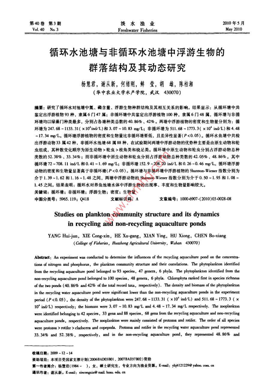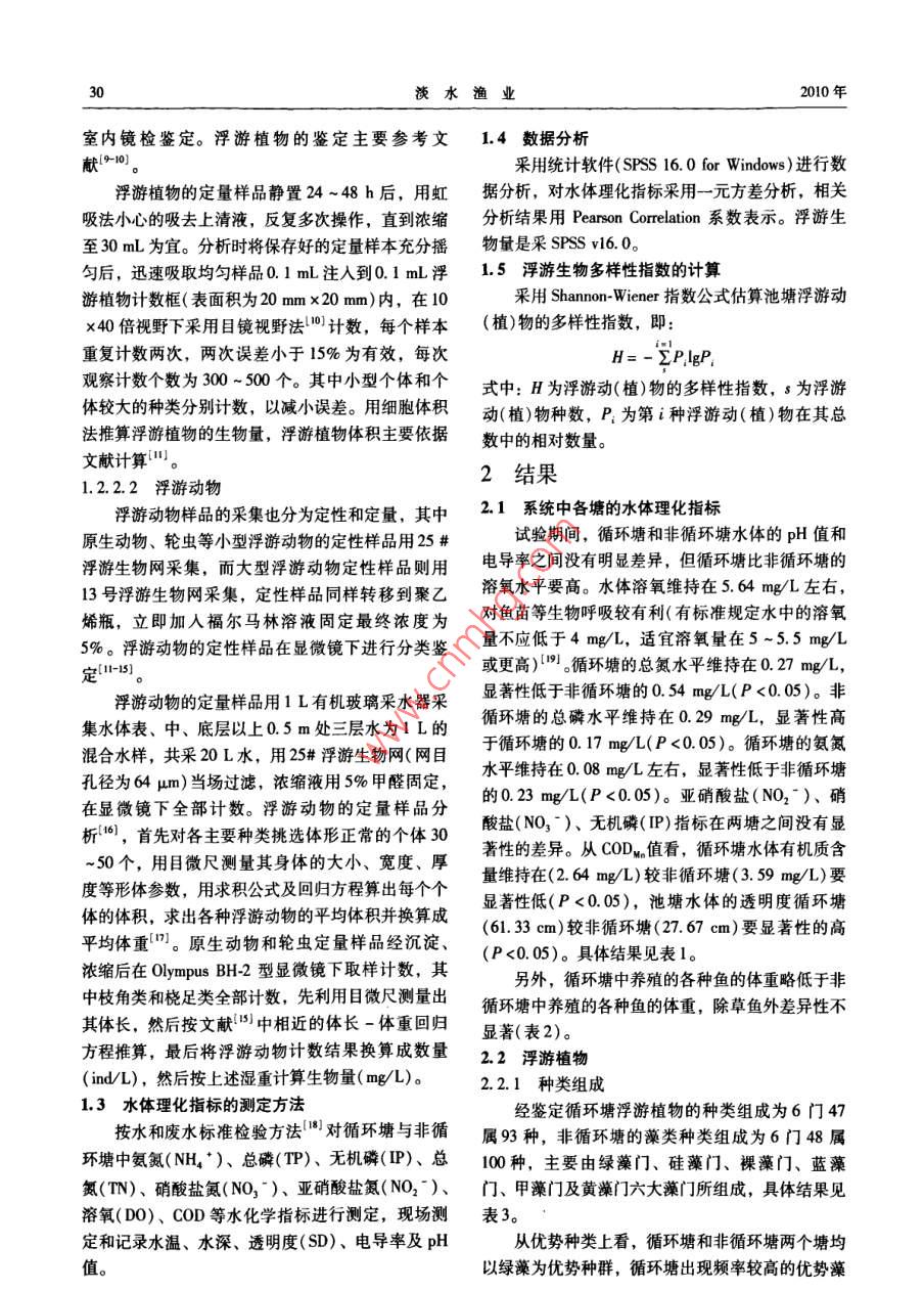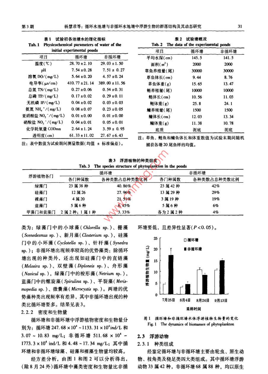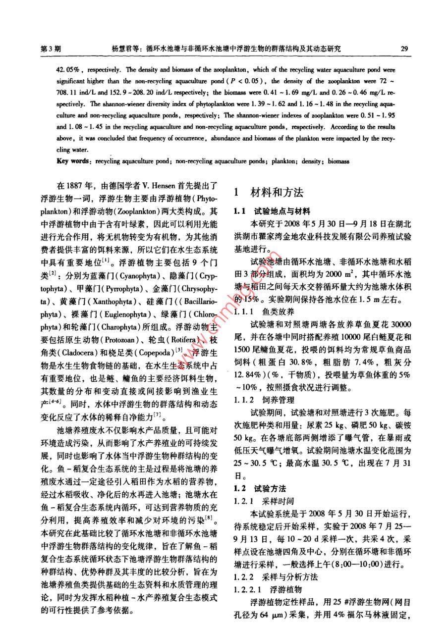 .第40卷第3期淡水漁業(yè)2010年5月.Vol.40 Na.3Freshwater FisheriesMay 2010循環(huán)水池塘與非循環(huán)水池塘中浮游生物的群落結(jié)構(gòu)及其動(dòng)態(tài)研究楊慧君,謝從新,何緒剛,鮮瑩,胡雄,陳柏湘(華中農(nóng)業(yè)大學(xué)水產(chǎn)學(xué)院,武漢430070)摘要:研究了循環(huán)水對池塘中氮、磷含量、浮游生物種群結(jié)構(gòu)及其相互關(guān)系的影響。結(jié)果顯示:從循環(huán)塘中共鑒定出浮游植物93種,隸屬6門47屬;非循環(huán)塘中共鑒定出浮游植物100種,隸屬6門48屬,循環(huán)塘與非循環(huán)塘均以綠藻門種類最多,分別占各塘種類總數(shù)的40. 86%、42%。兩塘中浮游植物的密度和生物量分別為:循環(huán)塘為247. 68 -1133. 31( x 10'ind/L)和3.07 ~ 10.83 mg/L;非循環(huán)塘為511. 68 -1773.3( x 10* ind/L)和4.48~17. 34 mg/L。循環(huán)塘浮游植物的密度和生物量比非循環(huán)塘要低,且差異性顯著(P<0.05)。循環(huán)水魚塘中共檢出浮游動(dòng)物33屬42種,非循環(huán)水池塘68屬88種,在試驗(yàn)期間兩塘中浮游動(dòng)物的優(yōu)勢種主要是由原生動(dòng)物和輪蟲組成,其種數(shù)變化順序?yàn)樵鷦?dòng)物>輪蟲>枝角類和橈足類。循環(huán)塘中原生動(dòng)物和輪蟲分別占浮游動(dòng)物總種類數(shù)的52.38%、33.34%;而非循環(huán)塘中原生動(dòng)物和輪蟲分別占浮游動(dòng)物總種類數(shù)的42.05%、48.86%。其中循環(huán)塘72 ~708.11 ind/L 和0.41~1. 69 mg/L;非循環(huán)塘152.9 ~ 208.20 ind/L和0.26 ~0. 46 mg/L。循環(huán)塘浮游動(dòng)物的密度和生物量顯著高于非循環(huán)塘(P <0.05)。循環(huán)塘與非循環(huán)塘中浮游植物的Sharnon-Wiener指數(shù)分別為介于1.39~1.62和1.16~1. 48之間,兩塘中浮游動(dòng)物的Shannon Wiener指數(shù)分別為介于0.50~1.95和1.08~1. 45之間。結(jié)果表明:循環(huán)水對養(yǎng)魚池塘水體中浮游生物的出現(xiàn)率、豐度和生物量影響較大。關(guān)鍵詞:循環(huán)塘;非循環(huán)塘;浮游生物;密度;生物量中圖分類號(hào): S965. 119; Q418文獻(xiàn)標(biāo)識(shí)碼: A文章編號(hào): 100-6907-(2010)03-0028-08Studies on plankton community structure and its dynamicsin recycling and non-recycling aquaculture pondsYANG Huijun, XIE Cong-xin, HE Xu-gang, XIAN Ying, HU Xiong, CHEN Bo-xiang(College of Fisheries, Huahong Agricutural Uninersity, Wuhan 430070)Abstract: An experiment was conducted to determine the influences of the recycling aquaculture pond on the concentra-tions of nitrogen and phosphorus,the plankton community structure and their correlations. The phytoplankton identifiedfrom the recycling aquaculture pond belonged to 93 species, 47 genera, 6 phyla. The phytoplankton identifed from thenon-rcyeling aquaculture pond belonged to 100 species, 48 genera, 6 phyla. Chlorophyta ranked first in species richnessof the two ponds (40. 86% and 42% of the toal record taxa, repetively). The density and biomass of the phytoplanktonin the reyeling water aquacuture pond were significant lower than the non-reycling aquaculture ponds in the experimentperiod (P <0.05), the density of the phytopankton were 247. 68 ~1133.31 ( x 10* ind/L) and 511.68 ~1773.3(x10^ ind/L) repetively; the biomass were 3.07 ~ 10. 83 mg/L and 4. 48 ~ 17. 34 mg/L repectiviely. The zplankonwere ienified belonging to 42 species, 33 gena and 88 species, 68 gena from the reeyeling aquaculture and non-ecyclingaquacuture ponds, respectively. The 2oplankton were mainly consisted of protoa and rtie. The order of all specieswere prolozoa > roifer > cladocera and copepoda. Prolozoa and roifer in the recycling water aquaculture pond represented33.34% and 52.38%, respectively, and in the non-reyeling aquaculture pond, they represented 48. 86% and收稿日期: 2009-12 -14資助項(xiàng)目:本項(xiàng)目受國家支撐計(jì)劃2006BAD03B01、2007BAD37B02)資助第一作者簡介:楊慧君(1984- ), 女,碩士研究生,專業(yè)方向?yàn)闈O業(yè)資源。E-mail: yi1212292 yobo, com cn通訊作者:謝從新。E-mal: xecngin@ mail hau edu cn第3期楊慧君等:循環(huán)水池塘與非循環(huán)水池塘中浮游生物的群落結(jié)構(gòu)及其動(dòng)態(tài)研究2942. 05%,respectively. The density and biomass of the zooplankton, which of the recyeling water aquaculture pond weresignificant higher than the non-recycling aquaculture pond(P < 0.05),the density of the zooplankton were 72 ~708. 11 ind/L and 152. 9 - 208.20 ind/L repectively; the biomass were 0.41 ~ 1.69 mg/L and 0. 26 ~0.46 mg/L respectively. The shannon-wiener diversity index of phytoplankton were 1.39~1. 62 and1. 16-1 48 in the reeycling aqua-culure and non-reyeling squaculture ponds, respectively; The shannon-wiener indexes of zooplankton were 0.51-1.95and 1.08 ~1.45 in the reeycling aquaculure and non-eeyecling aquaculture ponds, respectively. According to the resultsabove, it was concluded that frequency of occurence, abundance and biomass of the plankton were impacted by the recy-cling water.Key words: recycling aquaculture pond; non-recycling aquaculture ponds; plankton; density; biomass在1887年,由德國學(xué)者V. Hensen首先提出了1材料和方法浮游生物--詞,浮游生物主要由浮游植物(Phyto-plankton) 和浮游動(dòng)物( Zooplankton)兩大類構(gòu)成。其1.1試驗(yàn)地點(diǎn)與材料中浮游植物中由于含有葉綠素,因此可以利用光能本研究于2008年5月30日-9月18日在湖北進(jìn)行光合作用,將無機(jī)物轉(zhuǎn)變?yōu)橛袡C(jī)物,為其他消洪湖市瞿家灣金地農(nóng)業(yè)科技發(fā)展有限公司養(yǎng)殖試驗(yàn)費(fèi)者提供豐富的餌料來源,所以它們在水生態(tài)系統(tǒng)基地進(jìn)行。中具有重要