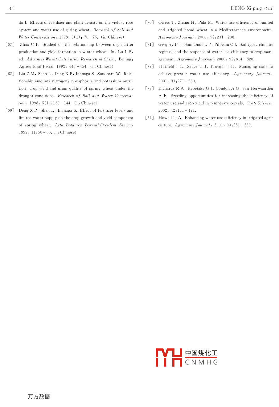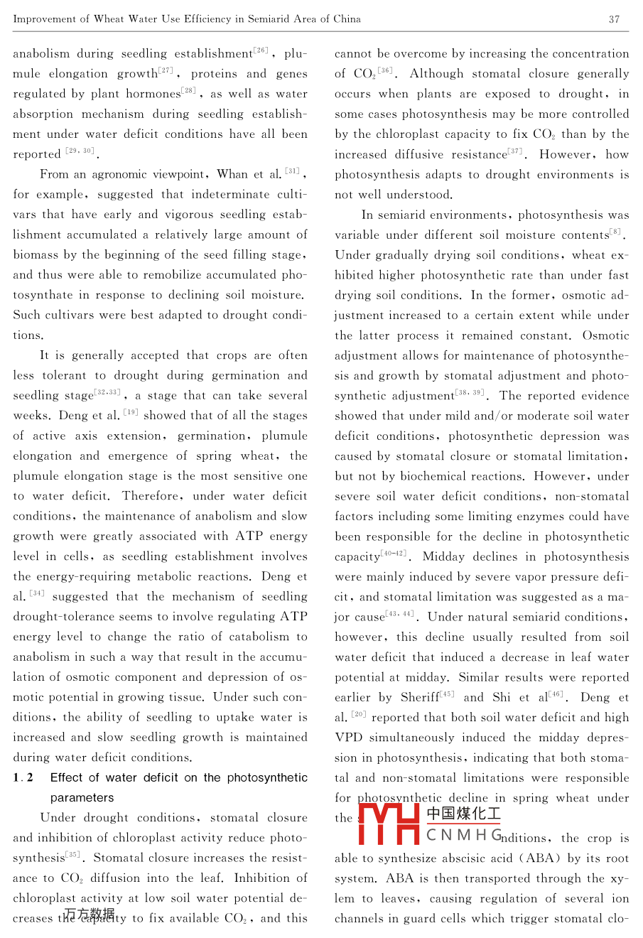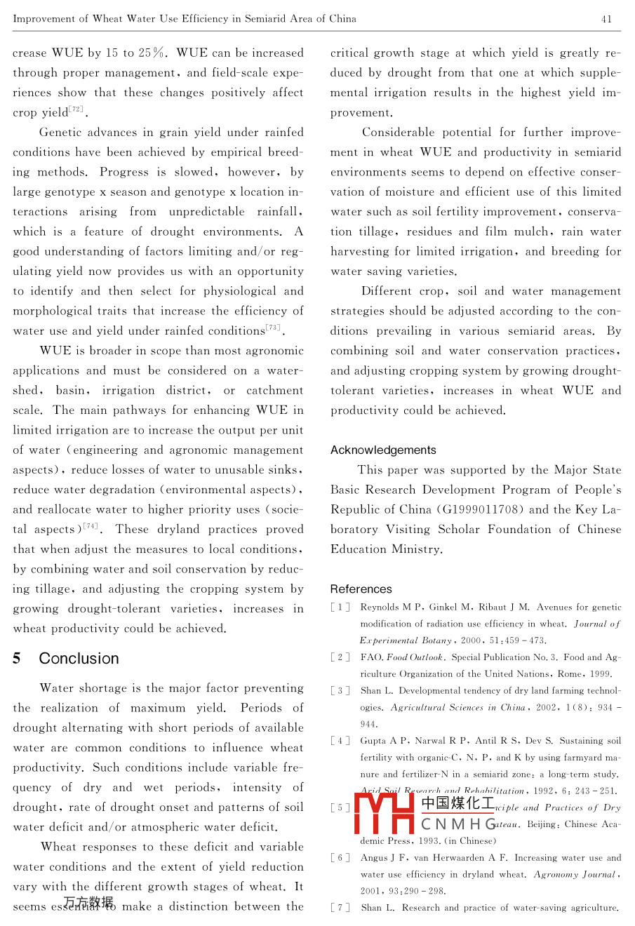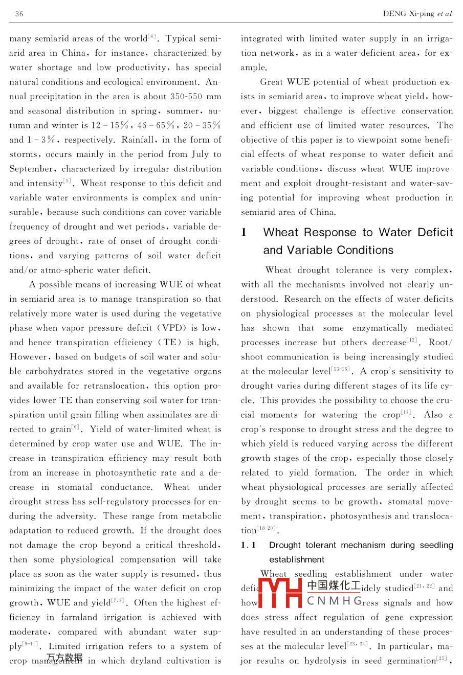 Agricultural Sciences in ChinaVol.2 No.1 35-44January 2003Improvement of Wheat Water Use Efficiencyin Semiarid Area of ChinaDENG Xi-ping',2,SHAN Lun', KANG Shao-zhong2,Inanaga Shinobu3and Mohanmed Elfatih K Ali3.4(' Institute of Soil and Water Conservation, Chinese Academy of Sciences, Shaanxi 712100,P. R. China;”Northwest Sci- Tech University of Agriculture and Forestry, Shaanxi 712100,P. R. China;3 Arid Land Research Center, Tottori University, Hamasaka 1390, Tottori 680, Japan;“ El-Obeid Research Station, Agricultural Research Corporation, P. O. Bor 429, E-Obeid, Sudan )Abstract: The greatest fear of global climate change is drought since in most areas where wheat is grownwater is the most important factor influencing wheat yield. Average wheat yield throughout the world is only30 - 60% of the attainable yield potential because water shortage is the major factor preventing the realizationof maximum yield. Periods of drought alternating with short periods of available water are common conditionsto influence wheat productivity. Such conditions include variable frequency of dry and wet periods, intensityof drought, rate of drought onset and patterns of soil water deficit and/ or atmospheric water deficit. It is thisdeficit and variable water conditions in semiarid environments that influence wheat productivity variously.This paper reviewed the physiological adaptation and benefits associated with deficit and variable water condi-tions. In addition, it also highlights the compensative effect of limited irrigation and breeding of new varietiesfor high water use efficiency ( WUE) that could improve wheat productivity under water-limited environmentsin the semiarid regions. Considerable potential for further improvement in wheat WUE and productivity insemiarid environments seems to depend on effective conservation of moisture and efficient use of this limitedwater such as soil fertility improvement, conservation tillage, residues and film mulch, rain water harvestingfor limited irrigation, and breeding for water saving varieties. Different crop, soil and water managementstrategies should be adjusted according to the conditions that prevail in various semiarid areas. By combiningsoil and water conservation approaches and adjusting the cropping system by growing drought-tolerant and wa-ter-saving cultivars, increase in wheat WUE and productivity could be achieved.Key words : Semiarid conditions, Dryland wheat, Physiological adaptation, WUE improvementGlobal demand for wheat is growing fasternologies. China has an average wheat yield of 3. 78than gains realized in genetic yield potential. Cur-t ha- higher than the world average. Today, do-rently the gain increase is less than 1% per year inmestic demand for wheat is about 125 millionmost regions1. The largest wheat producingtones.' I o improve total production in China,at-countries of the world are China, United States,tention has been focused on expansion in areas withIndia,Russia, Australia and Canada[2], wherelow and medium yield in the semiarid regions. Thissemiarid regions occupy the largest area. China hashas required the development and dissemination ofbecome the largest wheat producer in the worldwhe中國煤化工:s that lead to sustain-since the 1980s. Wheat yield has increased byableYHCN M H Gin these areas5396.7% compared with that in the 1950s as a resultPeriods of drought alternating with short peri-of progress in developing wheat production tech-ods of available water are conditions common toDENG Xi p萬市數(shù)據(jù)Professor, Tel: 86- 29 7012437. Fax: 86 29 7012210. E mail: dengxp@ ms. iswc. ac. cn.6DENG Xir ping et almany semiarid areas of the world!4]. Typical semi-integrated with limited water supply in an irriga-arid area in China,for instance, characterized bytion network, as in a water-deficient area, for ex-water shortage and low productivity, has specialample.natural conditions and ecological environment. An-Great WUE potential of wheat production ex-nual precipitation in the area is about 350 -550 mmists in semiarid area, to improve wheat yield, how-and seasonal distribution in spring, summer,auever,biggest challenge is effective conservationtumnandwinteris12-15%,46-65%,20-35%and efficient use of limited water resources. Theand 1 - 3%,respectively. Rainfall, in the form ofobjective of this paper is to viewpoint some benefi-storms,occurs mainly in the period from July tocial effects of wheat response to water deficit andSeptember, characterized by irregular distributionvariable conditions, discuss wheat W UE improve-and intensity-5. Wheat response to this deficit andment and exploit drought- resistant and water- sav-variable water environments is complex and unin-ing potential for improving wheat production insurable, because such conditions can cover variablesemiarid area of China.frequency of drought and wet periods, variable de-Wheat Response to Water Deficitgrees of drought, rate of onset of drought condi-and Variable Conditionstions,and varying patterns of soil water deficitand/ or atmo-spheric water deficit.Wheat drought tolerance is very complex,A possible means of increasing WUE of wheatwith all the mechanisms involved not clearly un-in semiarid area is to manage transpiration so thatderstood. Research on the effects of water deficitsrelatively more water is used during the vegetativeon physiological processes at the molecular levelphase when vapor pressure deficit (VPD) is low,has shown that some enzymatically mediated .and hence transpiration efficiency (TE) is high.processes increase but others decrease[12]. Root/However,based on budgets of soil water and solu-shoot communication is being increasingly studiedble carbohydrates stored in the vegetative organsat the molecular level-13-16- .A crop 's sensitivity to .and available for retranslocation, this option pro-drought varies during different stages of its life cy-vides lower TE than conserving soil water for tran-cle. This provides the possibility