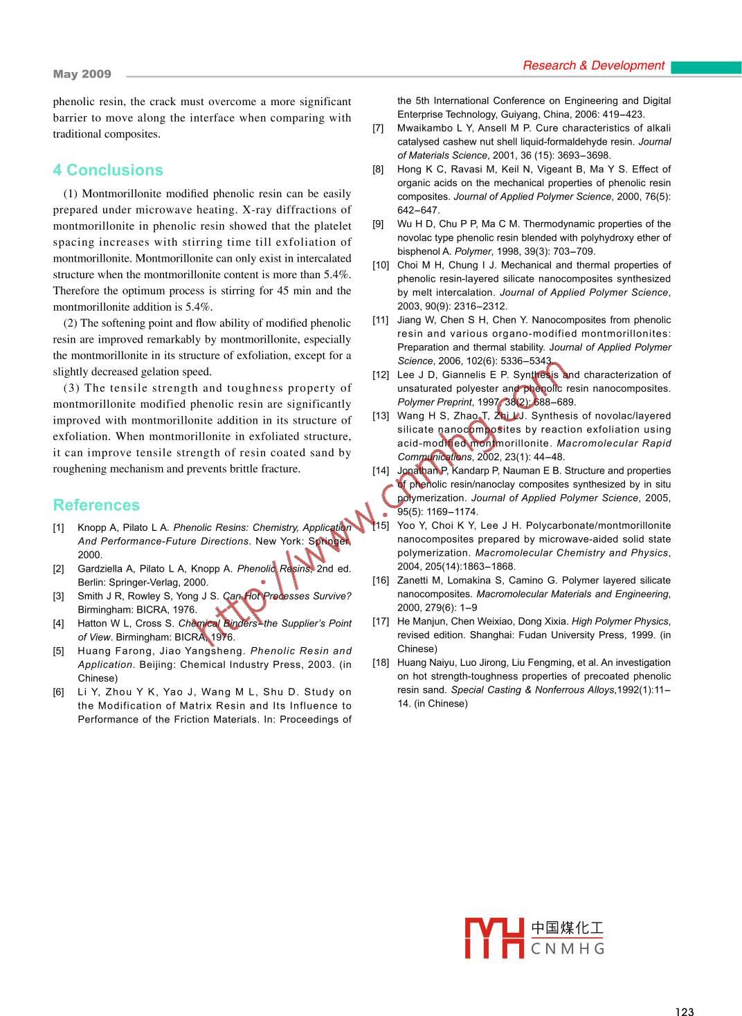 Research & DevelopmentMay 2009Preparation of montmorillonitemodified phenolic resin for shellprocess*Xiong Jianmin 1, Li Yuancai 1, Wang Wenqing , Xia Chun(I. School of Material Science and Engineering, Huazhong University of Science and Technology, Wuhan 430074, P. R. China; 2. Schoolof Material Science and Engineering, Nanchang Institute of Aeronuutical Technology, Nanchang 330063, P. R. China)Abstract: The development of montmirillonite modified phenolic resin under microwave iradiation heatingwas investigated. The effect of montmorillonite content and stirring time on the structure and morphology ofsynthetic resin was analyzed. The optimum processing procedure was found to be 45 min strring time with 5.4%montmorillonite adition. Further, the platelet spacing increases with stiring time til montmorillonite exfoliated tonanoscales platelet. When montmorillonite is exfoliated, layered structure at nanoscale can be uniformly distributedin the resin. The overall performance of montmoillonite modified phenolic resin is improved remarkably, such asflow ability, tensile strength and toughness property of resin coated sand. However, the gelation speed decreasedslightly by adding montmoillonite.Key words: shell process; phenolic resin; montmorillonite; comprehensive performance; tensile strengthCLC number: TG221Document code: AArticle ID: 1672-6421(2009)02-119-05manufacturing complicated castings of high precisionmontmorillonite in phenolic resin was investigated. Then thewith phenolic resin as binder, for it possess a number ofperformance of montmorillonite modified phenolic resin, suchunique properties such as good storage of cores and shells, as flow ability, was asssed and quantified in detail.high specific strength, good breakdown capability and highcasting surface quality . The development of casting1 Experimental proceduretowards large-scale and precision production put forwardhigher demands for the performance of phenolic resin for shellMain materials used for this research were: analytically -pureprocess 51. Modification of phenolic resin is an effective wayphenol, aqueous formaldehyde and oxalic acid; chemical-purefor improving the performance, but the current used modifierhexamine and montmoillonite (MMT) Nat and octadecyl amine.for phenolic resin, such as tung oil, cashew nut shell liquid,The reaction took place in a three-necked vessel. The desiredsalicylic acid and bisphenol-A, can only provide sole andamount of 98wt.% phenol, MMT Na*, octadecyl amine, andlimited improvement 16-91.oxalic acid were added into the reactor. The mixture wasRecently, montmorillonite modified phenolic resin (i.e.stirred for 45 min, 30 min, and 15 min, respectively, or notphenolic resin/montmorillonite nano-composites) attracts greatstirred at all under microwave irradiation. Then the desiredinterest of many researchers 10141. Such composite can offeramount of aqueous formaldehyde and 10wt. % oxalic acidhighly improved comprehensive properties in both stiffnesssolution were charged into the reactor and the reactor wasand toughness, which is difficult to attain from individualheated by microwave irradiation to reflux. After 15 min,components, especially when montmoillonite is in the aqueous formaldehyde and oxalic acid solution were addedexfoliated structure with its characteristic nanometer size andas supplement. The reaction was suspended after another 25high aspect ratio 151. This study mainly concerns the synthesismin reflux. After settling, the aqueous layer was siphonedprocess of montmorillonite modified phenolic resin underoff. Vacuum distillation (up to 185C) stripped the remainingmicrowave iradiation heating. The effect of stiring time andvolatiles off the novolac under microwave irradiation. Thenthe product was discharged and cooled. The synthesis period*Xiong Jianminof montmorillonite modified phenolic resin under microwaveMale, born in 1981, Ph. D. Research interests are the preparationirradiation was much less than that for conventional heatingand modification of phenolic resin and related composites.method, and theref(中國煤化工fficiency.E-mail: xiongianmin@gmail.com|YHCNMHGCorresponding author: Li YuancaiE-mail: leeycchina@yahoo.com.cn2 Performance testsReceived: 2008-12-02; Accepted: 2009-03-04The morphology of the polymer was examined using X'Pert119.CHINA FOUNDRYVol.6 No.2PRO X-ray diffractometer. The diffractometer employs aspacing can be increased and the incident angle of diffractioncopper X-ray source that has an emission wavelength of 1.54Apeak decreases accordingly when polymer intercalated into theat room temperature in the range of 20=0.59- 10°. All samples interlayer, or the monomers polymerization in the interlayer,were cured before examined by X-ray diffraction (the curingthen montmorillonite is called in intercalation structure.When the platelet spacing further increases or randomly tillScanning electron microscope (SEM) images were obtained the platelet escaped the infuence of Van der Waals force, theby a Quanta 200 with EDAX energy dispersive spectrometermontmorillonite dispersed in separate sheets entirely in resin,(EDS). Softening point, curing time and flow distance of thethen the diffraction peak disappears and montmorilloniteresins were determined according to ZBG39005-89.is now in its exfoliation structure. The performance ofAfter preheated to 160C, 1,000 g of standard sand wasmontmorillonite modified phenolic resin is optimum whencharged into a laboratory muller. The sand was allowed tomontmorillonite is in its structure of exfoliation and uniformlyequilibrate to 135C, then 20 g of novolac resins was added,disperses in resin at nanoscales 014the sand and resins were mulled till 110C- 105C, and HTMAIn order to obtain the optimum process, the effect ofsolution, accounting for 10%- 15% of resin was added. Thestirring time and montmorillonite content on the structure and1.5 g of calcium stearate was added thereto, mulling continuedmorphology of phenolic resin was 