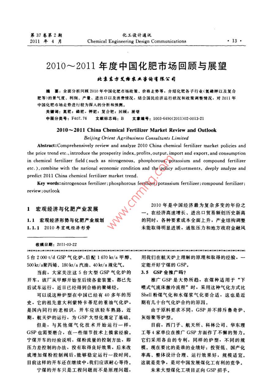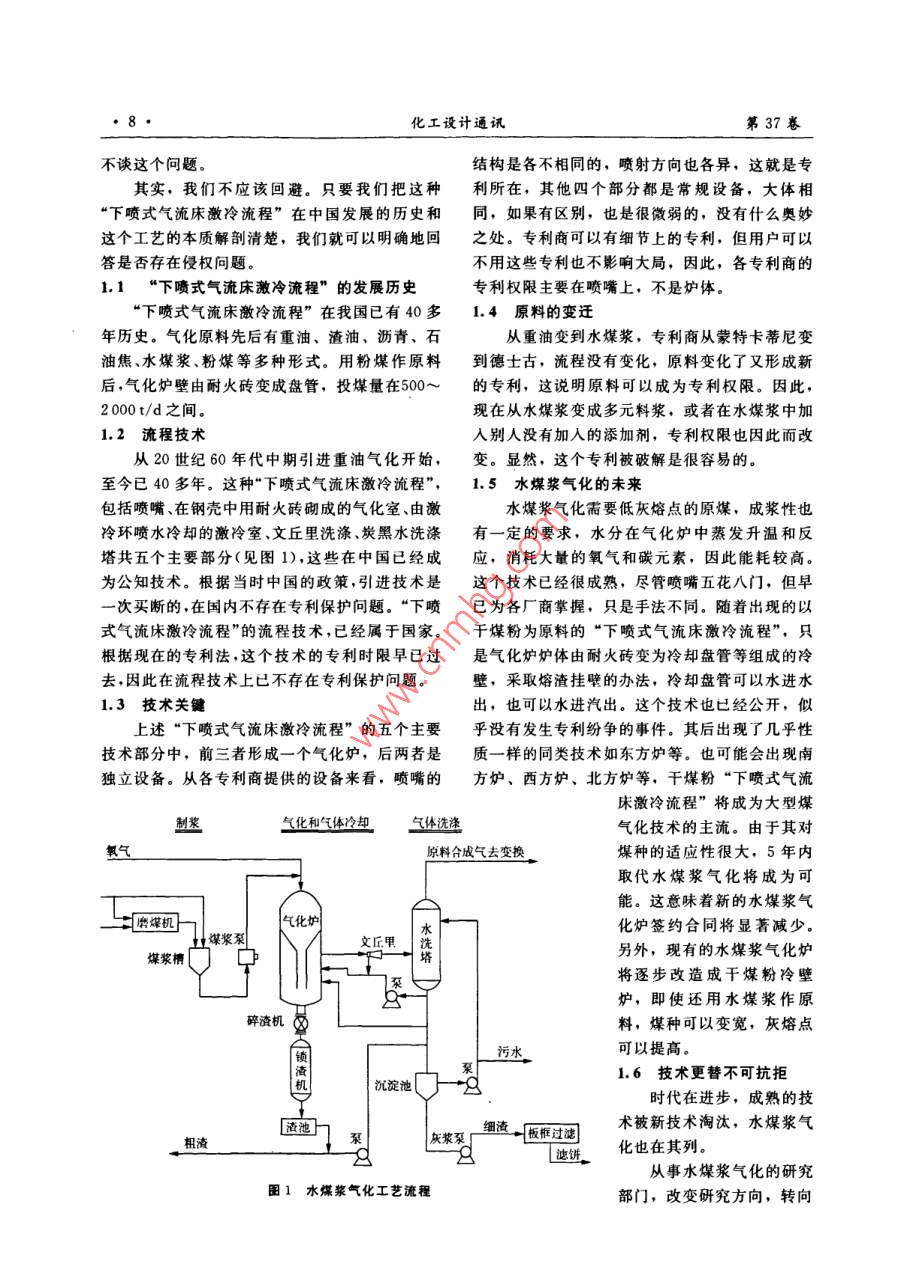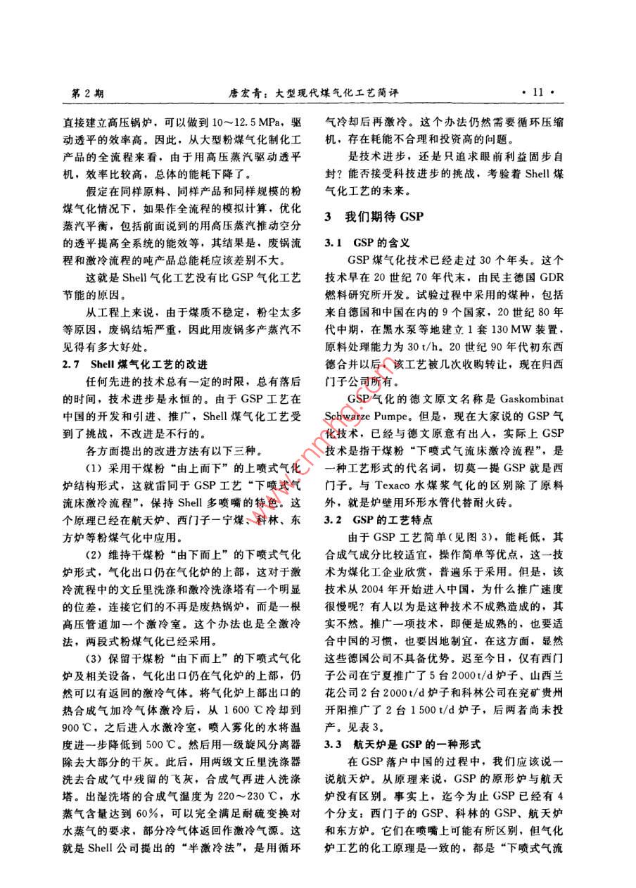 第37卷第2期化工設(shè)計(jì)通訊2011年4月Chemical Engineering Design Communications●7●大型現(xiàn)代煤氣化工藝簡(jiǎn)評(píng)唐宏青(中科合成油工程有限公司,北京100195)摘要:討論了水煤漿氣化的過(guò)去、現(xiàn)在與末來(lái),對(duì)Shell煤氣化工藝作了定位,對(duì)GSP氣化技術(shù)的發(fā)展寄予希望。關(guān)鍵詞:大型煤氣化;工藝;評(píng)價(jià)中圍分類號(hào): TQ546文獻(xiàn)標(biāo)志碼: B文章編號(hào): 1003-6490(2011)02 007-06Brief Comments on Large Scale Coal Gasification ProcessTang Hong-qing(Synfuels China Engineering Co., Ltd.. Beijing 100195 , China)Abstract:Discuss the past, present and future of coal water slurry gasification technology, positionthe role of Shell coal gasification, and expect much development to GSP coal gasification.Key words:large scale coal gasification; process ;comment市場(chǎng)。正處于十字路口,未來(lái)會(huì)有什么變化?0引言目前,國(guó)內(nèi)流行的煤氣化技術(shù)有十幾種,氣1水煤漿氣化的過(guò)去、 現(xiàn)在與未來(lái)流床是大型煤氣化技術(shù)的主流,主要有Texaco近日統(tǒng)計(jì),在國(guó)內(nèi)已建和在建的300多臺(tái)新水煤漿氣化(亦稱GE氣化)、Shell 粉煤氣化和型氣化爐中.水 煤漿氣化爐占70%以上.估計(jì)其GSP粉煤氣化三種,這是大家都熟悉的。這些投煤能力將達(dá) 40 Mt/a.見表1.因此可以認(rèn)為,氣化技術(shù)都有一-定的業(yè)績(jī),現(xiàn)在他們?cè)谥袊?guó)爭(zhēng)奪水煤漿氣化技術(shù)是我國(guó)當(dāng)前煤氣化技術(shù)的主流。表1國(guó)內(nèi)已建和在建 的新型氣化爐氣化妒類型臺(tái)敷投煤塹 1/d用途運(yùn)行情況碎煤加壓氣化妒130~700氨/甲醇 /城市煤氣/合成油E常GE水煤漿氣化爐5300~1500氨/ 甲醇/氫正常多噴嘴氣化爐500~ 2000氨/甲醇/氨多元料漿氣化爐400~1 100氨/甲醇/氫/合成油熔渣非熔渣氣化爐18300~1500氨/甲醇?xì)づ苀粉煤氣化爐2:930~2800氨/甲醇/氫部分正常航天爐750~1500甲 醇在建、試運(yùn)行二段爐1000~2000甲 醇/IGCC在GSP.科林1500~2000氨/甲醇灰熔聚氣化爐100~200恩德爐150~600氨/燃料氣目前,國(guó)內(nèi)的水煤漿氣化技術(shù),主要有四種式氣流床激冷流程"。區(qū)別在于原料不同,噴嘴形式,即原德士古氣化、多元料漿氣化、四噴嘴的方向和位置、數(shù)量不同等。氣化和熔渣非熔渣氣化技術(shù)。從原理上來(lái)說(shuō),在討論這個(gè)問(wèn)題的時(shí)候,我們經(jīng)常聽到這樣這四種技術(shù)形式上基本是一致的,即屬于“下噴的聲音:這里存在知識(shí)產(chǎn)權(quán)的糾紛。許多人避而收稿日期: 2011-03-07作者簡(jiǎn)介:唐宏青(1941-). 男,上海人,教授級(jí)高工,中科合成油工程有限公司顧問(wèn)?!?.化工設(shè)計(jì)通訊,第37卷不談這個(gè)問(wèn)題。結(jié)構(gòu)是各不相同的,噴射方向也各異,這就是專其實(shí),我們不應(yīng)該回避。只要我們把這種利所在,其他四個(gè)部分都是常規(guī)設(shè)備,大體相“下噴式氣流床激冷流程"在中國(guó)發(fā)展的歷史和.同,如果有區(qū)別,也是很微弱的,沒(méi)有什么奧妙這個(gè)工藝的本質(zhì)解剖清楚,我們就可以明確地回之處。專利商可以有細(xì)節(jié)上的專利,但用戶可以答是否存在侵權(quán)問(wèn)題。不用這些專利也不影響大局,因此,各專利商的1.1“下噴式氣流床激冷流程”的發(fā)展歷史專利權(quán)限主要在噴嘴上,不是爐體。“下噴式氣流床激冷流程”在我國(guó)已有40多.1.4原料的變遷年歷史。氣化原料先后有重油、渣油、瀝青、從重油變到水煤漿,專利商從蒙特卡蒂尼變;油焦、水煤漿、粉煤等多種形式。用粉煤作原料到德士古,流程沒(méi)有變化,原料變化了又形成新后,氣化爐壁由耐火磚變成盤管,投煤量在500~的專利,這說(shuō)明原料可以成為專利權(quán)限。因此,2 000t/d之間?,F(xiàn)在從水煤漿變成多元料漿,或者在水煤漿中加1.2流程技術(shù)人別人沒(méi)有加入的添加劑,專利權(quán)限也因此而改從20世紀(jì)60年代中期引進(jìn)重油氣化開始,變。顯然,這個(gè)專利被破解是很容易的。至今已40多年。這種"下噴式氣流床激冷流程",1.5水煤漿 氣化的未來(lái):包括噴嘴、在鋼殼中用耐火磚砌成的氣化室、由激水煤漿氣化需要低灰熔點(diǎn)的原煤,成漿性也冷環(huán)噴水冷卻的激冷室.文丘里洗滌、炭黑水洗滌有一定的要求,水分在氣化爐中蒸發(fā)升溫和反塔共五個(gè)主要部分(見圖1),這些在中國(guó)已經(jīng)成應(yīng),消耗大量的氧氣和碳元素,因此能耗較高。為公知技術(shù)。根據(jù)當(dāng)時(shí)中國(guó)的政策,引進(jìn)技術(shù)是這個(gè)技術(shù)已經(jīng)很成熟,盡管噴嘴五花八門,但早一次買斷的,在國(guó)內(nèi)不存在專利保護(hù)問(wèn)題?!跋聡娨褳楦鲝S商掌握,只是手法不同。隨著出現(xiàn)的以式氣流床激冷流程”的流程技術(shù),已經(jīng)屬于國(guó)家。干煤粉為原料的“下噴式氣流床激冷流程”,只根據(jù)現(xiàn)在的專利法,這個(gè)技術(shù)的專利時(shí)限早已過(guò)是氣化爐爐體由耐火磚變?yōu)槔鋮s盤管等組成的冷去,因此在流程技術(shù)上已不存在專利保護(hù)問(wèn)題。壁,采取熔渣掛壁的辦法,冷卻盤管可以水進(jìn)水1.3技術(shù)關(guān)鍵出,也可以水進(jìn)汽出。這個(gè)技術(shù)也已經(jīng)公開,似上述“下噴式氣流床激冷流程”的五個(gè)主要乎沒