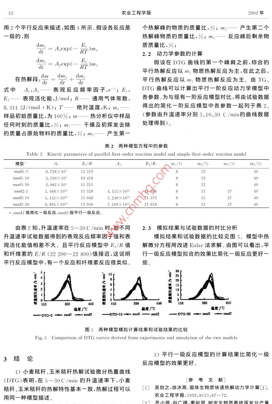 第18卷第4期農(nóng)業(yè)工程學(xué)報(bào)Vol. 18 No. 42002年7 月Transactions of the CSAEJuly 2002小麥和玉米秸稈熱解反應(yīng)與熱解動(dòng)力學(xué)分析何芳, 易維明”,孫容峰”,閘建文”,柏雪源”,李永軍’(1.上海理工大學(xué): 2.山東理工大學(xué),3.山東省科學(xué)院能源研究所)摘要:為了對(duì)生物質(zhì)快速熱解液化設(shè)備進(jìn)行分析和計(jì)算,該文用熱重、差熱分析儀分別對(duì)小麥和玉米秸稈在不同升溫速率下進(jìn)行了熱分析研究。結(jié)果表明:小麥和玉米秸稈的熱解特性基本一致,熱解過(guò)程可以用同一種模型描述;隨升溫速率的提高,熱解最高速率時(shí)的溫度和熱解最高速率明顯提高。分析了小麥和玉米秸稈熱解反應(yīng)過(guò)程,提出了平行一階反應(yīng)動(dòng)力學(xué)模型并計(jì)算出模型中各參數(shù),將該模型的計(jì)算結(jié)果.現(xiàn)有一階反應(yīng)模型的計(jì)算結(jié)果分別和試驗(yàn)數(shù)據(jù)進(jìn)行了對(duì)比,結(jié)果表明,平行一階反應(yīng)模型的準(zhǔn)確程度比現(xiàn)有一階反應(yīng)模型有很大的提高。關(guān)鍵詞:小麥秸稈;玉米秸稈;生物質(zhì);熱分析;熱解動(dòng)力學(xué)模型;熱解動(dòng)力學(xué)參數(shù)中圖分類號(hào): S216文獻(xiàn)標(biāo)識(shí)碼: A文章編號(hào):1002- 6819(2002)04-0010-04自第一臺(tái)生物質(zhì)快速熱解液化設(shè)備出現(xiàn)以來(lái),約為100~130 kg/m3 ,試驗(yàn)時(shí)樣品含水率約為2%熱解液化技術(shù)得到了一定的發(fā)展,研究者已從當(dāng)初~4%。物料尺寸小于0. 5 mm。單純要得到液體燃料為目的逐步轉(zhuǎn)變?yōu)椴坏@得1.1.2 試驗(yàn)方法液體燃料,更要獲得具有很高利用價(jià)值的醫(yī)藥、化工試驗(yàn)在一臺(tái)日本生產(chǎn)的TG- DTA200型熱重原料的高級(jí)目標(biāo)。但現(xiàn)在還沒有出現(xiàn)能夠供商業(yè)運(yùn)差熱分析儀上進(jìn)行。取約10 mg的樣品盛入樣營(yíng)的生產(chǎn)液體燃料或化工產(chǎn)品十分成熟的熱解工藝品皿(直徑為5 mm,高為5 mm)中,用Al2O,作參技術(shù)。主要原因是生物質(zhì)熱解過(guò)程十分復(fù)雜,人們對(duì)比物,用N2作保護(hù)氣。由程序設(shè)定升溫速率、終溫,它的基本原理的了解還遠(yuǎn)遠(yuǎn)不夠。為制定合理的熱系統(tǒng)自動(dòng)記錄熱解過(guò)程中樣品的質(zhì)量變化等。解工藝,有效地利用生物質(zhì)熱解技術(shù),必須對(duì)熱解反分別將玉米秸稈粉、小麥秸稈粉以5、10C、應(yīng)過(guò)程作深入地研究。國(guó)內(nèi)外學(xué)者對(duì)生物質(zhì)熱解進(jìn)30C/min的升溫速率從常溫加熱至500C進(jìn)行熱行了許多實(shí)驗(yàn)研究,并建立了一些經(jīng)驗(yàn)公式口~61。本解分析實(shí)驗(yàn)。記錄的曲線有熱重曲線(TG)、微分熱文對(duì)我國(guó)典型農(nóng)業(yè)廢棄物玉米秸稈、小麥秸稈的熱重曲線(DTG)和差熱曲線(DTA)3條。解特性進(jìn)行了實(shí)驗(yàn)研究和分析,根據(jù)玉米秸稈和小1.2 結(jié)果分析和討論麥秸稈的化學(xué)組成提出了用平行一級(jí)反應(yīng)模型來(lái)模1.2.1小麥秸稈、玉米秸稈熱解曲線的對(duì)比擬它們?cè)跓岱治鰞x中的熱解反應(yīng)過(guò)程。由圖1可以看出,小麥和玉米秸稈在相同的熱解條件下各曲線非常相似。文獻(xiàn)[4,5,7]表明,木粉1試驗(yàn)和結(jié)果分析1.1 試驗(yàn)也100301.1. 1試驗(yàn)物料的制備為試驗(yàn)時(shí)取樣具有代表性和減少水分對(duì)熱解實(shí)0t驗(yàn)的影響,試驗(yàn)物料用如下的方法制備。取具代表性0 10020000500 t 0100200 300400 500溫度/'C溫度/C的玉米秸稈(一段包括玉米秸稈皮、玉米秸稈芯和少一wheat-5一. com-5一wheal-5量的玉米葉的有莖節(jié)的玉米秸稈)和小麥秸稈(數(shù)段包括小麥葉子的小麥秸稈),進(jìn)行研磨,將研磨后的100 r粉末充分混合后用坩鍋收集。坩鍋上蓋后置入干燥6010箱,在105C下干燥2h。按上述方法各制備小麥秸20 L0 100200 300400 500100 200 300 400 500稈粉和玉米秸稈粉2~3g。制備后的樣品堆積密度- - - comn-30 一wheat-30-corn-30 一wbeat-30收稿日期:2002-03- 19基金項(xiàng)目;國(guó)家863項(xiàng)目(2001AA514030)和高等學(xué)校骨干教師圖1小麥秸稈 、玉米秸稈TG、DTG曲線對(duì)比何芳等:小麥和玉米秸稈熱解反應(yīng)與熱解動(dòng)力學(xué)分析的熱解曲線也與它們相似,DTG曲線也呈現(xiàn)出有2熱,而在質(zhì)量損失速率最大時(shí),吸熱速率已基本降至個(gè)峰的趨勢(shì);而棉織物、紙張、辣椒、橘子皮83.6]則和零。這種現(xiàn)象可以解釋為:熱解斷鍵反應(yīng)-開始就發(fā)它們不同,棉織物、紙張DTG曲線呈現(xiàn)明顯的1個(gè)生,而且是吸熱的。但此時(shí)斷鍵后的中間產(chǎn)物由于分峰,橘子皮呈現(xiàn)出明顯的2個(gè)峰、而辣椒是明顯的3子量仍很大,并未能逸出,隨著溫度的升高和斷鍵的個(gè)峰。繼續(xù),產(chǎn)物分子量越來(lái)越小,動(dòng)能越來(lái)越大,分子開這種現(xiàn)象可以從物料的化學(xué)組成來(lái)解釋,表1始逸出,出現(xiàn)了質(zhì)量損失速率峰,隨著物料中可熱解給出了上述幾種物料的化學(xué)組成。小麥秸稈、玉米秸物質(zhì)的急劇減少,斷鍵所需的熱量也急劇減少,出現(xiàn)稈和木粉熱解曲線相似的原因是它們的主要成分都DTA上升峰形和DTG峰形相似的結(jié)果。為纖維素、半纖維素