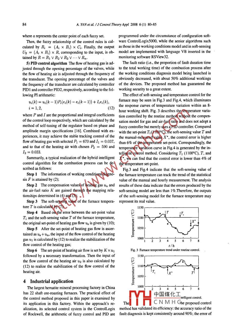 J Control TheoryAppl 2008 6(1) 80-85DOI 10.1007/51176-008-7001-6Hybrid intelligent control of combustion processfor ore-roasting furnaceAjun YAN ", Tianyou CHAI2, Fenghua WU2, Pu WANG 1(.College of Elctronic Information and Control Engineering. Beijing Univesity of Technology Beijing 10022,2 China;2.Reserch Center of Automation, Northeasterm University, Shenyang Liaoning 10004, China)Abstract: Because of its synthetic and complex characteristics, the combustion process of the shaft ore-roastingfurace is very difficult to control stably. A hybrid intelligent control approach is developed which consists of two systems:one is a cascade fuzzy control system with a temperature soft-sensor, and the other is a ratio control system for air flow witha compensation model for heating gas flow and air-fuel ratio. This approach combined itelligent control, soft- sensing andfault diagnosis with conventional control. It can adjust both the heating gas flow and the air-fuel ratio in real time. By thisway, the difficulty of online measurement of the fumace temperature is solved, the fault ratios during combustion processis decreased, the steady control of the fumace temperature is achieved, and the gas consumption is reduced. The successfulapplicaion in shaft furmaces of a mineral processing plant in China indicates its efectivness.Keywords: Furnace temperature; Inelligent control; Soft- sensing; Fault diagnosis; Shaft furace1 Introductiontine control. However, the applications of similar methodsThe first shaft furnace was built in 1926, and it fulfls the on the combustion control of a shaft ore-roasting fumaceore- roasting process which comprises an ore feed system, a have rarely been reported by far.combustion system, a high temperature deoxidization sys- To solve the problem that it is dificult to realize the sta-tem and a cool-discharge system. Among these sytems, the ble control, fault detection, and online measurement of thecontrol effect of the combustion system is significant to en- temperature for the shaft ore-roasting furmace, this papersure that the shaft furmace works reliably and to make the presents a hybrid intelligent control approach which inte-whole mineral processing plant more economical [1]. Be- grates the respective superiorities of neural network, expertcause the combustion system is a complex process which control, case-based reasoning and routine PID control. Thecontains the properties of multi-distributed parameters, in- secure, economic and stable control of the combustion pro-tensive nonlinear, large time-delay, and some faults occur- cess is realized by the cooperation work of a cascade fuzzyring frequently, it is virtually impossible to realize the con- control system for fumace temperature, a ratio control sys-trol stabilization of the furmace temperature with any single tem for air flow with a soft sensing model, plus a fault di-routine control method such as PID control.agnosis model. Thus, an excellent basic system has beenIn recent years, the development of expert systems (ES) constructed for the sucessful implementing of the muli-[2], case -based reasoning (CBR) [3]. fuzzy control (FC)[4] variable itelligent optimizing control system [12] of theand neural networks (NN) [5] has brought new fields to the ore-roasting process in the shaft furmace.researchers in engineering applications. Impacting these in-tligent control methods on the objet of temperature isa 2 Combustion system for furnace tempera-focal point in engineering applications at all times. Exam-ples of such control methods are the intelligent control ofFig.1 ilustrates the combustion system of the shaft ore-exit temperature in a gas-fuel can-type combustor [6], and roasting furmace, where the heating gas spouts into the com-the superisory control of furnace temperature [7]. Also, bustion chamber afer pssing the master valve, the confu.some pplied cases of process control [8, 9], fault diagnosis ence gas pipe, and the dividing valve seqaentill, while the[10] and process variable sf-sensing [1] have exhibited heaing air is blown in by a tasducerdriving supply fan.the prominent aspects of both ielelient control and rou- The heating gas and heating air will be mixed up to combustReceived 3 Januany 2007; revised 29 August 2007.中國煤化工This work was supported by the National Key Basic Research and Development7, andnd posored by theScientific Research Foundation for the Doctor of Beijing University of TechnologMHC N M H Gg Projet for AcademieHuman Resources Development in Intitions of Higher Leamning Under the Junsdiction of Bejig Muncipality (nnovaive Research Team onthe Control Theory, Technology Research and Aplicaion).A. YAN et al.1J Control Theory Appl 2008 6(1) 80-8581and will provide heat for the required furnace temperatureFor a long time, the combustion process has been work-(normally within the range of 1050°C~1 150°C).ing in the pattemn of manual operation. Depending on theOres from ore-feeding systempatrolling detection to the condition of combustion, the op-erators make judgments and decisions on the varying infor-Heating gas Dividingmation with their experiences. Then, they adjust the flowMaster valve valverate of heating gas and heating air manually. However, thetX-operators can bardly discover the variety of information dueXto the complication of the working conditions including theSupplycalorific value of the heating gas fuctuating frequently, andfan:|the furnace temperature being hard to be measured online.Consequently, neither the safety and the economy nor theg XHaccuracy of the control of the combustion process can beX→x+guaranteed, which may lead to such situations that the faultsoccur frequently and inferior control performances of thefumnace temperature emerge with excessive gas consump-Confluence gas pipetionConfuence airpipe I3 Hybrid intelligent control for the combus-To high temperature deoxidization systemFig. 1 Combution system of the shaft ore roating furnace.tion processTh