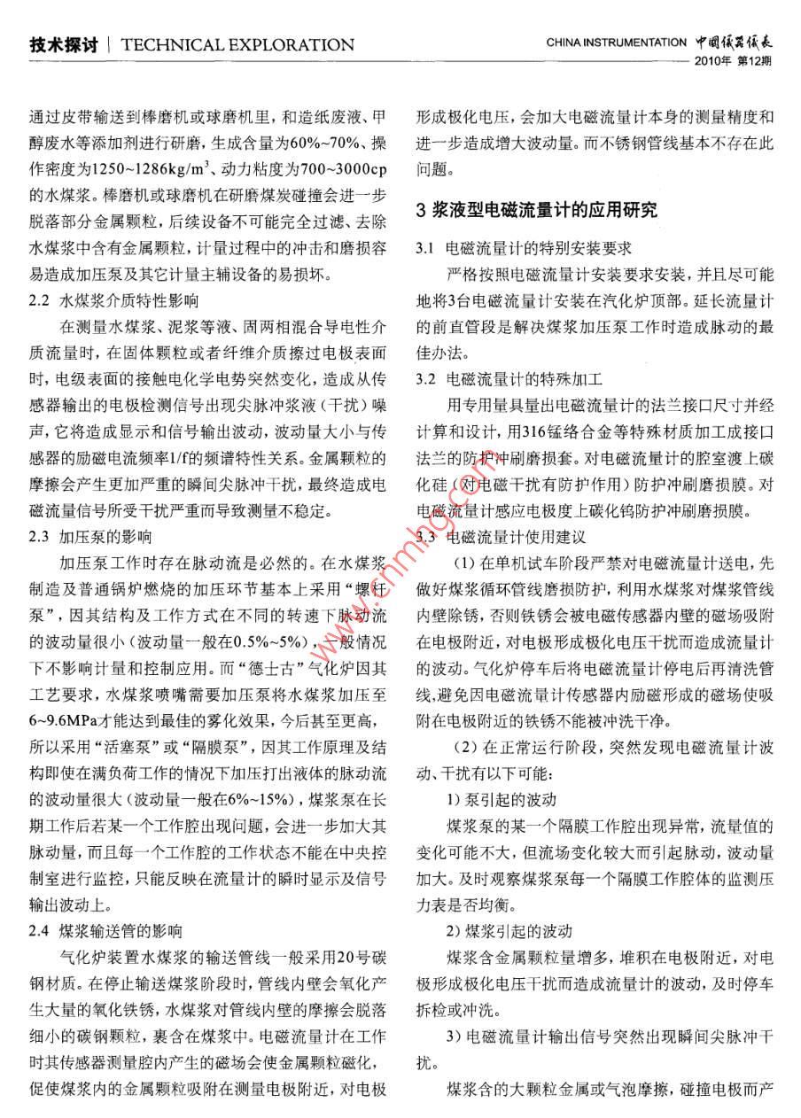 中明儀佤長(zhǎng) CHINA INSTRUMENTATIONTECHNICAL EXPLORATION技術(shù)探討2010年第12期漿液型電磁流量計(jì)在煤化工水煤漿行業(yè)的研究應(yīng)用Research and Improvement of Strach a Liquid Typethe Electromagnetism Flowmeter in the Coal chemicalEngineering Water Coal Syrup Profession倪興來(lái)薛凌飛1引言(兗州煤業(yè)榆林能化有限公司,1990年山東魯南化肥廠在中國(guó)第一家成功引進(jìn)了陜西榆林719000)“德士古”型氣化爐制煤氣技術(shù),隨之“對(duì)置式四噴嘴新型氣化爐制煤氣技術(shù)”、“魯奇BGL氣化爐制煤氣技摘要:通過(guò)對(duì)水煤漿計(jì)量難的科學(xué)分析,對(duì)電磁流術(shù)”、“西門子GSP氣化爐制煤氣技術(shù)”、“GE高壓氣量計(jì)的出廠特殊加工、現(xiàn)場(chǎng)安裝使用、檢修和化爐制煤氣技術(shù)”等氣化爐制煤氣技術(shù)很快在中國(guó)得調(diào)試實(shí)際應(yīng)用研究,認(rèn)為為漿液型電磁流量計(jì)到了突飛猛進(jìn)的發(fā)展,而所有的氣化爐制煤氣工藝控在煤化工有廣闊的應(yīng)用前景制的核心技術(shù)是對(duì)經(jīng)過(guò)磨煤機(jī)磨化篩選、煤漿泵加壓關(guān)鍵詞:煤化工水煤漿漿液型電磁流量計(jì)計(jì)量后的水煤漿流量與工藝氧流量比科學(xué)、準(zhǔn)確監(jiān)控。參數(shù)整定目前,工藝氧流量測(cè)量技術(shù)已經(jīng)足夠成熟。但新型的煤化工工藝和惡劣多變的現(xiàn)場(chǎng)條件,導(dǎo)致特殊工Abstract: Pass to calculate difficult science analysis to況的水煤漿介質(zhì)流量監(jiān)測(cè)不穩(wěn)定性始終困惑著各個(gè)water coal syrup, to of the electromagnetism flowmeter煤化工企業(yè)與流量計(jì)廠家。因此,攻克煤化工水煤漿the factory Be special to process, the spot usage流量監(jiān)測(cè)的技術(shù)難題就成了眾多流量計(jì)廠家的奮斗目gearing, check fix and adjust to try actual application標(biāo)示study, for strach liquid type's electromagnetism經(jīng)眾多流量計(jì)廠家和煤化工企業(yè)共同開(kāi)發(fā)、研flowmeter is at the coal chemical engineering究、篩選和應(yīng)用,一致總結(jié)出:到目前為止,速度式測(cè)application middle finger the applied foreground of量原理的“漿液型電磁流量計(jì)”是測(cè)量煤化工水煤漿science and vast流量的最佳首選流量計(jì)。Key words: Coal chemical engineering但是在電磁流量計(jì)實(shí)際使用過(guò)程中存在著工頻干Water coal starches擾噪聲、流體介質(zhì)特性產(chǎn)生的電化學(xué)干擾嘈聲、供電電Strach a liquid type electromagnetism源性等干擾,造成了相應(yīng)的水煤漿計(jì)量難。flow-meter2煤化工行業(yè)水煤漿的計(jì)量難點(diǎn)Calculate The parameter is whole to settle21水煤漿成分復(fù)雜因煤炭在采掘過(guò)程中含有鐵絲、銅絲等金屬屑,技術(shù)探討| TECHNICAL EXPLORATIOCHINA INSTRUMENTATION中闞低長(zhǎng)2010年第12期通過(guò)皮帶輸送到棒磨機(jī)或球磨機(jī)里,和造紙廢液、甲形成極化電壓,會(huì)加大電磁流量計(jì)本身的測(cè)量精度和醇廢水等添加劑進(jìn)行研磨,生成含量為60%~-70%、操進(jìn)一步造成增大波動(dòng)量。而不銹鋼管線基本不存在此作密度為1250-1286kg/m3動(dòng)力粘度為700-3000cp問(wèn)題。的水煤漿。棒磨機(jī)或球磨機(jī)在研磨煤炭碰撞會(huì)進(jìn)一步脫落部分金屬顆粒,后續(xù)設(shè)備不可能完全過(guò)濾、去除3漿液型電磁流量計(jì)的應(yīng)用研究水煤漿中含有金屬顆粒,計(jì)量過(guò)程中的沖擊和磨損容3.1電磁流量計(jì)的特別安裝要求易造成加壓泵及其它計(jì)量主輔設(shè)備的易損壞。嚴(yán)格按照電磁流量計(jì)安裝要求安裝,并且盡可能2.2水煤漿介質(zhì)特性影響地將3臺(tái)電磁流量計(jì)安裝在汽化爐頂部。延長(zhǎng)流量計(jì)在測(cè)量水煤漿、泥漿等液、固兩相混合導(dǎo)電性介的前直管段是解決煤漿加壓泵工作時(shí)造成脈動(dòng)的最質(zhì)流量時(shí),在固體顆粒或者纖維介質(zhì)擦過(guò)電極表面佳辦法。時(shí),電級(jí)表面的接觸電化學(xué)電勢(shì)突然變化,造成從傳3.,2電磁流量計(jì)的特殊加工感器輸出的電極檢測(cè)信號(hào)出現(xiàn)尖脈沖漿液(干擾)噪用專用量具量出電磁流量計(jì)的法蘭接口尺寸并經(jīng)聲,它將造成顯示和信號(hào)輸出波動(dòng),波動(dòng)量大小與傳計(jì)算和設(shè)計(jì),用316錳絡(luò)合金等特殊材質(zhì)加工成接口感器的勵(lì)磁電流頻率1f的頻譜特性關(guān)系。金屬顆粒的法蘭的防護(hù)沖刷磨損套。對(duì)電磁流量計(jì)的腔室渡上碳摩擦?xí)a(chǎn)生更加嚴(yán)重的瞬間尖脈沖干擾,最終造成電化硅(對(duì)電磁干擾有防護(hù)作用)防護(hù)沖刷磨損膜。對(duì)磁流量信號(hào)所受干擾嚴(yán)重而導(dǎo)致測(cè)量不穩(wěn)定。電磁流量計(jì)感應(yīng)電極度上碳化鎢防護(hù)沖刷磨損膜。23加壓泵的影響33電磁流量計(jì)使用建議加壓泵工作時(shí)存在脈動(dòng)流是必然的。在水煤漿(1)在單機(jī)試車階段嚴(yán)禁對(duì)電磁流量計(jì)送電,先制造及普通鍋爐燃燒的加壓環(huán)節(jié)基夲上采用“螺杄做奷煤漿循環(huán)管線磨損防護(hù),利用水煤漿對(duì)煤漿管線泵”,因其結(jié)構(gòu)及工作方式在不同的轉(zhuǎn)速下脈動(dòng)流內(nèi)壁除銹,否則鐵銹會(huì)被電磁傳感器內(nèi)壁的磁場(chǎng)吸附的波動(
