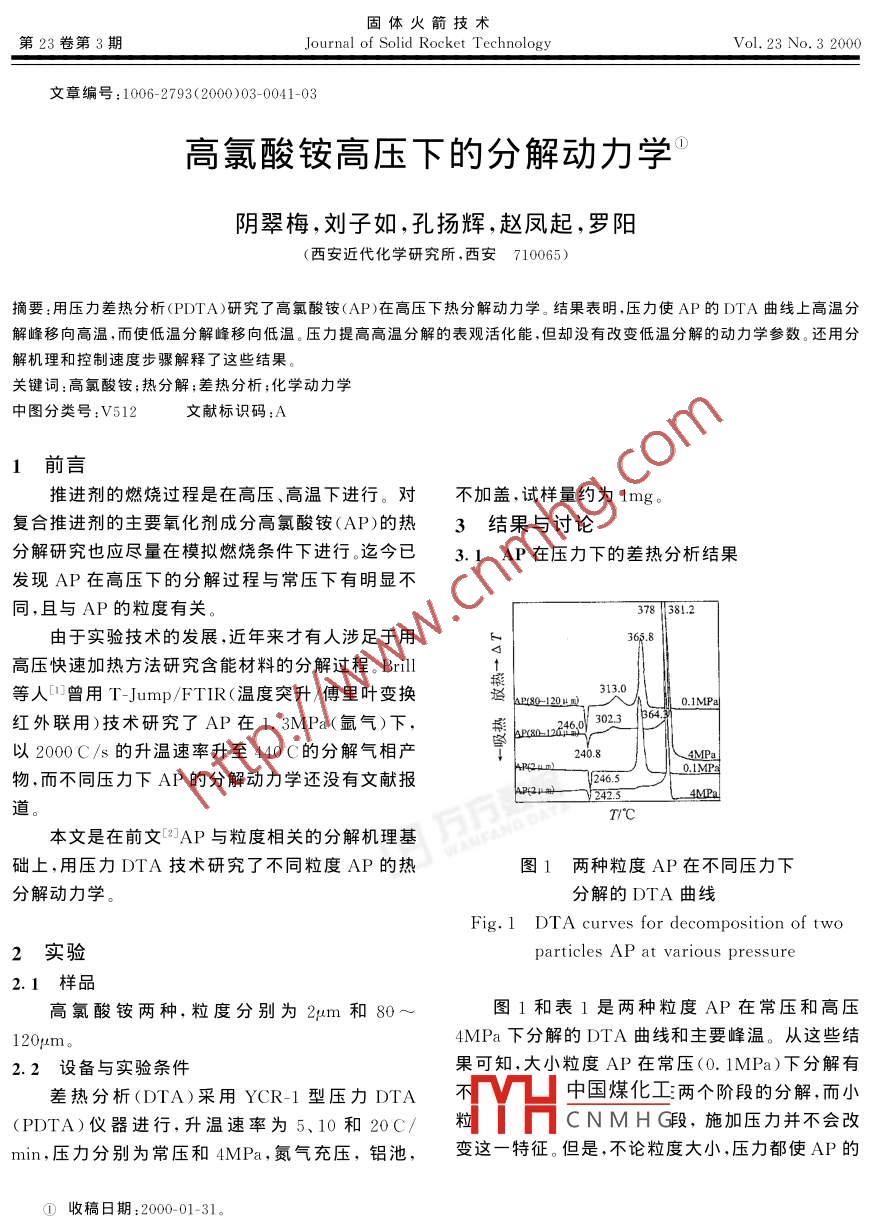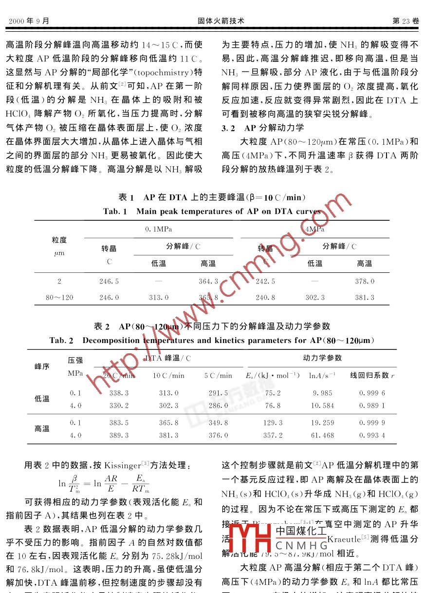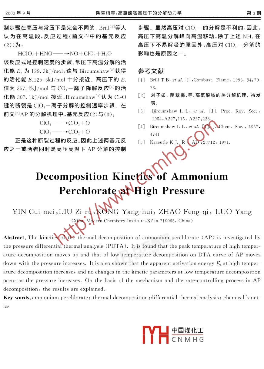 固體火箭技術(shù)第23卷第3期Journal of Solid Rocket technolog.Vol.23No.32000文章編號:1006-2793(2000)03-0041-03高氯酸銨高壓下的分解動力學(xué)陰翠梅,劉子如,孔揚(yáng)輝,趙鳳起,羅陽(西安近代化學(xué)研究所,西安710065)摘要:用壓力差熱分析(PDTA)研究了高氯酸銨(AP)在高壓下熱分解動力學(xué)。結(jié)果表明,壓力使AP的DTA曲線上高溫分解峰移冋高溫,而使低溫分解峰移冋低溫。壓力提高高溫分解的表觀活化能,但卻沒有改變低溫分解的動力學(xué)參數(shù)。還用分解機(jī)理和控制速度步驟解釋了這些結(jié)果關(guān)鍵詞:高氯酸銨;熱分解;差熱分析;化學(xué)動力學(xué)中圖分類號:V5文獻(xiàn)標(biāo)識1前言推進(jìn)劑的燃燒過程是在高壓、高溫下進(jìn)行。對不加蓋,試樣量約為復(fù)合推進(jìn)劑的主要氧化劑成分高氯酸銨(AP)的熱3結(jié)果與討論分解研究也應(yīng)盡量在模擬燃燒條件下進(jìn)行。迄今已3.IAP在壓力下的差熱分析結(jié)果發(fā)現(xiàn)AP在高壓下的分解過程與常壓下有明顯不同,且與AP的粒度有關(guān)3781381,2由于實(shí)驗(yàn)技術(shù)的發(fā)展,近年來才有人涉足于用高壓快速加熱方法研究含能材料的分解過程。Bril等人口曾用T-Jump/FTIR(溫度突升/傅里葉變換0.1MP紅外聯(lián)用)技術(shù)研究了AP在1.3MPa(氬氣)下,以2000C/s的升溫速率升至440C的分解氣相產(chǎn)240.8物,而不同壓力下AP的分解動力學(xué)還沒有文獻(xiàn)報(bào)t"y24254MPa本文是在前文AP與粒度相關(guān)的分解機(jī)理基礎(chǔ)上,用壓力DTA技術(shù)研究了不同粒度AP的熱圖1兩種粒度AP在不同壓力下分解動力學(xué)。分解的DTA曲線Fi2實(shí)驗(yàn)particles AP at various pressure2.1樣品高氯酸銨兩種,粒度分別為2m和80圖1和表1是兩種粒度AP在常壓和高壓4MPa下分解的DTA曲線和主要峰溫。從這些結(jié)2.2設(shè)備與實(shí)驗(yàn)條件果可知,大小粒度AP在常壓(0.1MPa)下分解有差熱分析(DTA)采用YCR-1型壓力DTA中國煤化工兩個階段的分解,而小(PDTA)儀器進(jìn)行,升溫速率為5、10和20C/??蒠HCNMHG段,施加壓力并不會改min,壓力分別為常壓和4MPa,氮?dú)獬鋲?鋁池,變這一特征。但是,不論粒度大小,壓力都使AP的①收稿日期:2000-01-31。作寺舟蠼據(jù)梅(1945)女,高級工程師,從事含能材料熱化學(xué)及熱分析應(yīng)用基礎(chǔ)研究固體火箭技術(shù)第23高溫階段分解峰溫向高溫移動約14~15℃,而使為主要特點(diǎn),壓力的增加,使NH的解吸變得不大粒度AP低溫階段的分解峰移向低溫約11C易,因此,高溫分解峰推遲,即移向高溫,但是當(dāng)這顯然與AP分解的“局部化學(xué)”( topochemistry)特NH3一旦解吸,部分AP液化,由于與低溫階段分征和分解機(jī)理有關(guān)。從前文2可知,AP在第一階解同樣原因,壓力使界面層的O2濃度提高,氧化段(低溫)的分解是NH3在晶體上的吸附和被反應(yīng)加速,反應(yīng)就變得異常劇烈,因此在DTA上HIO降解產(chǎn)物O2所氧化,當(dāng)壓力提高時,分解可看到被移向高溫的狹窄尖銳分解峰氣體產(chǎn)物O2被壓縮在晶體表面層上,使O2濃度3.2AP分解動力學(xué)在晶體界面層大大增加,從晶體上進(jìn)入晶體與氣相大粒度AP(80~120m)在常壓(0.1MPa)和之間的界面層的部分NH3更易被氧化。因此使大高壓(4MPa)下,不同升溫速率β獲得DTA兩階粒度的低溫分解峰下降。高溫分解是以NH3解吸段分解的放熱峰溫列于表2表1AP在DTA上的主要峰溫(β=10C/min)Tab 1 Main peak temperatures of AP on DTA curvesIMP4MP粒度轉(zhuǎn)晶分解峰/C轉(zhuǎn)晶分解峰/CC低溫高溫低溫高溫80~120313.0240.8381.3表2AP(80~120μm)不同壓力下的分解峰溫及動力學(xué)參數(shù)Tab 2 Decomposition temperatures and kinetics parameters for AP(80-120um)距潮DTA峰溫/C動力學(xué)參數(shù)0C/min10C/min5C/ min E/(kJ·mol)lnA/s-1線回歸系數(shù)0.1338.3313.0291.59.9850.9996低溫4.0330.2286.010.5840.9891365.8349.8129.319.2590.9999高溫389.3381.3376.0357.24680.9934用表2中的數(shù)據(jù),按 Kissinger3方法處理這個控制步驟就是前文AP低溫分解機(jī)理中的第AR E個基元反應(yīng)過程,即AP離解及在晶體表面上的E R可獲得相應(yīng)的動力學(xué)參數(shù)(表觀活化能E和NH2(s)和HCO4(s)升華成NH1(g)和HCO)(g)指前因子A),其結(jié)果也列在表2中的過程。因?yàn)椴徽撛诔合禄蚋邏合聹y定的E都表2數(shù)據(jù)表明,AP低溫分解的動力學(xué)參數(shù)幾接中國煤作有真空中測定的AP升華乎不受壓力的影響。指前因子A的自然對數(shù)值都活CNMHKraeutle測得低溫分在10左右,因表觀活化能E,分別為75.28kJ/ml解禮能9.81.mol相近和76.8kJ/mol。這表明,壓力的升高,雖使低溫分大粒度AP高溫分解(相應(yīng)于第二個DTA峰)解加快,DTA峰溫前移,但控制速度的步驟卻沒有高壓下(4MPa)的動力學(xué)參數(shù)E。和lnA都比常壓變。因?yàn)樾銘B(tài)應(yīng)是控制速度步驟的活化能。下(.1MPa)有極大的增加。這表明高溫分解的控陰翠梅等:高氯酸銨高壓下的分解動力學(xué)第3期制步驟在高壓與常壓下是完全不同的。Bril等人步驟。顯然高壓對ClO4-的分解是不利的,因此,認(rèn)為在高溫段,反應(yīng)過程(前文中的基元反應(yīng)高壓下高溫分解峰向高溫移動,除了上述NH3在(2))為:高壓下不易解吸的原因外,高壓對ClO4-分解的HCIO+HNOno+cIO +H, O影響也是原因之一該反應(yīng)式是控制速度的步驟。常壓下高溫分解的活化能E。為129.3kJ/mol,這與 Bircumshaw獲得參考文獻(xiàn)的活化能E125.5kJ/mo十分接