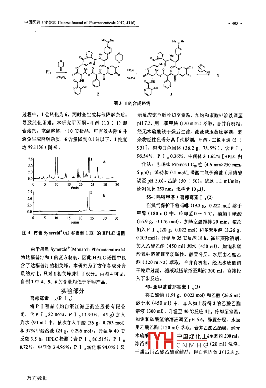 中國醫(yī)藥工業(yè)雜志Chinese Jourmal of Pharmaceuticals 2012, 43 (6)●401●化學藥物與合成技術奎奴普丁的合成趙傳猛',裘鵬程',肖立,尹明星”,張福利*(1.中國醫(yī)藥工業(yè)研究總院上海醫(yī)藥工業(yè)研究院,創(chuàng)新藥物與制藥工藝國家重點實驗室,上海200040;2.浙江海正藥業(yè)股份有限公司,浙江臺州318000)摘要:普那霉素1包括主成分普那霉素I s和次成分普那霉素1日、普那霉素I c.粗晶經甲基化反應將普那霉素1。轉化為普那霉素I A純化后經Mannich反應和消除反應制得58-亞甲基普那霉素1 s(3), 3與(5)-3-奎寧環(huán)硫醇反應得抗感染藥奎奴普丁,總收率約37% (以普那霉素I s計).關鍵詞:奎奴普丁;普那霉素;甲基化;合成:純化;抗感染藥中圖分類號: R978.1 文獻標志碼: A文章編號: 1001-8255 (2012)06-0401-04Synthesis of QuinupristinZHAO Chuanmeng', QIU Pengcheng', XIAO Li', YIN Mingxing , ZHANG Fulil*(1. State Key Lab. ofNew Drng and Pharmaceutical Process, Shanghai Institute of Pharmaceutical Indhustry, China State lnstitute ofPharmaceutical Industny; Shanghai 200040; 2. Zhejiang Hisun Pharmaceutical Co,, Ltd, Tatzhou 318000)ABSTRACT: Pritinamycin I , including pristinamycin I n pristinamycin I B and pristinamycin I。was treated bymethylation, in order to convert pristinamycin I B to pristinamycin I s, then followed by Mannich reaction and eliminationto give 58-methylenepristinamycin I a(3), which was subjected to reaction with (S) -3-mercaptoquinuclidine to obtainanti-infective agent quinupristin with an overall yield of about 37% (based on pristinamycin I .Key Words: quinuprstin; pristinamycin; methylation; synthesis; purification; anti-infective agent奎奴普丁(quinupristin, 1) 為鏈陽性菌素普膿性鏈球菌引起的皮膚及軟組織感染(23).那霉素I(PI)的半合成衍生物,達福普汀原料普那霉素I (P I )屬于B族鏈陽性菌素,(dalfopristin)為鏈陽性菌素普那霉素II A的半合主要成分為PIA,含量大于80%;次要成分為.成衍生物,兩者以30 : 70(w/w)比例組成的抗生普那霉素I g(P I )和普那霉素I c(P I c),前素復合制劑于1999年首次在英國上市",商品名.者含量10%以上。文獻4)報道1中含有3個主要Synercid*,臨床主要用于治療由醫(yī)院獲得性肺炎、有關物質(圖1): 4和5分別是由原料中P I g和耐萬古霉素屎腸球菌(VREF)菌血癥引起的嚴重感P I c經合成引入,6是1的非對映異構體,其中染,和耐甲氧西林金黃色葡萄球菌(MRSA)及化4的含量較高。本研究通過甲基化反應使P I。的含量由12%降低到1%以下,再經3步反應制得1,^謹以此文恭祝王其灼老師九秩華誕收稿日期: 2012-04-16從源頭上減少了4的生成,提高了1的純度。甲基.基金項目:上海市科技人才計劃項目(10XD1422800化反應條件溫和,反應液HPLC譜圖見圖2,其中.作者簡介:趙傳猛(1982-), 男,博士研究生,專業(yè)方向:藥物化7.58 min的峰為P I B,反應后基本消失;另外,Tel: 01555460023012.15 min的峰經確證為下步反應的中間體58-亞甲E-mail: botcmeng@163 com通僧聯(lián)系人:張福利(1968-), 男,研究員,博士生導師,從事藥基普代報道。.物化學研究。中國煤化工體3與(S).3-童Tel 021-62892872. 13916607640E-mail: zhangf@sipi.com.cn寧環(huán)YHCNMH&方法;①PIA●402.中國醫(yī)藥工業(yè)雜志Chinese Jourmal of Pharmaceuticals 2012, 43 (6)MwyMe,MeoHCOOHHCHO0心ar陽sHpI。。Me明eMe~MoM~yMeaginyoHPlc5圖1結構式400p格昂貴,成本較高:②P I A與嗎啉和多聚甲醛進fPlInA行Mannich反應制得58-(嗎啉甲基)普那霉素I A300(2), 2不經純化直接消除得3,收率68%[“,此024681012141618 20法成本低,收率較高。1 00本研究參考文獻[5.7),由P I A經Mannich反jPLaB應和消除反應制得3, 3與(S) -3-奎寧環(huán)硫醇(按503文獻(5]自制)反應制得1,總收率約37% (以02468101214161820P 1 s計),合成路線見圖3.制備1時,3與(S)-3-圖2原料P 1甲基化前(A) 和甲基化后(B) 反應液奎寧環(huán)硫醇反應過程中會生成非對映異構體雜質6。經考察,溫度是影響6含量的關鍵因素,本研究選的HPLC譜圖在一牛成。1的分離純化中國煤化工與叔丁氧基雙(二甲胺基)甲烷縮合后,在氰基硼是本三曾或重結晶純化。TH氫化鈉作用下制得3,收率40% (0),此法試劑價研究發(fā)元J.rcCNMHG溶解和室溫析晶中國醫(yī)藥工業(yè)雜志Chinese Joumnal of Pharmaceuticals 2012, 43(6)●403●MeyMe .Mx、yMe ;HOAcPIλ-1(CH2O]。0y麗yoH圖3 1的合成路線過程中,1會轉化為6,同時會生成其他降解雜質,示反應完全后冷卻至室溫,加飽和碳酸鉀溶液調至導致純化困難。本研究用丙酮-甲醇(10 : 1)混pH7.2,用二氯甲烷(120 mlx2)萃取,合并有機相,合溶劑,室溫溶解,-10 C析晶,可有效去除6并經無水硫酸鎂干燥后過濾,濾液減壓蒸除溶劑,剩避免生成降解雜質,6含量降到0.1%以下,1純度余物經柱色譜分離[洗脫劑:甲醇.二氯甲烷(5 :達9.11% (圖4)。95)],得類白色固體(36.2g, 78.5%), 含P I A96.54%,P I 80.36%, 中間體3 1.62% [HPLC歸A5.一化法: 色譜柱Promosil Crg柱(4.6 mmx250 mm,2.0fwunasthwh5μum);流動相0.1mol/L磷酸二氫鉀溶液(用磷酸0.0- N調至pH 3.0)-乙腈(50 : 50);流速1.1 ml/min;5 1015s _2025 30 35t/min檢測波長250 nm;進樣量10山].7.5p5.0B58-(嗎啉甲基)普那霉素I (2)2.5在氮氣保護下將嗎啉(19.3 g, 0.222 mol)溶于甲醇(180 ml)中,冷卻至0~5 C,滴加甲磺酸520230 351/min(16.9 g, 0.176 mol),加畢室溫攪拌20 min,依次圖4市售Synercid* (A)和自制1(B)的HPLC譜圖加入P I (20g, 0.022 mol)和多聚甲醛(3.26 g,0.109 mol),升溫至35 C反應18 h。減壓蒸除溶劑,由于所購Synercid (Monarch Pharmaceuticals)加入乙酸乙酯(450 ml)和水(450 ml),加飽和碳為達福普汀和1的復方制劑,因此HPLC譜圖中包酸氫鈉溶液調至弱