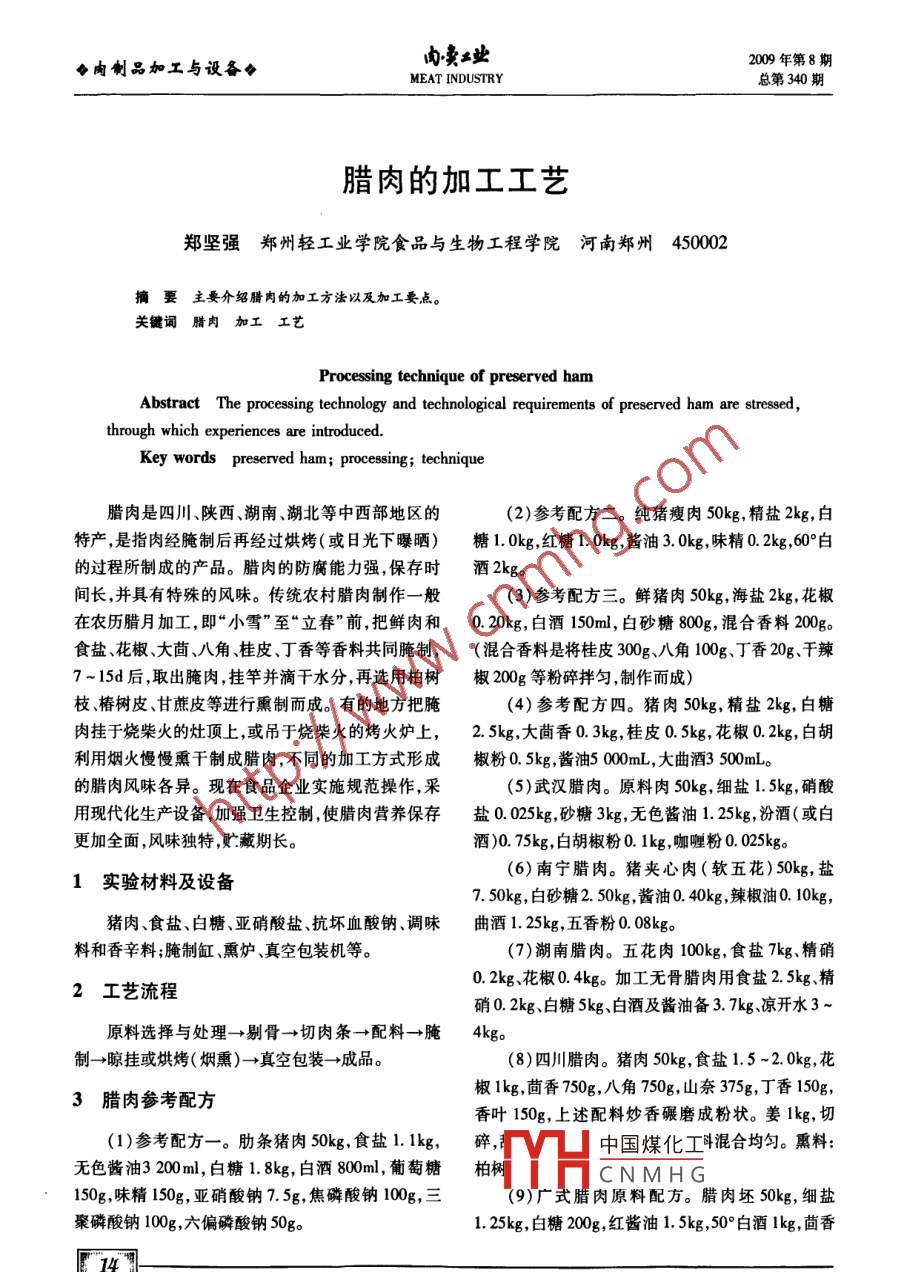 ◆肉制品加工與設(shè)各◆內(nèi)′賣業(yè)2009年第8期MEAT INDUSTRY總第340期臘肉的加工工藝鄭堅(jiān)強(qiáng)鄭州輕工業(yè)學(xué)院食品與生物工程學(xué)院河南鄭州450002摘要主要介紹臘肉的加工方法以及加工要點(diǎn)。關(guān)鍵詞臘肉加工工藝Processing technique of preserved hamAbstract The processing technology and technological requirements of preserved ham are stresthrough which experiences are introducedKey words preserved ham; processing; technique臘肉是四川陜西、湖南、湖北等中西部地區(qū)的(2)參考配方二。純豬瘦肉50kg,精鹽2kg,白特產(chǎn),是指肉經(jīng)腌制后再經(jīng)過烘烤(或日光下曝曬)糖1.0kg,紅糖1.0kg,醬油3.0kg,味精0.2kg,60°白的過程所制成的產(chǎn)品。臘肉的防腐能力強(qiáng),保存時(shí)酒2kg。間長,并具有特殊的風(fēng)味。傳統(tǒng)農(nóng)村臘肉制作一般(3)參考配方三。鮮豬肉50kg,海鹽2kg,花椒在農(nóng)歷臘月加工,即“小雪”至“立春”前,把鮮肉和0.20kg,白酒150m,白砂糖800g,混合香料200g。食鹽、花椒、大茴、八角、桂皮、丁香等香料共同腌制,(混合香料是將桂皮300g、八角100g、丁香20g、干辣7-15d后,取出腌肉,掛竿并滴干水分,再選用柏樹椒200g等粉碎拌勻,制作而成)枝椿樹皮、甘蔗皮等進(jìn)行熏制而成。有的地方把腌(4)參考配方四。豬肉50kg,精鹽2kg,白糖肉掛于燒柴火的灶頂上,或吊于燒柴火的烤火爐上,2.5kg,大茴香0.3kg,桂皮0.5kg,花椒0.2kg,白胡利用煙火慢慢熏干制成臘肉,不同的加工方式形成椒粉0.5kg醬油5000mL,大曲酒3500mL的臘肉風(fēng)味各異?,F(xiàn)在食品企業(yè)實(shí)施規(guī)范操作,采5)武漢臘肉。原料肉50kg,細(xì)鹽1.5kg,硝酸用現(xiàn)代化生產(chǎn)設(shè)備加強(qiáng)衛(wèi)生控制,使臘肉營養(yǎng)保存鹽0.025kg,砂糖3kg,無色醬油1.25kg,汾酒(或白更加全面,風(fēng)味獨(dú)特貯藏期長。酒)0.75kg,白胡椒粉0.1kg,咖喱粉0.025kg。1實(shí)驗(yàn)材料及設(shè)備(6)南寧臘肉。豬夾心肉(軟五花)50kg,鹽7.50kg,白砂糖2.50kg,醬油0.40kg,辣椒油0.10kg豬肉、食鹽、白糖、亞硝酸鹽、抗壞血酸鈉、調(diào)味曲酒125kg,五香粉0.08kg料和香辛料;腌制缸、熏爐、真空包裝機(jī)等。(7)湖南臘肉。五花肉100kg,食鹽7kg、精硝2工藝流程0.2kg花椒0.4kg。加工無骨臘肉用食鹽25kg、精硝0.2kg、白糖5kg、白酒及醬油備37kg涼開水3~原料選擇與處理→剔骨→切肉條→配料→腌4kg制→晾掛或烘烤(煙熏)→真空包裝→成品。8)四川臘肉。豬肉50kg,食鹽1.5~2.0kg,花3臘肉參考配方椒1kg,茴香750g,八角750g,山奈375g,丁香150g,香葉150g,上述配料炒香碾磨成粉狀。姜1kg,切(1)參考配方一。肋條豬肉50kg,食鹽11kg,碎V凵中國煤化工斗混合均勻。熏料無色醬油3200ml,白糖1.8kg,白酒800ml,葡萄糖柏CNMHG150g,味精150g,亞硝酸鈉75g,焦磷酸鈉100g,三(9)廣式臘肉原料配方。臘肉坯50kg,細(xì)鹽聚磷酸鈉100g,六偏磷酸鈉50g1.25kg,白糖200g,紅醬油1.5kg,50°白酒lkg,茴香數(shù)據(jù)2009年第8期內(nèi)′妻總第340期MEAT INDUSTRY◆肉制品加工與設(shè)各◆100g,桂皮100g,花椒100g,硝酸鈉25g散布熏房內(nèi)初溫70℃,3~4h后逐步降低到5056℃,保持28h左右為成品。熏好后掛于通風(fēng)處,待4工藝要點(diǎn)水分晾干。風(fēng)干肉,是將腌制好的肉不經(jīng)過煙熏,而是在通4.1原料肉的選擇風(fēng)處自然風(fēng)干而制的。據(jù)感官評價(jià),風(fēng)干肉的香味選擇經(jīng)衛(wèi)生檢驗(yàn)合格,肥瘦層次分明、無傷大概可以達(dá)到熏臘肉的60%-70%。疤、不帶奶脯的肋條肉,并去除凈皮上的毛及污4.5晾掛垢。切成重180~200g、長35~40cm的薄條肉,方便懸掛,可在肉的上端穿一小孔,系15cm長的烘烤后的肉條,送入通風(fēng)干燥的晾掛室中晾掛繩。為了除去表面的浮油污物切條后的肋肉可以冷卻待肉降至室溫即可。如果遇到雨天,應(yīng)將門簾浸泡于30℃左右的清水中漂洗1-2mn,然后瀝干關(guān)閉,以免吸潮。水分。4.6包裝4.2配料腌制放入真空包裝袋中,真空封口,包裝。真空度為0.09MP先把精鹽、白糖、亞硝酸鈉倒人腌制缸中,再加大曲酒、白醬油、麻油,充分混合固體腌料(八角、花5臘肉制品形態(tài)及鑒別方法椒、桂皮等香料烘干并粉碎為細(xì)粉狀)和液體調(diào)料,使之拌勻。腌制10-12h(每3h翻1次缸)使配料1臘肉形態(tài)完全被吸收后,取出掛竿。熏好的臘肉,肉色紅亮,味道鮮香。易保存(水4.3烘烤分含量低的干臘肉可保持3個(gè)月不變質(zhì)),表里致,煮熟切成片,透明發(fā)亮,色澤鮮艷,黃里透紅,味分級別、分批在烤房或烘箱烘制。烘烤中要上要上道醇香肥不膩口,瘦不塞牙,風(fēng)味獨(dú)特營養(yǎng)豐富,下調(diào)換位置,并注意檢查質(zhì)量。臘肉坯腌制出缸后,還有開胃、去寒、消食等功能。即可掛竿,進(jìn)入烘房。竿排列整齊竿間距2~3cm5.2臘肉鑒別烘房溫度50~55℃,溫度開始高,而后逐步降低。生產(chǎn)出品質(zhì)優(yōu)良臘肉的關(guān)鍵是正確掌握烘房溫度。(1)色澤鑒別:優(yōu)質(zhì)臘肉色澤鮮明,肌肉呈鮮紅工作人員須經(jīng)常檢查肉坯的干濕程度,如溫度過色或暗紅色脂肪透明或呈乳白色;肉身干爽、結(jié)實(shí)低則容易發(fā)生酸味且色澤發(fā)暗,導(dǎo)致腐敗變質(zhì);如富有彈性指壓后無明顯凹痕。變質(zhì)的臘肉色澤灰溫度過髙,火力太旺,則滴油過多,影響成品率。臘暗無光,脂肪明顯呈黃色,表面有霉點(diǎn)、霉斑,揩抹后肉坯烘烤18h左右,視條坯干燥