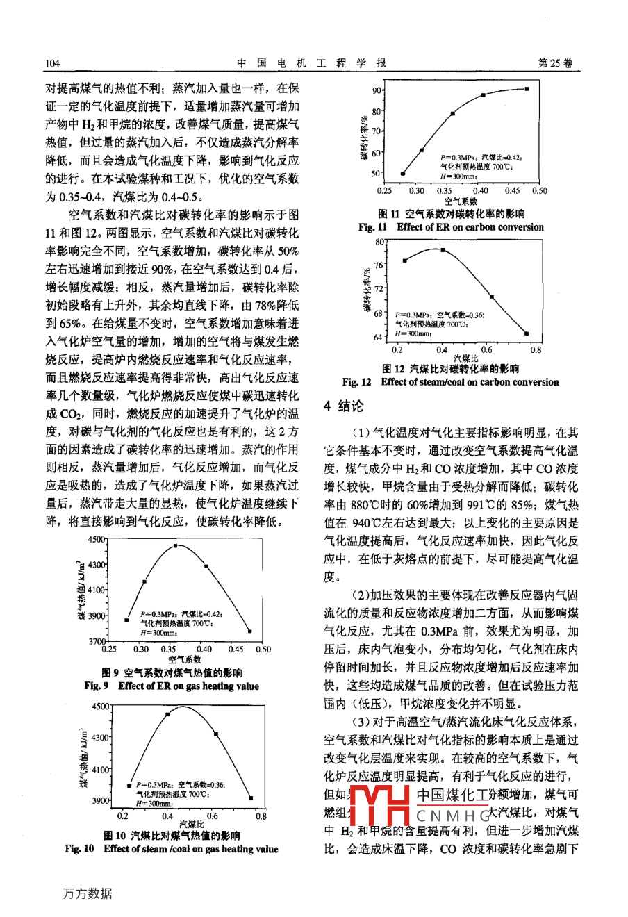 第25卷第23期中國電機工程學(xué)報Vol 25 No 23 Dec. 2005005年12月Proceedings of the CSeeC2005 Chin. Soc. for Elec Eng文章編號:0258-8013(2005)230100-06中圖分類號:TK24文獻標(biāo)識碼:A學(xué)科分類號:47020高溫氣化劑加壓噴動流化床煤氣化試驗研究肖睿,金保升,周宏倉,黃亞繼,仲兆平,章名耀東南大學(xué)潔凈煤燃燒與發(fā)電技術(shù)教育部重點實驗室,江蘇省南京市210096COAL GASIFICATION USING HIGH TEMPERATURE PREHEATED GASIFYINGAGENT INA PRESSURIZED SPOUT-FLUID BEDXIAO Rui, JIN Bao-sheng, ZHOU Hong-cang, HUANG Ya-ji, ZHONG Zhao-ping, ZHANG Ming-yaoEducation Ministry Key Laboratory on Clean Coal Power Generation and Combustion Technology, SoutheastUniversity, Nanjing 210096, JiangsABSTRACT: High temperature gasifying agent gasification of 1 Epal was performed in a 0.IMw thermal input pressurizedout-fluid. Effects of gasificationessure煤氣化技術(shù)是未來潔凈煤發(fā)電技術(shù)的基礎(chǔ),如uilibrium ratio. and the ratio of steam to coal on coal整體煤氣化聯(lián)合循環(huán)第二代增壓流化床聯(lián)合循壞,gasification behaviors were studied. The experimental results整體煤氣化—燃料電池和以煤氣化為核心的多聯(lián)indicated that gasification temperature was the most important產(chǎn)系統(tǒng)等等,國內(nèi)外研究者對此進行大量的研究工factor influenced coal gasification in the spout-fluid bed gasifie作。依據(jù)煤的不同組分和不同轉(zhuǎn)化階段的反應(yīng)特The gasification performance was improved at elevated性不同的特點,采用溫和的部分氣化方式將煤中高pressure due to the better fluidization in the reactor. The effects活性的部分轉(zhuǎn)化成煤氣,殘余的低活性半焦通過燃o(jì)f equilbrium ratio, and the ratio of steam to coal on coal燒方式加以利用,從而在總體投資和運行成本降低gasification were realized by changing the reaction temperature,的前提下,達到提高系統(tǒng)碳利用率目的,第二代增nd the two parameters had an optimum operating range forcertain coal gasification process壓流化床聯(lián)合循環(huán)發(fā)電技術(shù)正是基于此。提高氣化劑預(yù)熱溫度,可大幅度提高煤氣熱值,提高燃?xì)馔窫Y WORDS: Thermal power engineering; High temperature平入口溫度和燃燒穩(wěn)定性。隨著緊湊蜂窩式陶瓷蓄agent; Coal gasification; Spout-fluid bed; Process熱體高溫空氣預(yù)熱器等新工藝的開發(fā)成功,最近出現(xiàn)了應(yīng)用該加熱器產(chǎn)生的高溫空氣在卵石氣流床反摘要:在熱輸入0MW的小型加壓噴動流化床試驗裝置上應(yīng)器內(nèi)對生物質(zhì)、動物排泄物和煤氣化回的研究進行了高溫氣化劑煤氣化特性的試驗研究,考察了氣化溫報導(dǎo)。噴動流化床氣化爐由于存在中心高速射流,度、壓力、空氣系數(shù)和汽煤質(zhì)量比等工藝參數(shù)對高溫空氣特別適合處理強粘結(jié)性煤,此外,該反應(yīng)器對煤中蒸汽作為氣化介質(zhì)的煤氣化行為的影響試驗結(jié)果表明,在灰含量不敏感,爐溫又適宜脫硫劑進行爐內(nèi)脫硫所研究的工藝參數(shù)中,氣化溫度對高溫空氣媒氣化特性影響因此是高灰、高硫的劣質(zhì)煤氣化較理想的反應(yīng)器,最為顯著。壓力對氣化性能的影響主要體現(xiàn)在改善流化床氣而這些煤在我國儲量豐富,與其它流化床氣化爐類化爐床內(nèi)流化質(zhì)量空氣系數(shù)及汽媒比的影響從本質(zhì)上看是似,噴動流化氣化爐碳轉(zhuǎn)化率較低,而采用部分通過改變氣化反應(yīng)溫度來實現(xiàn)的,對于一個特定的流化床氣氣化-半焦燃燒的方式正好彌補該缺陷。此前我們研化工藝,空氣系數(shù)及汽煤比均存在一個適宜的操作區(qū)域究了氣化劑預(yù)熱溫度對煤部分特性的影響,研究結(jié)關(guān)鍵詞:熱能動力工程;高溫氣化劑;煤氣化;噴動流化床果表中國煤化工℃提高到70℃后工藝參數(shù);加壓煤 CNMHG于目前對高溫氣化基金項目:國家重點基礎(chǔ)研究發(fā)展規(guī)劃(2005cB21202)劑煤氣化研究甚少,在高溫氣化劑條件下氣化工藝Project Subsidized by the Special Funds for Major State Basic ResearchProjects of China (2005CB221202)參數(shù)(如氣化溫度、壓力、空氣系數(shù)及汽煤比等)匹第23期肖睿等:高溫氣化劑加壓噴動流化床煤氣化試驗研究配與優(yōu)化尚不清楚,基于此,本研究采用700℃的生成,溫度較高時甲烷濃度下降主要是由于生成的高溫空氣蒸汽作為氣化劑對煤流化床氣化工藝特甲烷在高溫下分解所致。氣化溫度較低時,雖然對性進行研究,旨在通過對高溫氣化劑下氣化工藝參甲烷的生成有利,但焦炭與氣化劑的氣化反應(yīng)變慢數(shù)與煤氣化行為關(guān)系的研究,掌握該新工藝優(yōu)化運尤其是焦炭與CO2發(fā)生的非均相反應(yīng)是強吸熱反行區(qū)間,為較大規(guī)模氣化裝置的設(shè)計與運行提供指應(yīng),溫度愈高,愈利于反應(yīng)的進行,此外,高溫也利于水煤氣反應(yīng)的進行,因此隨著氣化溫度的升高2試驗部分煤氣中CO濃度增加。同時,溫度上升,蒸汽分解率也隨之增加,H2濃度也有所增加。氣化溫度的增試驗在一臺內(nèi)徑為80mm,高4200mm的加壓加是以增大入爐空氣量,增加爐內(nèi)燃燒反應(yīng)程度獲噴動流化床裝置上進行,試驗用煤為徐州煙煤,試得的,繼續(xù)提高床溫后H2濃度降低也與燃燒反應(yīng)程驗裝置、試驗用煤的煤質(zhì)特性、試驗過程和測試方度加大有關(guān),即部分生成的H2與增加的空氣中的氧法參見文獻[0]。試驗主
