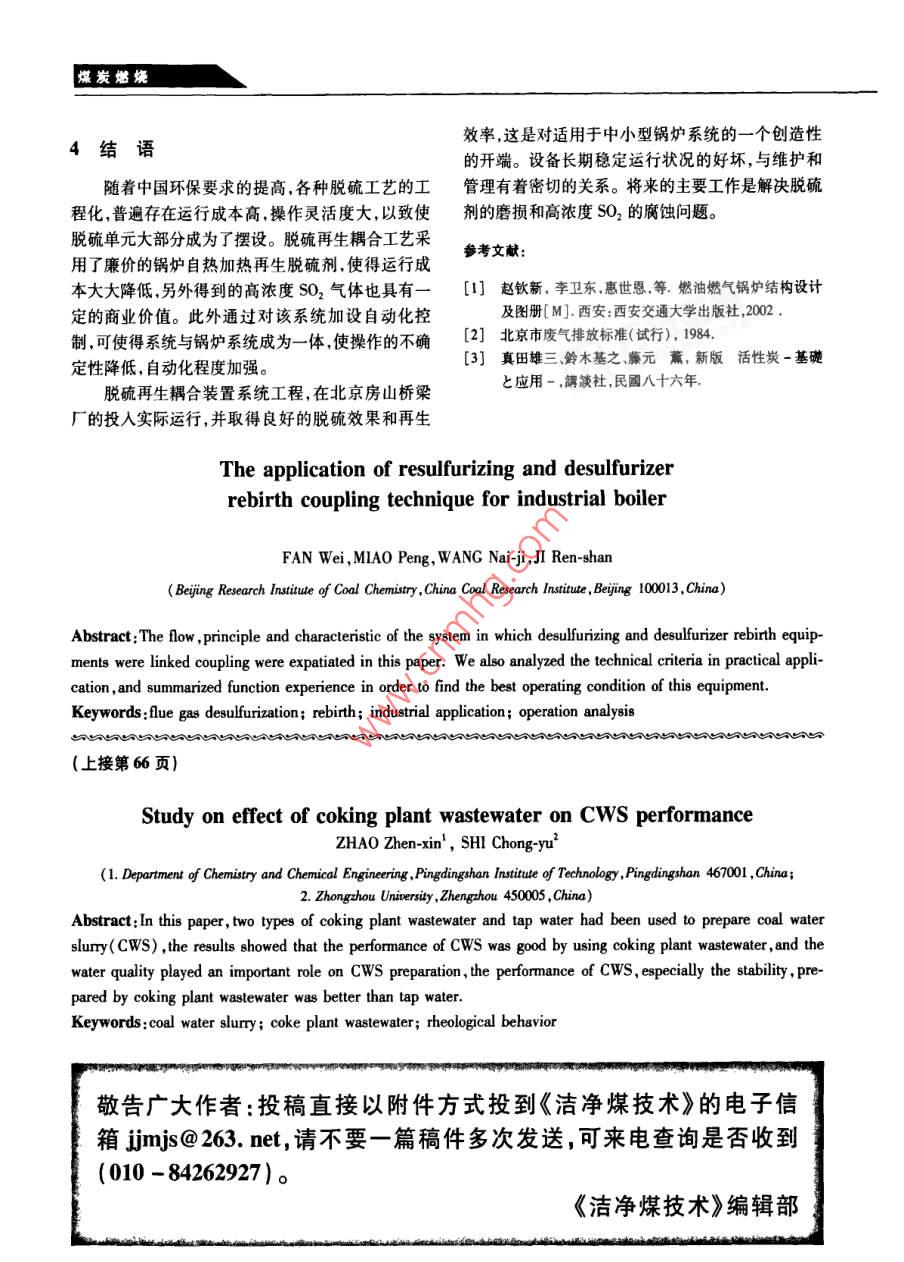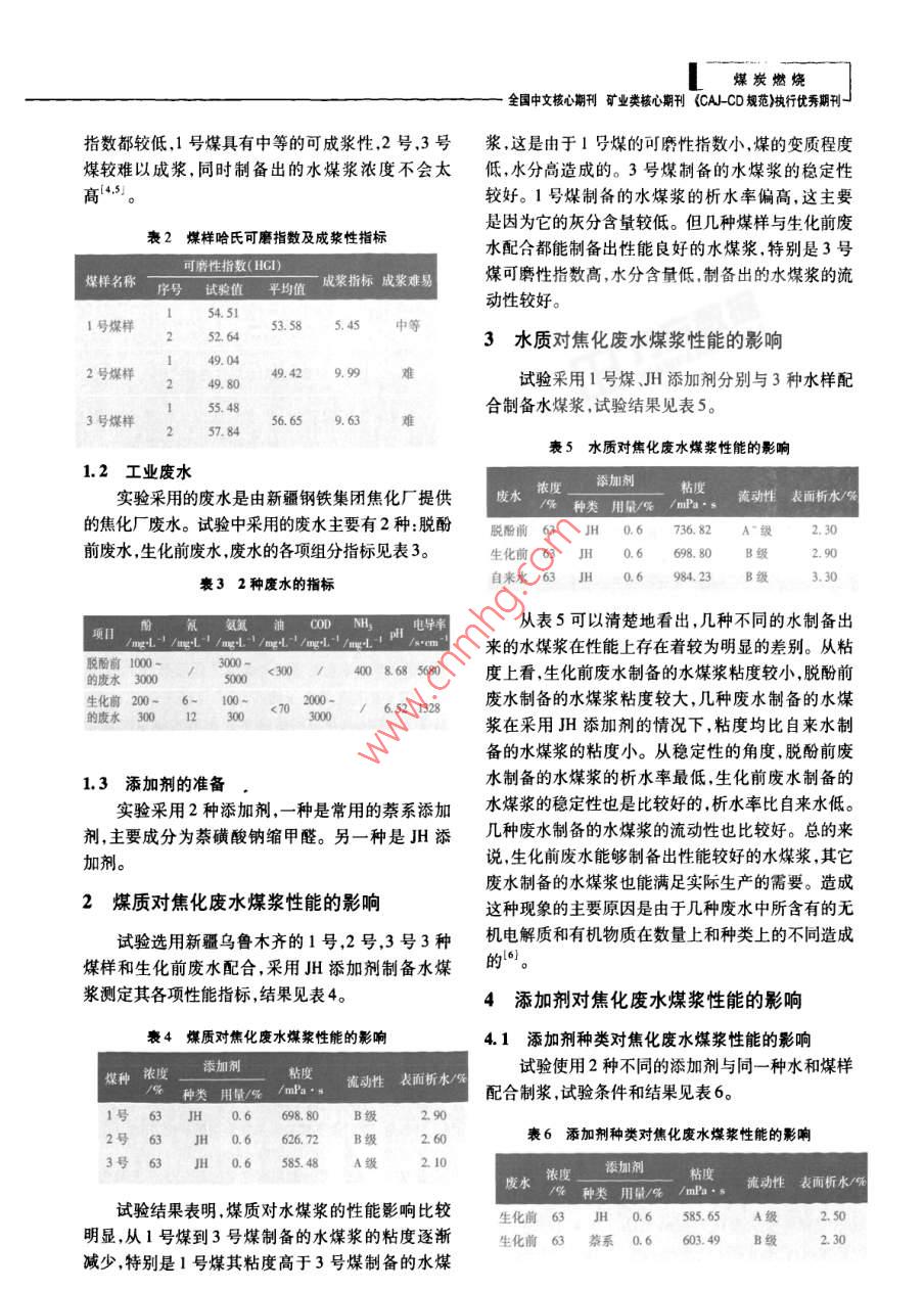 炭燃燒能化隆水制舒水漿的實(shí)驗(yàn)究趙振新!,時憧宇2(1.平頂山工學(xué)院化學(xué)化工系,河南平頂山467044;2.中州大學(xué),河南鄭州450005)摘要:采用3種新疆煤樣,用焦化廠2種焦化廢水制備出水煤漿,研究了成漿性能,并與自來水制備的水煤漿的性能進(jìn)行了比較,結(jié)果表明:用2種焦化廢水可以制備出性能較好的水煤漿,研究發(fā)現(xiàn)水質(zhì)是影響水煤漿性能的一個不可忽略的因素,而且焦化廢水制出的水煤漿在性能上,特別是在穩(wěn)定性方面比自來水好。關(guān)鍵詞:水煤漿;焦化廢水;流變性能中圖分類號:X784;TQ534.4文獻(xiàn)標(biāo)識碼:A文章編號:100672(2008)05004-03工業(yè)生產(chǎn)對環(huán)境造成的污染中很重要的一項(xiàng)就工業(yè)廢水種類繁多,筆者著重研究了新疆鋼鐵是水質(zhì)污染,這些污染大部分是由于工業(yè)廢水未加集團(tuán)公司焦化廠的2種工業(yè)廢水對水煤漿性能的影處理排放的結(jié)果。工業(yè)廢水的處理增加了生產(chǎn)成響。本,降低了生產(chǎn)效益。如果用工業(yè)廢水能制取性能良好的水煤漿則既可以減少環(huán)境污染又可以增加1實(shí)驗(yàn)部分制備水煤漿的用水來源,降低水煤漿的生產(chǎn)成本。11煤樣無疑這項(xiàng)研究具有良好的社會效益和經(jīng)濟(jì)效益。試試驗(yàn)采用的煤樣來源于新疆烏魯木齊的1號,2驗(yàn)所采用的新疆鋼鐵集團(tuán)公司焦化廠的工業(yè)廢水通號,3號煤。水煤漿制備過程中,煤中灰分和元素組常含有不同量的氨酚類氯化物氰化物、硫化物和成對制漿有很大的影響,表1為3個煤樣的工業(yè)分相當(dāng)數(shù)量的固體懸浮物或溶解物。顯然這些廢水外析和元素分析。由表1可以看出,煤樣均為低變質(zhì)排會造成環(huán)境污染。如果利用這些廢水來制備水煤程度煤,從理論上講成漿性較差。根據(jù)表1的數(shù)據(jù)漿,通過水煤漿的燃燒將其中有毒的有機(jī)物轉(zhuǎn)變成以及中國煤炭成漿難易判斷指標(biāo)可知,1號,2號,3無毒的水和二氧化碳,無疑具有環(huán)保意義口號煤屬于較難制漿的煤。雖然人們對水煤漿進(jìn)行了廣泛研究,但是專門研究水質(zhì)影響的文章不多,因?yàn)樗簼{是由大約襄1煤樣的工業(yè)分析和元章分析70%煤、29%水和1%左右的添加劑制備的煤、固液工業(yè)分析元素分析分散體系,其中29%的水是影響水煤漿性能的不可名稱M。L. v.Fc-忽略的因素。大多數(shù)專家對水煤漿研究是在蒸餾水號煤591254615.7157.45112104018或去離子水存在的條件下進(jìn)行的,而實(shí)際生產(chǎn)中不2號煤6.219.7436.8445.2620.8165.634.789.651.01103可能用如此多的蒸餾水和去離子水來制備水煤漿3號煤1899.3036.6249.4423.1370.264.%68.361.161.32水有地表水、地下水、工業(yè)廢水等各種水質(zhì),這些水含有的離子不同膠體含量不同、水的硬度不同pH般情況下,煤漿濃度與哈氏可磨性指數(shù)的關(guān)值不同研究各種水質(zhì)對水煤漿性能的影響可以為系呈正相關(guān)。3個煤樣的可磨性指數(shù)及相應(yīng)的成漿工業(yè)應(yīng)用尋找合適的水源13。性指標(biāo)見表2。由表2可以看出提新疆煤樣可磨性收稿日期:2008-07-01作者簡介:趙振新(172-),女河北唐山人,士,副教授主要從事煤化工及有機(jī)臺成方面的研究。煤炭燃燒全國中文核心期刊礦業(yè)類核心期刊《CAcD規(guī)范》執(zhí)行優(yōu)秀期刊指數(shù)都較低,1號煤具有中等的可成漿性,2號,3號漿,這是由于1號煤的可磨性指數(shù)小,煤的變質(zhì)程度煤較難以成漿,同時制備出的水煤漿濃度不會太低,水分高造成的。3號煤制備的水煤漿的穩(wěn)定性髙*。較好。1號煤制備的水煤漿的析水率偏高,這主要是因?yàn)樗幕曳趾枯^低。但幾種煤樣與生化前廢表2煤樣哈氏可磨指數(shù)及成漿性指標(biāo)水配合都能制備出性能良好的水煤漿特別是3號可磨性指數(shù)(HGI)煤樣名稱序號試驗(yàn)值平均成裝指標(biāo)成裝難易煤可性指數(shù)高水分含量低制備出的水煤漿的流54.51動性較好。1號煤樣53.583水質(zhì)對焦化廢水煤漿性能的影響49.042號煤樣42249.80試驗(yàn)采用1號煤、JH添加劑分別與3種水樣配155.48合制備水煤漿,試驗(yàn)結(jié)果見表5。3號煤樣257.84表5水質(zhì)對焦化廢水煤漿性能的影響1.2工業(yè)廢水添加劑實(shí)驗(yàn)采用的廢水是由新疆鋼鐵集團(tuán)焦化廠提供廢水粘度%種類用量/%/mPa流動性表面析水/的焦化廠廢水。試驗(yàn)中采用的廢水主要有2種:脫酚脫形前63H0.675.82A級2.30前廢水生化前廢水,廢水的各項(xiàng)組分指標(biāo)見表3。生化前63ⅢH0.6698.80B級32種廢水的指標(biāo)自來水630.6984.23B級3.30氰氨氮油電導(dǎo)率從表5可以清楚地看出,幾種不同的水制備出來的水煤漿在性能上存在著較為明顯的差別。從粘脫酚前1000的廢水3005∞0∞0∞0868560度上看,生化前廢水制備的水煤漿粘度較小,脫酚前生化前200-6100<70廢水制備的水煤漿粘度較大,幾種廢水制備的水煤的廢水300123006.521328漿在采用JH添加劑的情況下,粘度均比自來水制備的水煤漿的粘度小。從穩(wěn)定性的角度,脫酚前廢1.3添加荊的準(zhǔn)備水制備的水煤漿的析水率最低,生化前廢水制備的實(shí)驗(yàn)采用2種添加劑,一種是常用的萘系添加水煤漿的穩(wěn)定性也是比較好的,析水率比自來水低。劑,主要成分為萘磺酸鈉縮甲醛。另一種是JH添幾種廢水制
