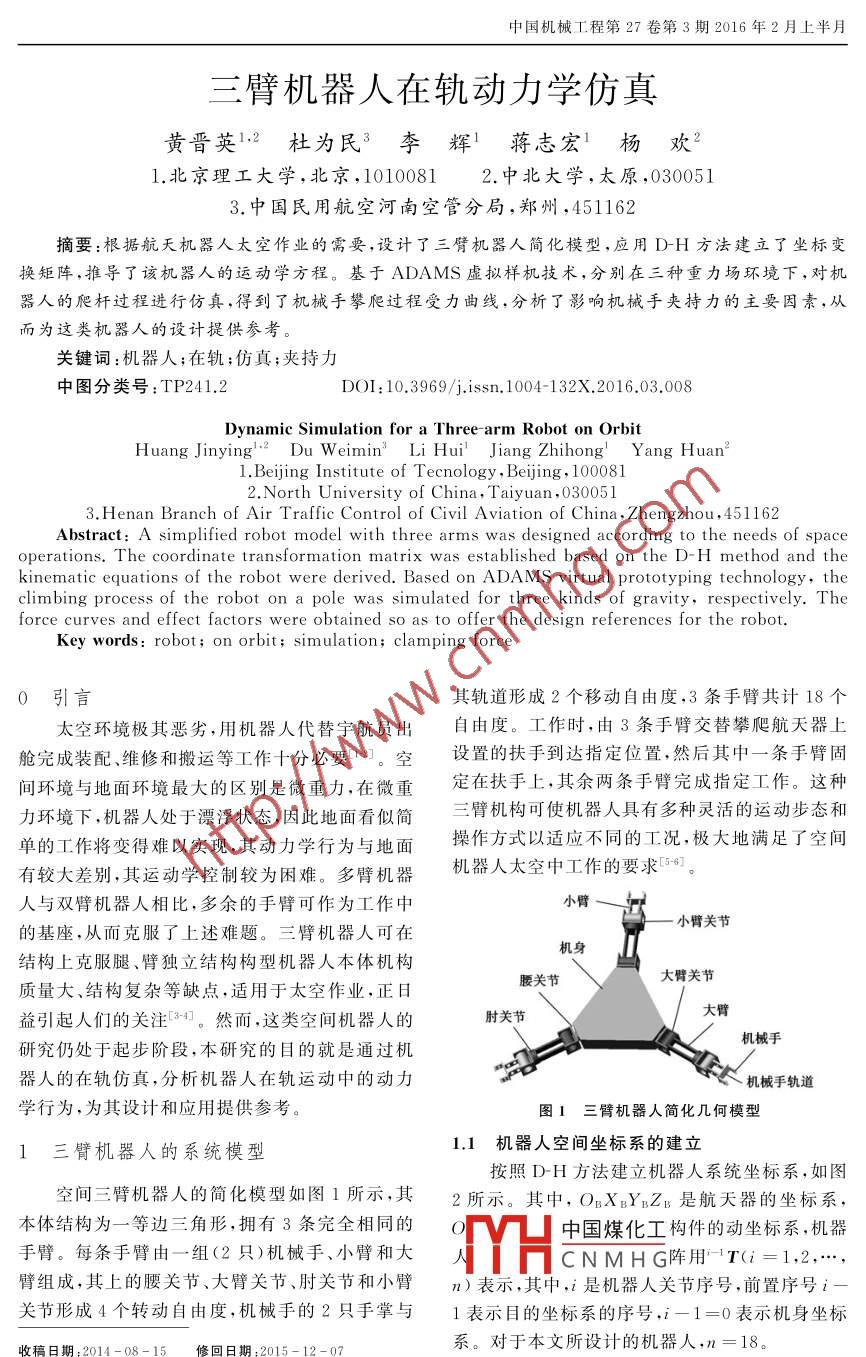 中國機械工程第27卷第3期2016年2月上半月臂機器人在軌動力學仿真黃晉英1:2杜為民3李輝蔣志宏楊歡21.北京理工大學,北京,10100812.中北大學,太原,0300513.中國民用航空河南空管分局,鄭州,451162摘要:根據(jù)航天機器人太空作業(yè)的需要,設計了三臂機器人簡化模型,應用DH方法建立了坐標變換矩陣,推導了該機器人的運動學方程?;?ADAMS虛擬樣機技術(shù),分別在三種重力場環(huán)境下,對機器人的爬桿過程進行仿真,得到了機械手攀爬過程受力曲線,分析了影響機械手夾持力的主要因素,從而為這類機器人的設計提供參考關(guān)鍵詞:機器人;在軌;仿真;夾持力中圖分類號:TP241.2DOI:10.3969/1issn.1004-132X.2016.03.008Dynamic Simulation for a Three-arm Robot on OrbitHuang Jinying Du Weimin' Li Hui Jiang Zhihong Yang Huan1. Beijing Institute of Tecnology, Beijing, 1000812. North University of China, Taiyuan, 0300513. Henan Branch of Air Traffic Control of Civil Aviation of China, Zhengzhou, 451162Abstract: A simplified robot model with three arms was designed according to the needs of spaceoperations. The coordinate transformation matrix was established based on the D-H method and thekinematic equations of the robot were derived. Based on ADAMS virtual prototyping technology, theclimbing process of the robot on a pole was simulated for three kinds of gravity, respectively. Theforce curves and effect factors were obtained so as to offer the design references for the robotKey words: robot; on orbit; simulation; clamping force0引言其軌道形成2個移動自由度,3條手臂共計18個太空環(huán)境極其惡劣,用機器人代替宇航員出自由度。工作時,由3條手臂交替攀爬航天器上艙完成裝配維修和搬運等工作十分必要121??赵O置的扶手到達指定位置,然后其中一條手臂固間環(huán)境與地面環(huán)境最大的區(qū)別是微重力,在微重定在扶手上,其余兩條手臂完成指定工作。這種力環(huán)境下,機器人處于漂浮狀態(tài),因此地面看似簡三臂機構(gòu)可使機器人具有多種靈活的運動步態(tài)和單的工作將變得難以實現(xiàn),其動力學行為與地面操作方式以適應不同的工況,極大地滿足了空間有較大差別,其運動學控制較為困難。多臂機器機器人太空中工作的要求人與雙臂機器人相比,多余的手臂可作為工作中小臂的基座,從而克服了上述難題。三臂機器人可在小臂關(guān)節(jié)機身結(jié)構(gòu)上克服腿、臂獨立結(jié)構(gòu)構(gòu)型機器人本體機構(gòu)質(zhì)量大、結(jié)構(gòu)復雜等缺點,適用于太空作業(yè),正日腰關(guān)節(jié)大臂關(guān)節(jié)益引起人們的關(guān)注34。然而,這類空間機器人的肘關(guān)節(jié)大臂研究仍處于起步階段,本研究的目的就是通過機機械手器人的在軌仿真,分析機器人在軌運動中的動力機械手軌道學行為,為其設計和應用提供參考圖1三臂機器人簡化幾何模型1三臂機器人的系統(tǒng)模型1.1機器人空間坐標系的建立按照D-H方法建立機器人系統(tǒng)坐標系,如圖空間三臂機器人的簡化模型如圖1所示,其2所示。其中,O1XnY1ZB是航天器的坐標系本體結(jié)構(gòu)為一等邊三角形,擁有3條完全相同的手臂。每條手臂由一組(2只)機械手、小臂和大dYH中國煤化工構(gòu)件的動坐標系,機器CNMHG陣用T(=1,2臂組成,其上的腰關(guān)節(jié)、大臂關(guān)節(jié)、肘關(guān)節(jié)和小臂n)表示,其中,是機器人關(guān)節(jié)序號,前置序號關(guān)節(jié)形成4個轉(zhuǎn)動自由度,機械手的2只手掌與1表示目的坐標系的序號,-1=0表示機身坐標收稿日期:2014-08-15修回日期:2015-12-07系。對于本文所設計的機器人,n=18·328三臂機器人在軌動力學仿真—黃晉英杜為民李輝等因此推導出三臂機器人每條臂的坐標變化矩陣為T=TBT1T2…T則機械臂末端在航天器坐標系下的位姿坐標可表示為(3)式中,P為航天器的位姿坐標。三臂機器人的仿真模型Z2.1機器人的簡化幾何模型級在ProE軟件中建立三臂機器人的簡化模型,直接將裝配好的模型導入 ADAMS軟件中進行仿圖2三臂機器人空間坐標系真,其簡化模型如圖1所示。該模型僅包含實現(xiàn)機1.2機器人運動學方程的建立器人運動所必需的機械構(gòu)件,其余附件及電機等未機器人是由一系列具有空間彎曲軸線的廣義涉及,簡化模型的主要幾何參數(shù)如圖4所示連桿連接在一起構(gòu)成的。根據(jù)三臂機器人的實際參數(shù),可確定該模型的D-H參數(shù),推導出三臂機器人的運動學方程方程。記機器人的任意兩中100個關(guān)節(jié)序號分別為i和i-1,如圖3所示,固連在該2個關(guān)節(jié)上的動坐標系Z軸間的空間夾角(連桿扭角)為a,,空間最小距離(連桿長度)為b;,2個關(guān)節(jié)公垂線間的距離為d2,2個關(guān)節(jié)X軸間的空間夾角(連桿夾角)為圖4機器人簡化模型的主要幾何參數(shù)2.2仿真模型建立關(guān)節(jié)2.2.1模型質(zhì)量設從ProE中導入的幾何模型是沒有質(zhì)量的,關(guān)節(jié)-1在仿真前必須對各部件進行質(zhì)量設置。本研究選用 ADAMS軟件材料庫中的鈦合金,并在重力圖3廣義連桿變換的4個特征參數(shù)D-H參數(shù)( Gravity)選項中將重力設置為無重力(模擬微重上述D-H參數(shù)可通過如下兩次旋轉(zhuǎn)和兩次力狀態(tài))或g/6(模擬月球環(huán)境重力)1),g為重平移坐標變換從坐標系OXYZ變換到坐標系力加速度O,-1X1Y-1Z:1810:①將坐標系OX,YZ;繞2.2.2運動約束設置X1旋轉(zhuǎn)a:角,使Z:與Z1軸位于同一平面內(nèi)在 ADAMS/View環(