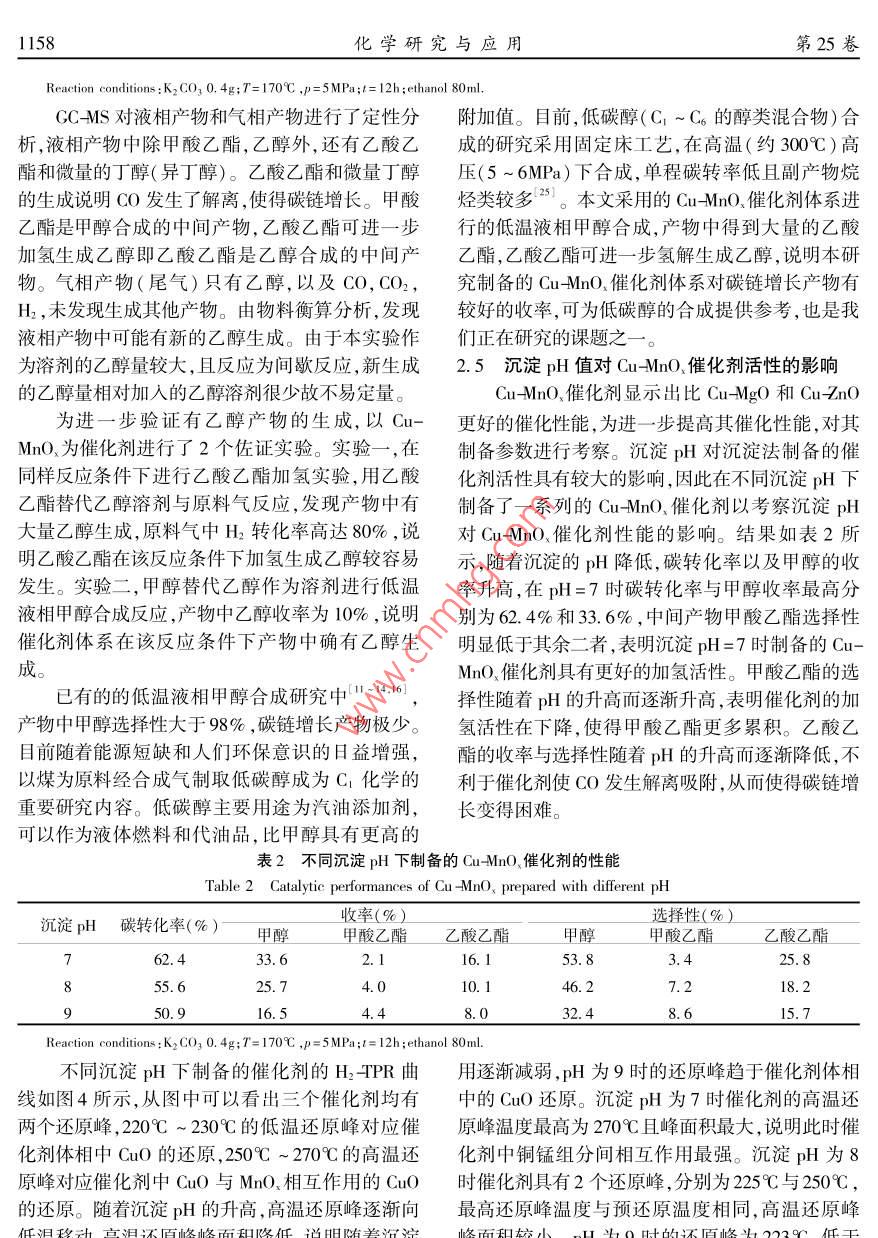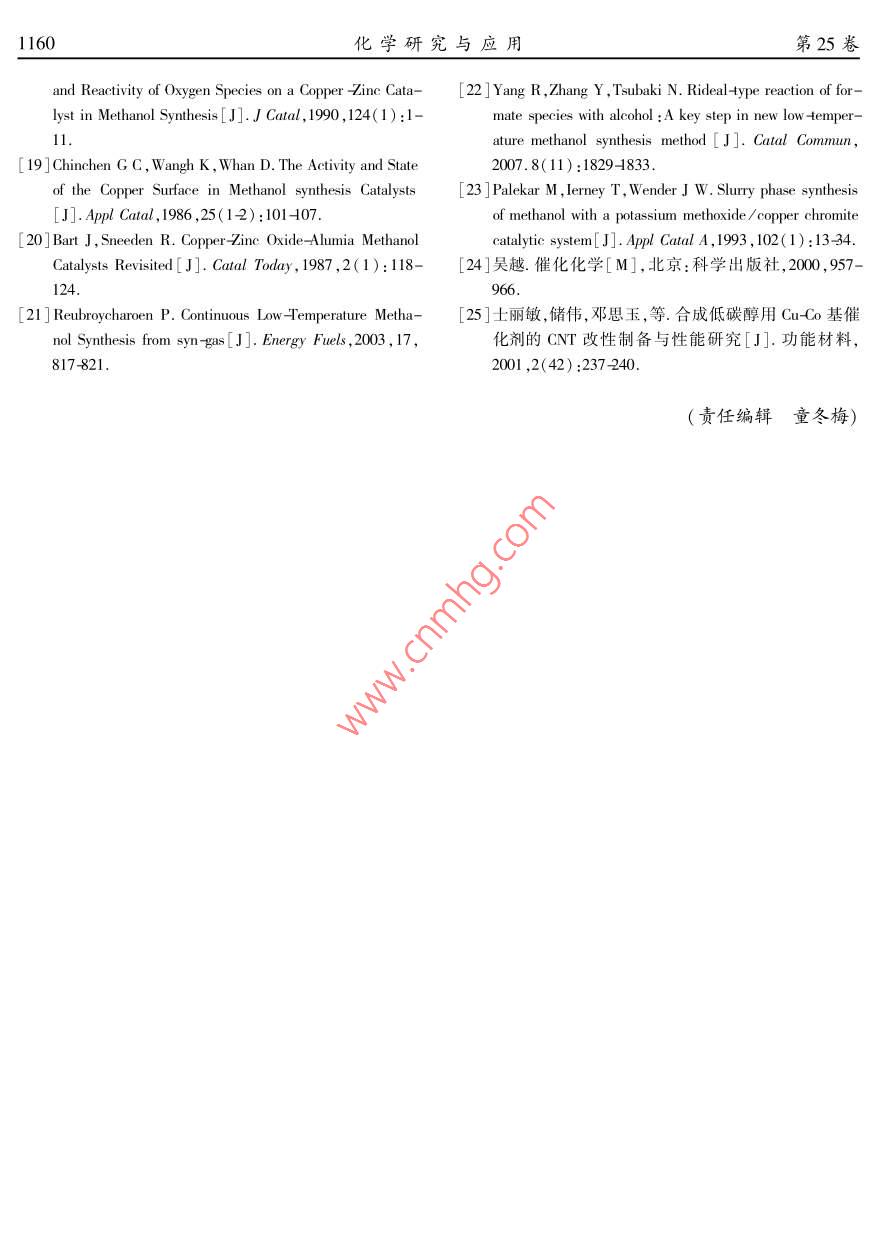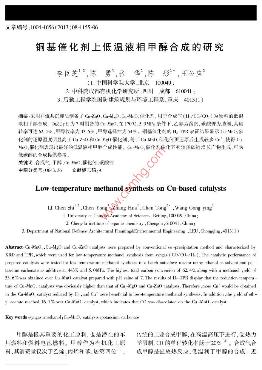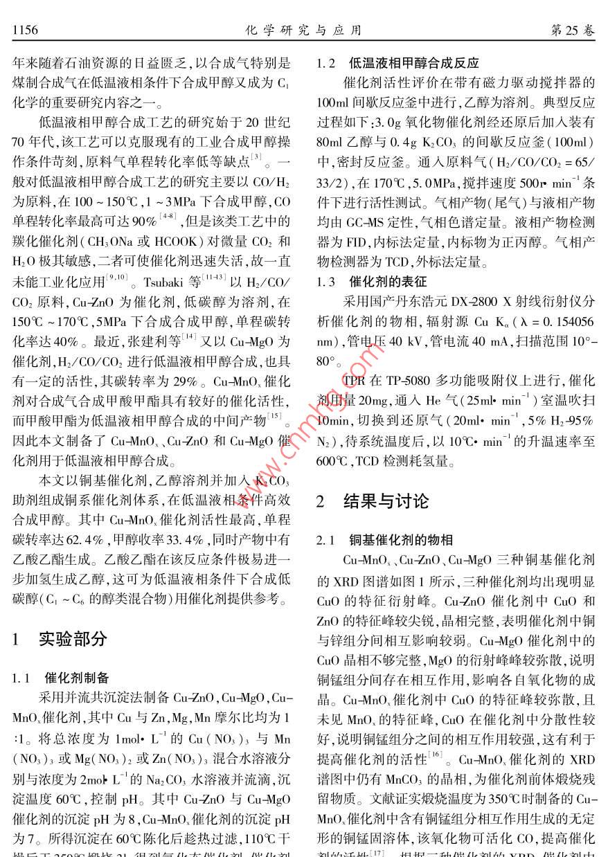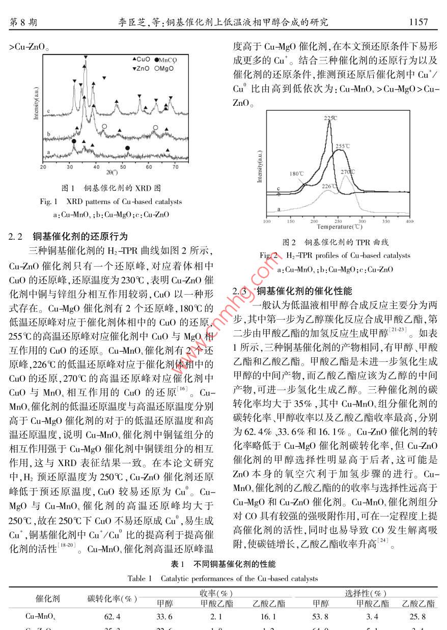 文章編號(hào):1004-1656(203)08-115546銅基催化劑上低溫液相甲醇合成的研究李臣芝2,陳勇3,張華2,陳彤2,王公應(yīng)2(1.中國科學(xué)院大學(xué),北京1000492.中科院成都有機(jī)化學(xué)研究所,四川成都6100413.后勤工程學(xué)院國防建筑規(guī)劃與環(huán)境工程系,重慶401311)摘要:采用并流共沉淀法制備了 Cu-Zno、 Cu-Mgo、 Cu-Mno催化劑,用于合成氣(H2/CO/CO2)為原料的低溫液相甲醇合成。沉淀pH為7時(shí)制備的 Cu-Mno在170℃,5.0MPa條件下,乙醇為溶劑,碳酸鉀為助劑,其碳轉(zhuǎn)率可達(dá)62.4%,甲醇收率為33.6%,甲醇選擇性為54%。銅基催化劑的H2TPR表征結(jié)果顯示 Cu-MnO.催化劑的還原溫度明顯高于 Cuno和 Cu-Mgo催化劑,利于Cu-MnO催化劑預(yù)還原后生成較多Cu,使得CuMnO催化劑表現(xiàn)出最好的低溫液相甲醇合成性能。 Cu-MnO催化劑催化下有較多碳鏈增長產(chǎn)物生成,可為低碳醇的合成提供參考。關(guān)鍵詞:合成氣;甲醇; Cu-Mno催化劑;碳酸鉀中圖分類號(hào):0643.36文獻(xiàn)標(biāo)志碼:ALow-temperature methanol synthesis on Cu-based catalystsLI Chen-zhi, Chen Yong Zhang Hua, Chen Tong, Wang Gong ying1. University of Chinese Academy of Sciences, Beijing, 100049, ChinaChengdu institute of organic chemistry Chengdu 610041, China3. Department of National Defence Architectural Planning& Environmental Engineering, LEU, Chongqing, 401311stract: Cu-MnO,, Cu-MgO and Cu-ZnO catalysts were prepared by conventional co precipitation method and characterized byXRD and TPR, which were used for low temperature methanol synthesis from syngas( CO/CO2/H,). The catalytic performance ofprepared catalysts were tested for low temperature methanol synthesis in a batch autoclave reactor using ethanol as solvent and ptassium carbonate as additive at 443 K and 5. OMPa. The highest total carbon conversion of 62. 4% along with a methanol yield of33. 6% was obtained over Cu-MnO, catalyst prepared with pH value of 7. The results of H2 -TPR display that the reduction temperature of Cu-MnO, catalysts was obviously higher than that of Cu -MgO and Cu-ZnO catalysts. Therefore, more Cu would be obtainedin the Cu-MnO, catalyst reduced by H2, and Cu were beneficial to low temperature methanol synthesis. In addition, the yield of ethyl acetate reached 16. 1 %o over Cu-MnO, catalyst, which indicates that CO was dissociated on the Cu -MnO, catalystKey words syngas methanol Cu-MnO, catalysts; potassium carbonate甲醇是極其重要的化工原料,也是潛在的車傳統(tǒng)的工業(yè)合成甲醇,在高溫高壓下進(jìn)行,受熱力用燃料和燃料電池燃料。甲醇作為有機(jī)化工原學(xué)限制,CO的單程轉(zhuǎn)化率低于20%2。合成氣合料,其消費(fèi)量僅次于乙烯、丙烯和苯,居第四位"。成甲醇是強(qiáng)放熱反應(yīng),低溫利于甲醇的合成。近1156化學(xué)研究與應(yīng)用第25卷年來隨著石油資源的日益匱乏,以合成氣特別是1.2低溫液相甲醇合成反應(yīng)煤制合成氣在低溫液相條件下合成甲醇又成為C催化劑活性評價(jià)在帶有磁力驅(qū)動(dòng)攪拌器的化學(xué)的重要研究內(nèi)容之100ml間歇反應(yīng)釜中進(jìn)行,乙醇為溶劑。典型反應(yīng)低溫液相甲醇合成工藝的研究始于20世紀(jì)過程如下:3:.0g氧化物催化劑經(jīng)還原后加入裝有70年代,該工藝可以克服現(xiàn)有的工業(yè)合成甲醇操80ml乙醇與0.4gK2CO3的間歇反應(yīng)釜(100m)作條件苛刻,原料氣單程轉(zhuǎn)化率低等缺點(diǎn)中,密封反應(yīng)釜。通入原料氣(H2/COCO2=65/般對低溫液相甲醇合成工藝的研究主要以CO/H2332),在170℃,5.0MPa,攪拌速度500rmin條為原料,在100~150℃,1~3MPa下合成甲醇,CO件下進(jìn)行活性測試。氣相產(chǎn)物(尾氣)與液相產(chǎn)物單程轉(zhuǎn)化率最高可達(dá)90%,但是該類工藝中的均由GCMS定性,氣相色譜定量。液相產(chǎn)物檢測羰化催化劑(CH3ONa或 HCOOK)對微量CO2和器為FID,內(nèi)標(biāo)法定量,內(nèi)標(biāo)物為正丙醇。氣相產(chǎn)H2O極其敏感,二者可使催化劑迅速失活,故一直物檢測器為TCD,外標(biāo)法定量未能工業(yè)化應(yīng)用。 Tsubaki等"以H2/CO/1.3催化劑的表征CO2原料, Cu-Zno為催化劑,低碳醇為溶劑,在采用國產(chǎn)丹東浩元DX2800X射線衍射儀分l50℃~170℃,5MPa下合成合成甲醇,單程碳轉(zhuǎn)析催化劑的物相,輻射源CuK。(A=0.154056化率達(dá)40%。最近,張建利等又以 Cu-Mgo為m),管電壓40kV,管電流40mA,掃描范圍10°催化劑,H2/CO/CO2進(jìn)行低溫液相甲醇合成,也具80°。有一定的活性,其碳轉(zhuǎn)率為29%。 Cu-Mno、催化TPR在TP5080多功能吸附儀上進(jìn)行,催化劑對合成氣合成甲酸甲酯具有較好的催化活性,劑用量20mg,通入He氣(25mmin-)室溫吹掃而甲酸甲酯為低溫液相甲醇合成的中間產(chǎn)物。10min,切換到還原氣(20mmin1,5%H295%因此本文制備了 CuMnO、CunO和 Cu-g0催N2),待系統(tǒng)溫度后,以10℃·min的升溫速率至化劑用于低溫液相甲醇合成。600℃,TCD檢測耗氫量。本文以銅基催化劑,乙醇溶劑并加入K2CO3助劑組成銅系催化劑體系,在低溫液相條件高效2結(jié)果與討論合成甲醇。其中 Cu-MnO催化劑活性最高,單程碳轉(zhuǎn)率達(dá)62.4%,甲醇收率33.4%,同時(shí)產(chǎn)物中有2.1銅基催化劑的物相乙酸乙酯生成。乙酸乙酯在該反應(yīng)條件極易進(jìn)Cu-MnO、、 Cu-no、 CumEc三種銅基催化劑步加氫生成乙醇,這可為低溫液相條件下合成低的XRD圖譜如圖1所示,三種催化劑均出現(xiàn)明顯碳醇(C1~C6的醇類混合物)用催化劑提供參考。C10的特征衍射峰。 CuNo催化劑中CnO和ZnO的特征峰較尖銳,晶相完