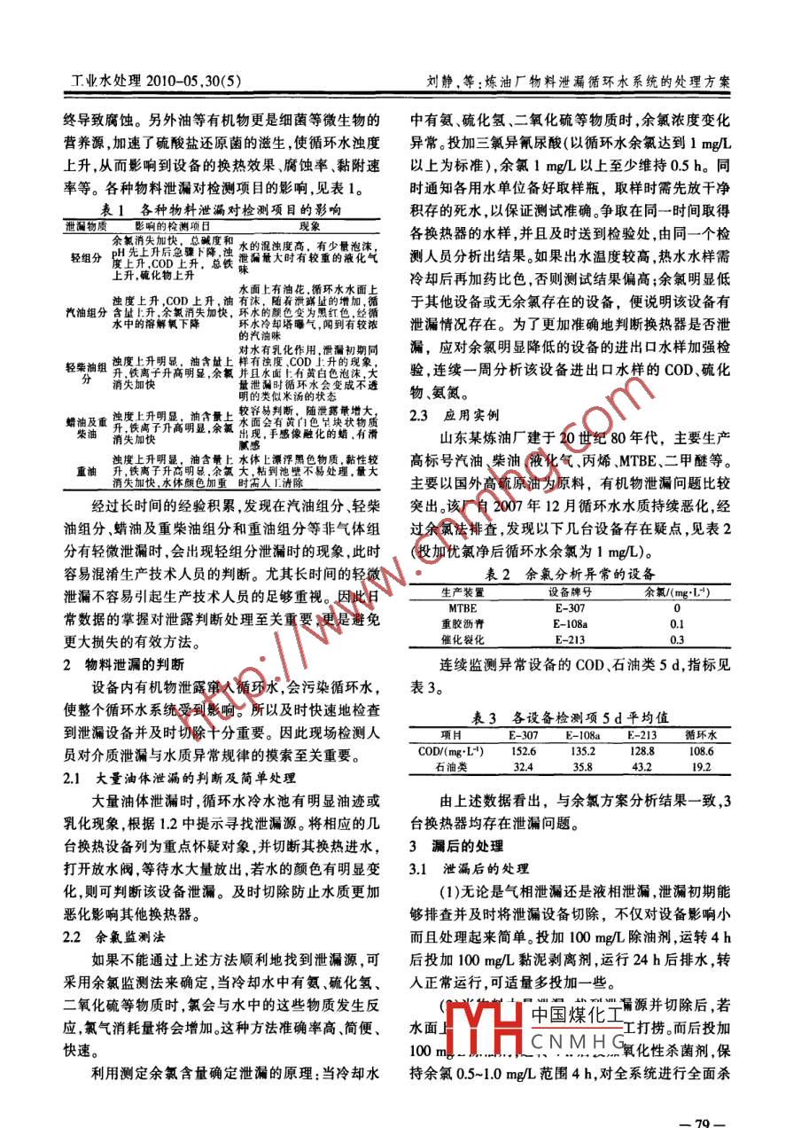 第30卷第5期工業(yè)水處理Vol.30 No.52010年5月Industrial Water TreatmentMay ,2010經(jīng)驗交流煉油廠物料泄漏循環(huán)水系統(tǒng)的處理方案靜,王雪,王宏,王欣",胡科先3(1.中海油天津化工研究設(shè)計院,天津300131;2.中海油能源發(fā)展股份有限公司采油 技術(shù)服務(wù)分公司,天津300452;3.中國石油長慶油田第一采氣廠 ,陜西靖邊718500)[摘要]越來越多的劣質(zhì)原油成為了煉油廠的加工對象,增加了物料泄漏的頻率,所以及時快速地檢查到泄漏設(shè)備并及時切除非常重要。泄漏后及時的處理更是換熱設(shè)備正常運行的保證。介紹了泄漏后的相關(guān)處理方案。[關(guān)鍵詞]循環(huán)水;泄漏;水處理[中團分類號] TQ085.41 [文獻標識碼]B [文章編號] 1005- -829X(2010)05 -0078-03Treatment of organic matter leakage from circulating water systemin refineriesLiu Jing', Wang Xue', Wang Hong' , Wang Xin? ,Hu Kexian'(1.CNOOC Tianjian Research & Design Instiue of Chemical Industry , Tianjin 300131 ,China;2. CNOOC Energy Technology & Services 0ifield Technology Srvice Co. , Tianjin 300452, China;3.No.1 Gas Plant PetroChina Changqing Oil Field Company, Jingbian 718500, China)Abstract: More and more inferior crude oil has become the processed object for the oil refinery , increasing the fre-quency of the organic matter leakage. It is very important to examine the leaking equipment quickly and eliminatethe leakage in time. Immediate treatment after the organic matter leakage is the guarantee of normal running for theheat exchange equipment.Key words: circulating water; leakage ; water treatment隨著經(jīng)濟的快速發(fā)展,各國對石油資源的需求換熱器泄露后,物料進人循環(huán)水,對pH和總堿度影不斷增加,而石油資源又不可再生,因此更多的劣質(zhì)響較大,泄漏初期堿度和pH明顯上升,一段時間后原油成為了煉油廠的加工對象。隨之而來的是強腐急劇下降,這是由硫化細菌和硝化細菌引起的。蝕性的物質(zhì)對換熱設(shè)備的腐蝕越來越嚴重,增加了一般壓縮氣中含2 000~3 000 mg/L的硫化物,物料泄漏的頻率,換熱設(shè)備介質(zhì)泄漏就成了煉油廠液化氣中含1 500~2 500 mg/L的硫化物。水中硫酸普遍存在的一個問題,而目前缺乏適用于大多數(shù)煉菌將循環(huán)水中硫化物轉(zhuǎn)化成硫酸,pH會降到<7,超油廠的查漏儀器。對循環(huán)水系統(tǒng)來講,一臺換熱器出了一般水處理劑的應(yīng)用條件,系統(tǒng)中的有機磷和泄漏,整個系統(tǒng)將會受到影響,所以及時快速檢查到鋅鹽被破壞,最終導(dǎo)致循環(huán)水中的pH降低,總磷升泄漏設(shè)備并及時處理非常重要。高,鋅濃度低。分析幾次輕組分泄漏,發(fā)現(xiàn)一般泄漏1各類物質(zhì)泄漏的狀態(tài)周期較長,有時上述現(xiàn)象會持續(xù)3個月以上,漏點1.1 冷卻器殼程的氣態(tài)介質(zhì)不易查出。冷卻器殼程的氣態(tài)介質(zhì),大多數(shù)是石油加工過.2 C.以上組分泄漏程中形成的熱分解產(chǎn)物。液化氣、壓縮富氣酸性氣C4以上組分泄漏時,水面油跡明顯。有機物會體等Cr~C4輕組分中除了含烷烴外,還含有烯烴及引起系統(tǒng)循環(huán)水濁度升高,懸浮物.COD上升。換熱N2、HS .CO2.CO等成分,在形成過程中部分氣體中器內(nèi)中國煤化工身,造成油膜的導(dǎo)的HS.NH,等含量相當高。從催化裂化車間分離器熱性|YHCNMHG首先影響的是換等分離出來的污水(酸性水)中HS、NH3-N等質(zhì)量熱效果,其次當油膜附著管壁后,阻止了緩蝕阻垢劑濃度均達到2000~6 000 mng/L。當酸性水汽提部分與金屬表面的接觸,使保護膜不能充分發(fā)揮作用,最- 78-.工業(yè)水處理2010- -05 ,30(5)劉靜,等:煉油廠物料泄漏循環(huán)水系統(tǒng)的處理方案終導(dǎo)致腐蝕。另外油等有機物更是細菌等微生物的中有氨硫化氫.二氧化硫等物質(zhì)時,余氯濃度變化營養(yǎng)源,加速了硫酸鹽還原菌的滋生,使循環(huán)水濁度異常。投加三氯異氰尿酸(以循環(huán)水余氯達到1 mg/L上升,從而影響到設(shè)備的換熱效果、腐蝕率、黏附速以上為標準),余氯1 mg/L以上至少維持0.5h。同率等。各種物料泄漏對檢測項目的影響,見表1。.時通知各用水單位備好取樣瓶,取樣時需先放干凈表1各種物料泄漏對檢測項目的影響積存的死水,以保證測試準確。爭取在同一時間取得泄瀾物質(zhì)影響的檢測項目現(xiàn)象余氯消失加快總堿度和水的混濁度高,有少量泡各換熱器的水樣,并且及時送到檢驗處,由同一個檢輕組分H先上開后急騁下降,獨他湖最大時有較重的液化i測人員分析出結(jié)果。如果出水溫度較高熱水水樣需上開,碗化物上升水面上有油花.循環(huán)水水面上冷卻后再加藥比色,否則測試結(jié)果偏高;余氯明顯低獨度上升,COD上升,油有淶隨著泄鮮址的增加,循于其他設(shè)備或無余氯存在的設(shè)備,便說明該設(shè)備有汽油組分第苗戰(zhàn)眾失加快,林水的售設(shè)為限紅經(jīng)體泄漏情況存在。為了更加準確地判斷換熱器是否泄的汽油味*對水有乳化作用,滑漏初期同漏,應(yīng)對余氯明顯降低的設(shè)備的進出口水樣加強檢輕柴抽組升鐵離十升高明顯,余氟井且水城上有黃白色泡珠,大驗,連續(xù)一周分析該設(shè)備進出口水樣的COD、硫化分消失加快量泄瀾時循環(huán)水會變成不透物、氨氮。明的類似米湯的狀態(tài)較容易判斷,隨泄露最增大:2.3 應(yīng)用實例蠟油及重成工合上水面會有黃門色室塊狀物質(zhì)柴油消失加快開離明亞,余