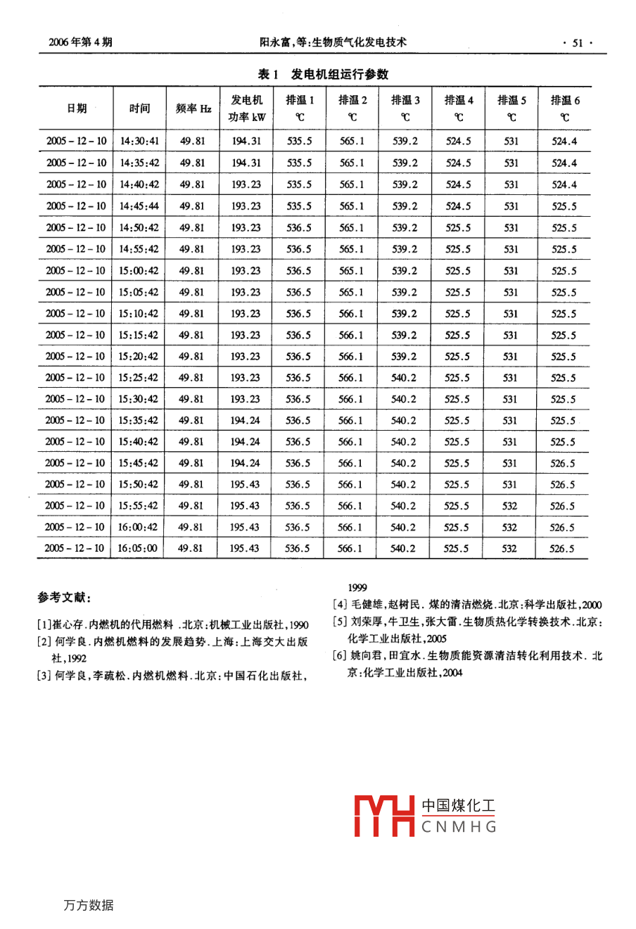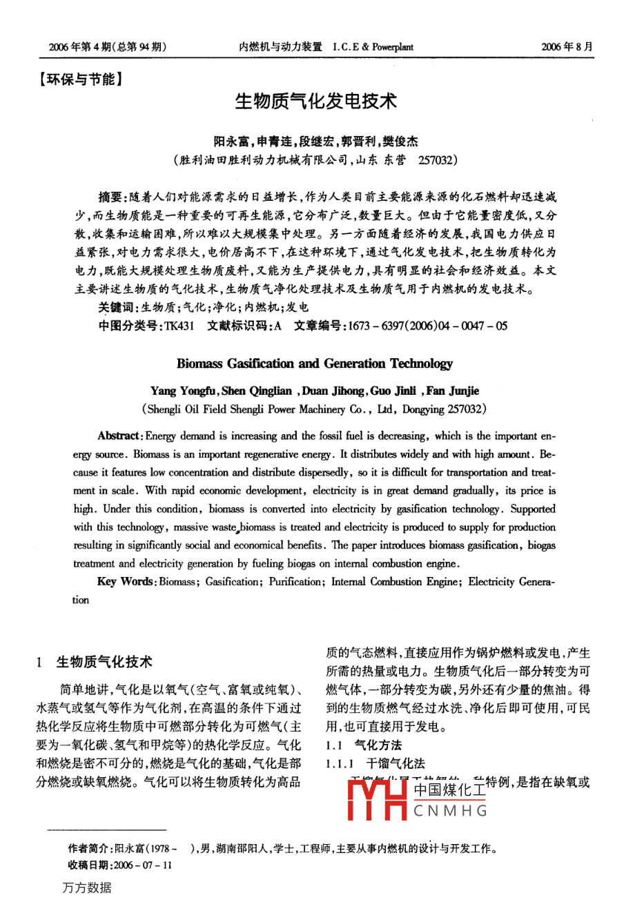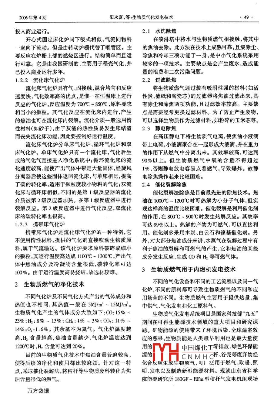 2006年第4期(總第94期)內(nèi)燃機(jī)與動力裝置ICE& Powerplant2006年8月【環(huán)保與節(jié)能】生物質(zhì)氣化發(fā)電技術(shù)陽永富,申青連,段繼宏,郭晉利,樊俊杰(勝利油田勝利動力機(jī)械有限公司,山東東營257032)摘要:隨著人們對能源需求的日益增長,作為人類目前主要能源來源的化石燃料卻迅速減少,而生物質(zhì)能是一種重要的可再生能源,它分布廣泛,數(shù)量巨大。但由于它能量密度低,又分散,收集和運(yùn)輸困難,所以難以大規(guī)模集中處理。另一方面隨著經(jīng)濟(jì)的發(fā)展,我國電力供應(yīng)日益緊張,對電力需求很大,電價(jià)居高不下,在這種環(huán)境下,通過氣化發(fā)電技術(shù),把生物質(zhì)轉(zhuǎn)化為電力,既能大規(guī)模處理生物質(zhì)廢料,又能為生產(chǎn)提供電力,具有明顯的社會和經(jīng)濟(jì)效益。本文主要講述生物質(zhì)的氣化技術(shù),生物質(zhì)氣凈化處理技術(shù)及生物質(zhì)氣用于內(nèi)燃機(jī)的發(fā)電技術(shù)。關(guān)鍵詞:生物質(zhì);氣化;凈化;內(nèi)燃機(jī);發(fā)電中圖分類號:TK431文獻(xiàn)標(biāo)識碼:A文章編號:1673-6397(200604-0047-05Biomass Gasification and Generation TechnologyYang Yongfu, Shen Qinglian, Duan Jihong, Guo Jinli, Fan junjieShengli Oil Field Shengli Power Machinery Co, Ltd, Dongying 257032)Abstract: Energy demand is increasing and the fossil fuel is decreasing, which is the important en-ergy source. Biomass is an important regenerative energy. It distributes widely and with high amount. Be-cause it features low concentration and distribute dispersedly, so it is difficult for transportation and treatment in scale. With rapid economic development, electricity is in great demand gradually, its pricehigh. Under this condition, biomass is converted into electricity by gasification technology. Supportedwith this technology, massive waste biomass is treated and electricity is produced to supply for productionresulting in significantly social and economical benefits. The paper introduces biomass gasification, biogastreatment and electricity generation by fueling biogas on intemal combustion engineWords: Biomass; Gasification; Purification; Intermal Combustion Engine; Electricity Genera1生物質(zhì)氣化技術(shù)質(zhì)的氣態(tài)燃料,直接應(yīng)用作為鍋爐燃料或發(fā)電,產(chǎn)生所需的熱量或電力。生物質(zhì)氣化后一部分轉(zhuǎn)變?yōu)榭珊唵蔚刂v,氣化是以氧氣(空氣、富氧或純氧)、燃?xì)怏w,一部分轉(zhuǎn)變?yōu)樘?另外還有少量的焦油。得水蒸氣或氫氣等作為氣化劑,在高溫的條件下通過到的生物質(zhì)燃?xì)饨?jīng)過水洗、凈化后即可使用,可民熱化學(xué)反應(yīng)將生物質(zhì)中可燃部分轉(zhuǎn)化為可燃?xì)?主用,也可直接用于發(fā)電。要為一氧化碳、氫氣和甲烷等)的熱化學(xué)反應(yīng)。氣化1.1氣化方法和燃燒是密不可分的,燃燒是氣化的基礎(chǔ),氣化是部1.1.1干餾氣化法分燃燒或缺氧燃燒。氣化可以將生物質(zhì)轉(zhuǎn)化為高品中國煤化上特例,是指在缺氧或CNMHG作者簡介:陽永富(1978-),男,湖南邵陽人,學(xué)士,工程師,主要從事內(nèi)燃機(jī)的設(shè)計(jì)與開發(fā)工作。收稿日期:2006-07-11內(nèi)燃機(jī)與動力裝置2006年8月少量供氧的條件下,生物質(zhì)進(jìn)行干餾的過程。主要是氫氣與固定碳及水蒸氣生成甲烷的過程。生物質(zhì)產(chǎn)物為醋酸、甲醇、木焦油抗聚劑木餾油、木炭和可燃?xì)鉄嶂悼蛇_(dá)到123MJm3~26MJ/m3,屬高熱值燃燃?xì)???扇細(xì)獾闹饕煞质嵌趸?、一氧化碳、甲氣。但氫氣氣化反?yīng)的條件極為苛刻,需要在高溫烷、乙烯和氫氣等,其產(chǎn)量和組成與熱解溫度和加熱高壓下進(jìn)行,一般不常使用速率有關(guān)。燃?xì)獾臒嶂禐?5M/m3,屬中熱值燃?xì)狻?.2生物質(zhì)氣化設(shè)備-氣化爐1.1.2空氣氣化法氣化爐是生物質(zhì)氣化的主要設(shè)備。在這里,生以空氣作為氣化劑的氣化過程,空氣中氧氣與物質(zhì)經(jīng)燃燒、氣化轉(zhuǎn)化為可燃?xì)狻饣癄t可分為固生物質(zhì)中可燃組分發(fā)生氧化反應(yīng),提供氣化過程中定床氣化爐、流化床氣化爐及攜帶床氣化爐。固定其它反應(yīng)所需的熱量,不需要額外提供熱量。由于床適用于小型設(shè)備,流化床比較易于大型化。在反空氣隨處可得,不需要消耗額外能源進(jìn)行生產(chǎn),所以應(yīng)過程中主要控制的是氣化爐中的反應(yīng)溫度和物料它是一種極普遍、經(jīng)濟(jì)、設(shè)備最簡單且容易實(shí)現(xiàn)的氣的停留時(shí)間化形式。1.2.1固定床氣化爐空氣中含有21%的氧氣和79%的氮?dú)?氮?dú)馐枪潭ù矚饣癄t的氣化反應(yīng)一般發(fā)生在相對靜止種惰性氣體,不參與化學(xué)反應(yīng)。但氮?dú)庠诨瘜W(xué)反的床層中進(jìn)行,生物質(zhì)依次完成干燥、熱解、氧化和應(yīng)過程中會吸收部分反應(yīng)熱降低反應(yīng)溫度阻礙氧還原反應(yīng)。根據(jù)氣流運(yùn)動方向的不同,固定床氣化氣的充分?jǐn)U散降低反應(yīng)速度。而且不參與反應(yīng)的爐可分為下吸式、上吸式、橫吸式及開心式等幾種類氮?dú)庀♂屃松镔|(zhì)燃?xì)庵锌扇冀M分,降低了燃?xì)鉄嵝?。值。燃?xì)鉄嶂狄话銥?MJ/m3,屬低熱值燃?xì)?。下吸式固定床氣化爐的特征是氣體和生物質(zhì)物1.1.3氧氣氣化法料混合向下流動。通過高溫喉管區(qū)(只有下吸式設(shè)以純氧作為氣化劑的氣化過程。在此反應(